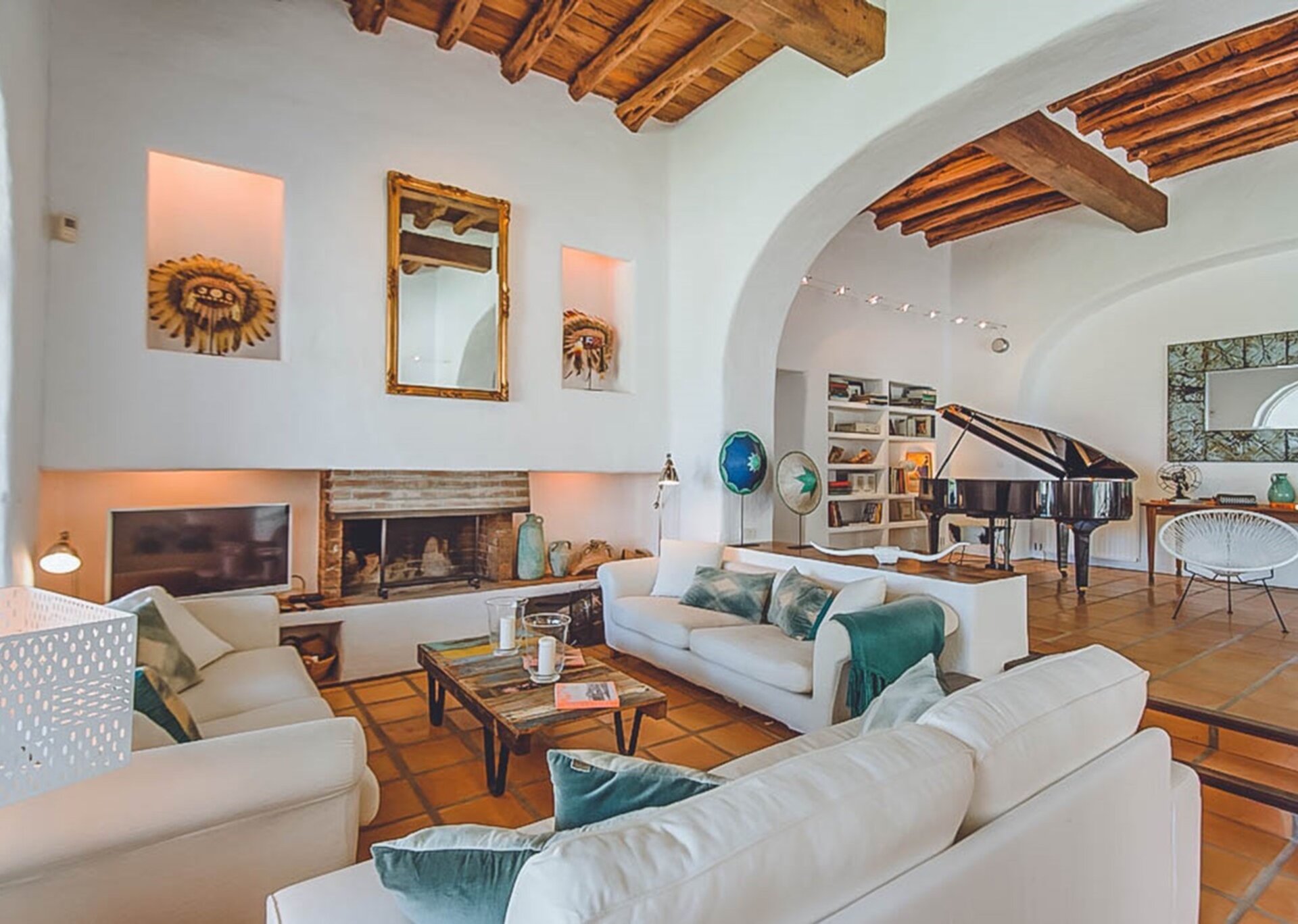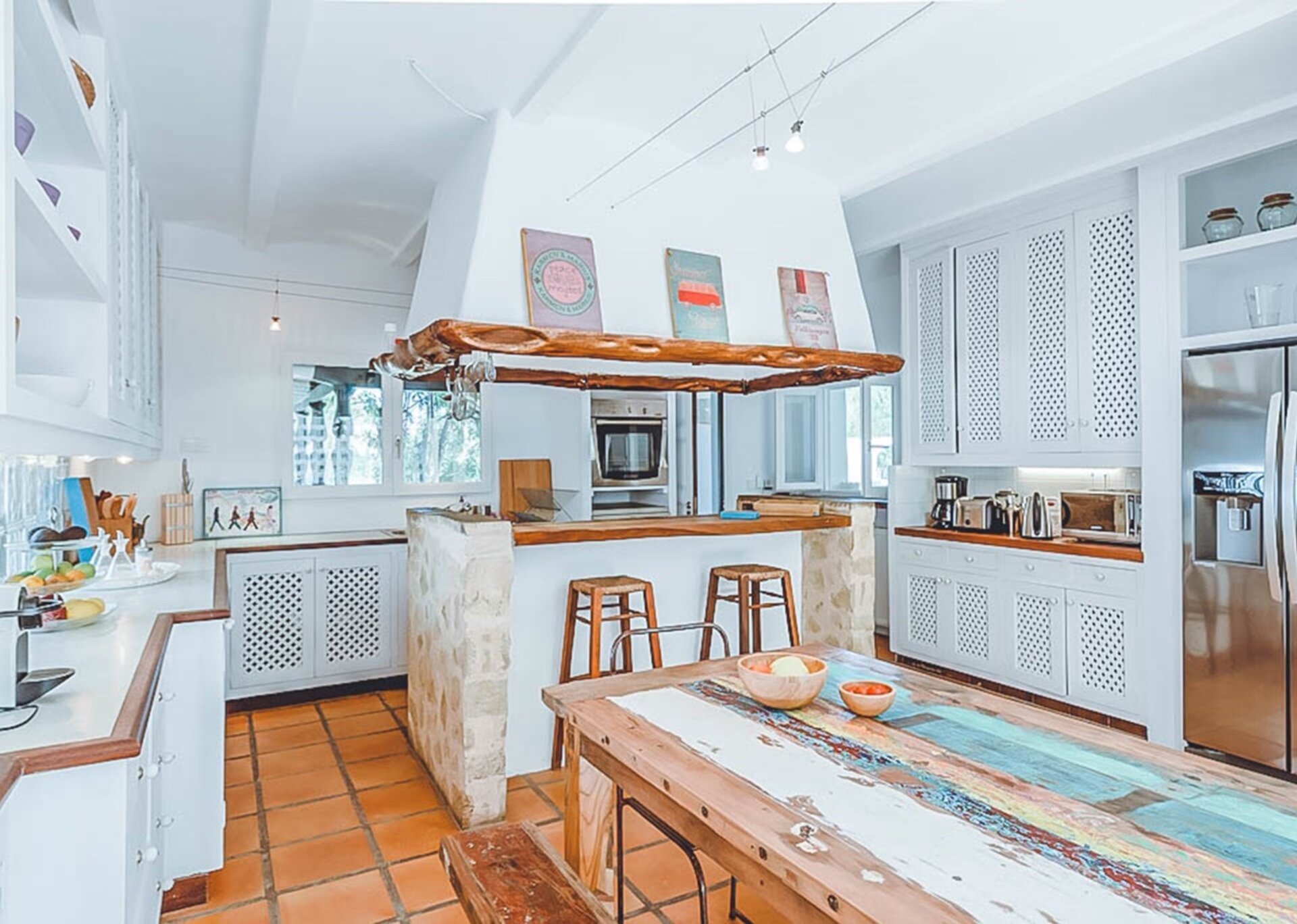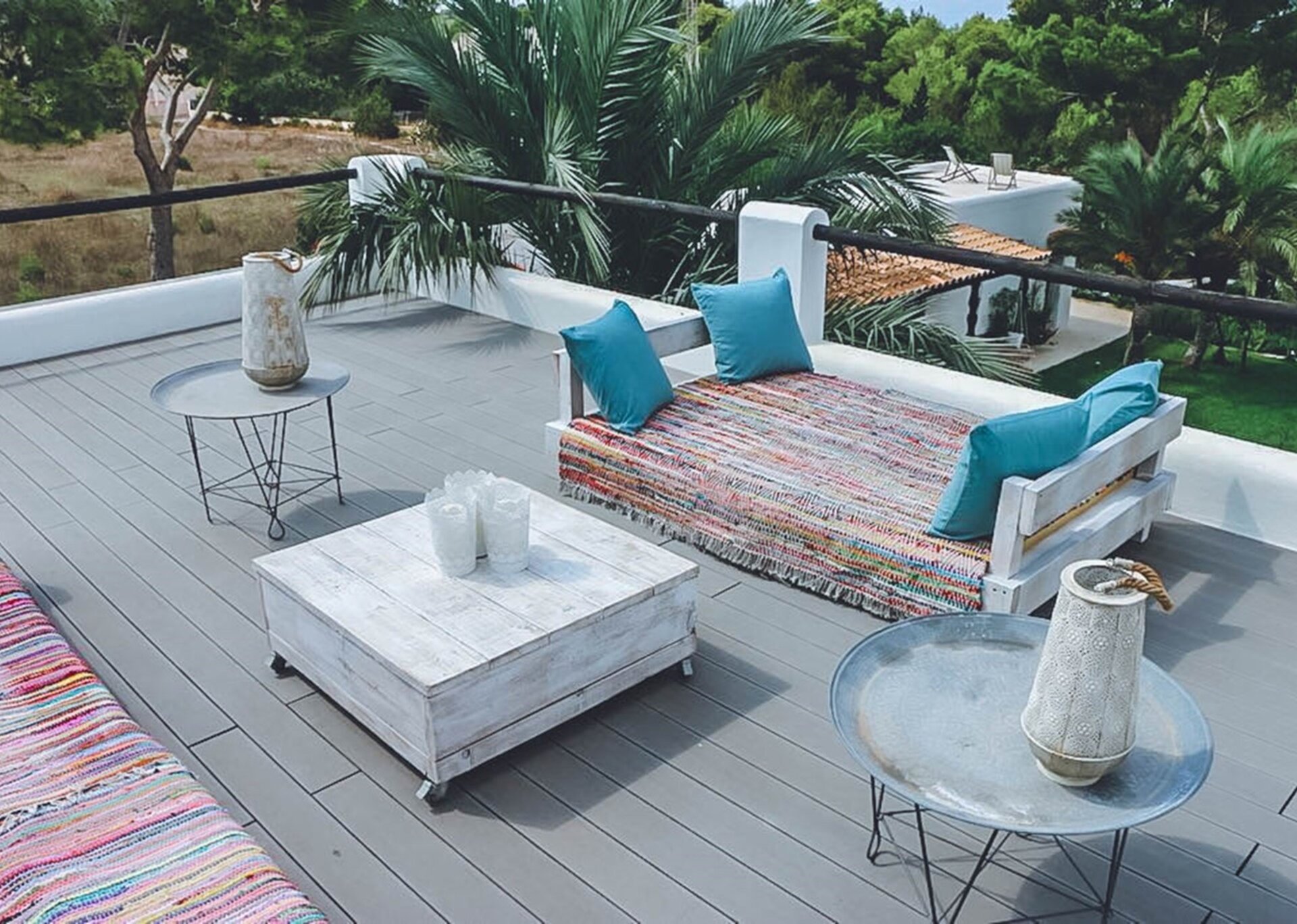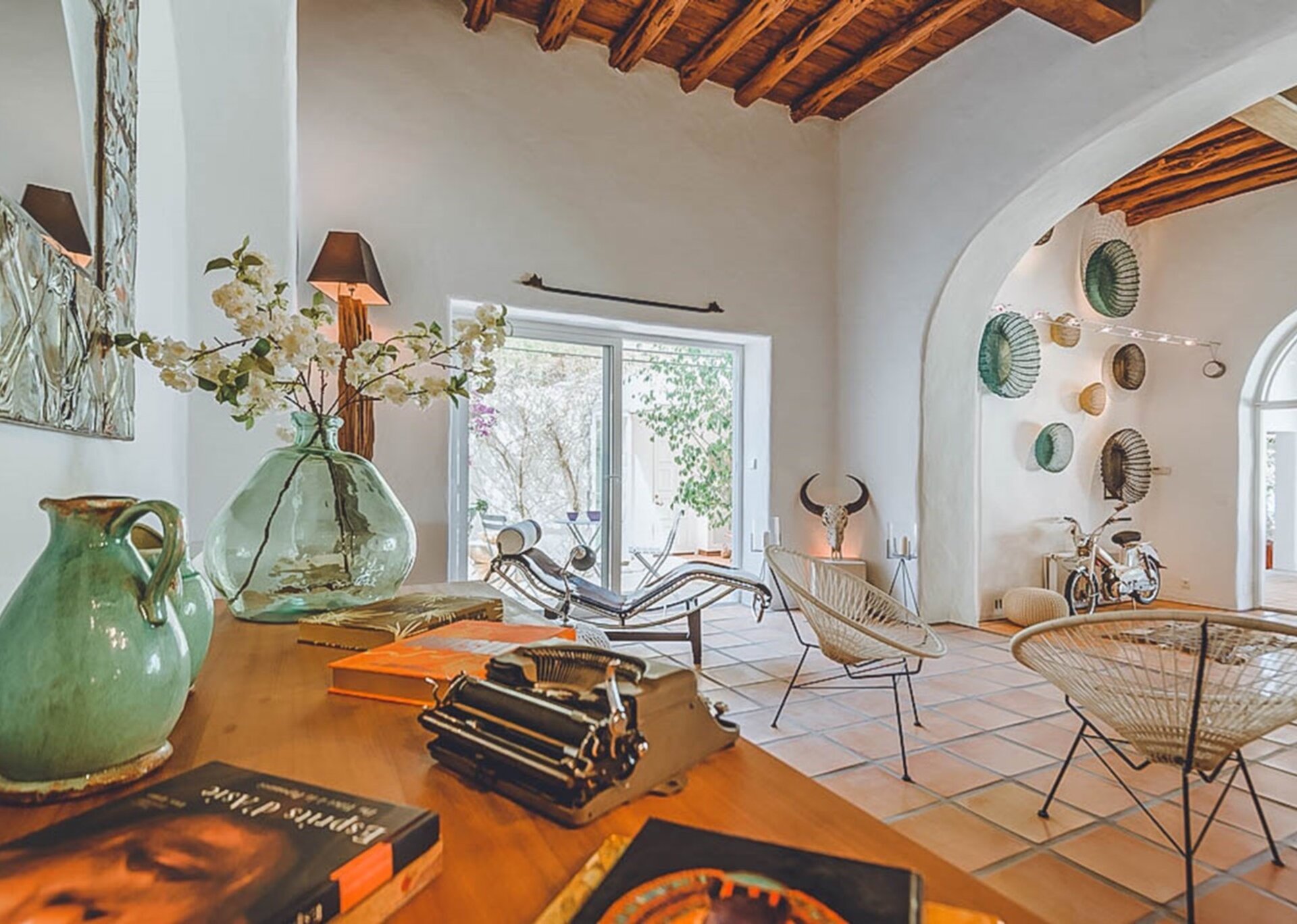 Inside, the spacious living areas exude a contemporary bohemian vibe, boasting high wooden sabina beamed ceilings, an open plan lounge, fully equipped kitchen, and a cozy sofa area. These areas seamlessly flow onto an outdoor porch adorned with a grand exterior dining table.