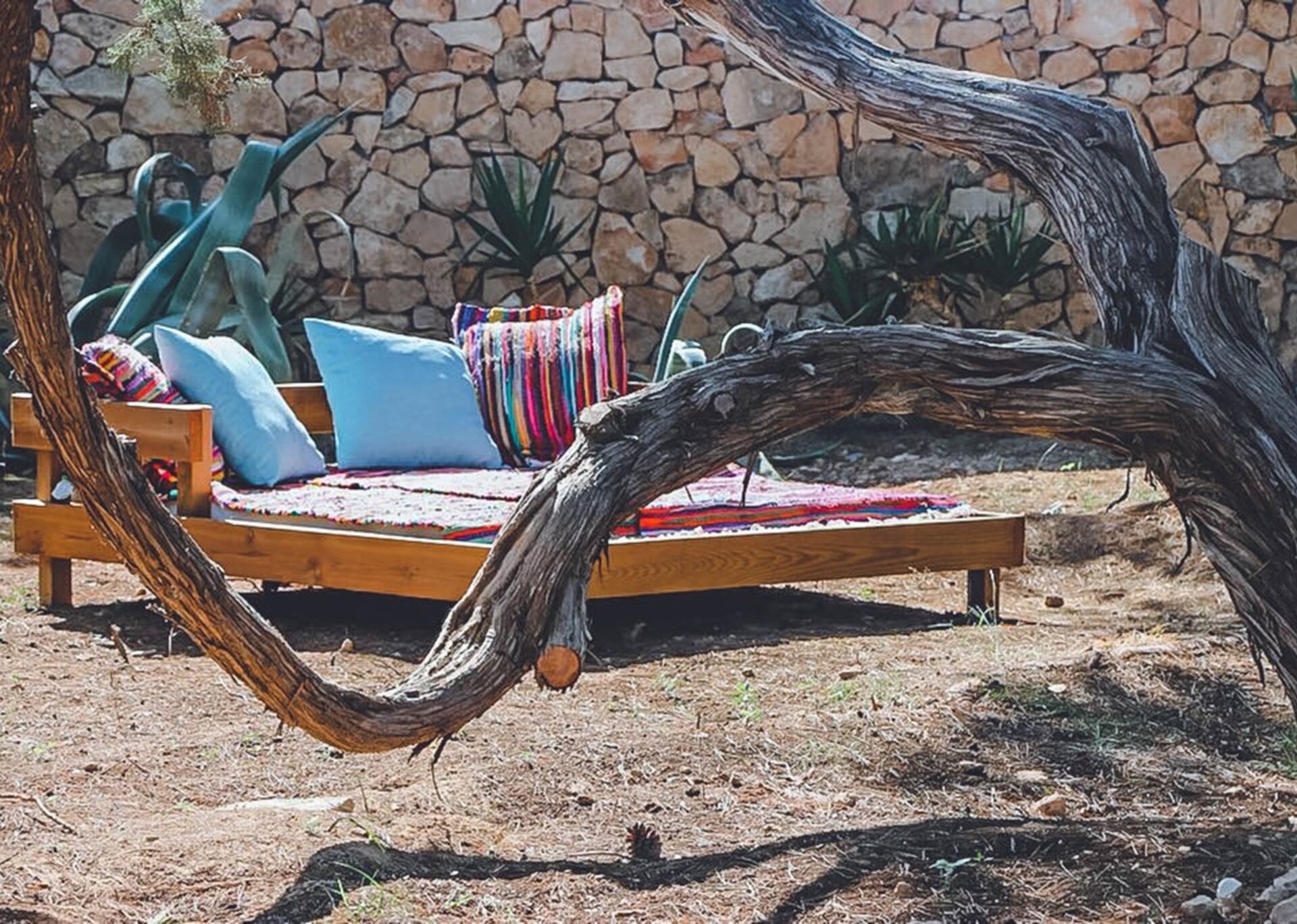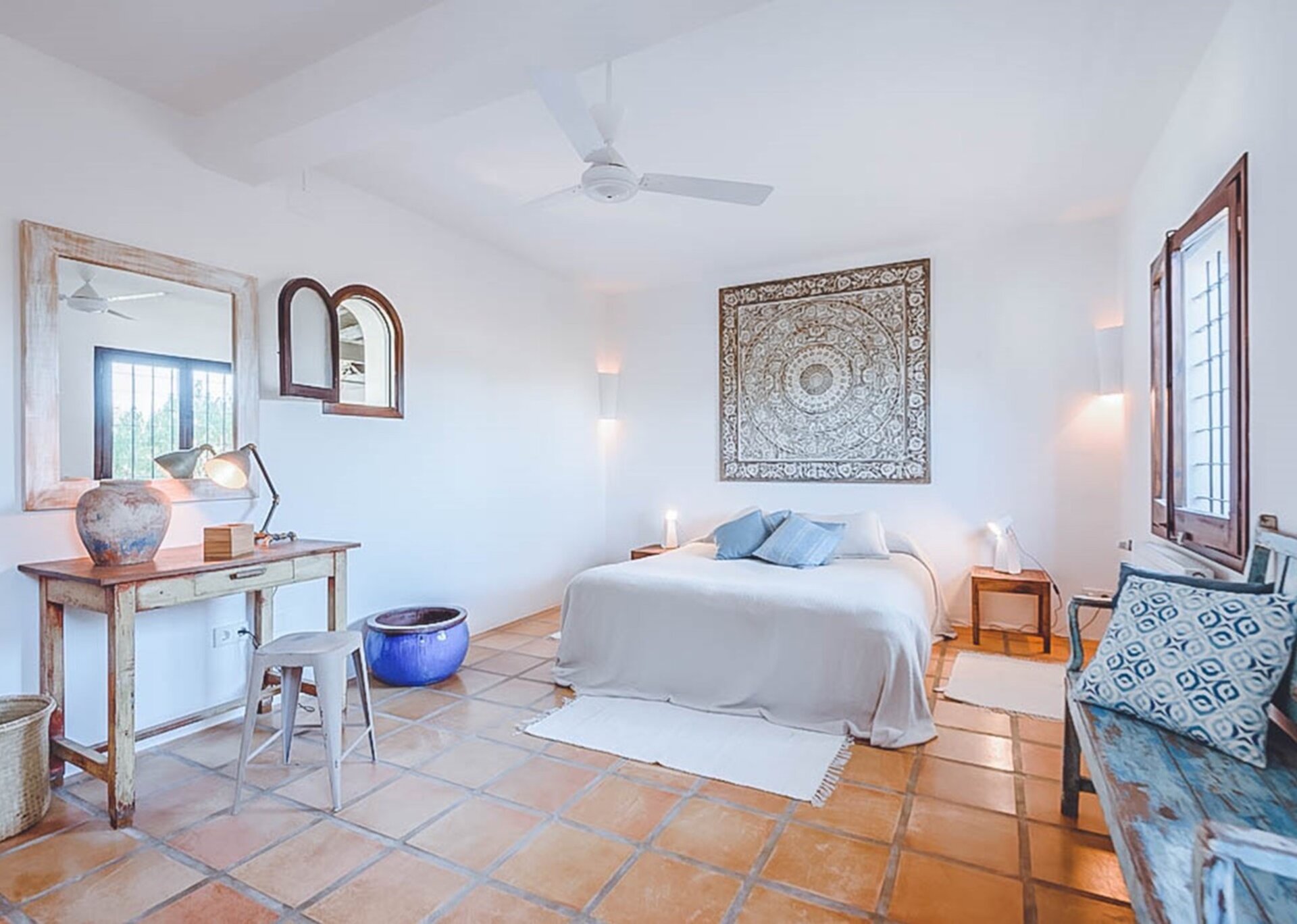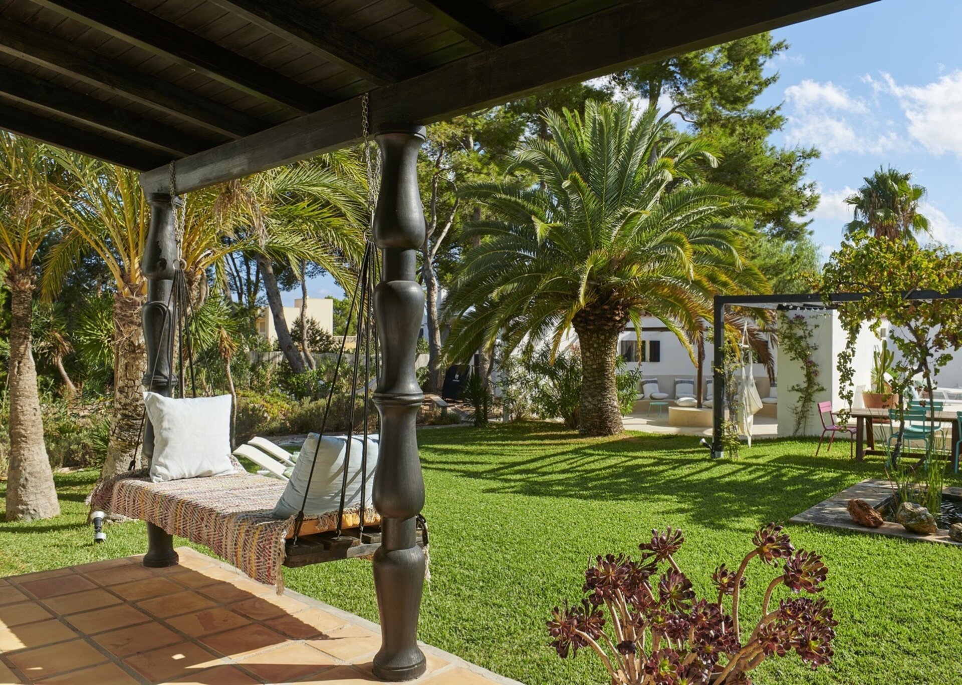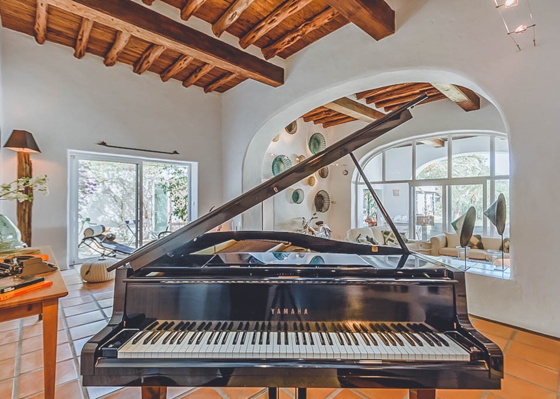 Inside, the spacious living areas exude a contemporary bohemian vibe, boasting high wooden sabina beamed ceilings, an open plan lounge, fully equipped kitchen, and a cozy sofa area. These areas seamlessly flow onto an outdoor porch adorned with a grand exterior dining table.
