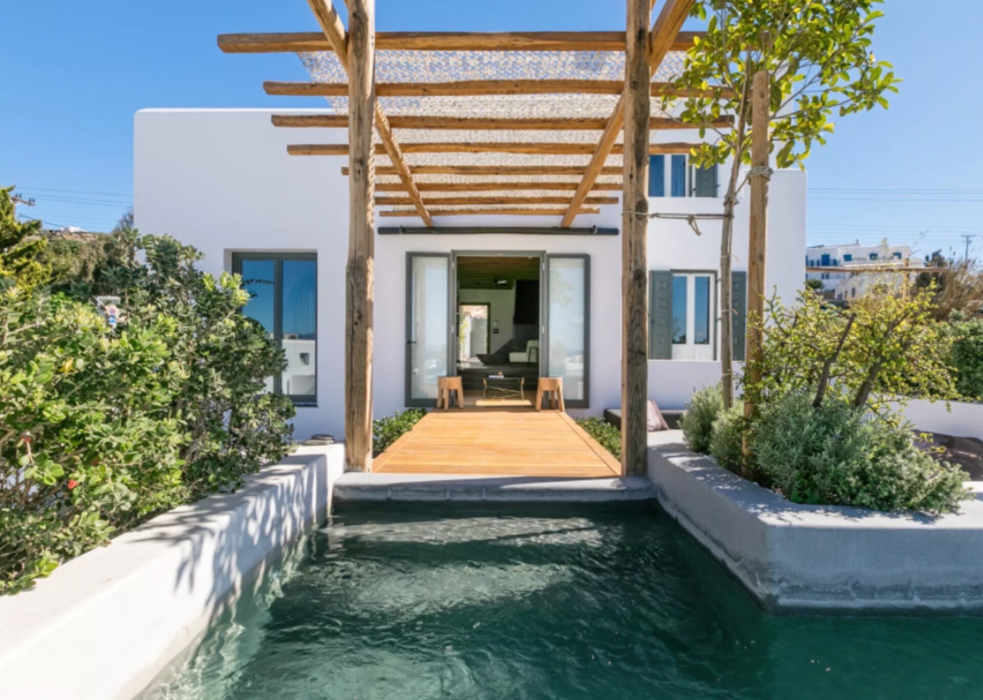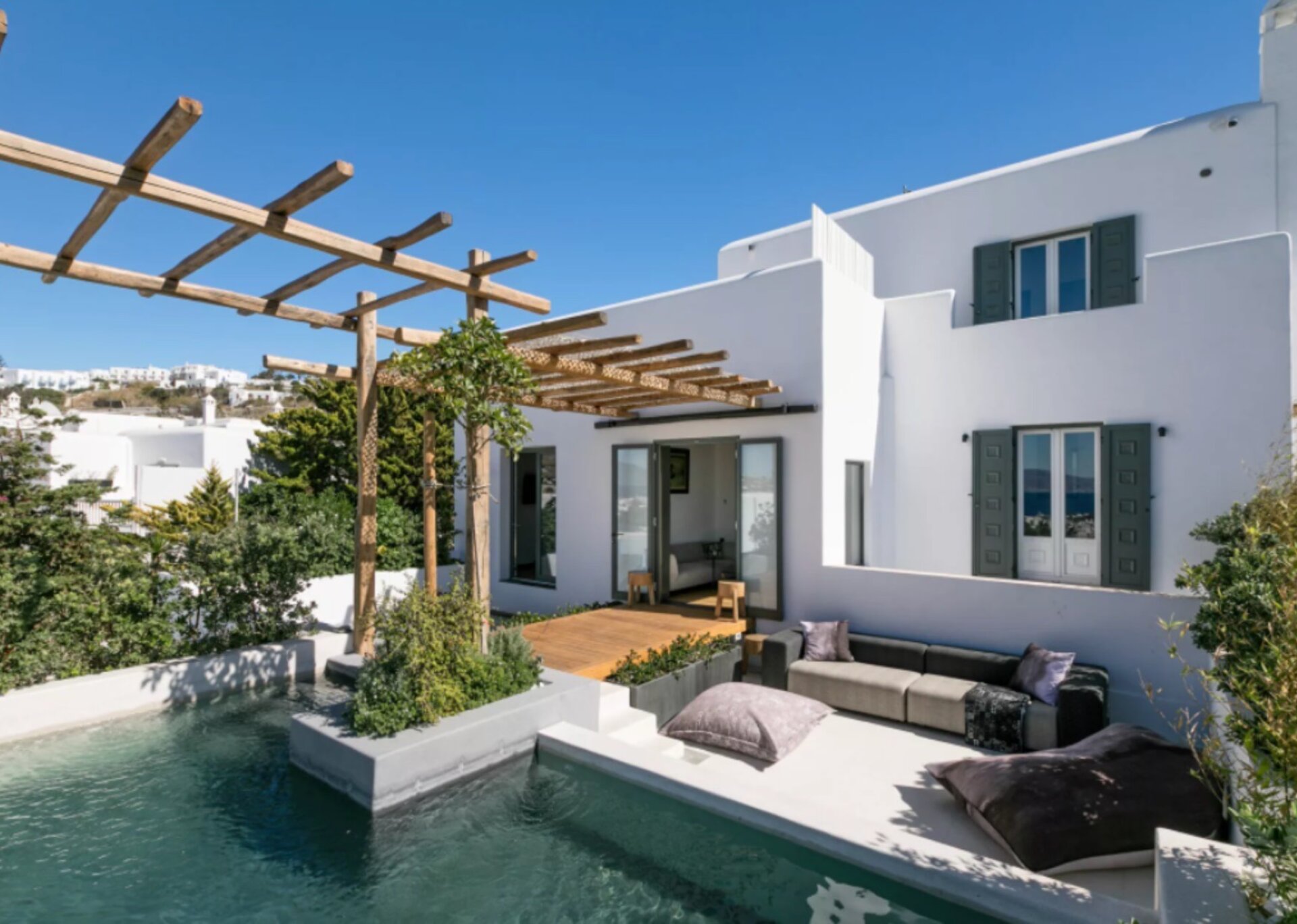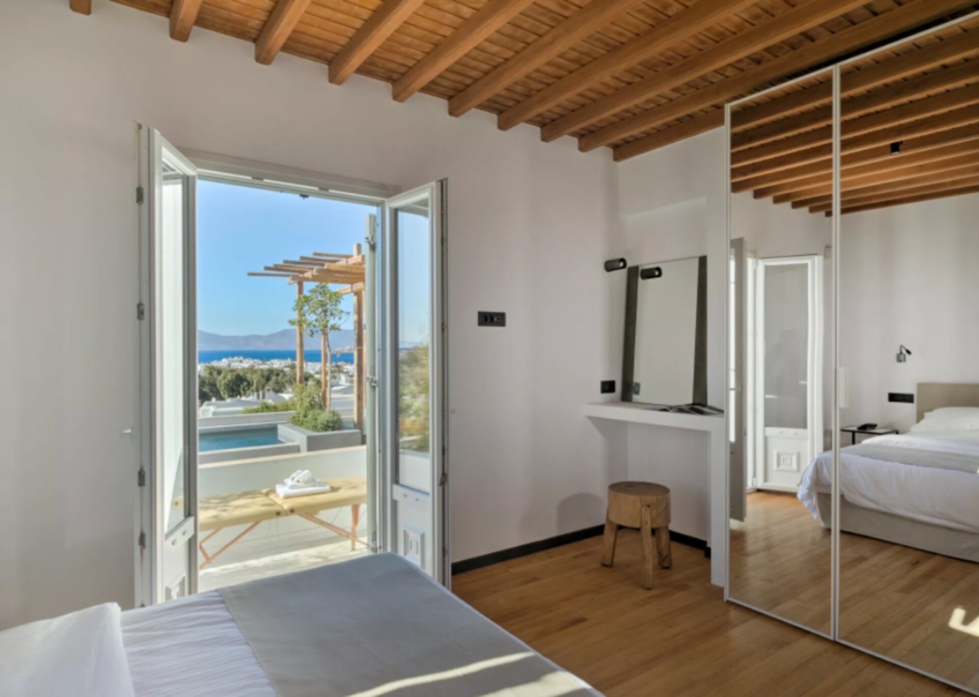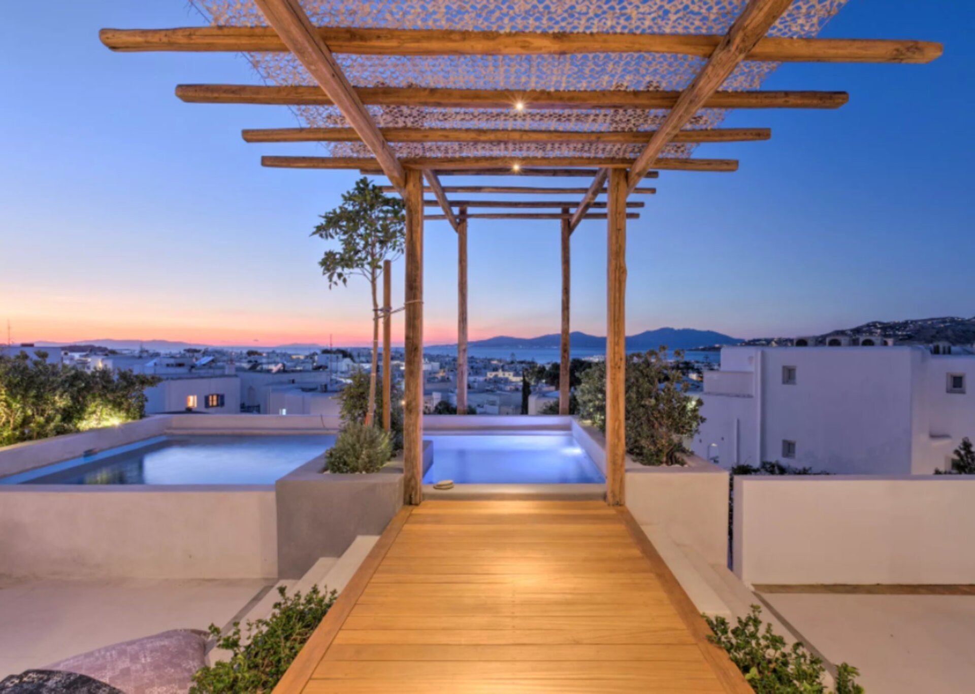 Villa Freya is a lavish resort that perfectly captures the Cycladic spirit. A Mykonian gem ideally located in Mykonos Town overlooking the Aegean sea, includes numerous amenities that will definitely spoil you. The outdoor area is spacious and includes a private swimming pool with lounging areas near it and sunbeds around it. Freya offers immaculate views of the sea and the sunset that can be gazed while swimming in the pool or having dinner in the outer dining area.