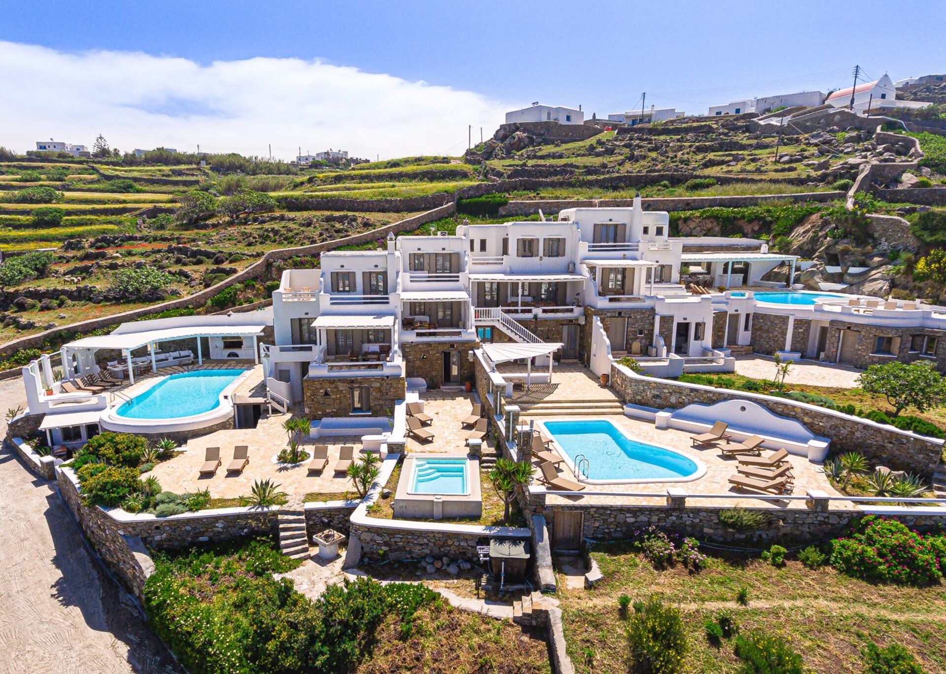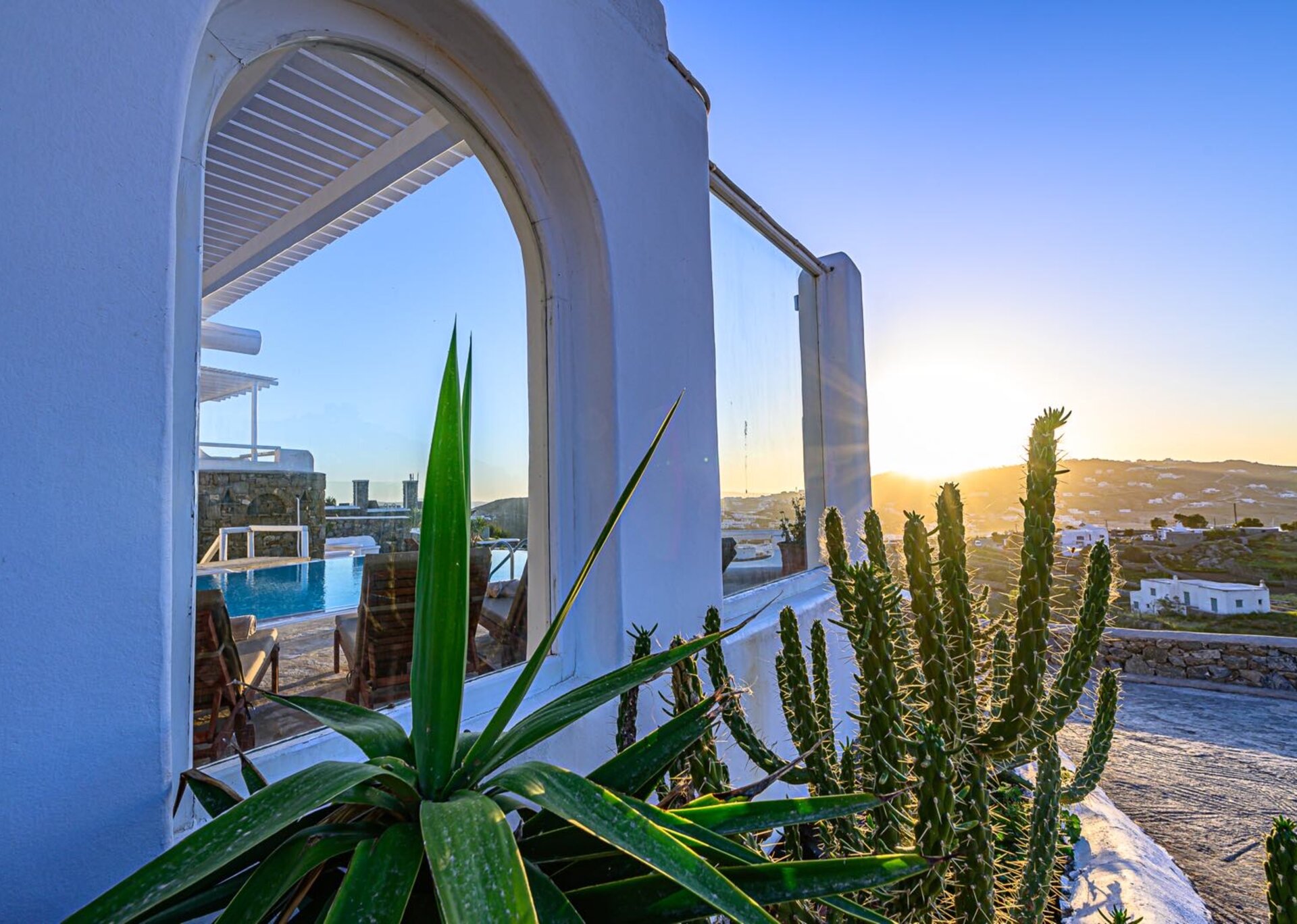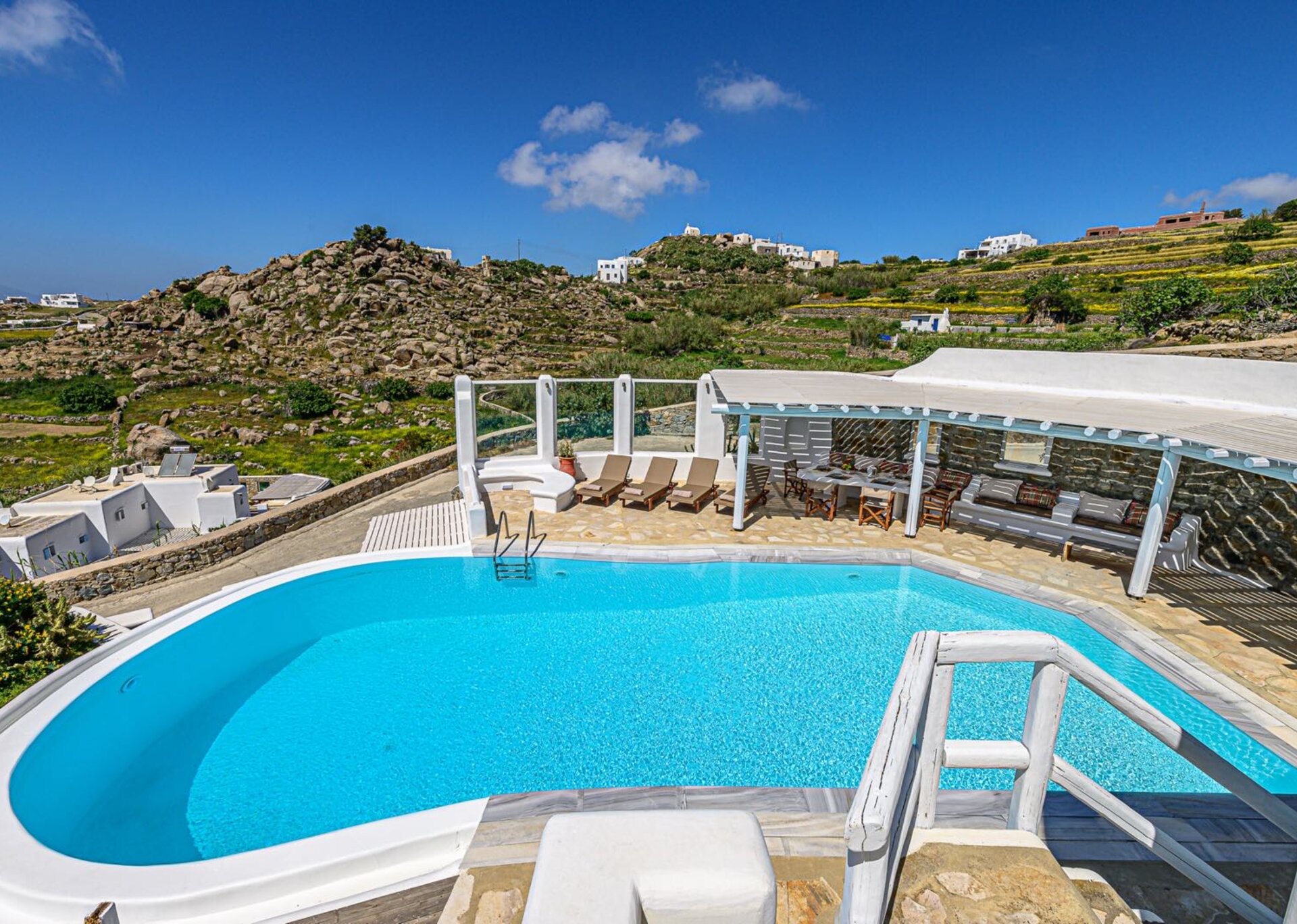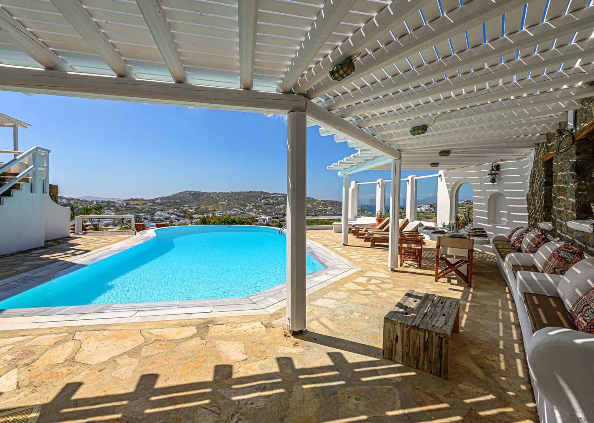 The main features include white plaster, local stone, natural rocks, built-in couches, and wooden pergolas intertwined with Cycladic arches. The villa is surrounded by specially designed areas paved with lush gardens: olive trees, bushes, shrubs, ornamental plants, and cacti among the rocks form beautiful landscapes, creating a particularly relaxing mood.
