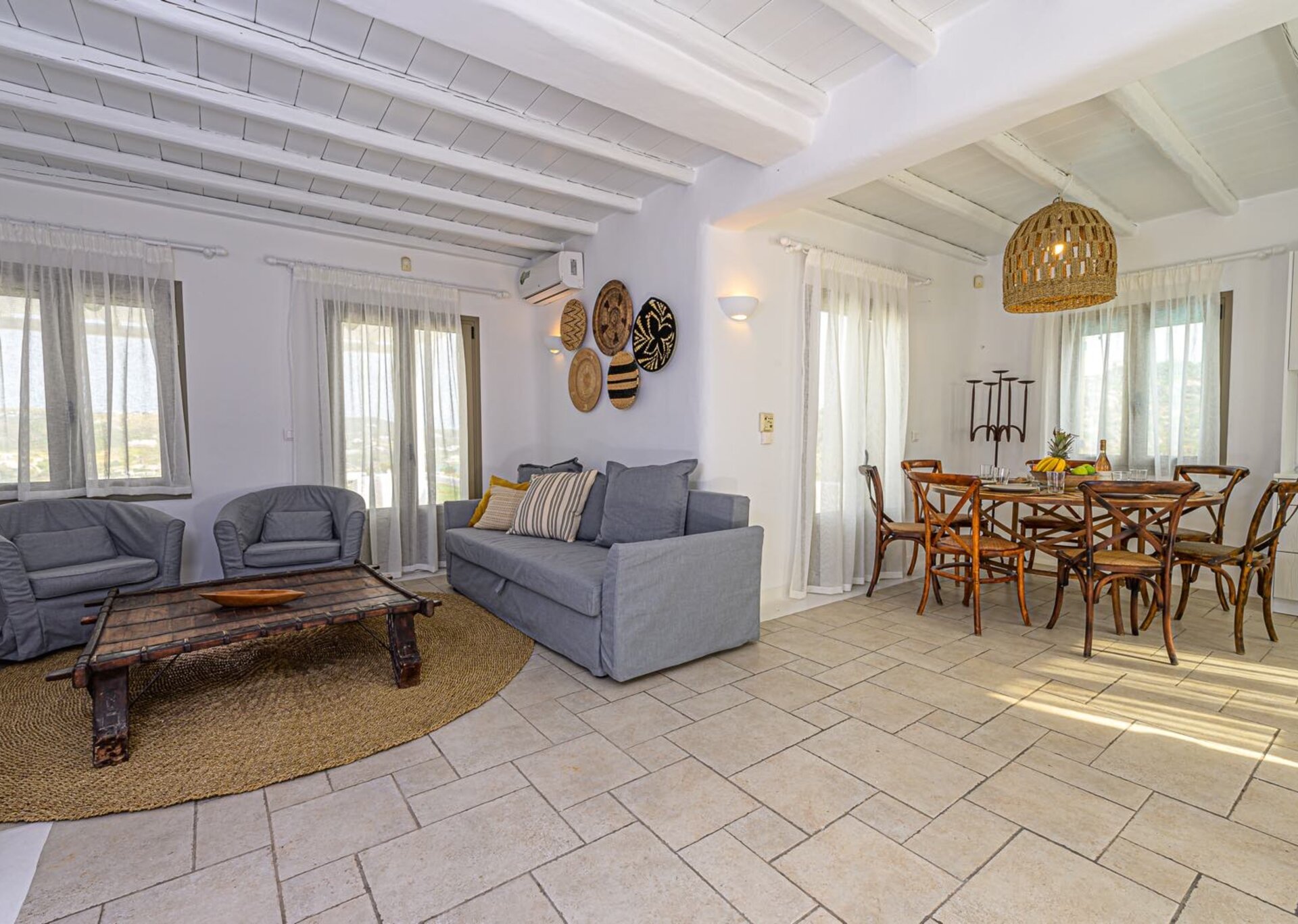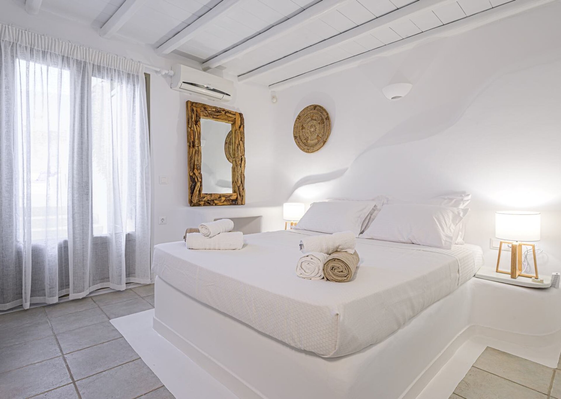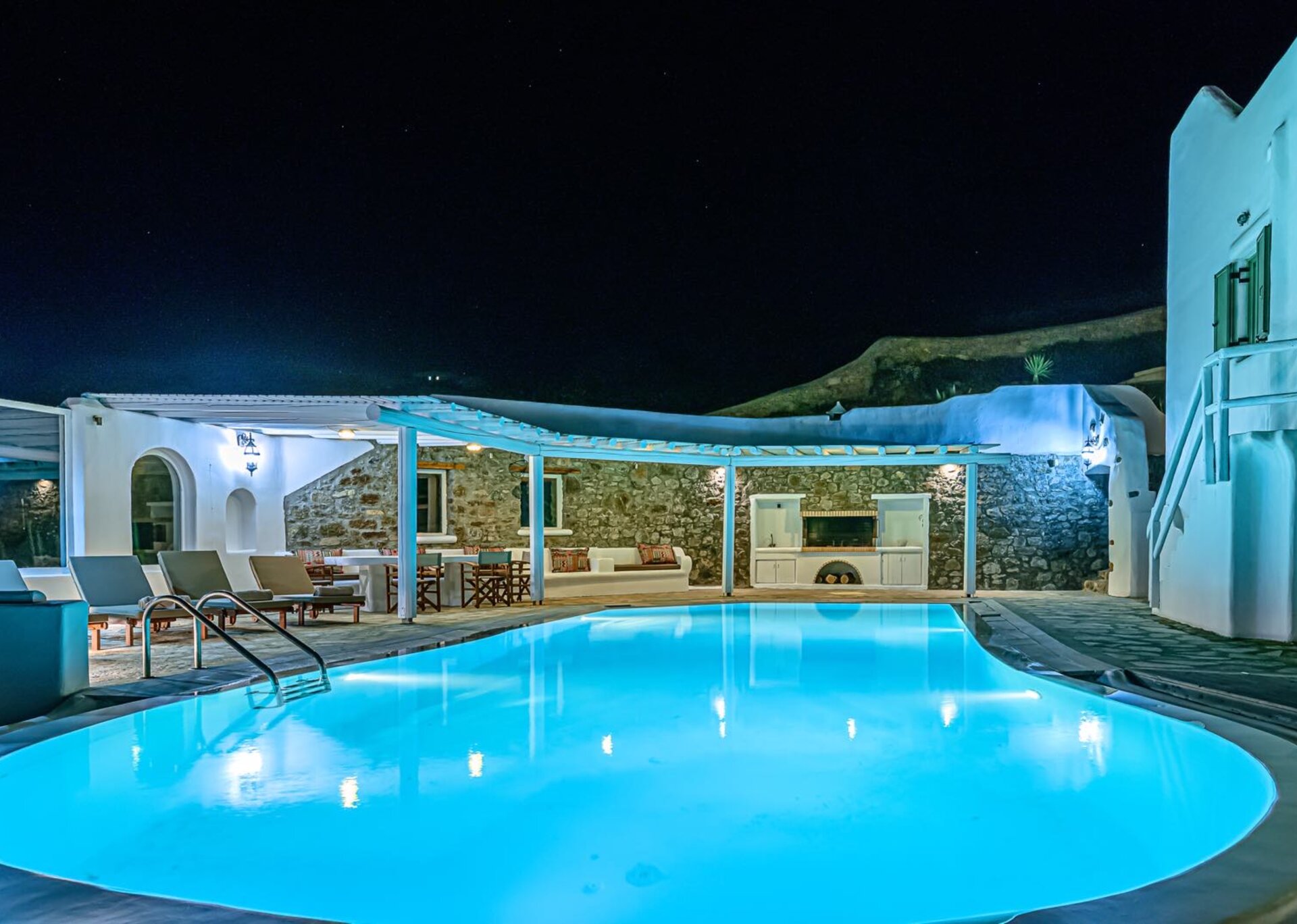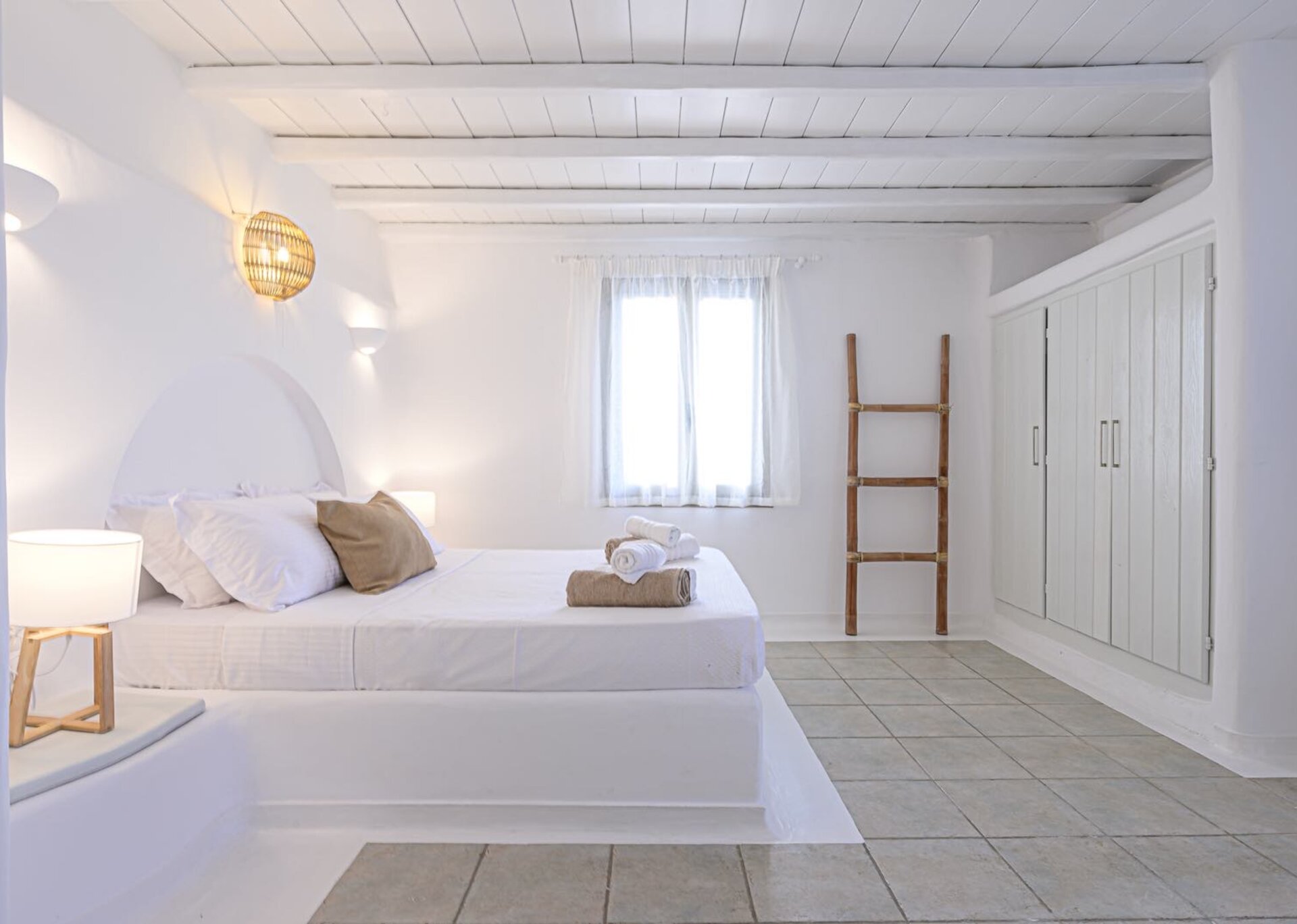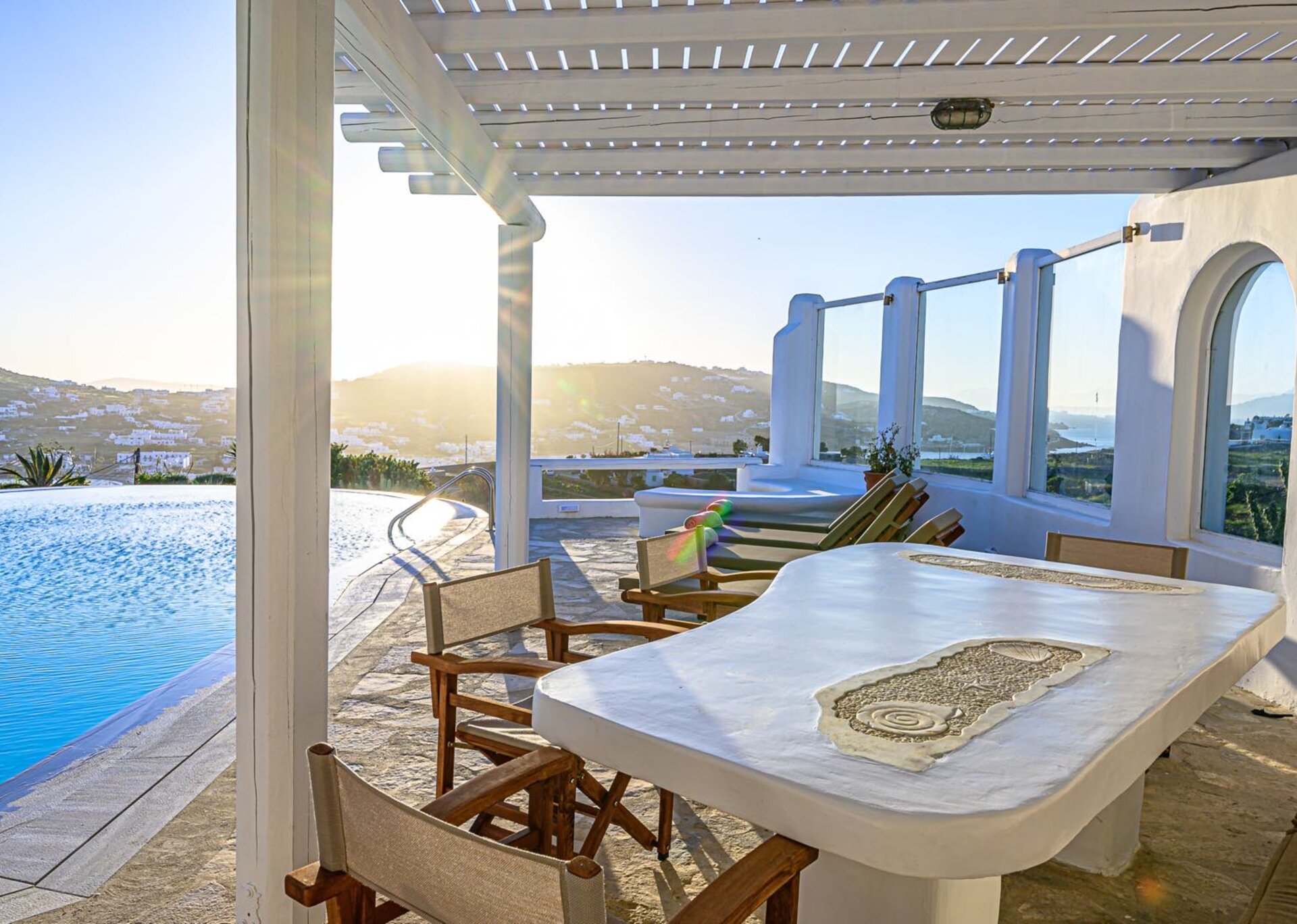 The main features include white plaster, local stone, natural rocks, built-in couches, and wooden pergolas intertwined with Cycladic arches. The villa is surrounded by specially designed areas paved with lush gardens: olive trees, bushes, shrubs, ornamental plants, and cacti among the rocks form beautiful landscapes, creating a particularly relaxing mood.