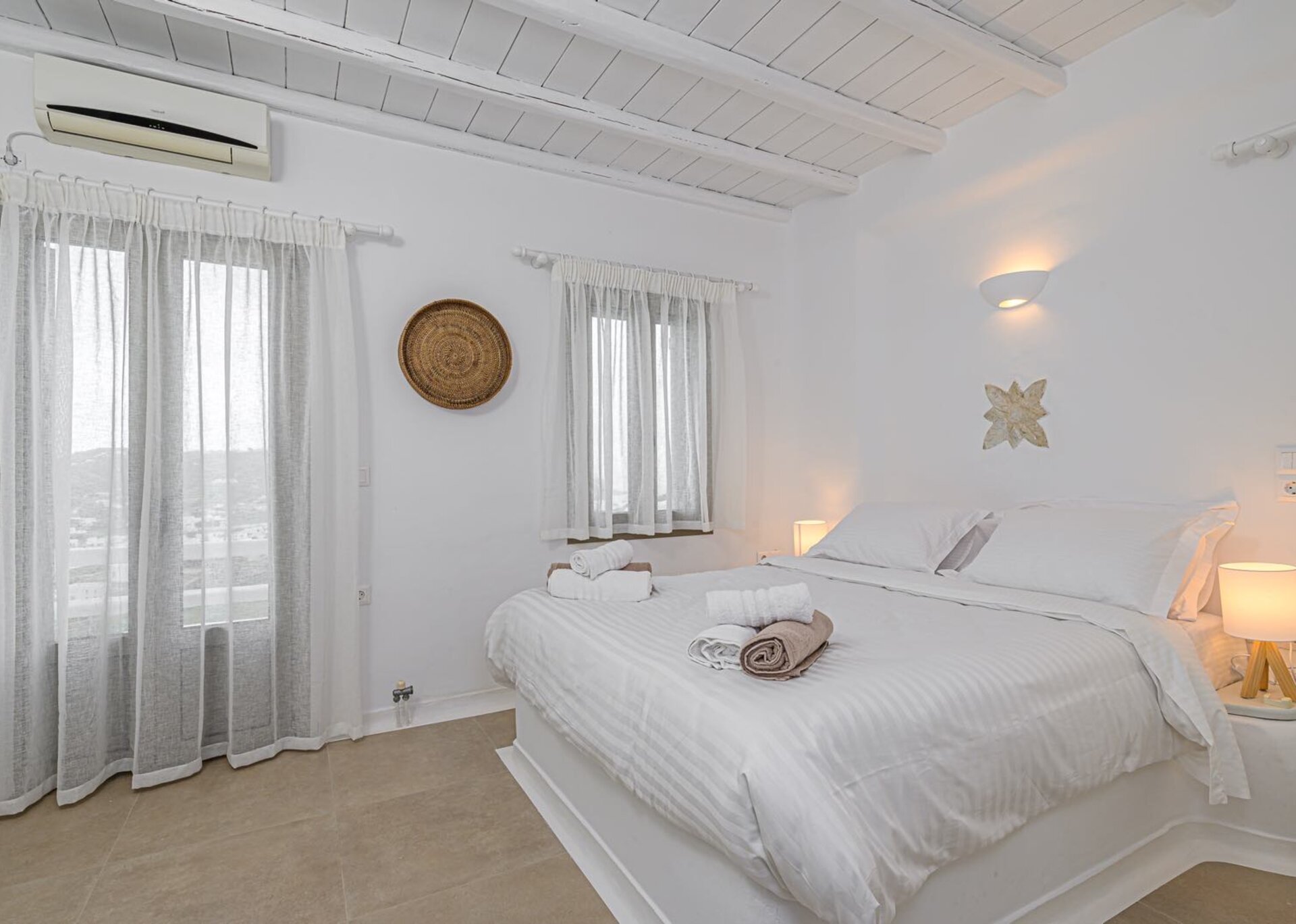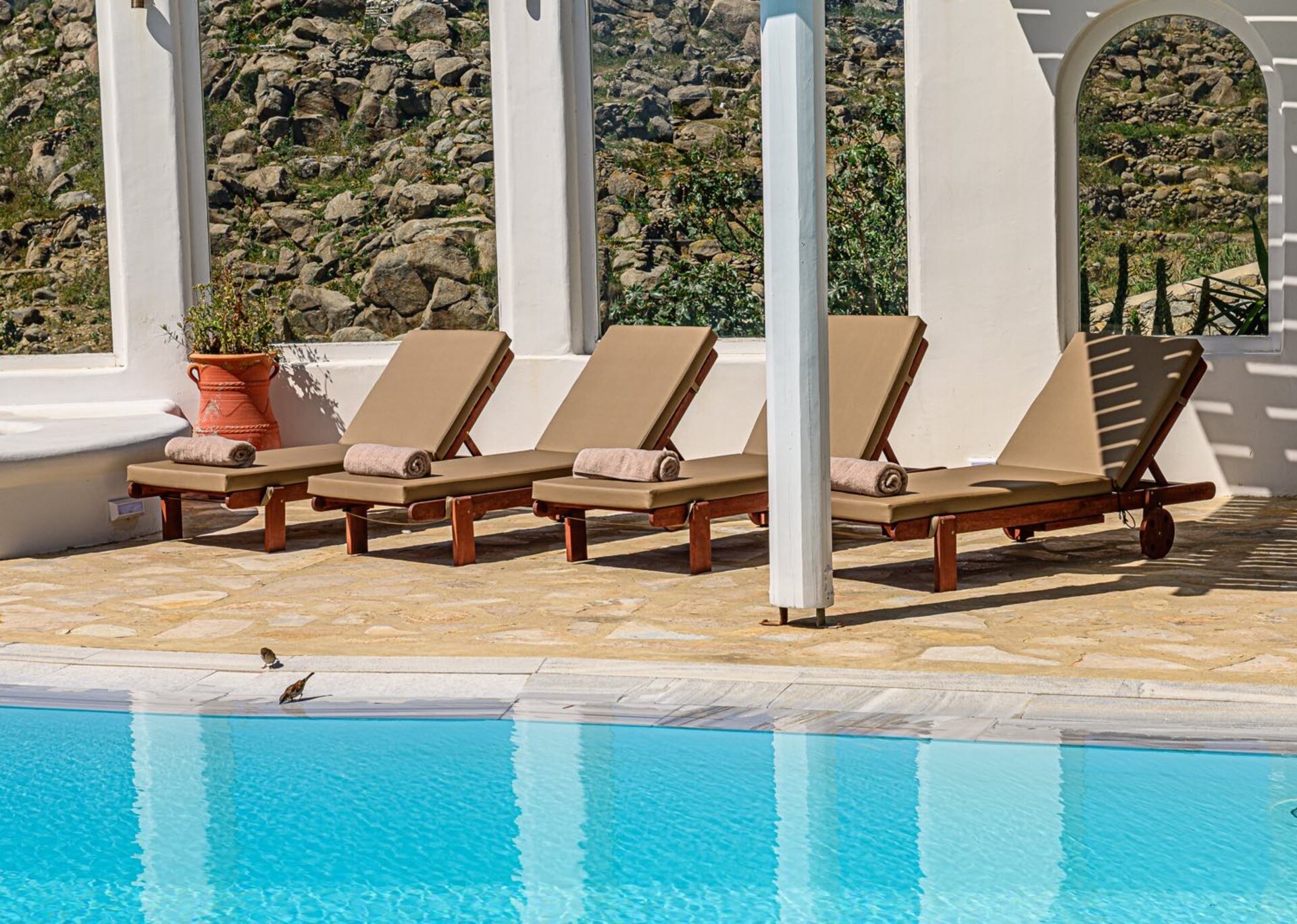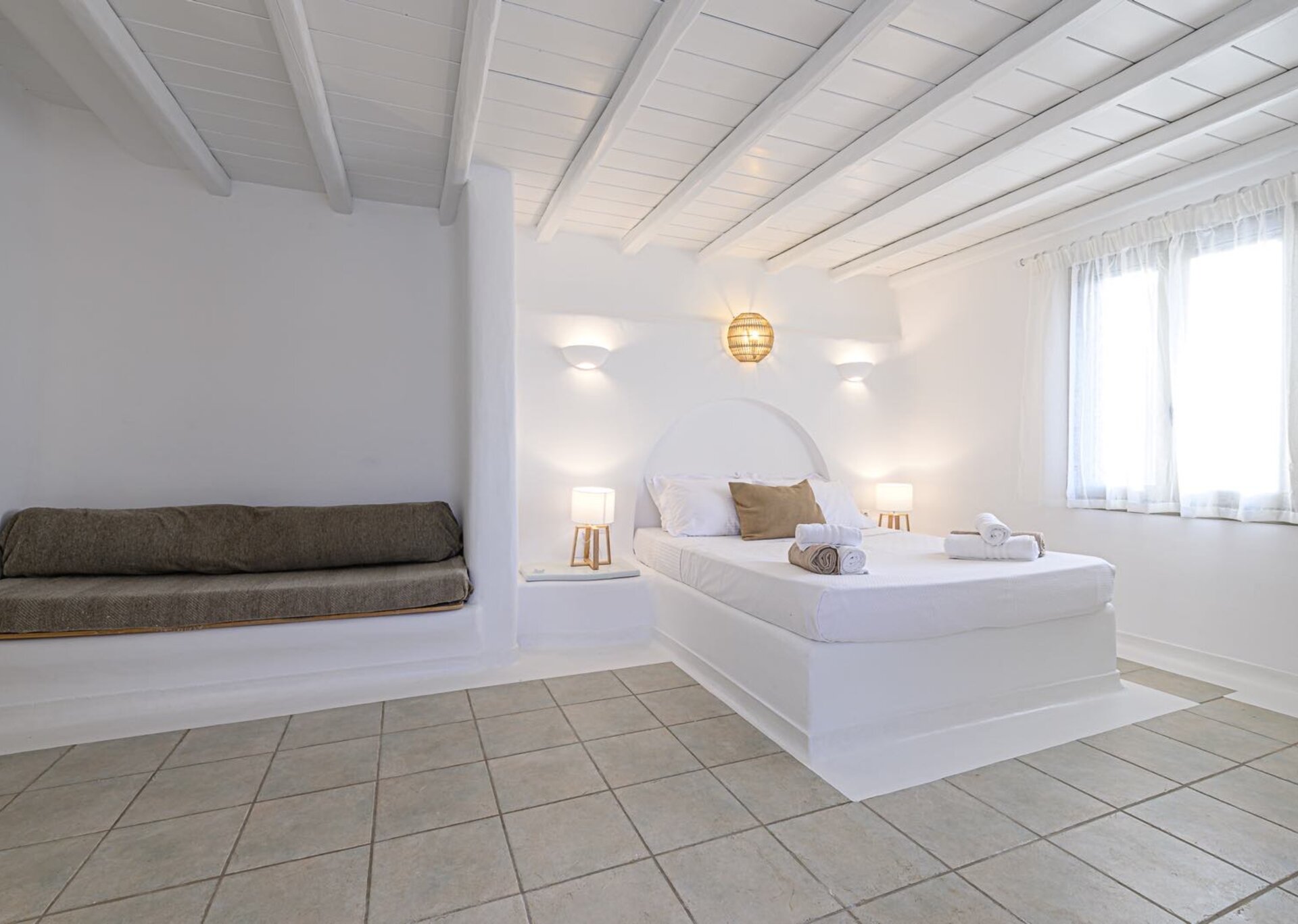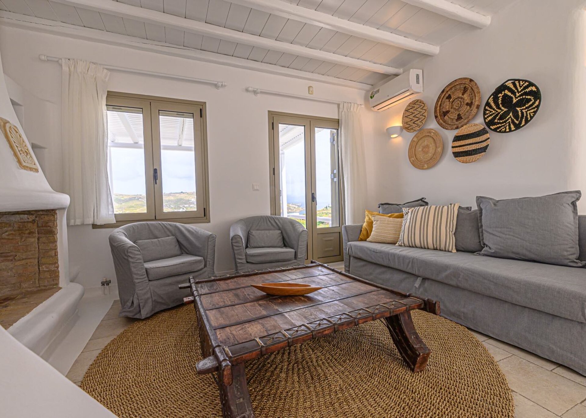The main features include white plaster, local stone, natural rocks, built-in couches, and wooden pergolas intertwined with Cycladic arches. The villa is surrounded by specially designed areas paved with lush gardens: olive trees, bushes, shrubs, ornamental plants, and cacti among the rocks form beautiful landscapes, creating a particularly relaxing mood.