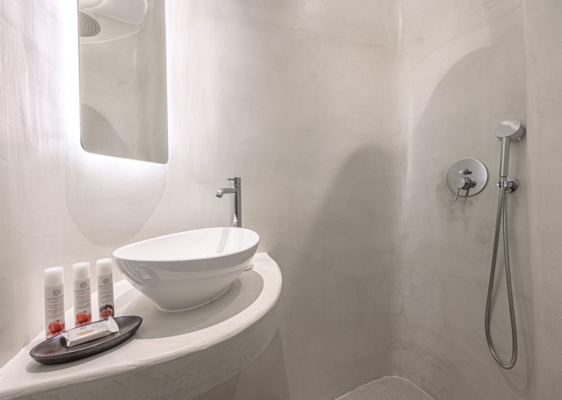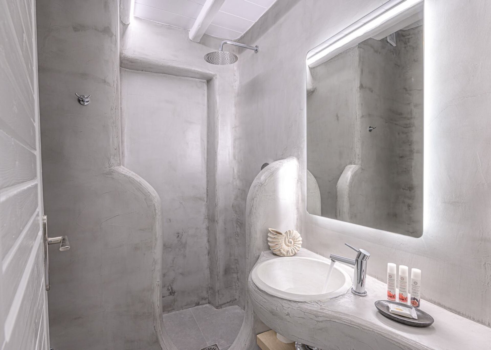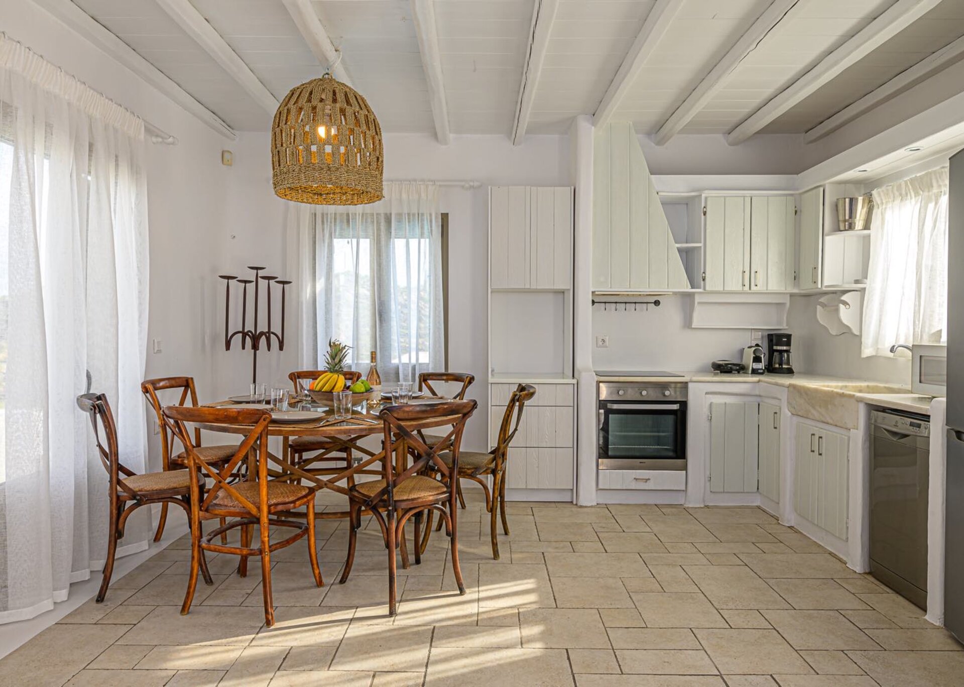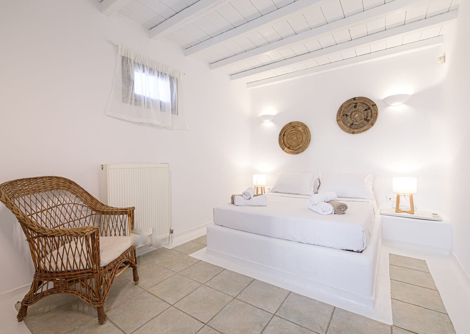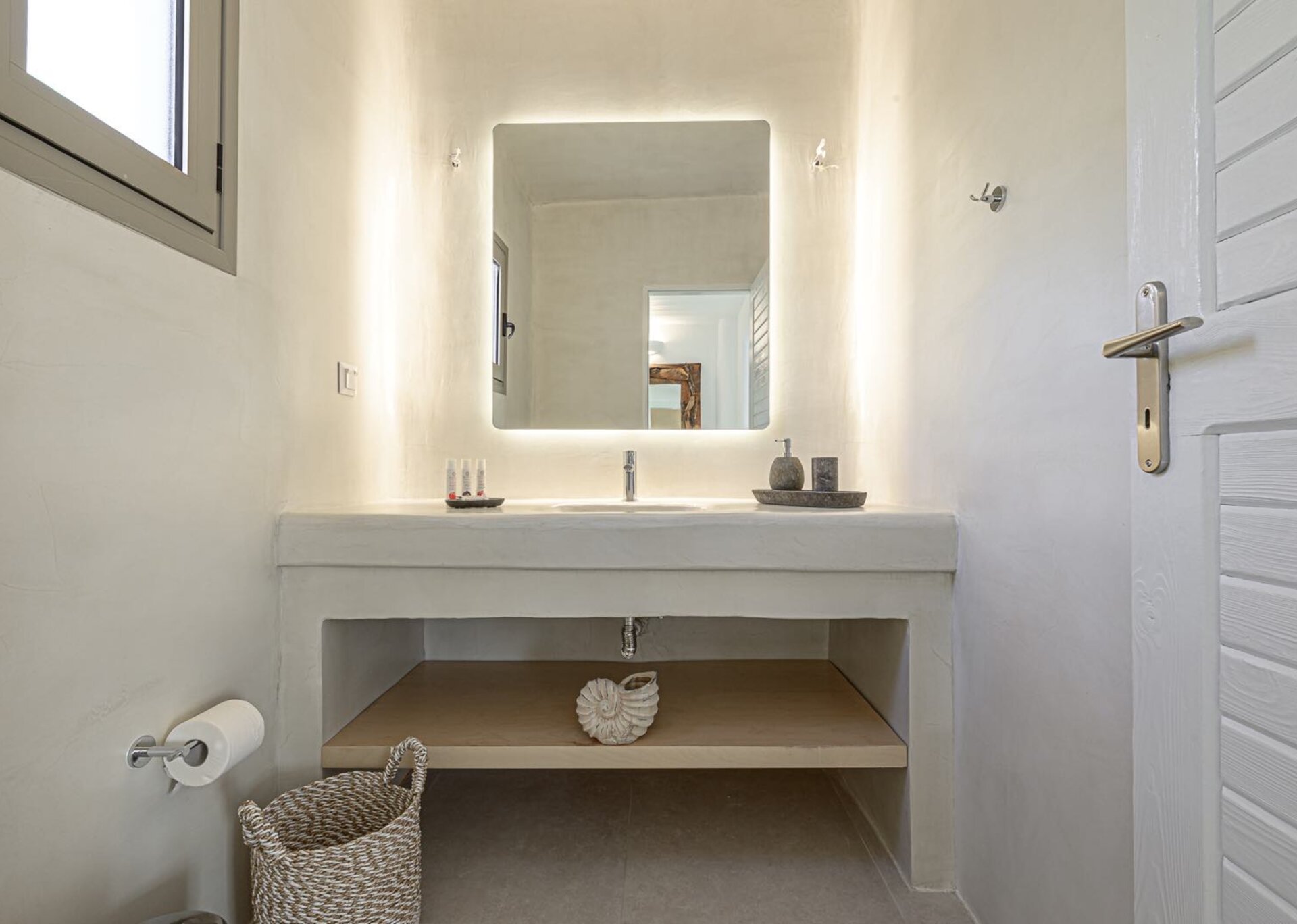 The main features include white plaster, local stone, natural rocks, built-in couches, and wooden pergolas intertwined with Cycladic arches. The villa is surrounded by specially designed areas paved with lush gardens: olive trees, bushes, shrubs, ornamental plants, and cacti among the rocks form beautiful landscapes, creating a particularly relaxing mood.