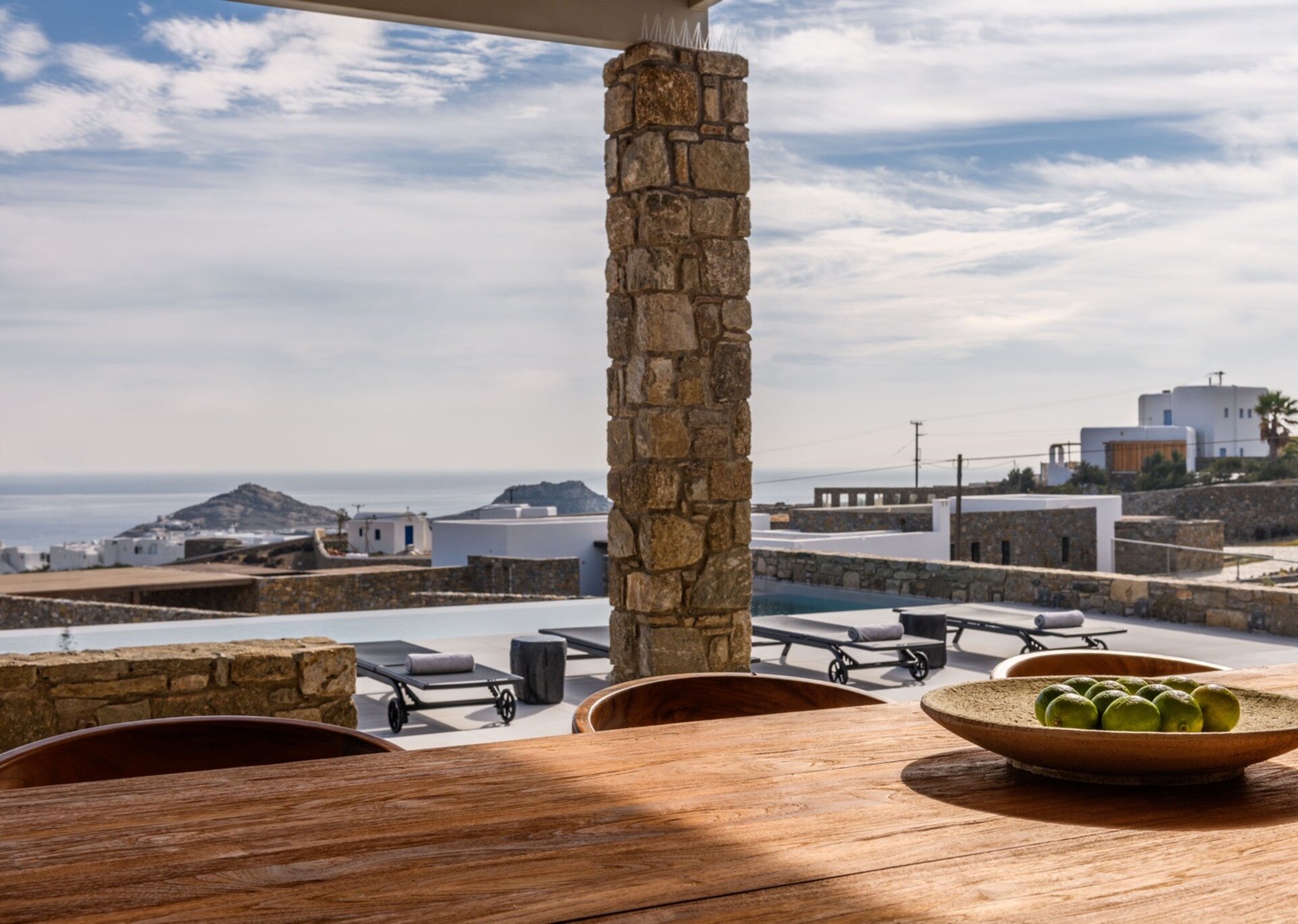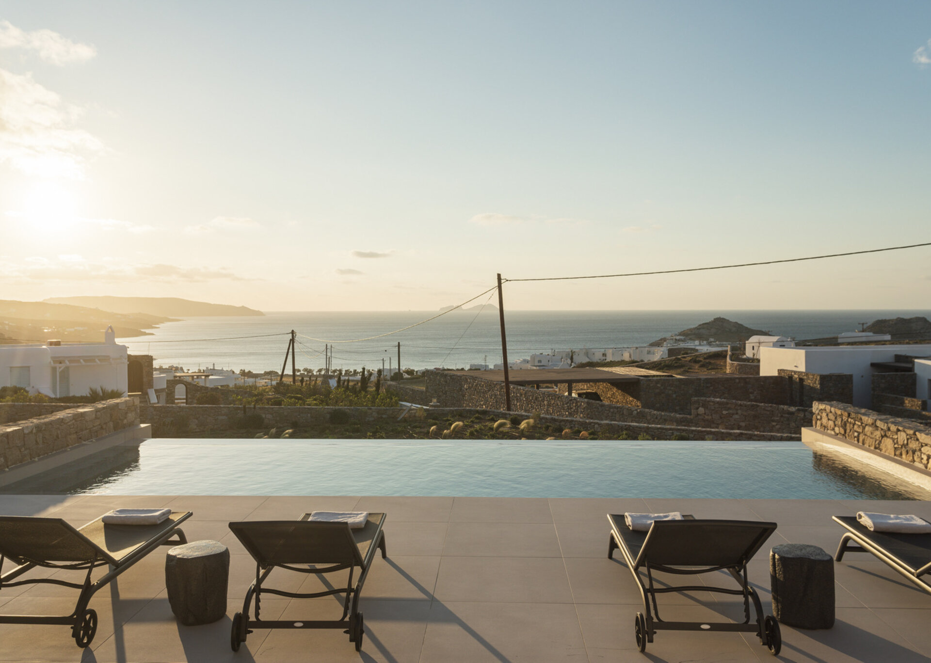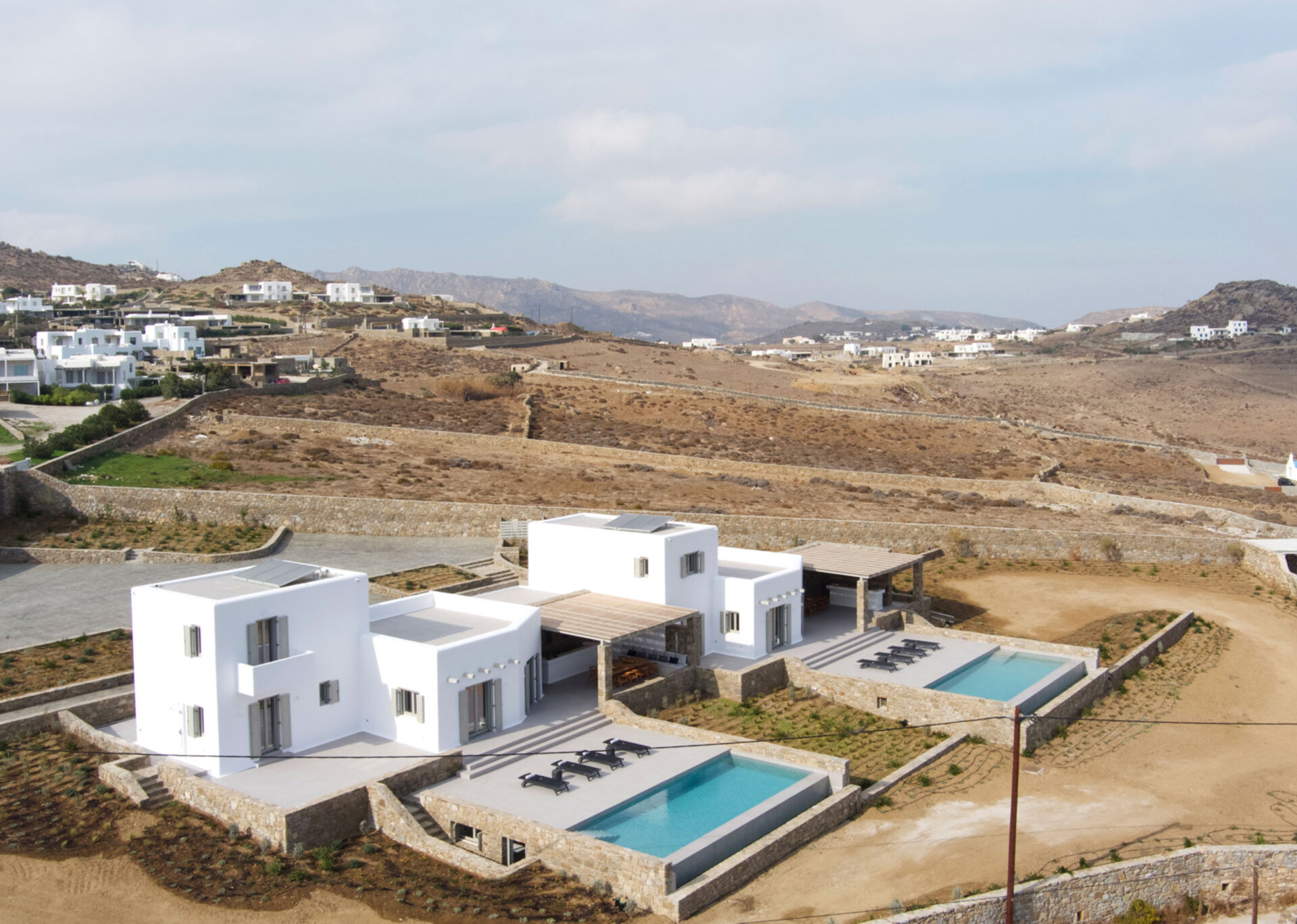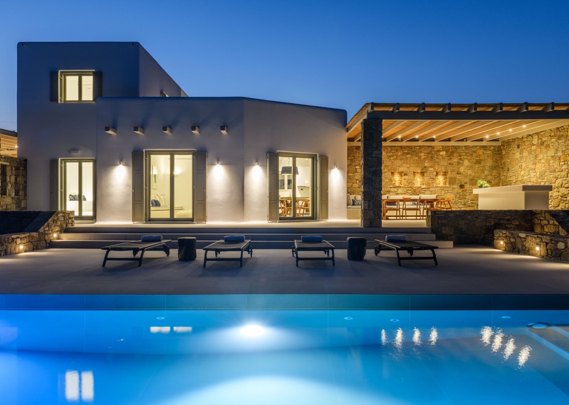 Each villas has teh outdoor space with priavte swimming pool near to an outer dining place, a pool bar and pergolas that are shaded, ideal for relaxation and to enjoy the panoramic vista and gaze the sunset. The villa is a 5' drive distance from Kalafatis and Kalo Livadi beaches.