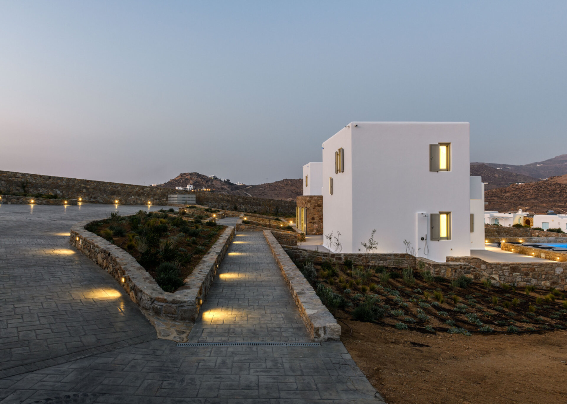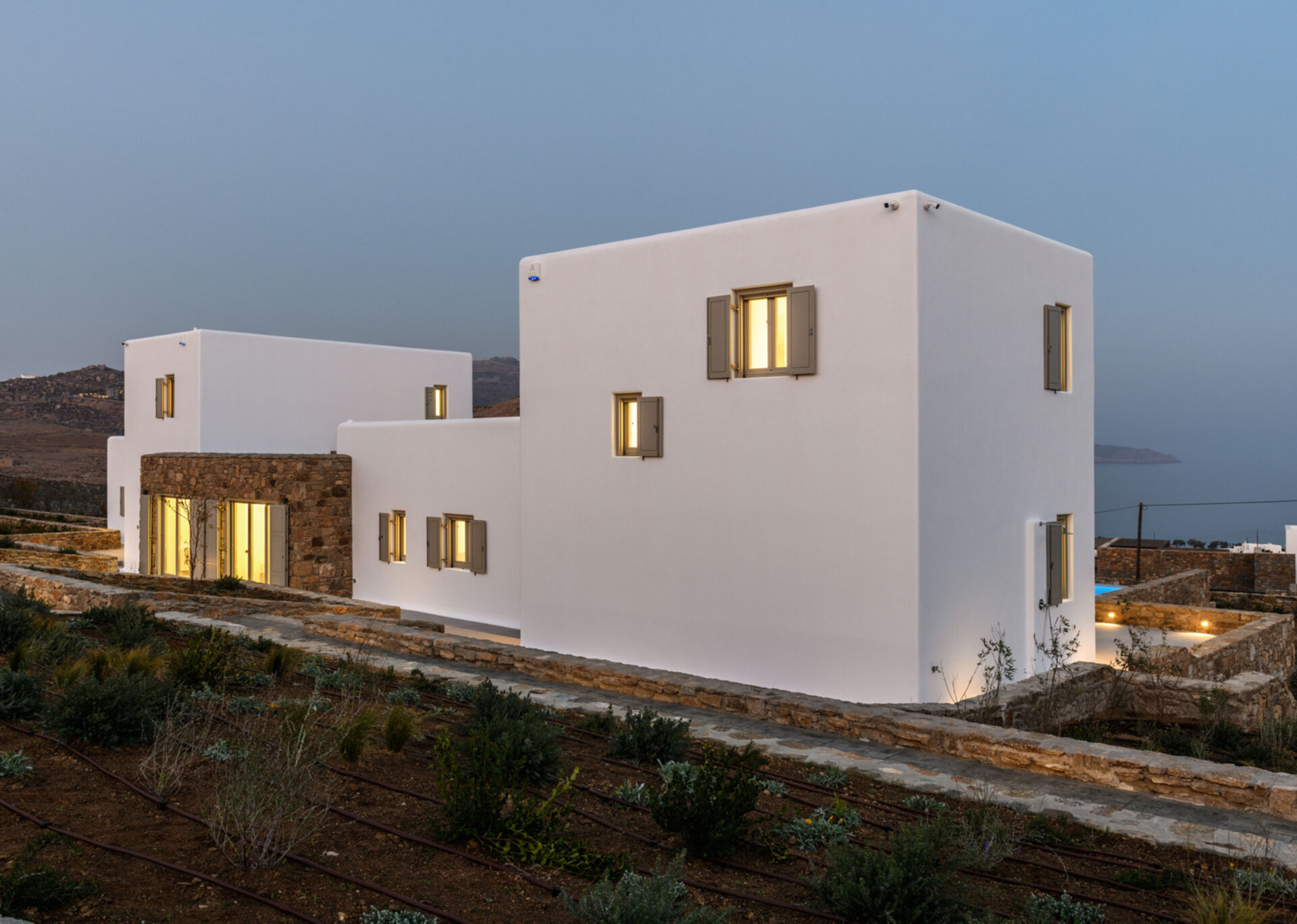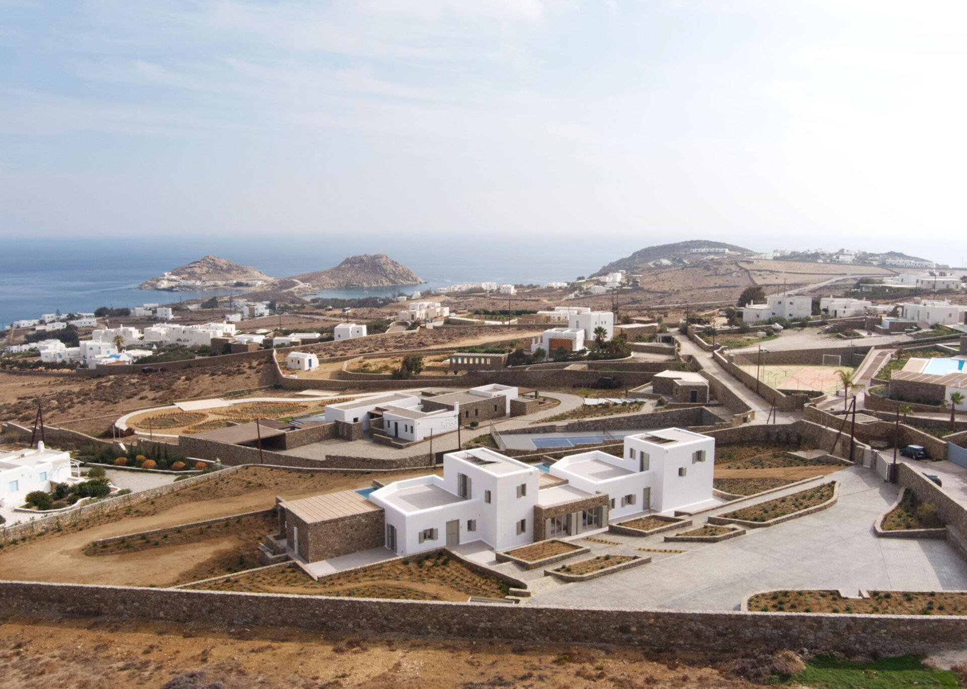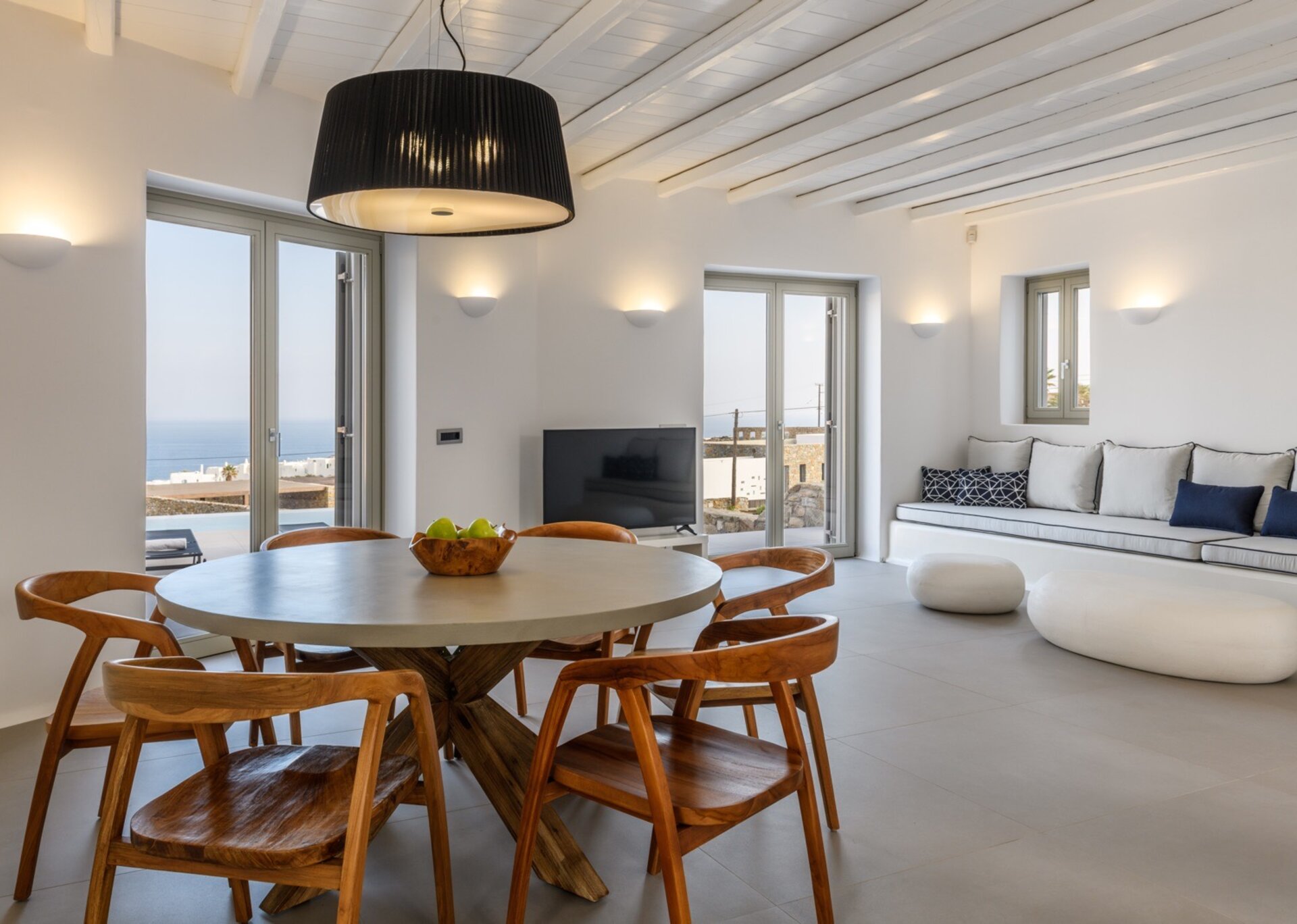 Each villas has teh outdoor space with priavte swimming pool near to an outer dining place, a pool bar and pergolas that are shaded, ideal for relaxation and to enjoy the panoramic vista and gaze the sunset. The villa is a 5' drive distance from Kalafatis and Kalo Livadi beaches.