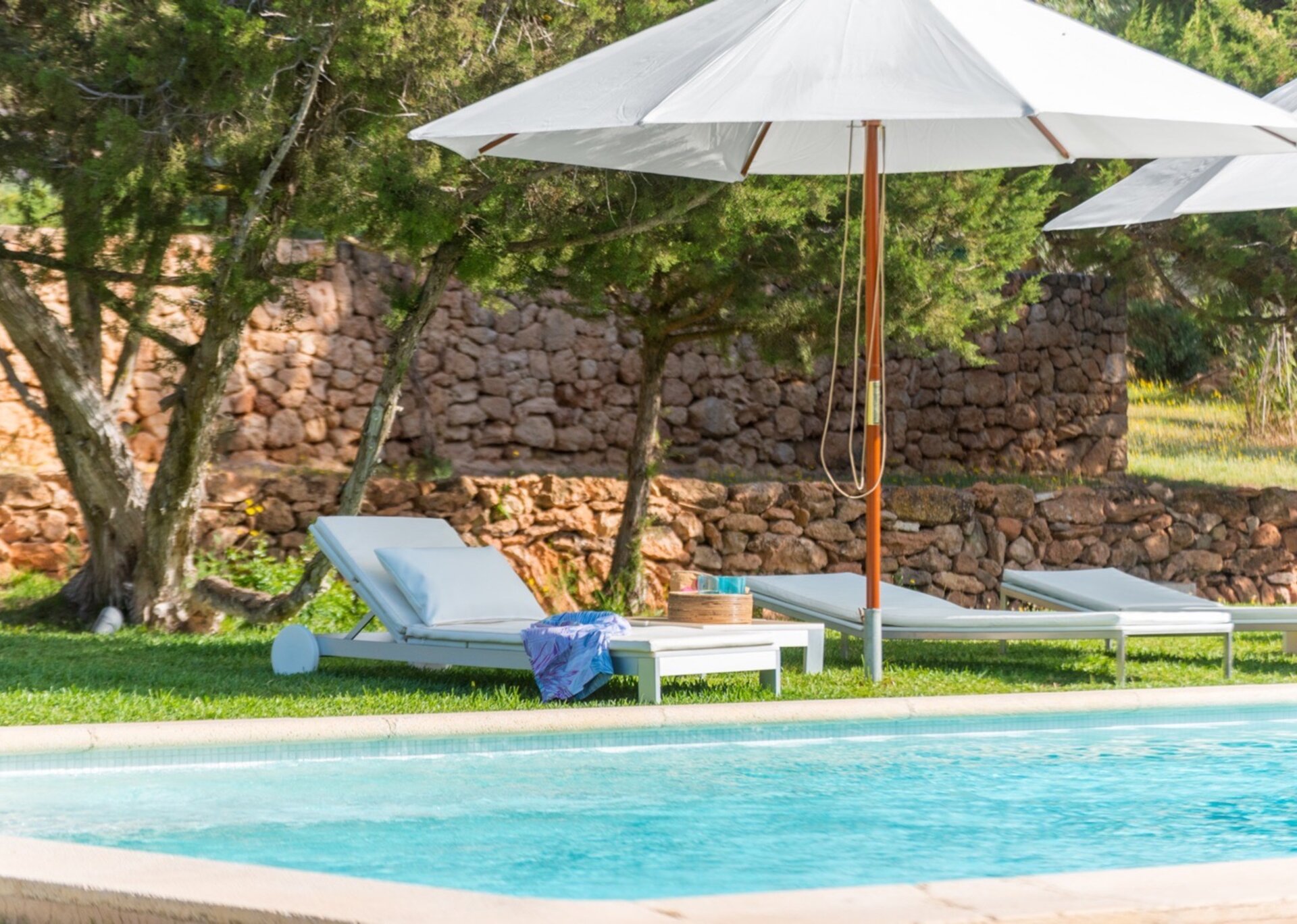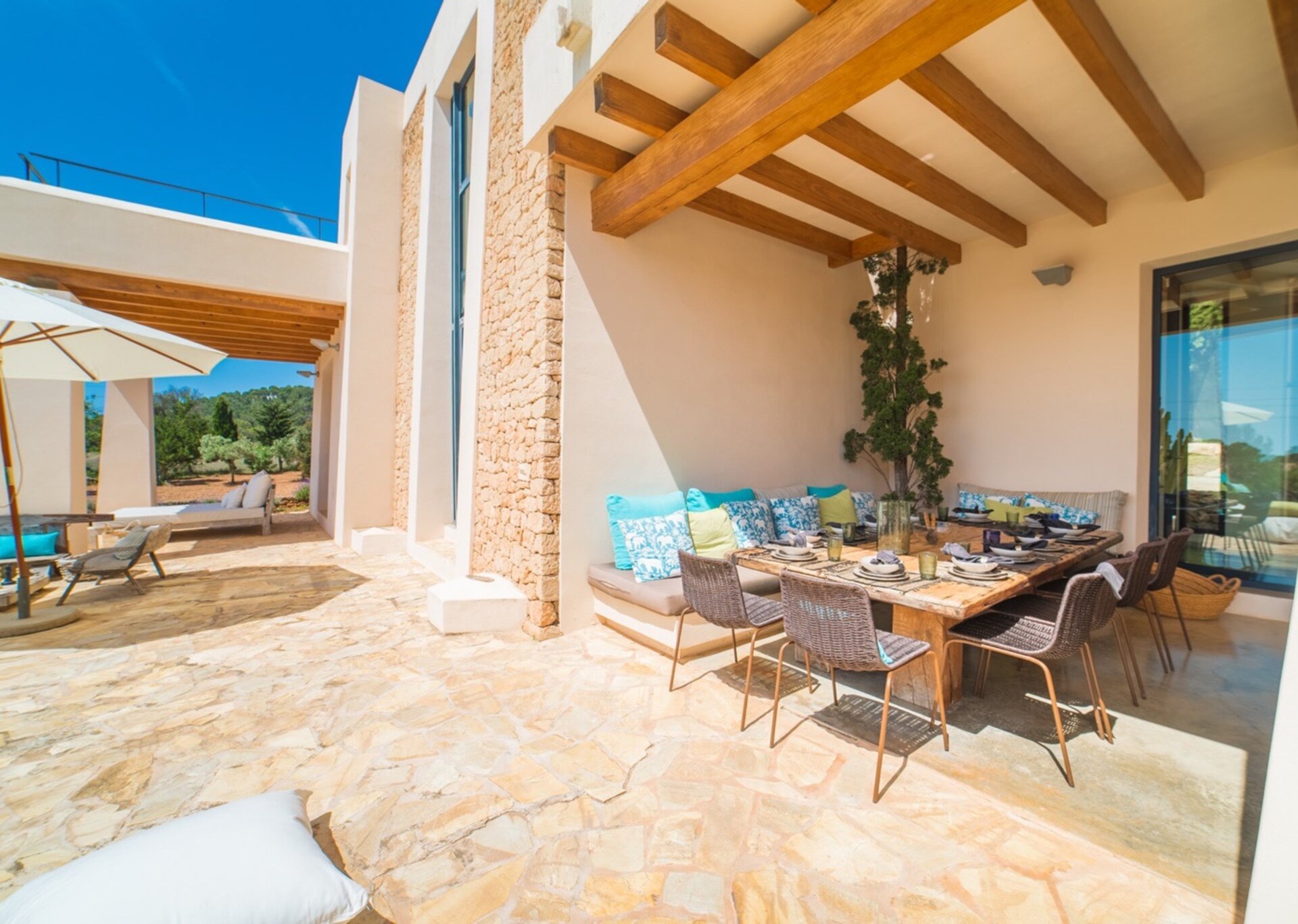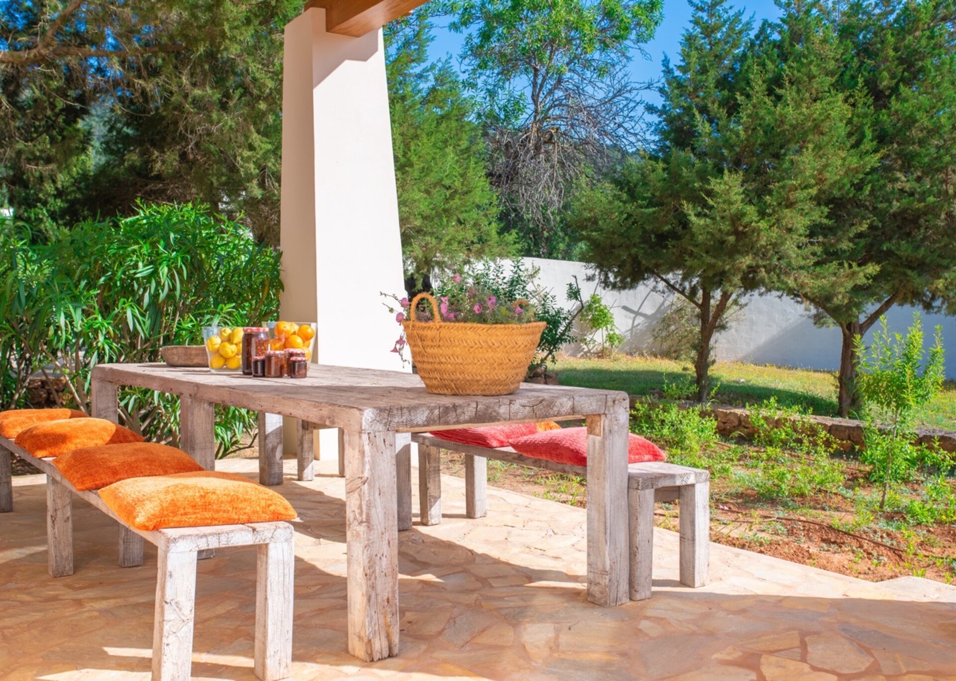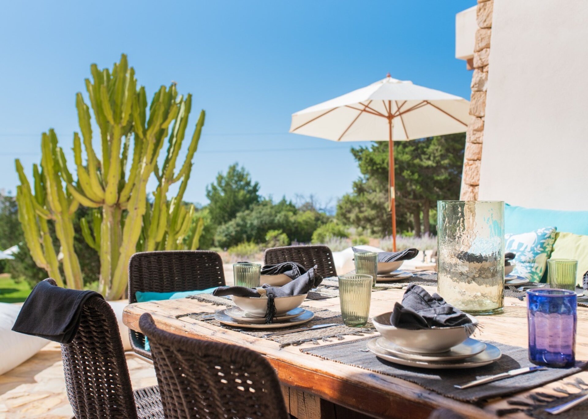 Step outside into Cuervo's fragrant gardens and immerse yourself in the serenity of the surrounding pine forests while taking in the breathtaking views of the Mediterranean Sea. The rustic flagged terrace leads to vast, impeccably manicured lawns that meet the fabulous pool, a shaded gazebo, and comfortable sun loungers. An inviting dining space, a cozy low-seated lounge area, and a second al-fresco dining table grace the terrace. Cuervo villa is an unparalleled, captivating hideaway on the beautiful island of Ibiza.
