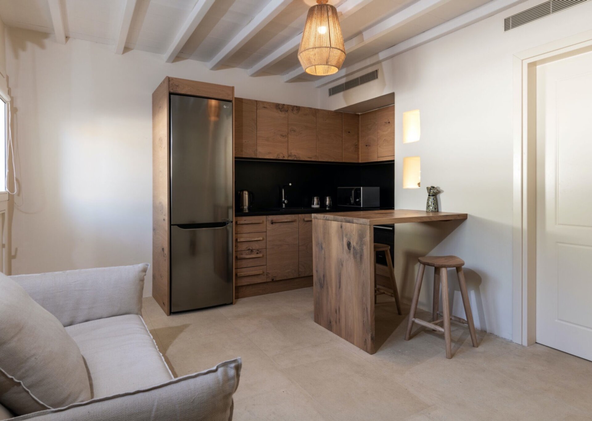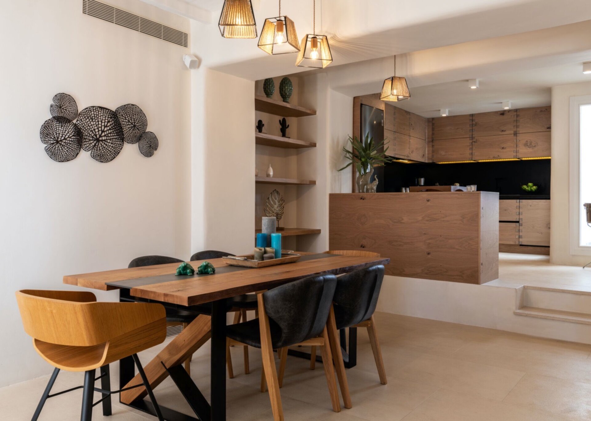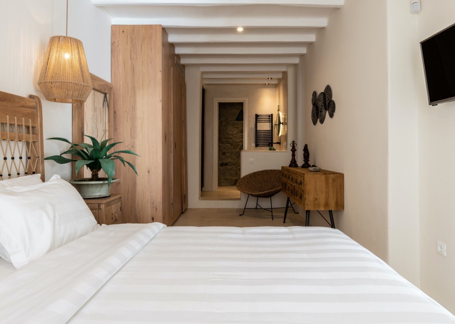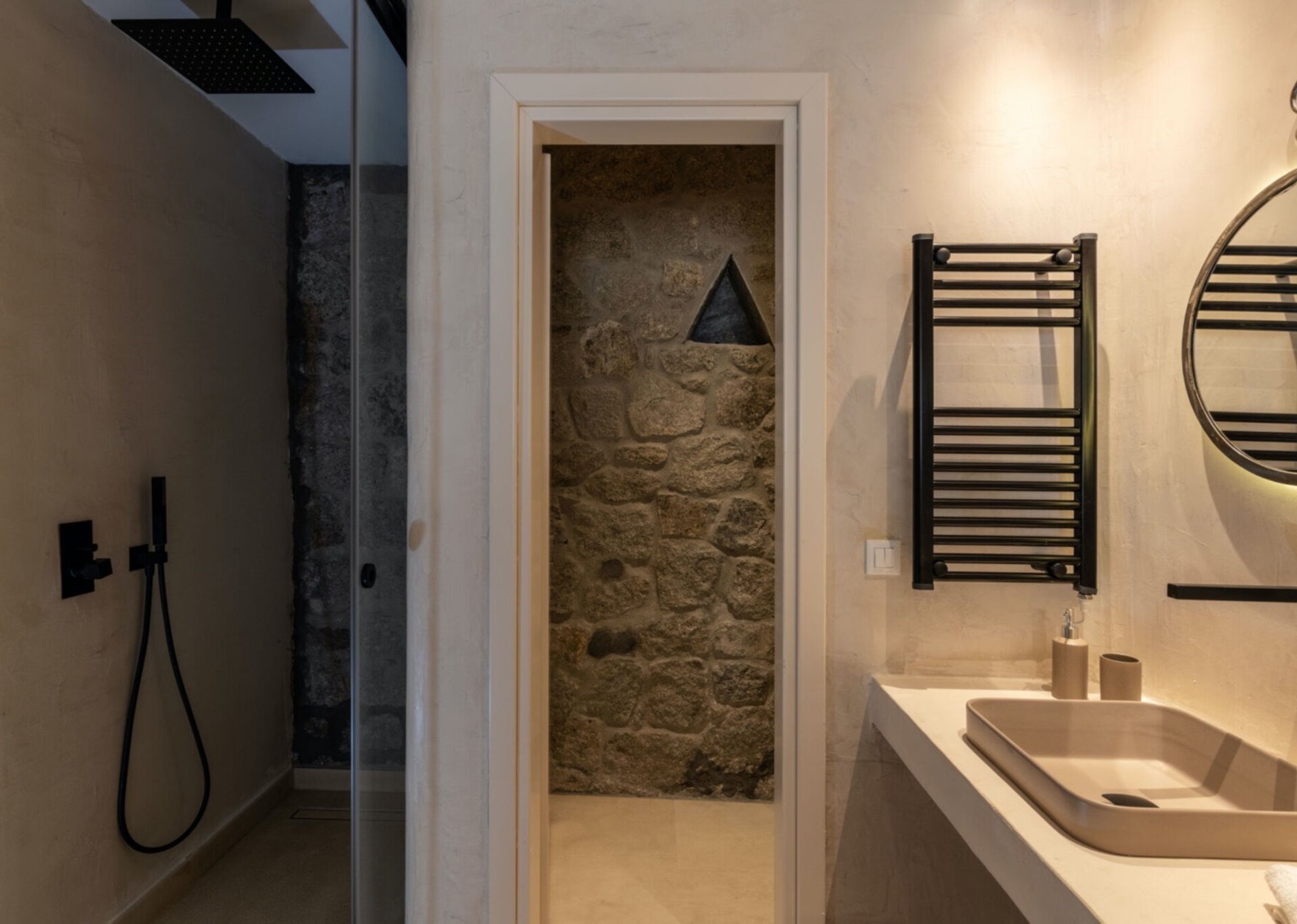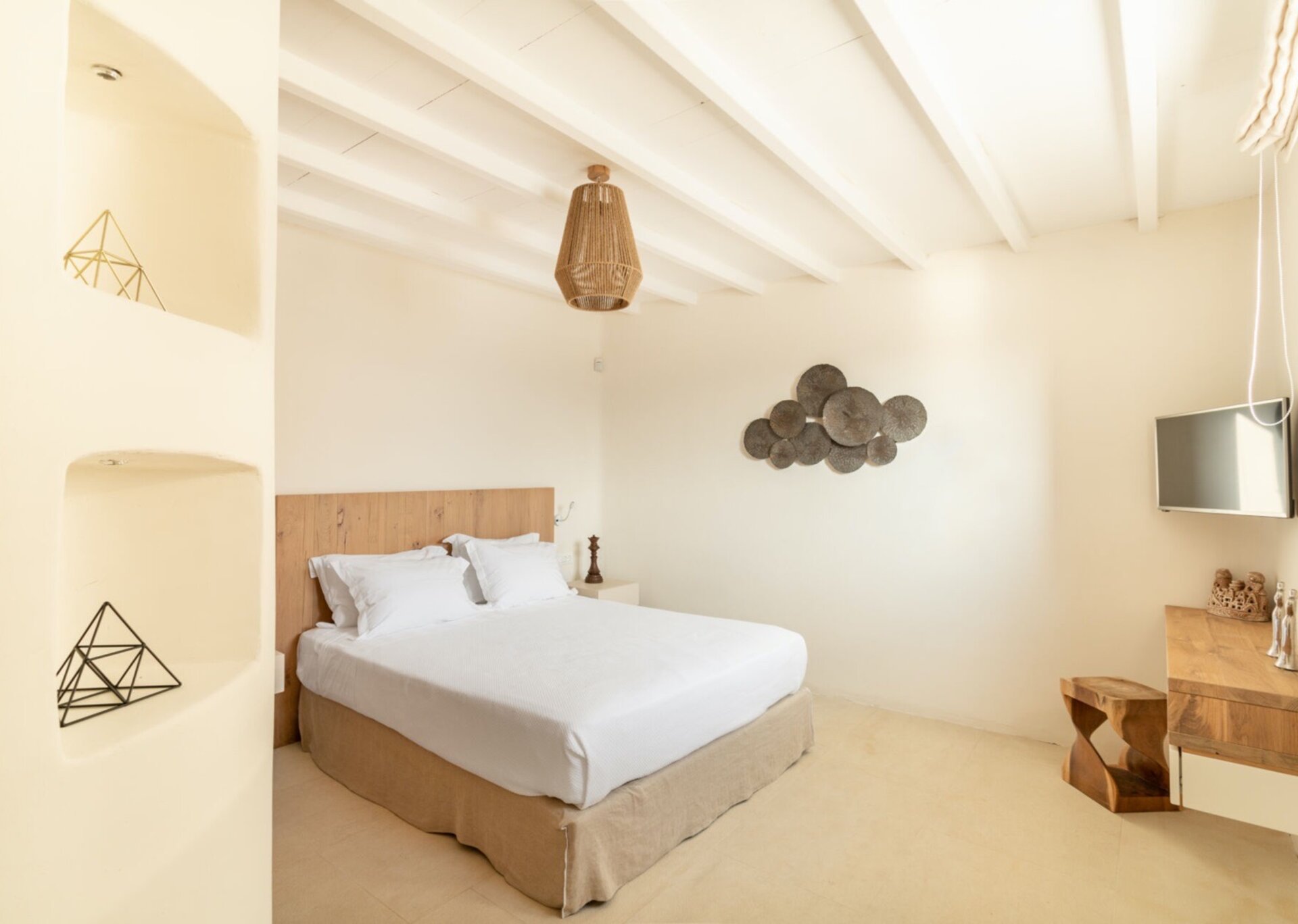 Inside the house the decoration is elegant, the styling is modern and minimal stripped of any unnecessary details, and the furniture is sumptuous. The living room offers a cozy vibe and has comfortable sofas for relaxation. Devya also offers a fully equipped kitchen to prepare a meal and a lovely inner dining area to enjoy it with family and friends.