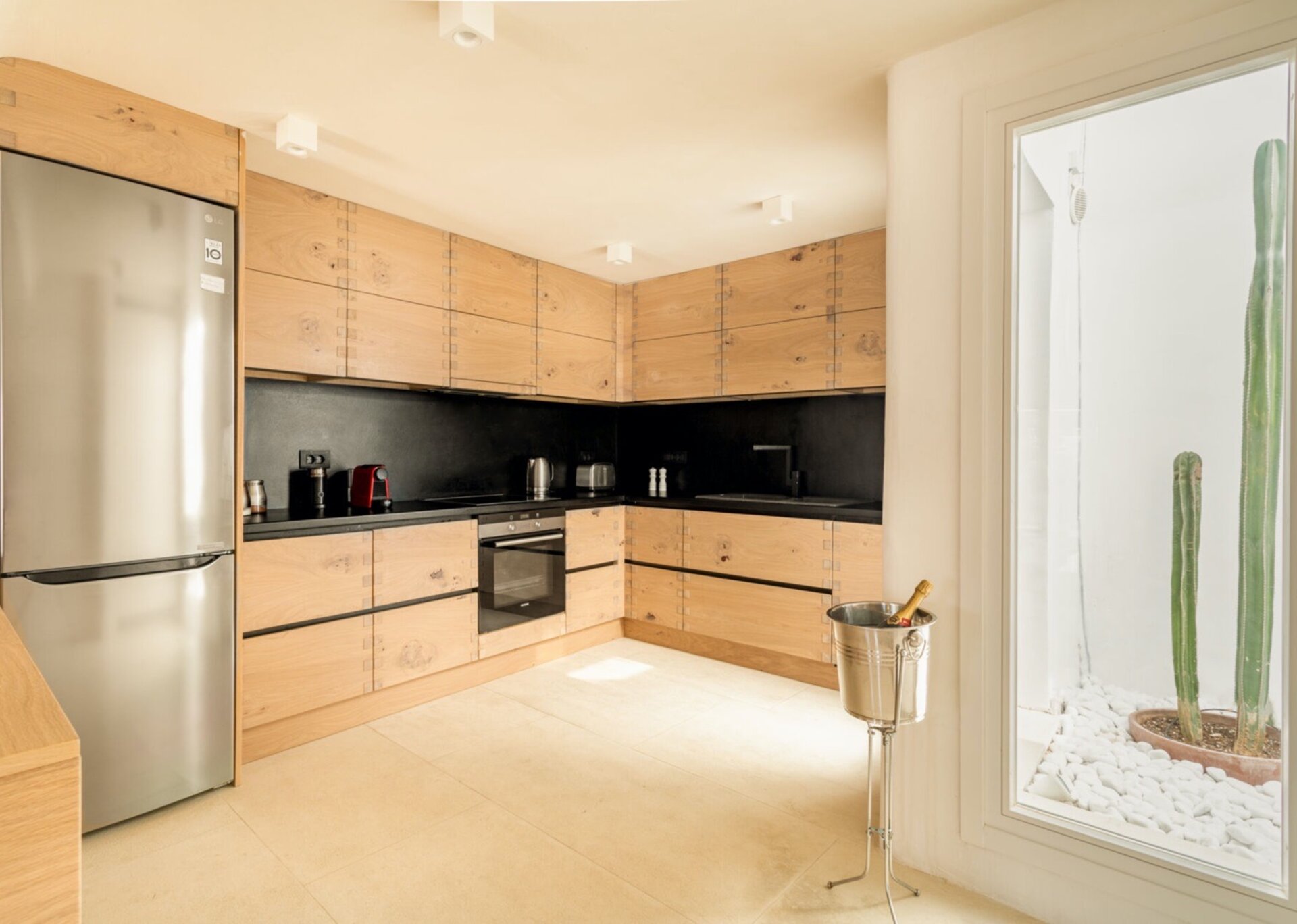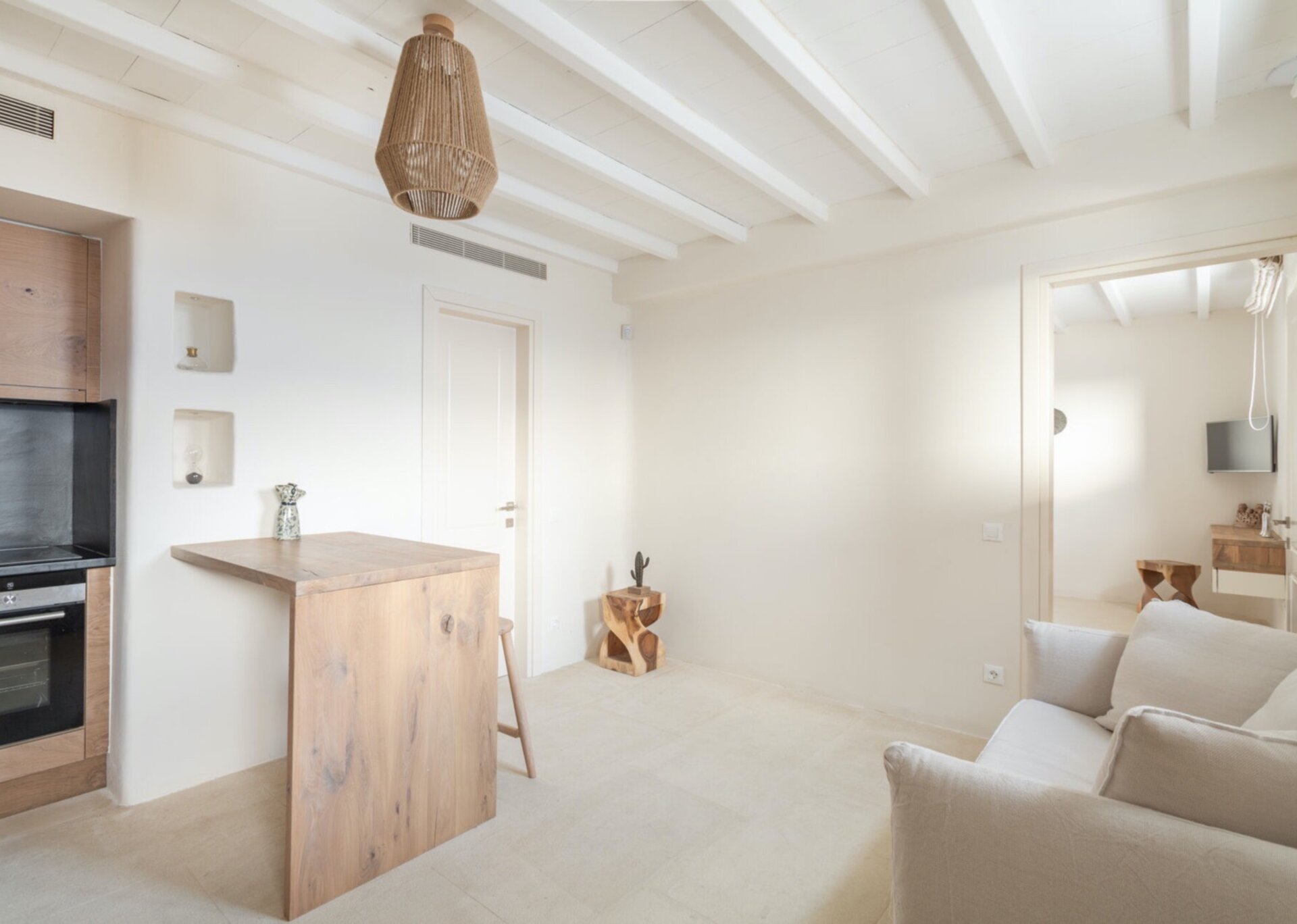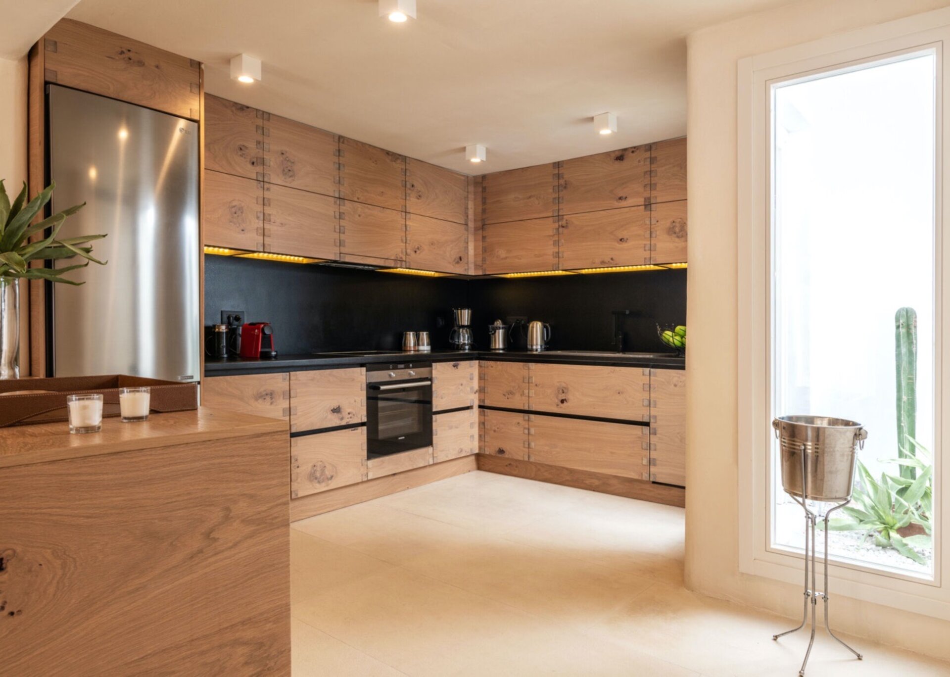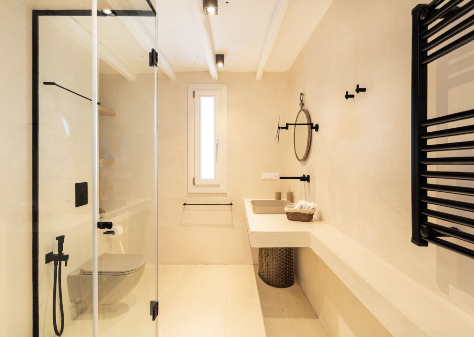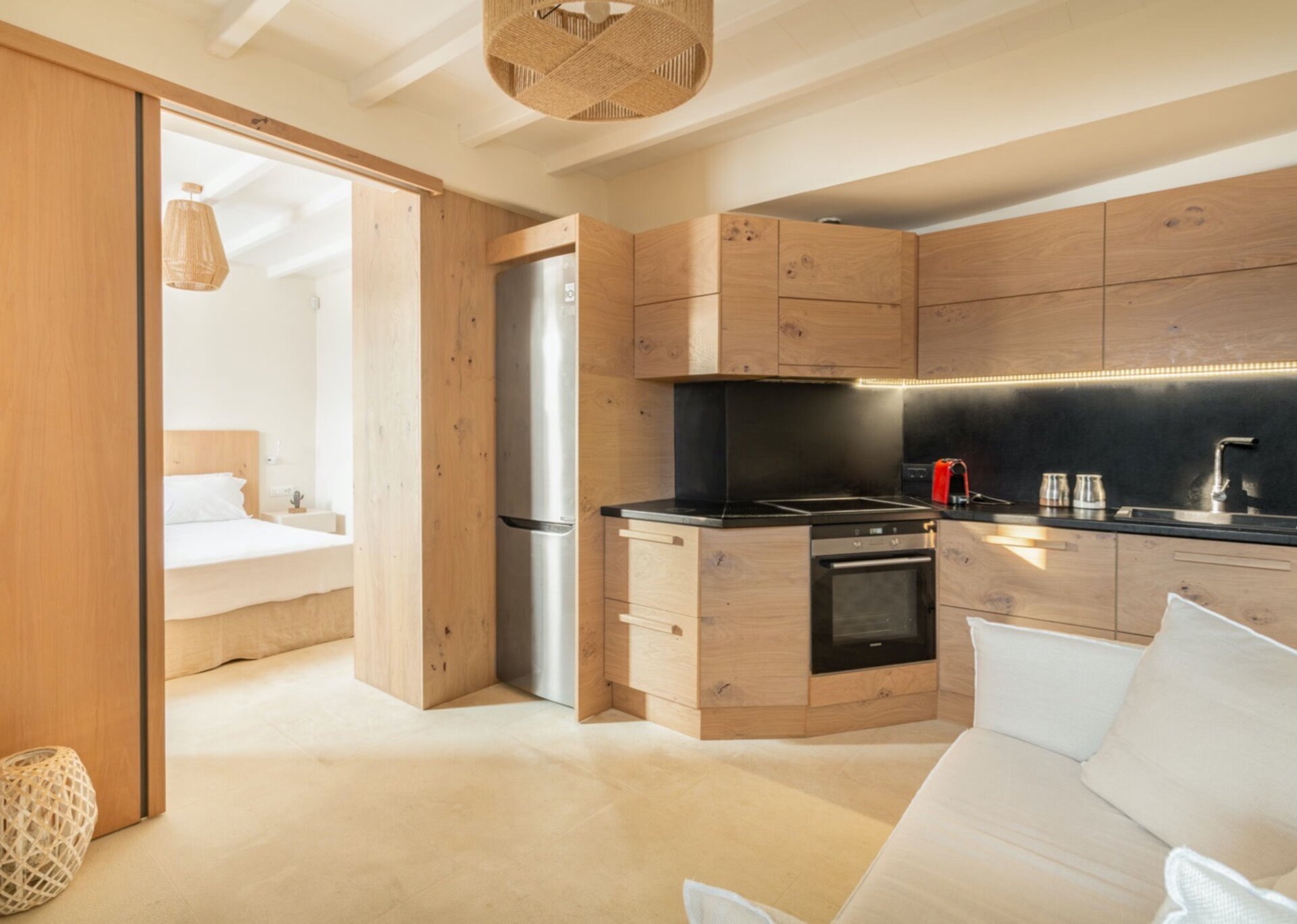 Inside the house the decoration is elegant, the styling is modern and minimal stripped of any unnecessary details, and the furniture is sumptuous. The living room offers a cozy vibe and has comfortable sofas for relaxation. Devya also offers a fully equipped kitchen to prepare a meal and a lovely inner dining area to enjoy it with family and friends.