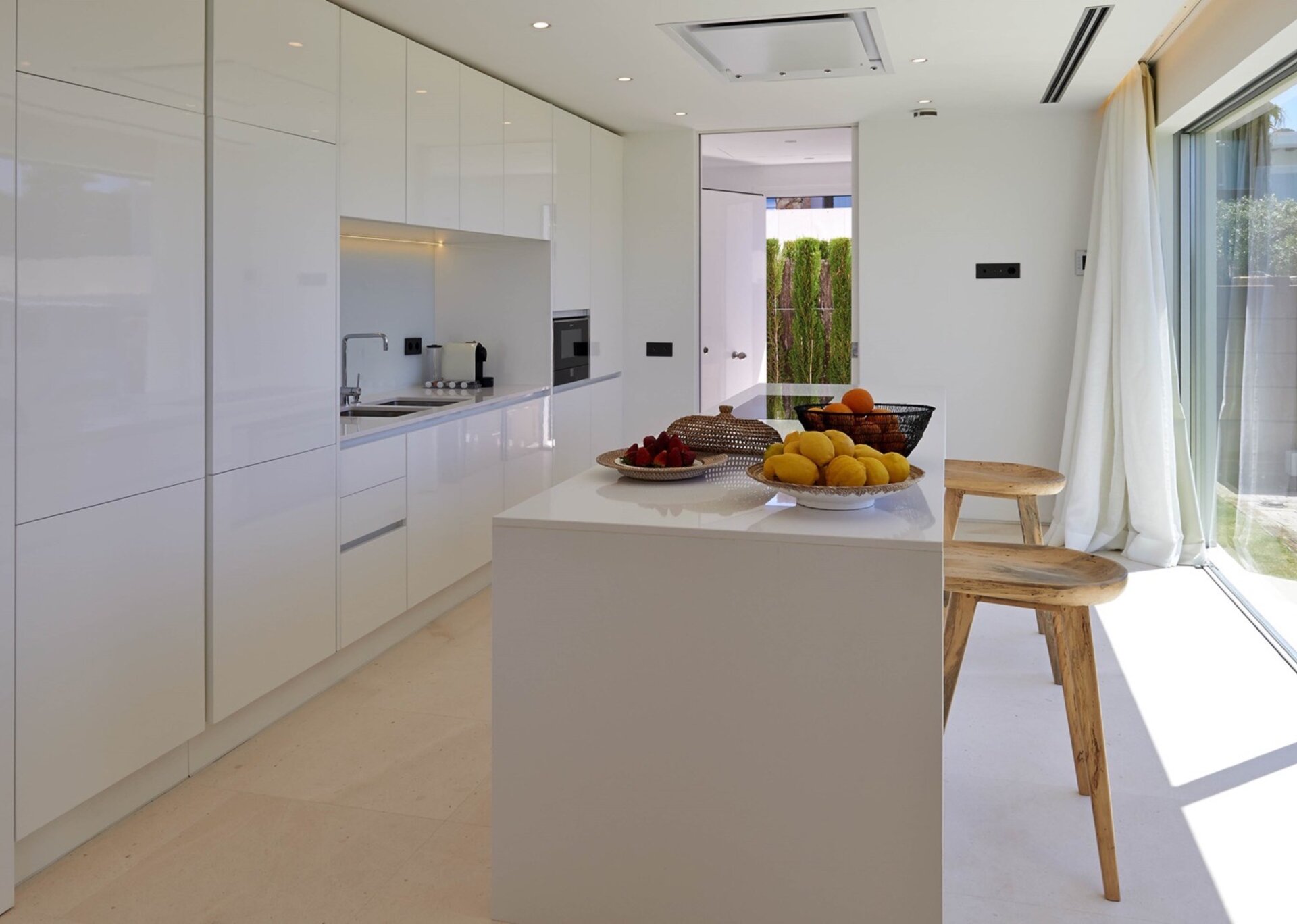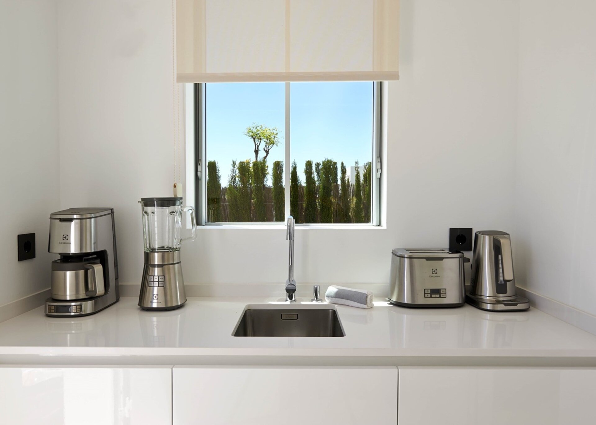 The villa showcases a spacious basement laundry room equipped with a double washing machine and Bosch double dryer. The kitchen is fully equipped with a Neff double fridge, a microwave 90, and a Neff dishwasher. Small appliances, including an Electrolux American coffee machine and a Nespresso coffee machine, complete the kitchen's modern amenities. Guests can also take advantage of a secondary service kitchen with outdoor parking access and an adjoining outdoor dining table that comfortably accommodates 10-12 people.