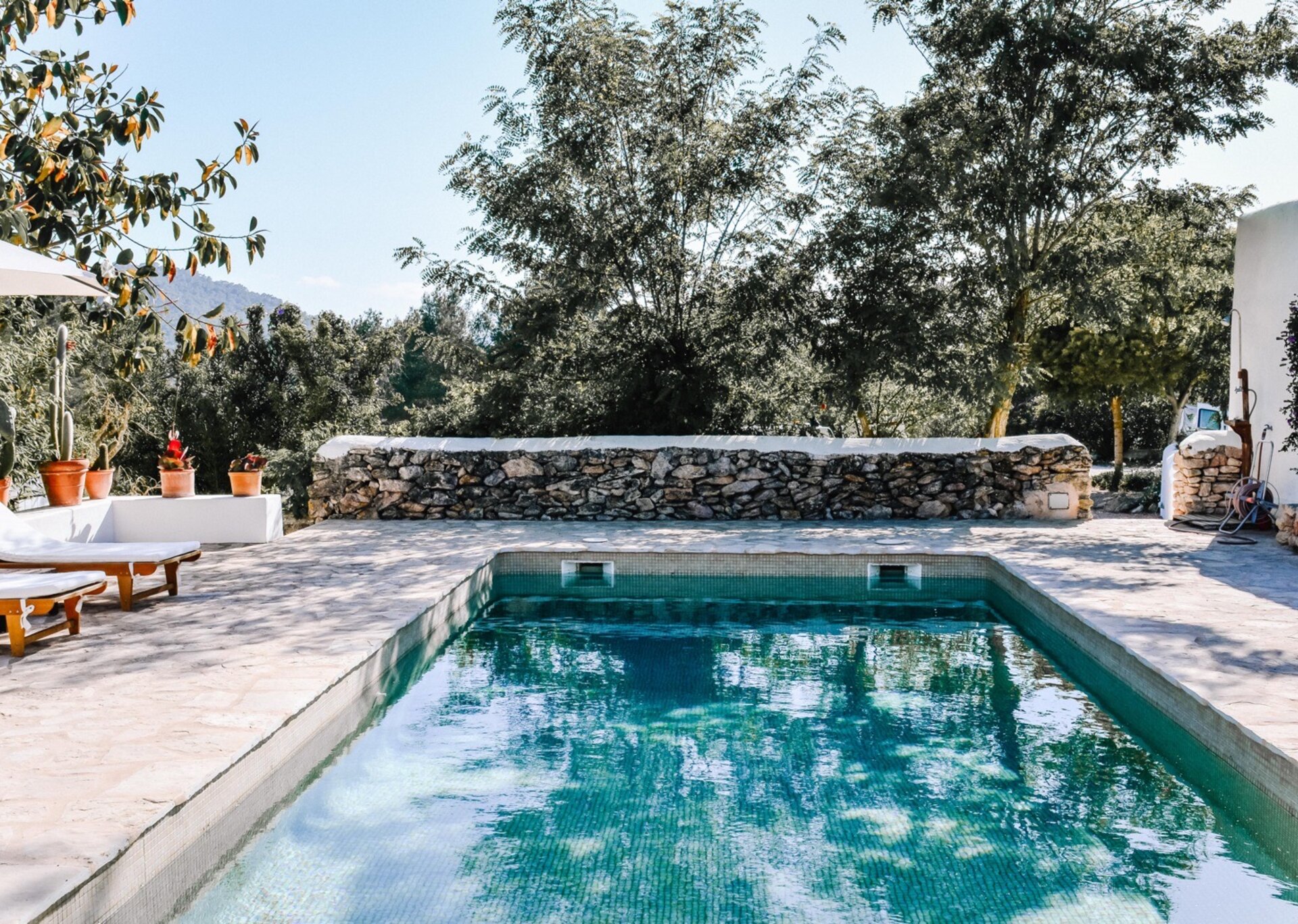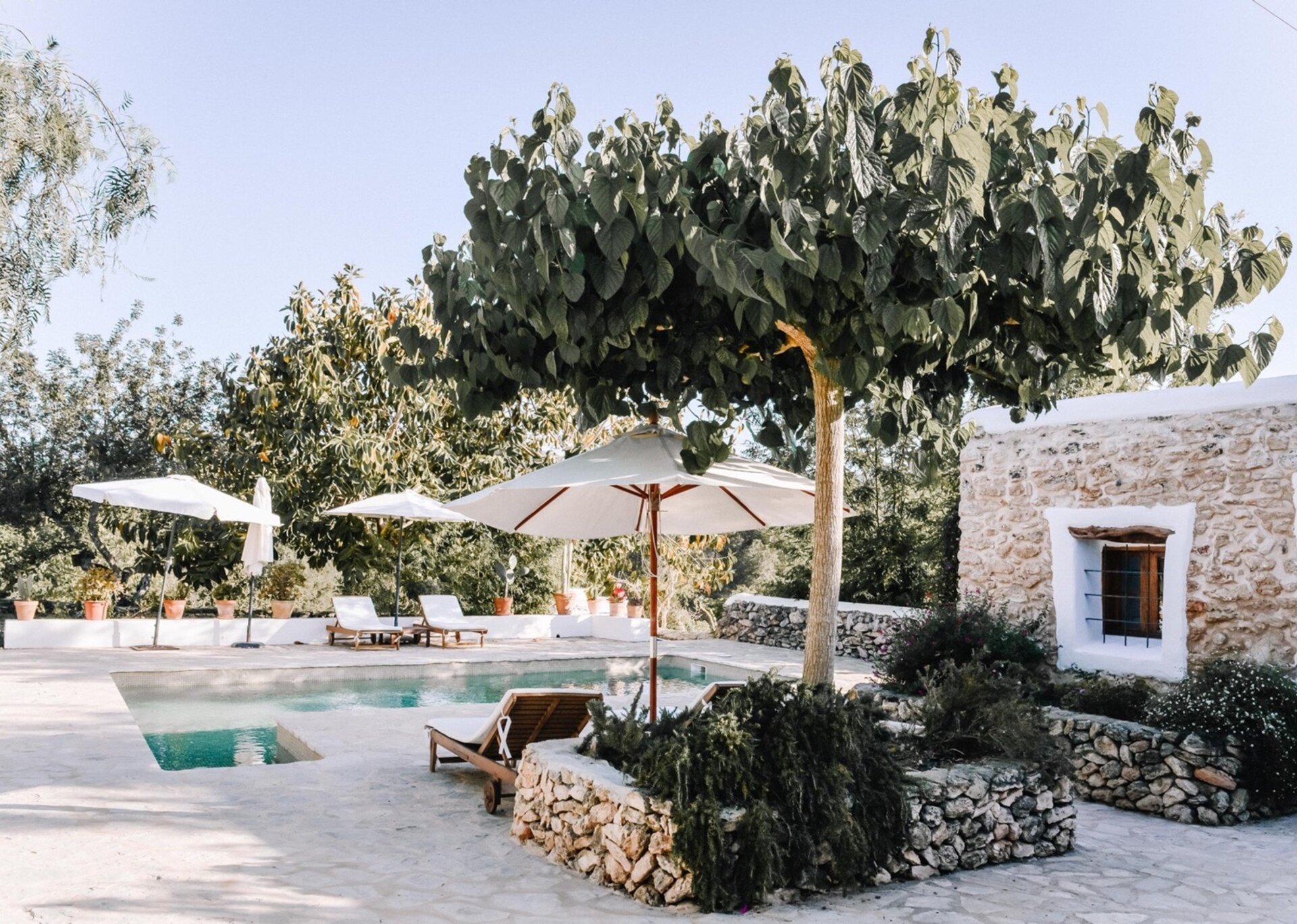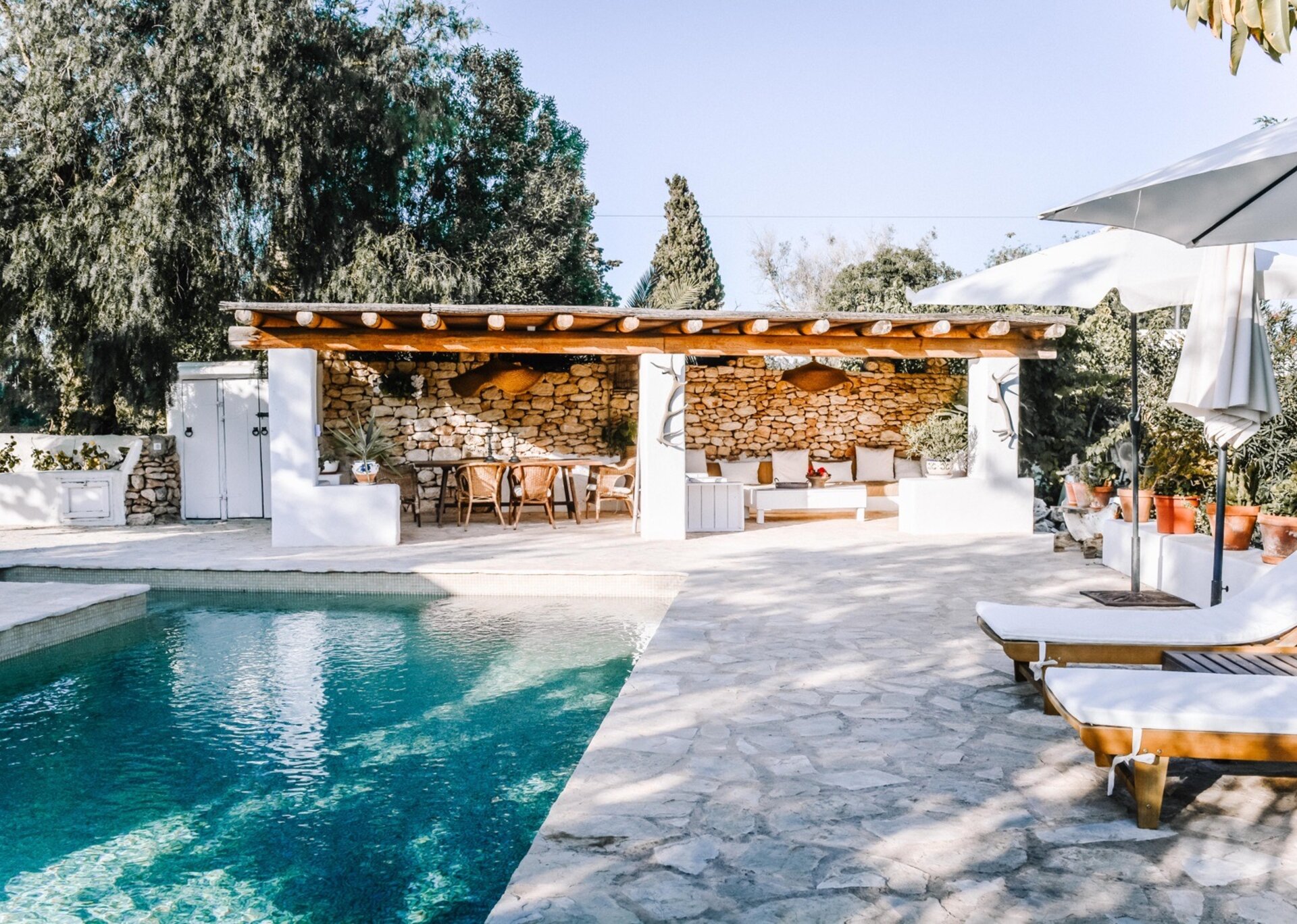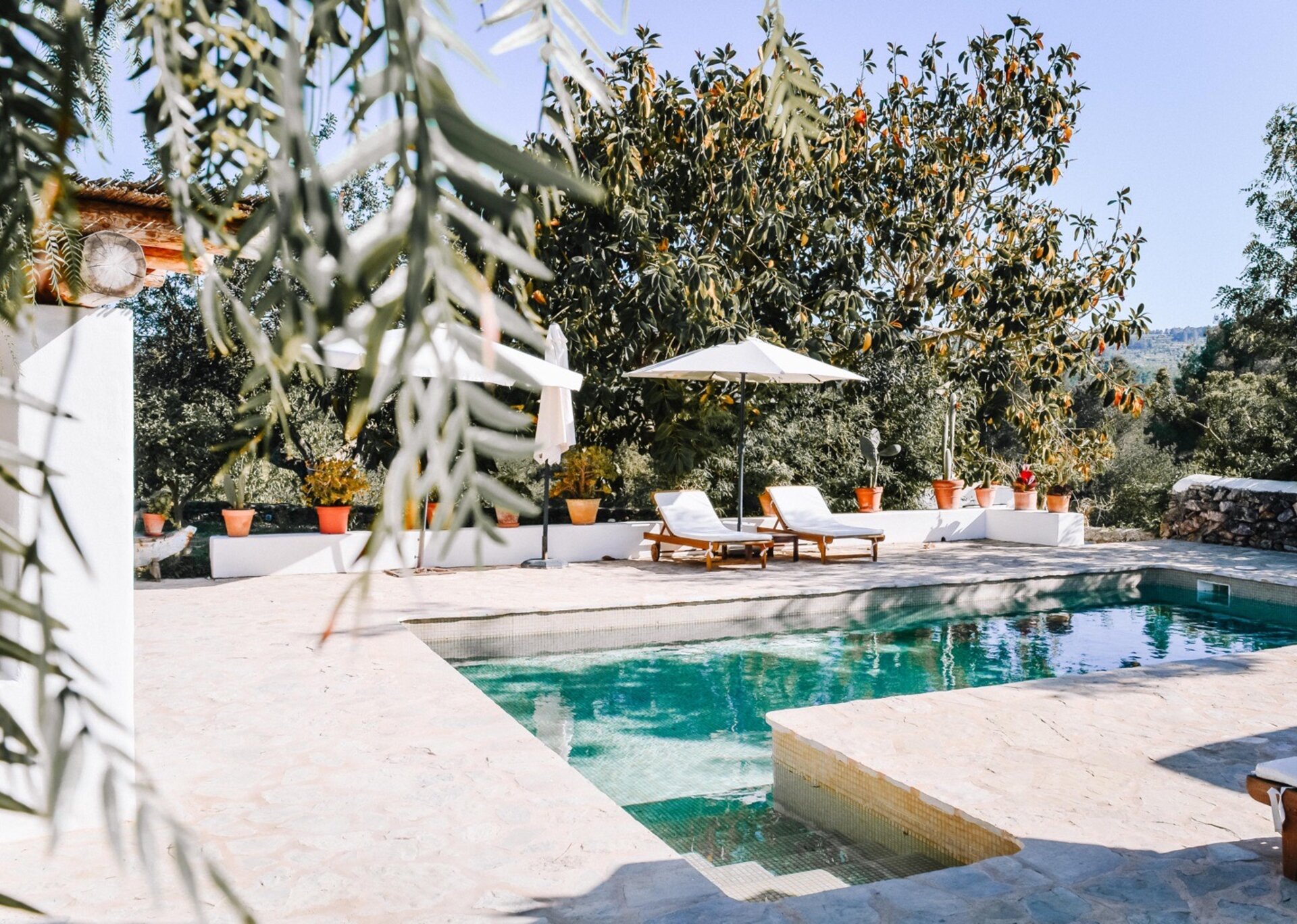 The main house features four bedrooms, while an independent bedroom with its own entrance provides additional privacy. Two of the bedrooms open onto the Mediterranean gardens and poolside terraces. Graced by mature trees that provide shade during the hottest summer months, the expansive terraces perfectly complement the inviting pool (8m x 3.5m, depth 2.2m). The property also offers outdoor dining tables and chill-out areas, allowing guests to leisurely explore the grounds at their own pace. Nestled amidst Mediterranean flora, olive groves, and citrus trees, the property immerses you in the sun-kissed ambiance of Ibiza.