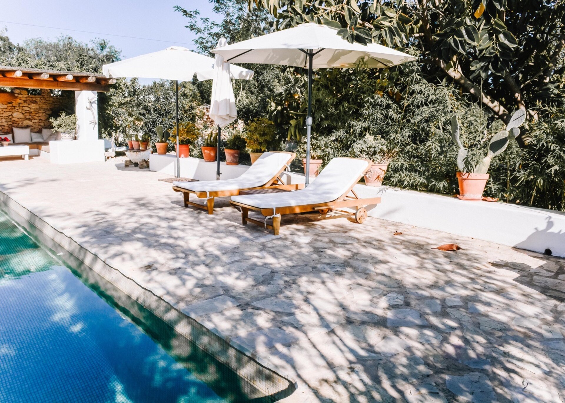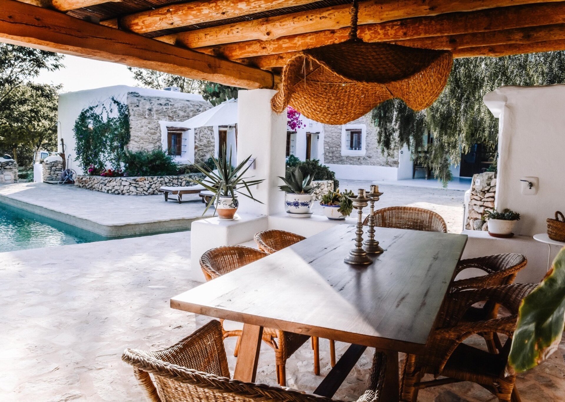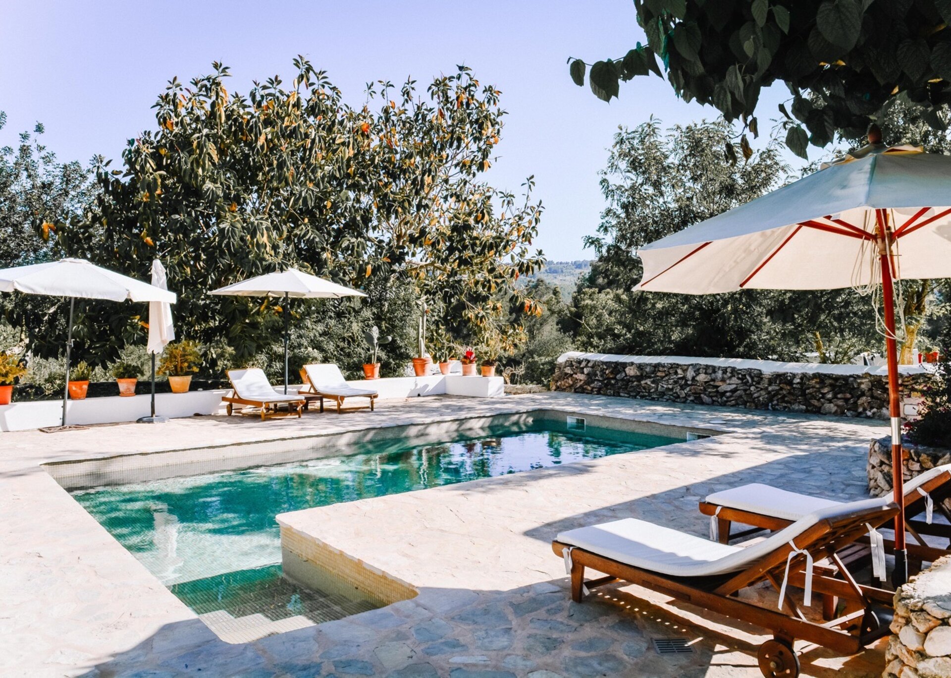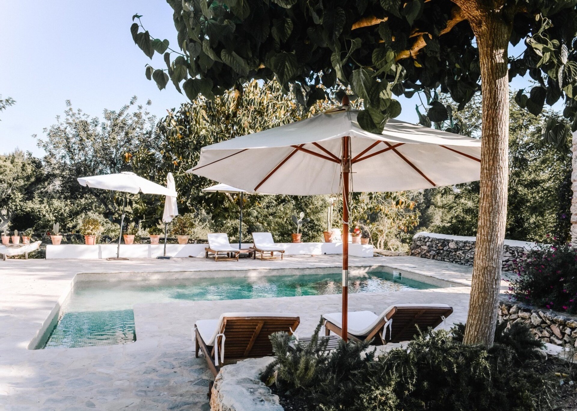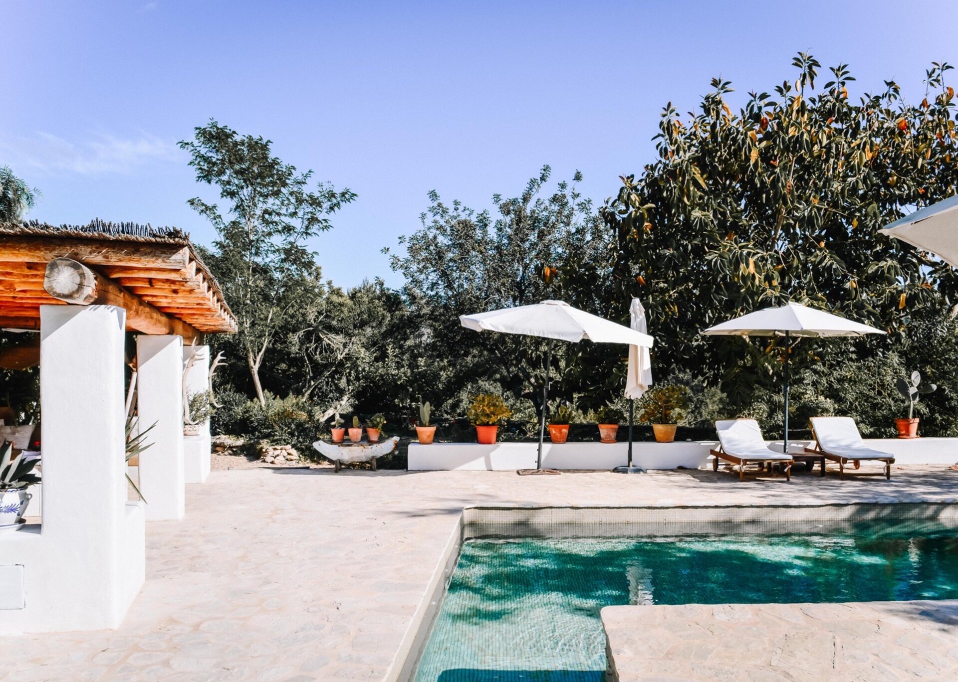 The main house features four bedrooms, while an independent bedroom with its own entrance provides additional privacy. Two of the bedrooms open onto the Mediterranean gardens and poolside terraces. Graced by mature trees that provide shade during the hottest summer months, the expansive terraces perfectly complement the inviting pool (8m x 3.5m, depth 2.2m). The property also offers outdoor dining tables and chill-out areas, allowing guests to leisurely explore the grounds at their own pace. Nestled amidst Mediterranean flora, olive groves, and citrus trees, the property immerses you in the sun-kissed ambiance of Ibiza.