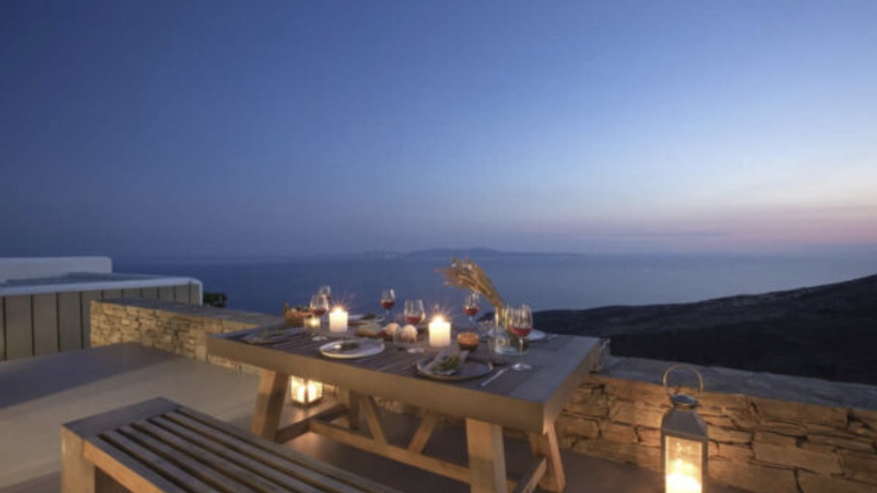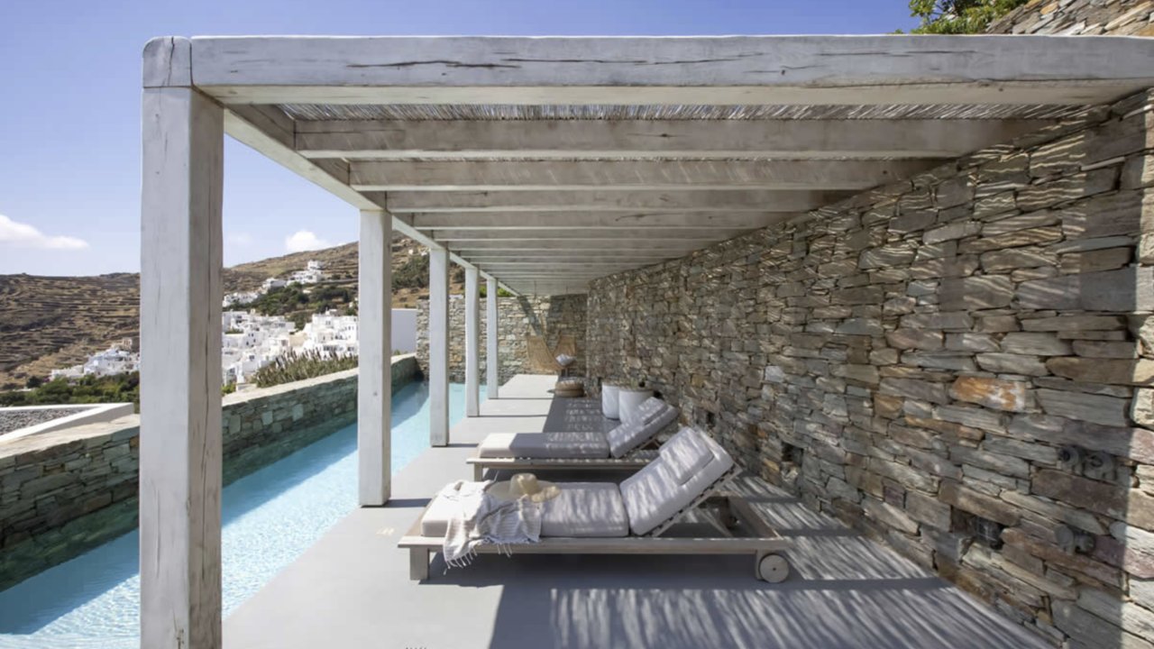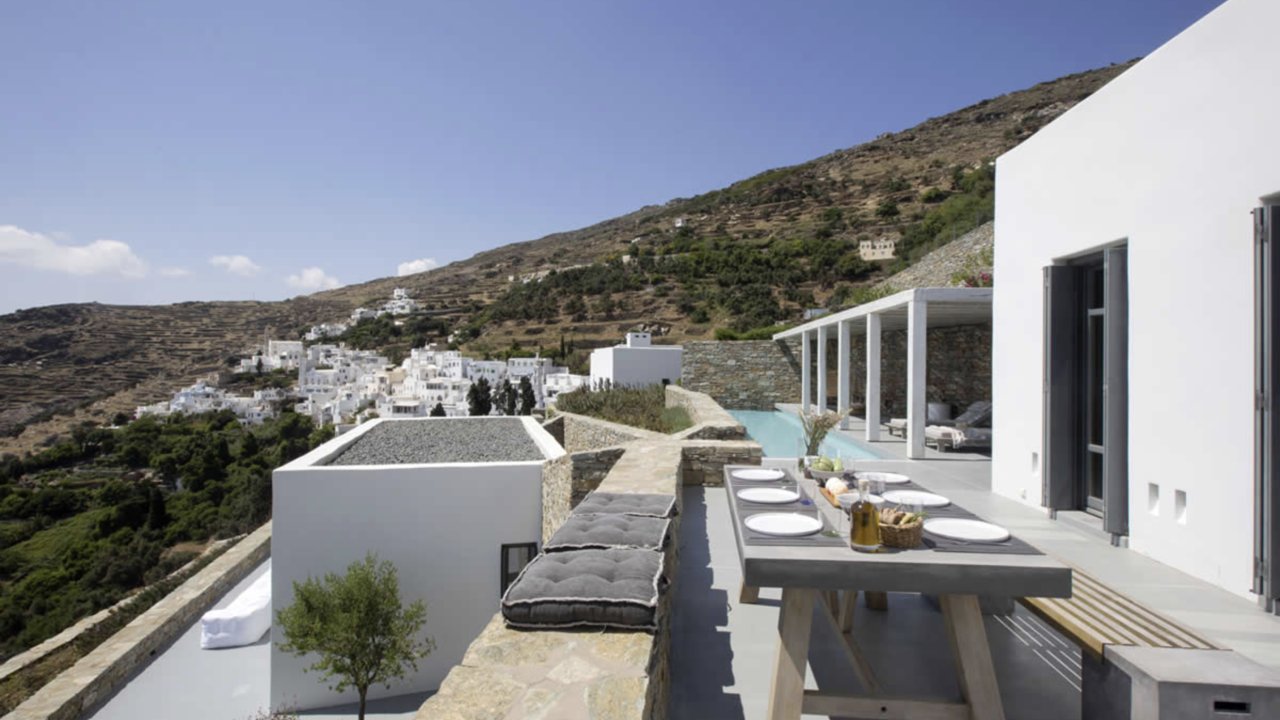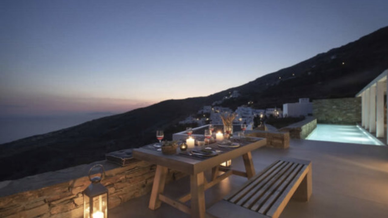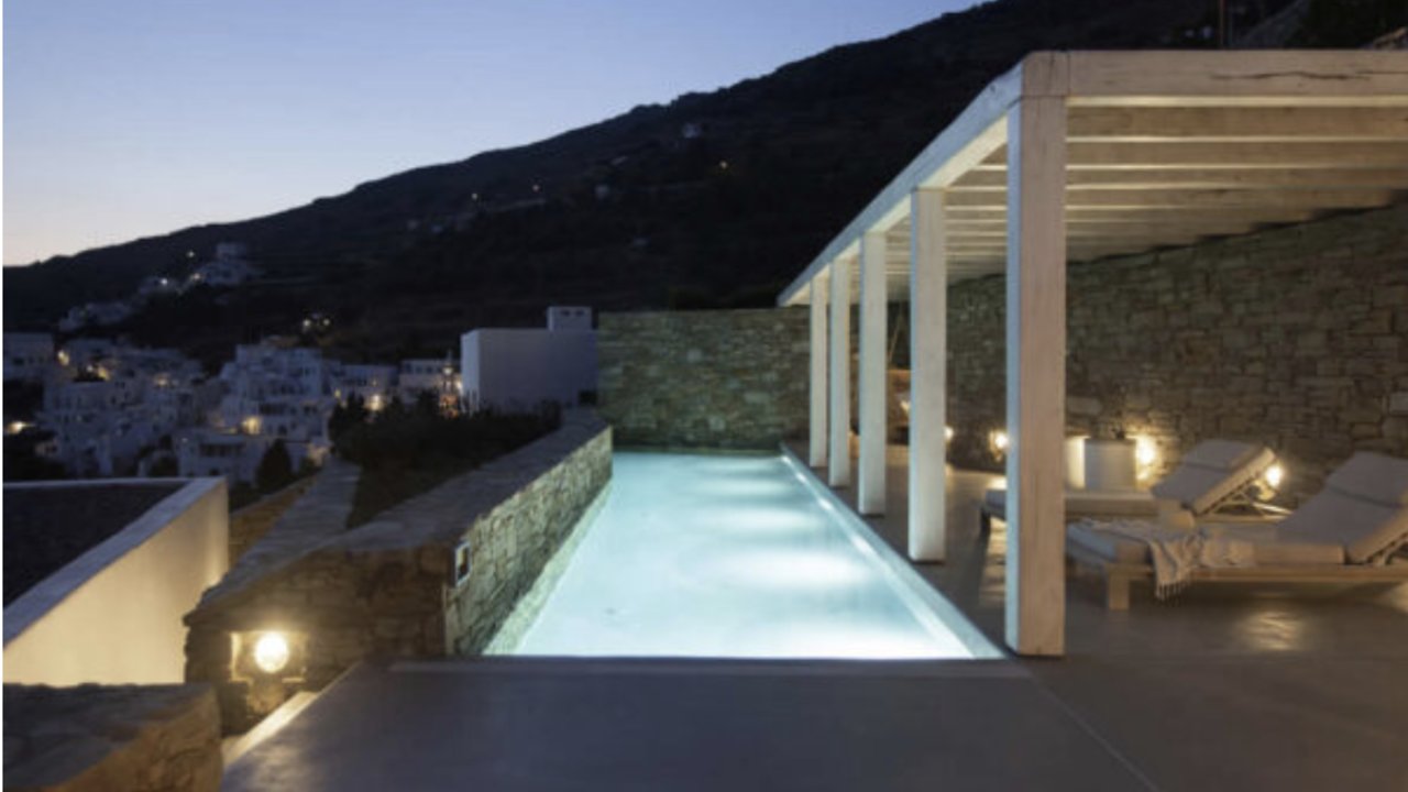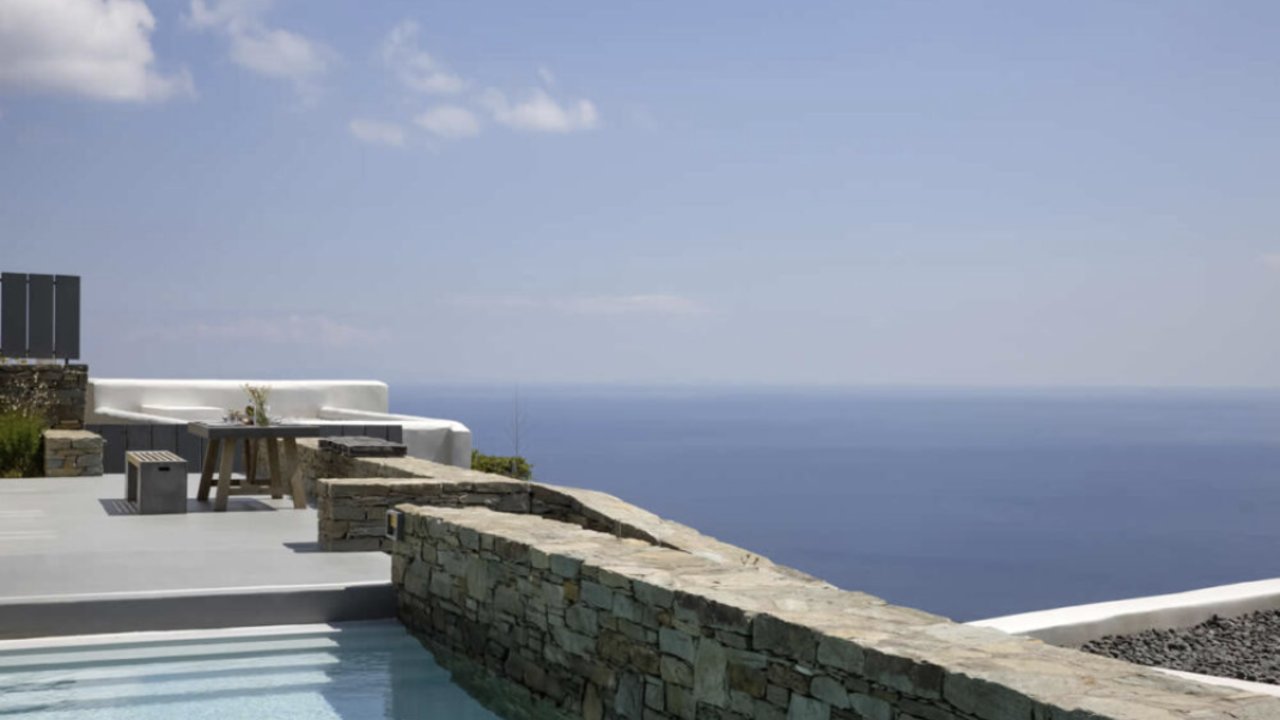 Where sea and sky find their meeting point, Villa Dione offers the most relaxing and tranquil holiday experience. Nested in the village of Kardiani, at the south part of the island of Tinos and therefore protected from the north wind “Aeolos”, Villa Dione is a minimal cycladic architectural gem with a private swimming pool that grants ultimate holiday experience to its guests. Set in three levels, Villa Dione, treasures the virtues of guest’s independence and living harmony, with a sense of subtle luxury. Standing in or out guests can appreciate the purity of the landscape in secluded surroundings and a dream private swimming pool blessed by the embracing views. Elegant and refreshing in its simplicity, the modern style of Villa Dione highlights natural beauty and a resilient Cycladic spirit.