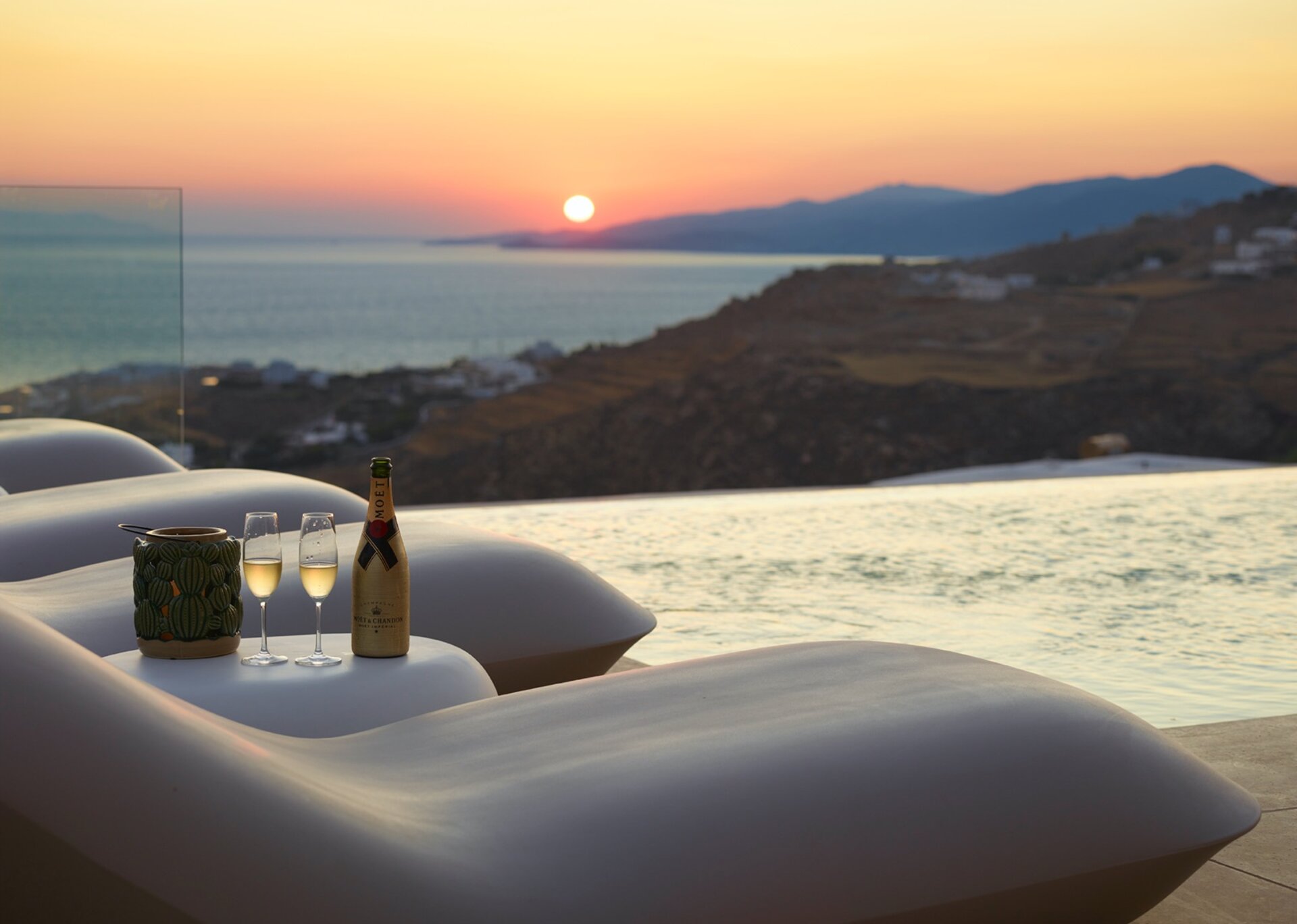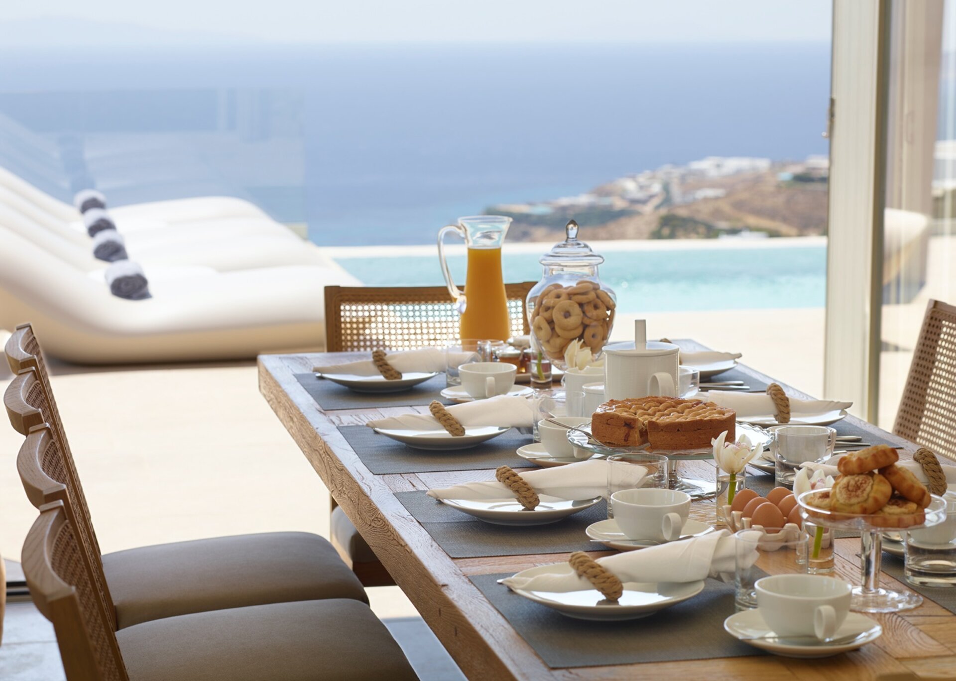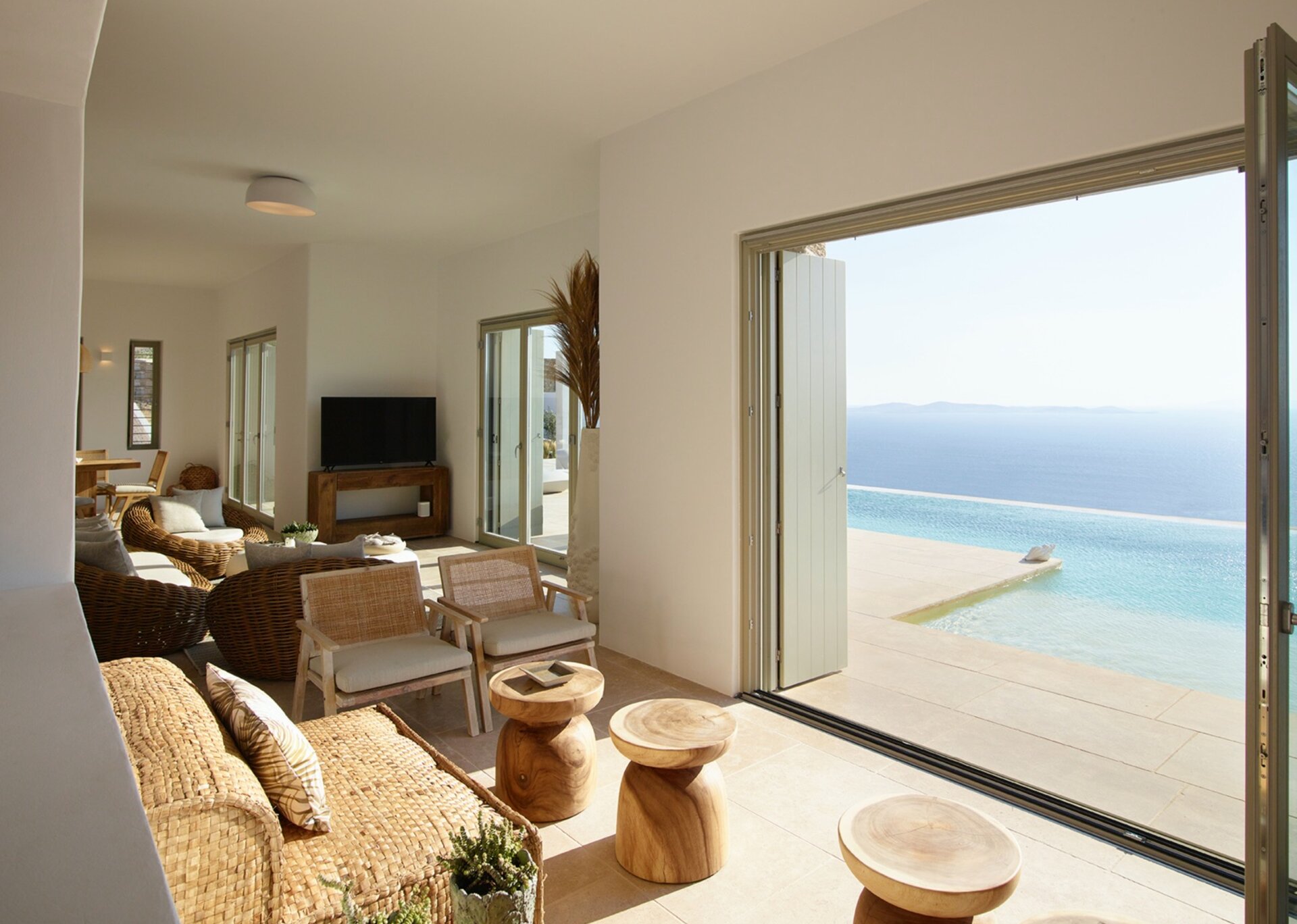 Villa Dominique is a combination of comfortable living with an atmosphere of pure serenity. This luxurious property is the ultimate Mykonian destination and you will be charmed by its soothing ambience. A waterfront estate in Tourlos, that overlooks the Aegean sea and offers panoramic azure vistas of its crystal waters. Outside the house there is a large swimming pool with sunbeds and near it a magnificent outer dining area.