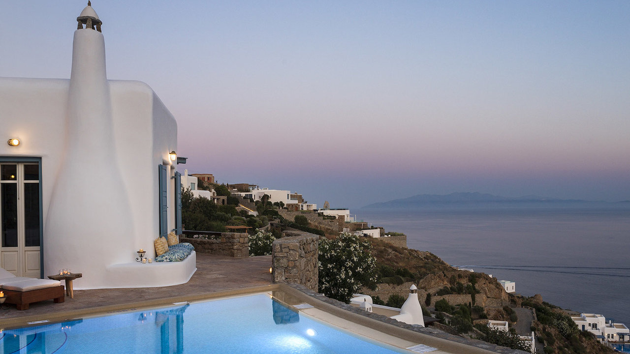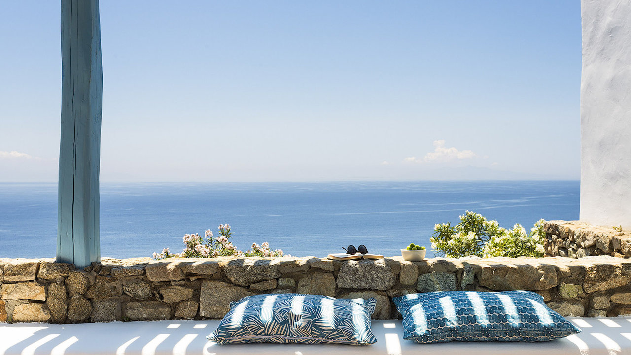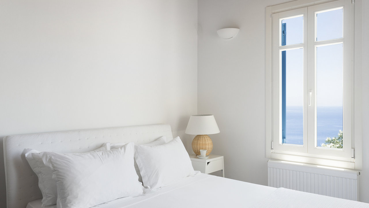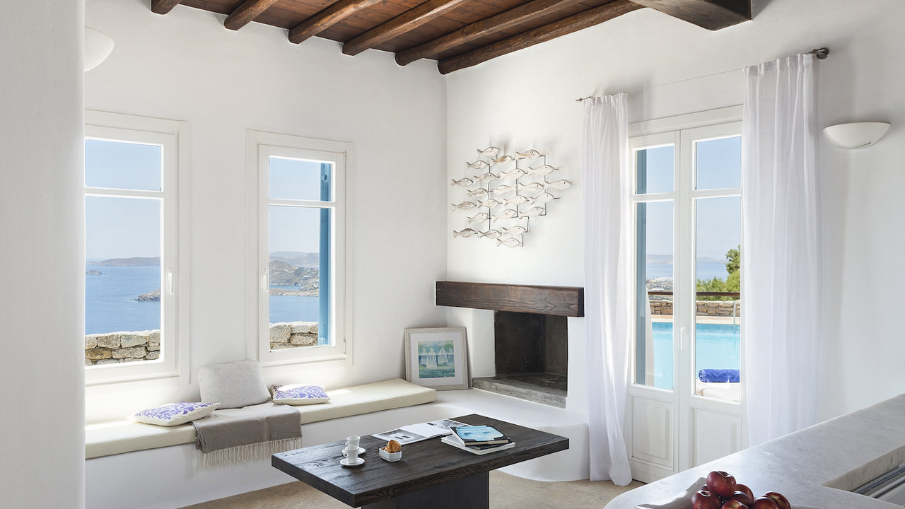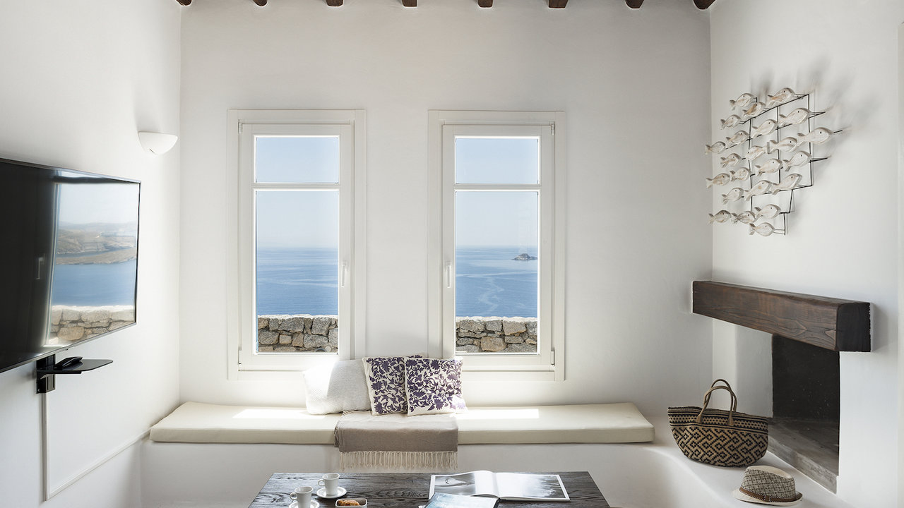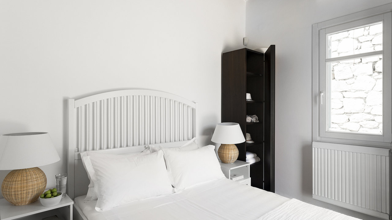 Villa Duende is perched atop the Mykonos private 11-Villa estate and enjoys a bird’s eye view of the islands of Delos and Rhenea, a majestic drop to the sea and the picture-perfect Mykonos sunset. Villa Duende boasts an outdoor BBQ and an outdoor dining & lounging area (sunny & shady all day long)- all in front of the 55 m2 infinity pool that flows off into the Aegean horizon- and you are still less than a three-minute walk to the sea (still within the resort). Villa Duende is uniquely ideal for families with children as it is all on one level. The villas has 3 bedrooms and 2 bathrooms. The brilliant white interiors and exteriors and the subtle tasteful decorations reflect the Mykonian-elegance the island is known for, so you can totally immerse yourself in the spirit of the island. The refurbished luxury estate has daily, complimentary maid service-so you don’t lift a finger, 24/7 CCTV monitoring at the periphery of the estate- so unauthorized people are detectable, Netflix- to quench your thirst for relaxed adventure, flat screen TVs- so everyone can watch, back-up generators- to face the frequent local electric shortages, a desalination plant- so you can ignore the frequent local water shortages, and a 24/7 gate-access control. The pool can be heated for a fee.