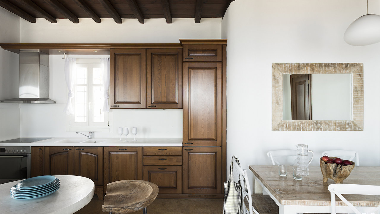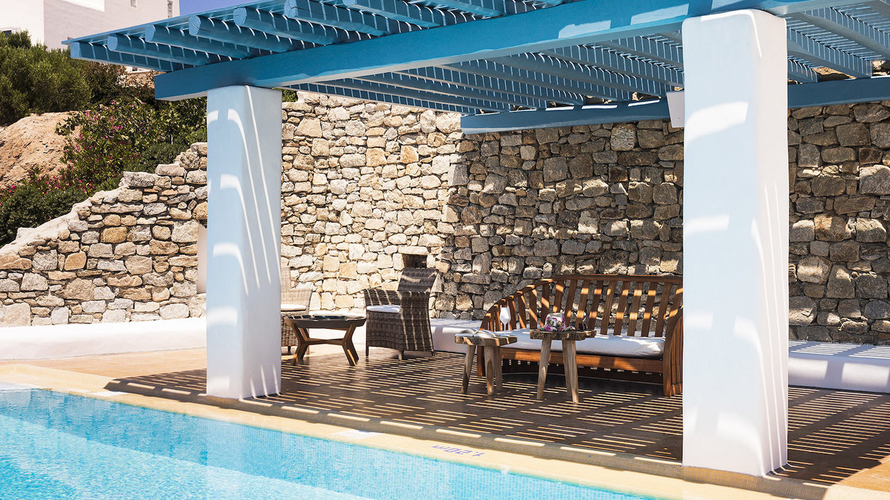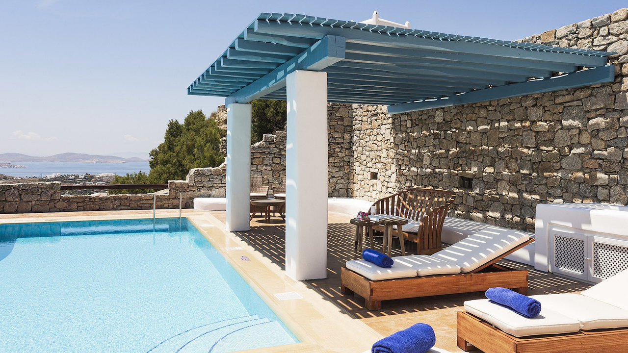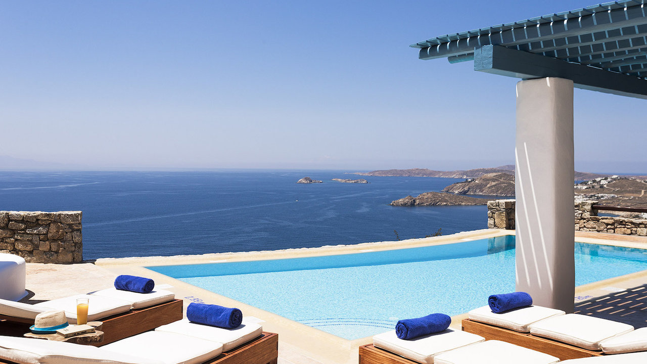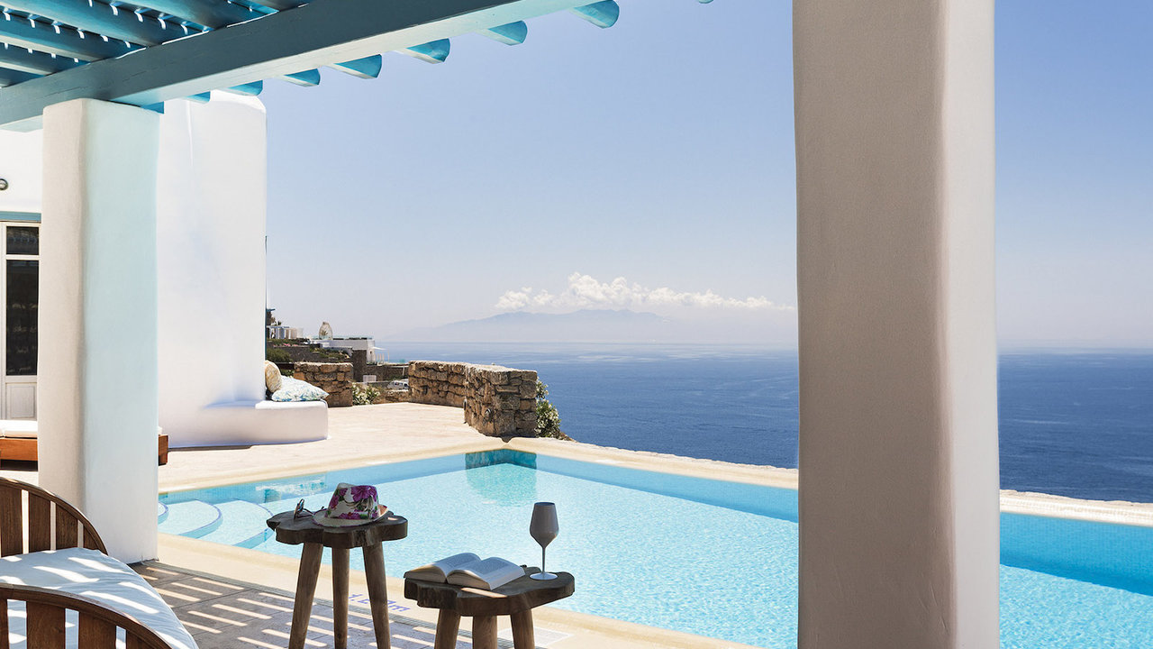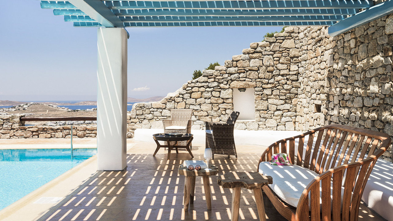 Villa Duende is perched atop the Mykonos private 11-Villa estate and enjoys a bird’s eye view of the islands of Delos and Rhenea, a majestic drop to the sea and the picture-perfect Mykonos sunset. Villa Duende boasts an outdoor BBQ and an outdoor dining & lounging area (sunny & shady all day long)- all in front of the 55 m2 infinity pool that flows off into the Aegean horizon- and you are still less than a three-minute walk to the sea (still within the resort). Villa Duende is uniquely ideal for families with children as it is all on one level. The villas has 3 bedrooms and 2 bathrooms. The brilliant white interiors and exteriors and the subtle tasteful decorations reflect the Mykonian-elegance the island is known for, so you can totally immerse yourself in the spirit of the island. The refurbished luxury estate has daily, complimentary maid service-so you don’t lift a finger, 24/7 CCTV monitoring at the periphery of the estate- so unauthorized people are detectable, Netflix- to quench your thirst for relaxed adventure, flat screen TVs- so everyone can watch, back-up generators- to face the frequent local electric shortages, a desalination plant- so you can ignore the frequent local water shortages, and a 24/7 gate-access control. The pool can be heated for a fee.