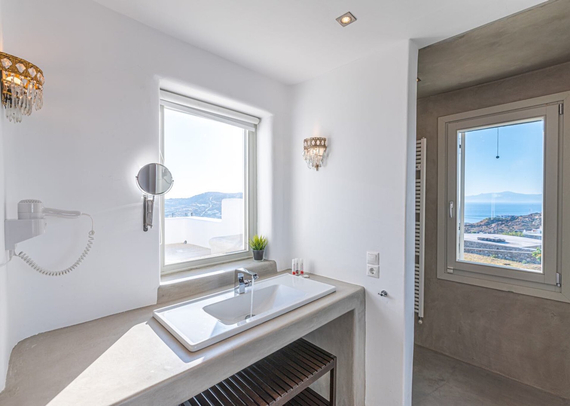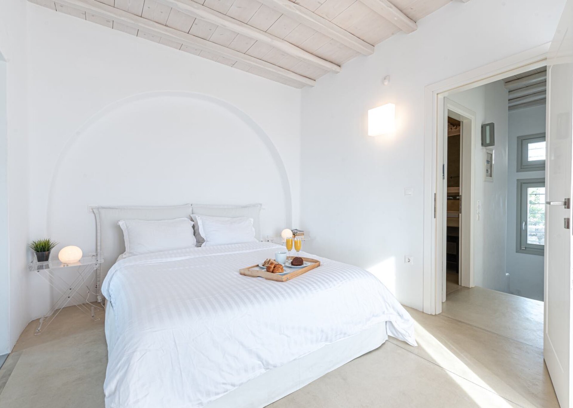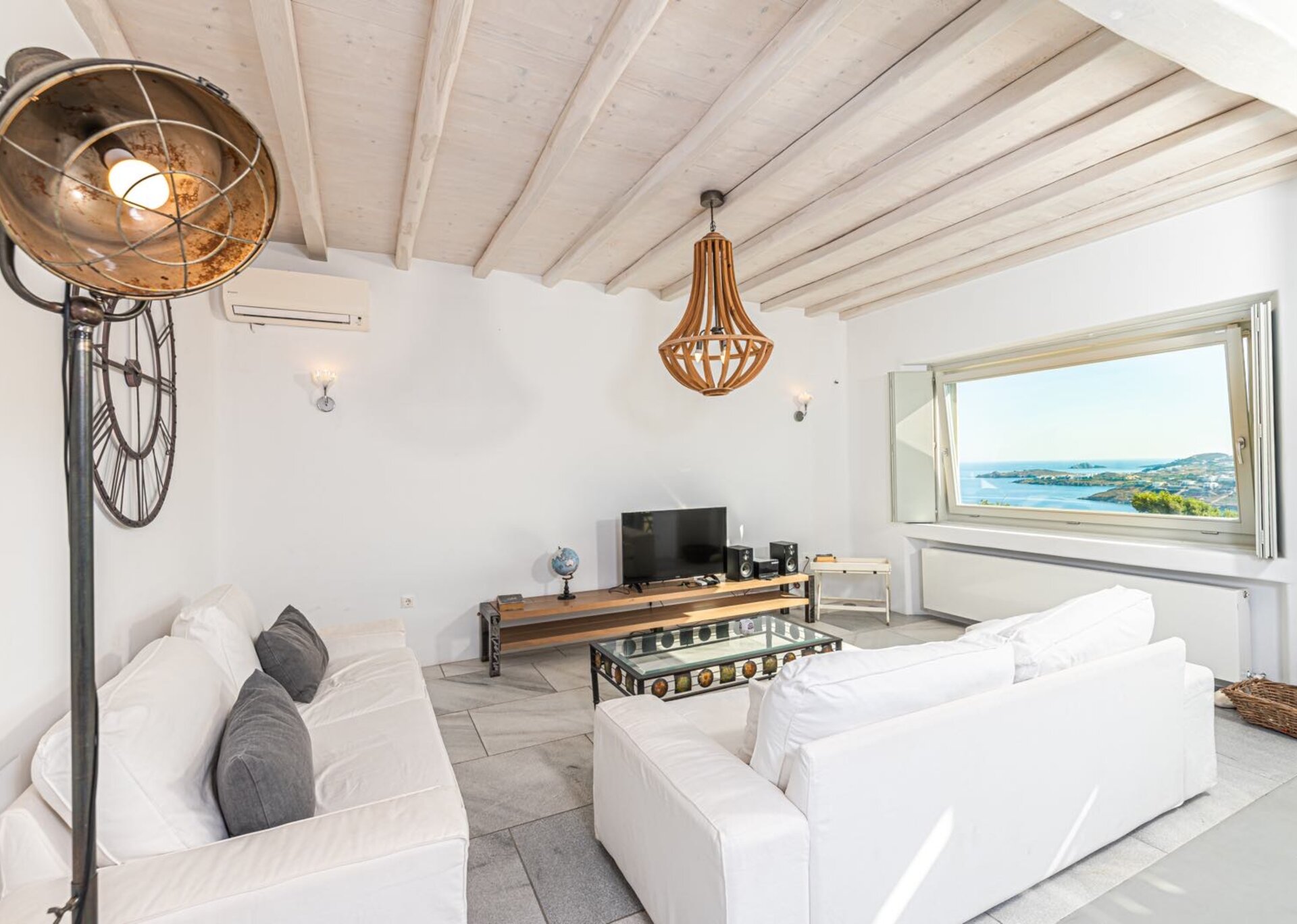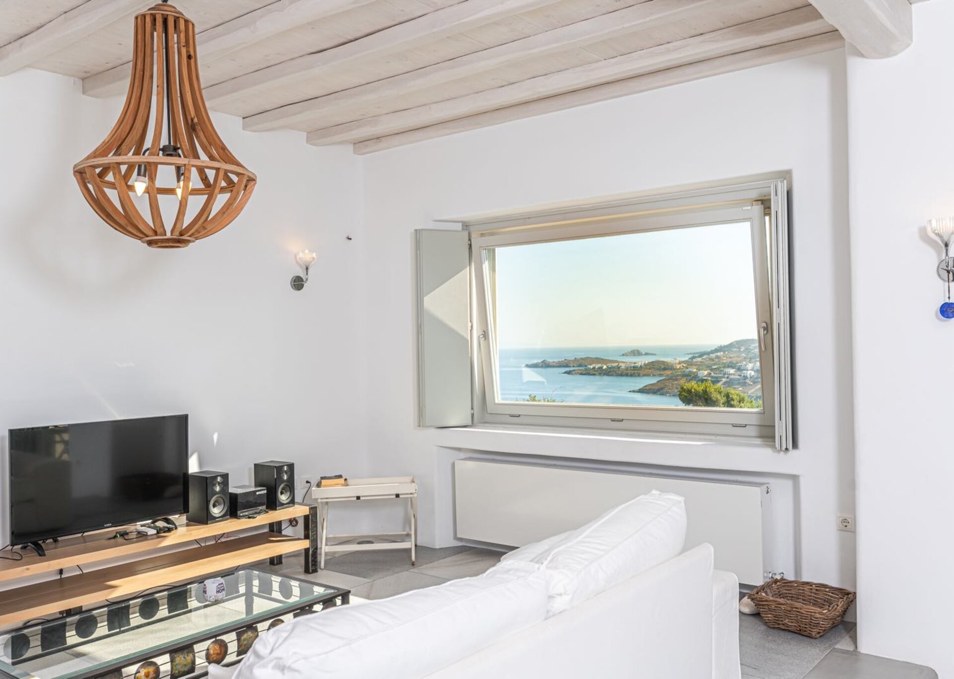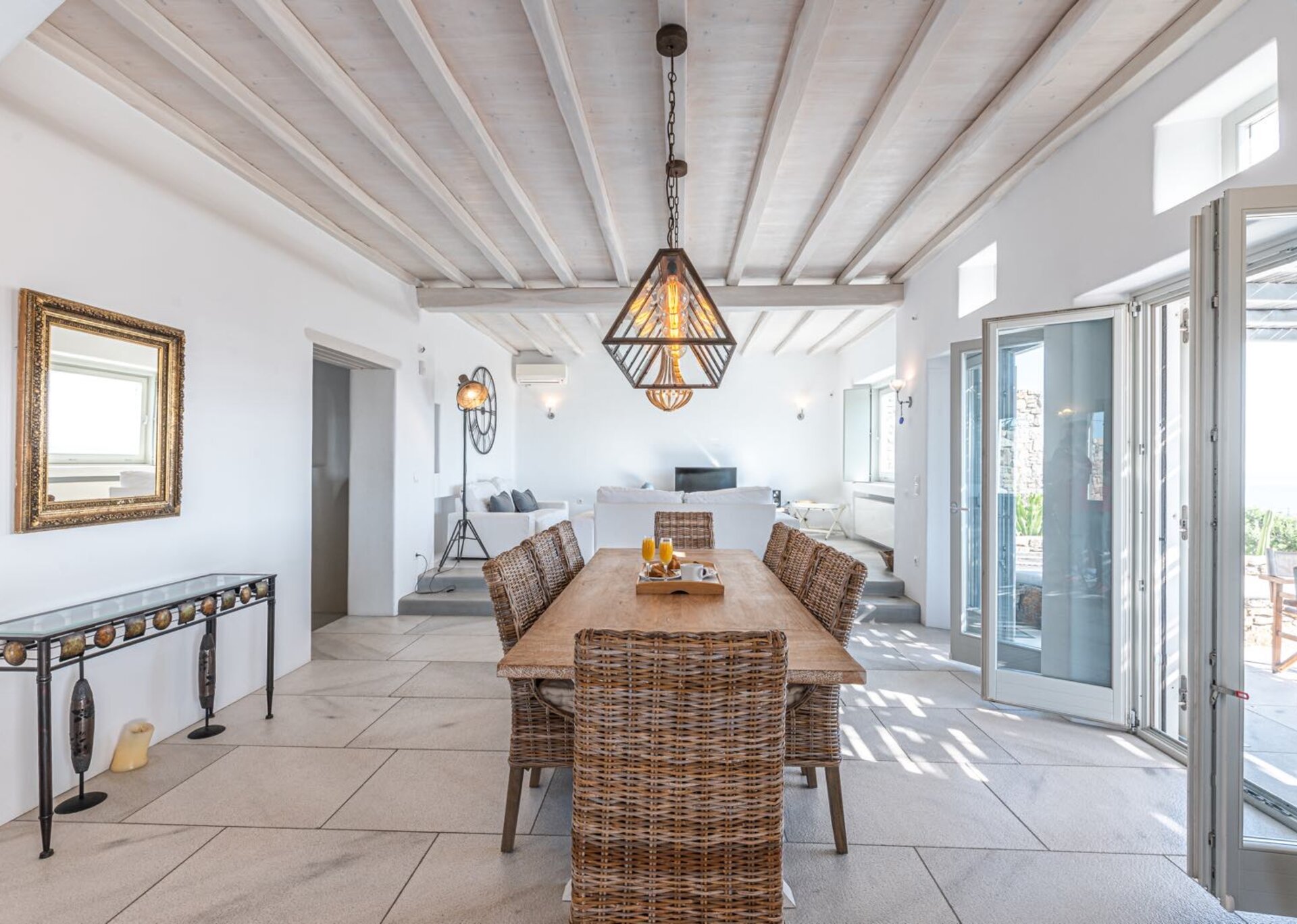 Indoor and outdoor luxury is foremost in this villa to delight in Mykonos style. The grand covered outdoor terrace commands a spectacular view which you can enjoy seated in the comfortable outdoor living area. Inside, enjoy casual snacks or morning coffee at the breakfast table next to the modern kitchen. Fully equipped, the kitchen has everything you need to prepare a feast for your guests. The indoor dining area and living room are open and spacious with windows and doors which open to the view.