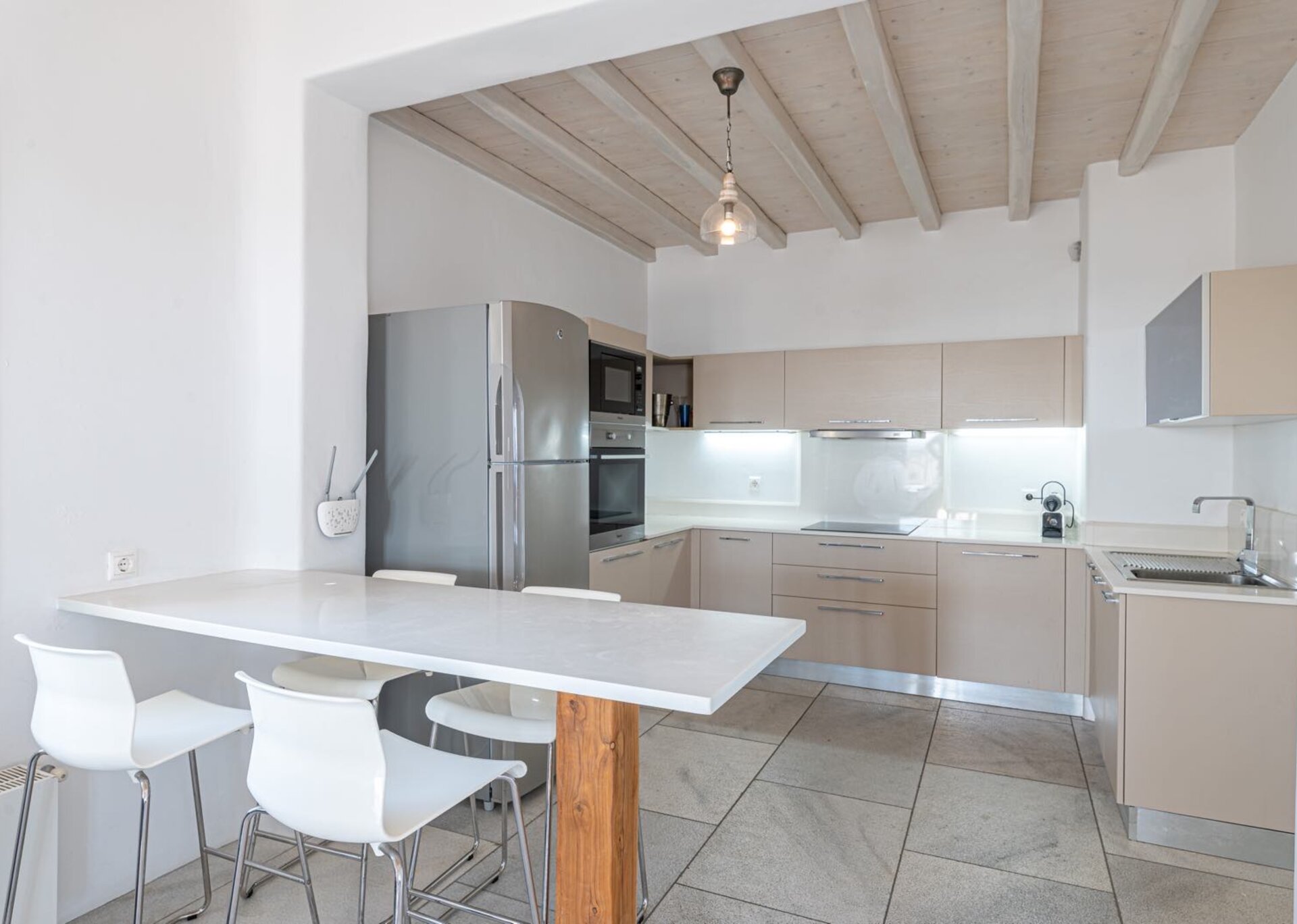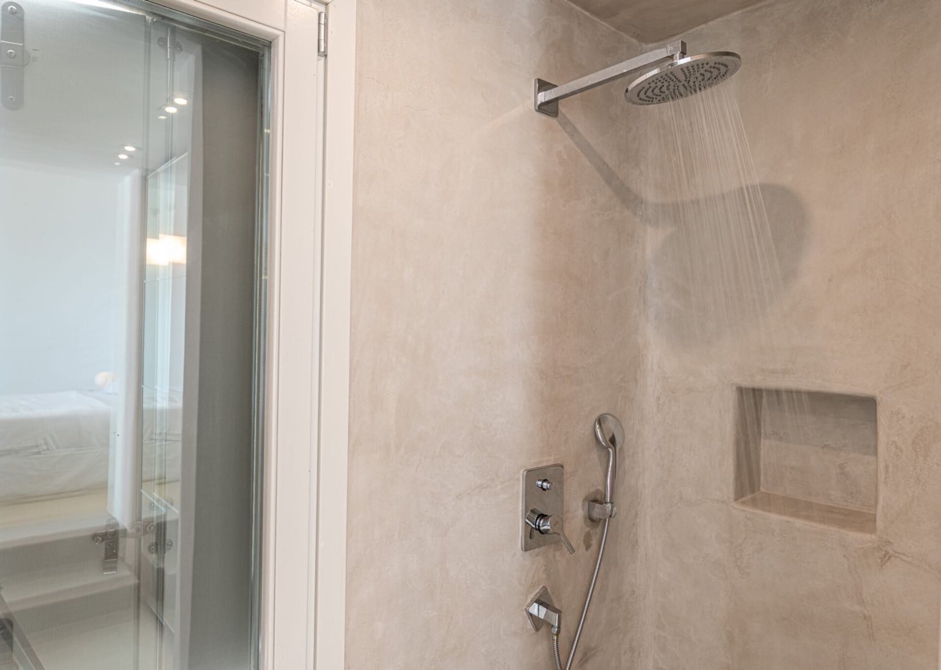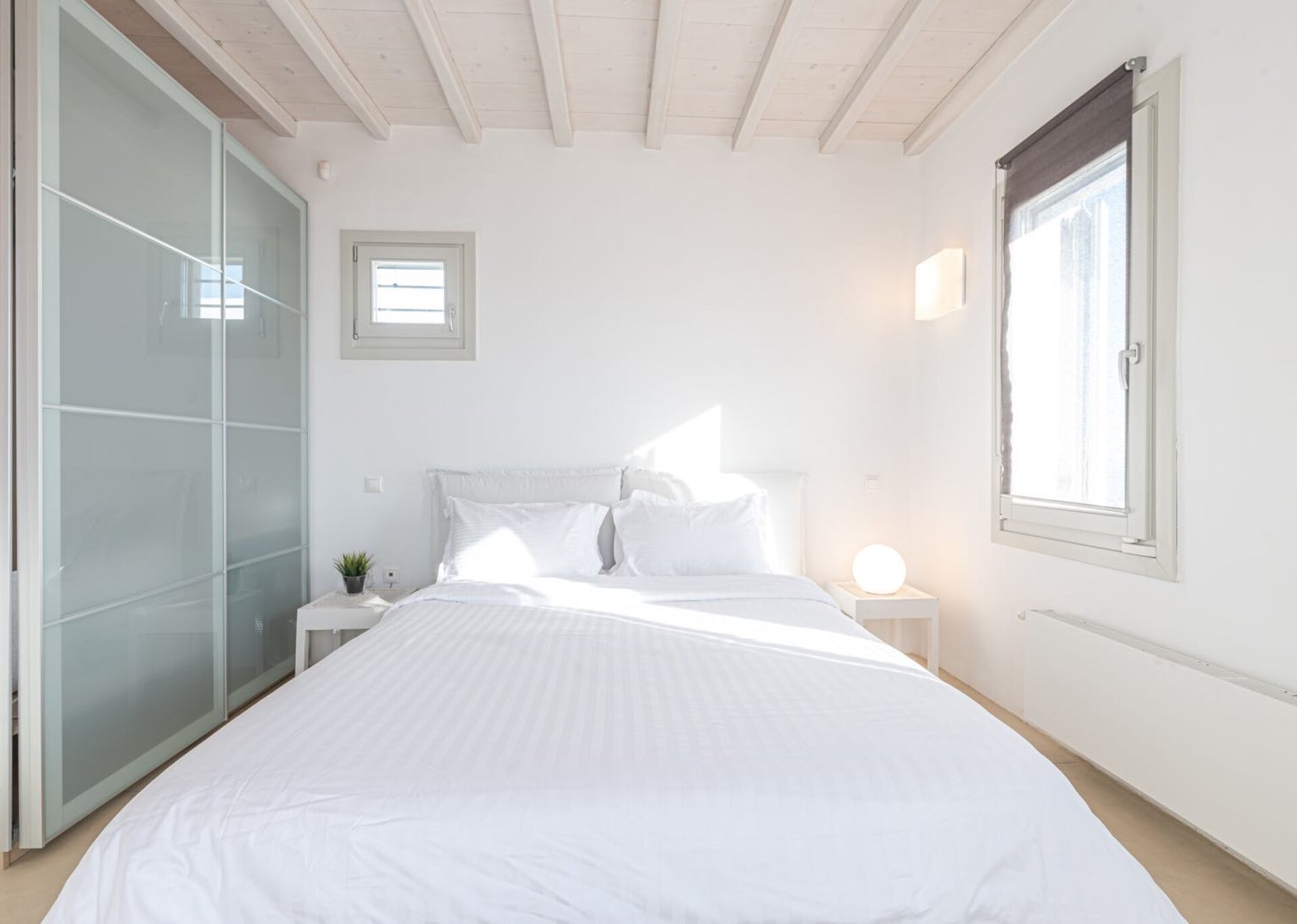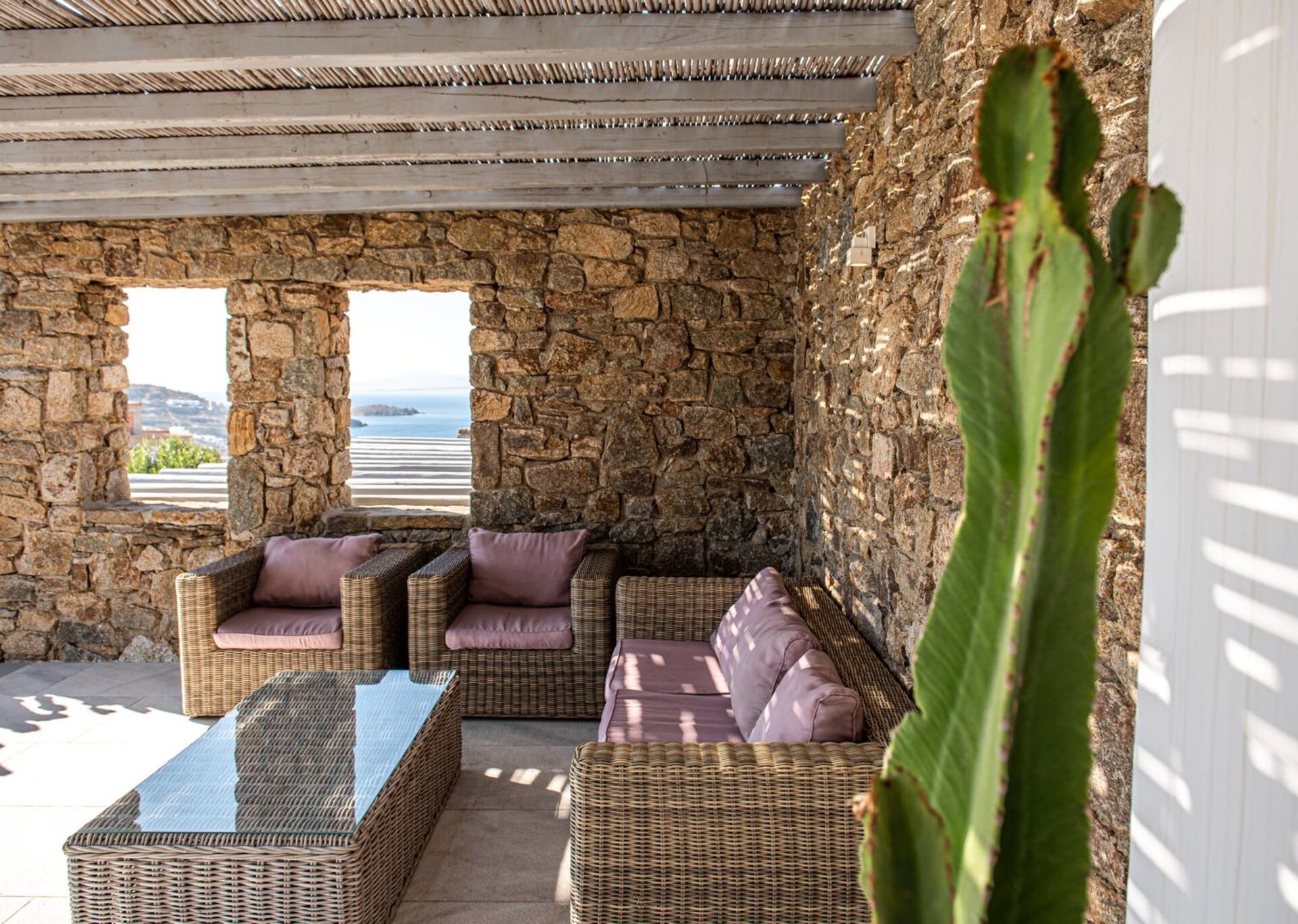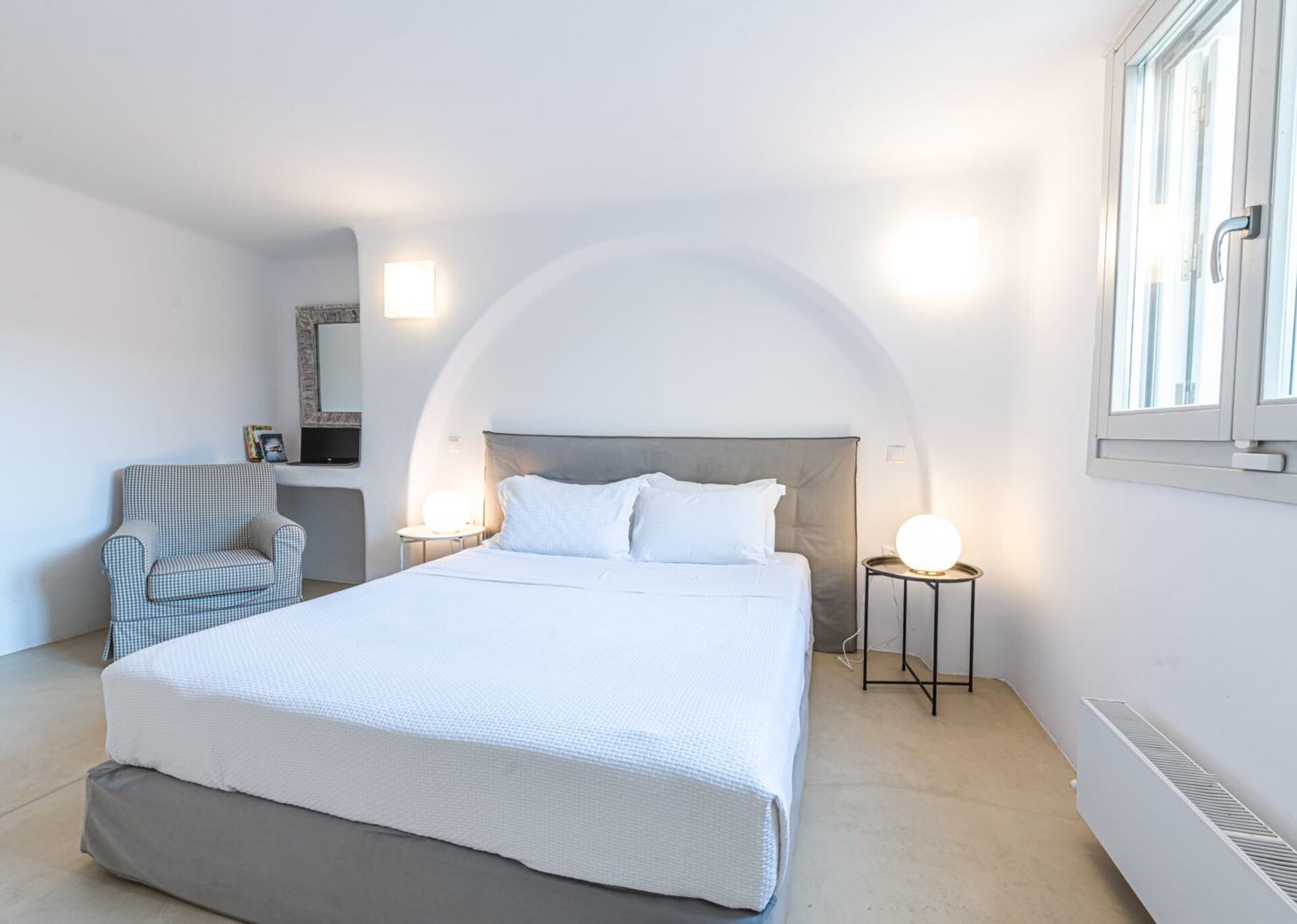 Indoor and outdoor luxury is foremost in this villa to delight in Mykonos style. The grand covered outdoor terrace commands a spectacular view which you can enjoy seated in the comfortable outdoor living area. Inside, enjoy casual snacks or morning coffee at the breakfast table next to the modern kitchen. Fully equipped, the kitchen has everything you need to prepare a feast for your guests. The indoor dining area and living room are open and spacious with windows and doors which open to the view.