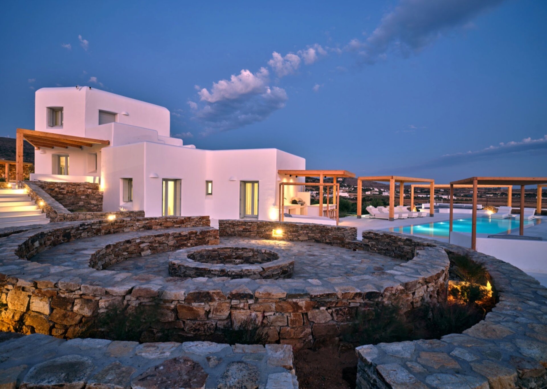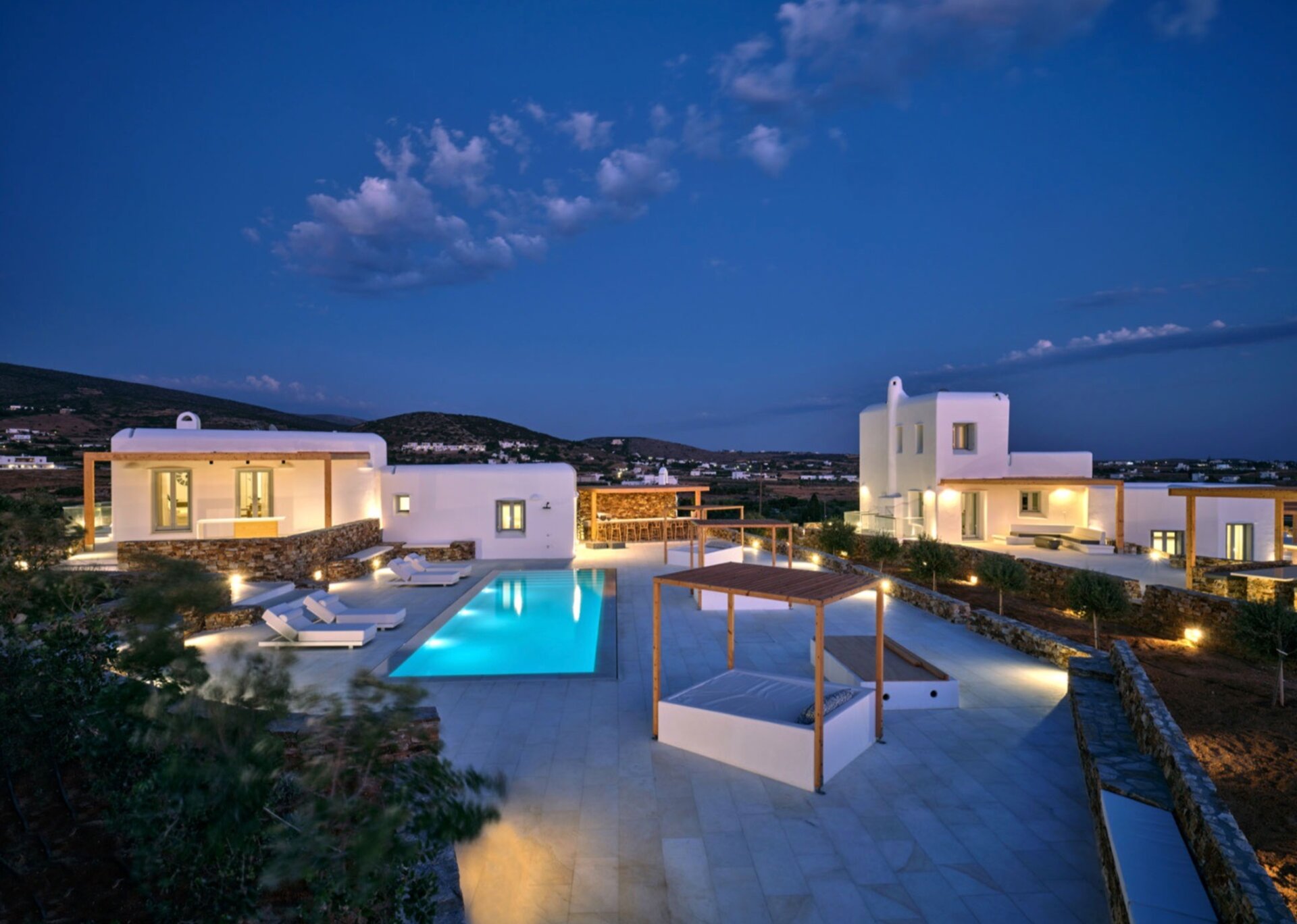 Villa Elizabeth sits elegantly on an amazing plot in an unparalleled position facing the Aegean sea and located just 300 m from a swimming spot close to Agia Irini. It is a complex that consists of 3 independent villas, each one with its private pool.