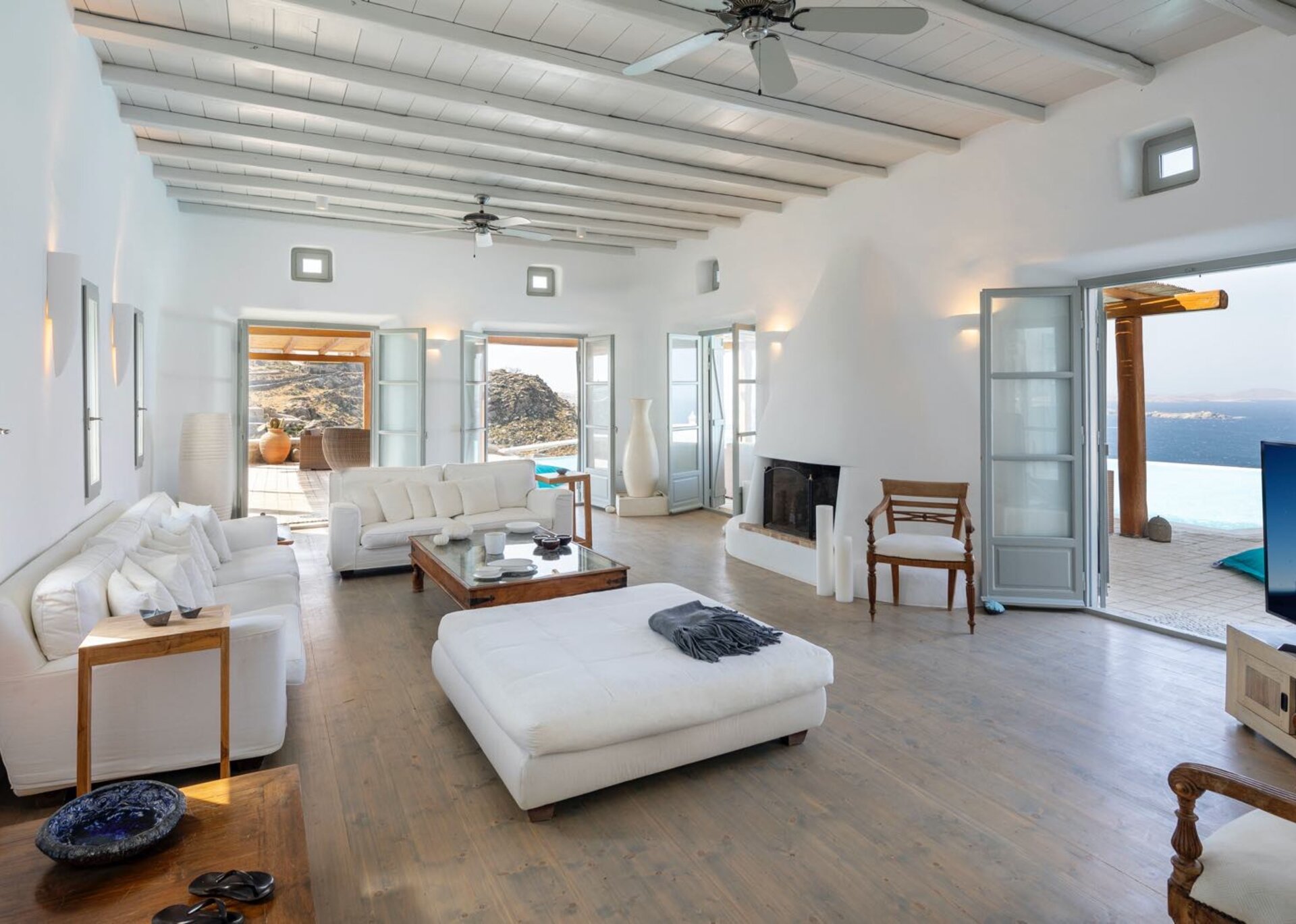 Living area with large sofa and ottomans, fireplace, flat-screen satellite TV, access to the pool terrace