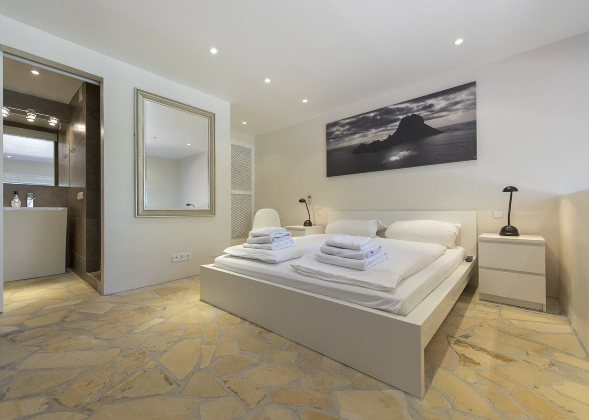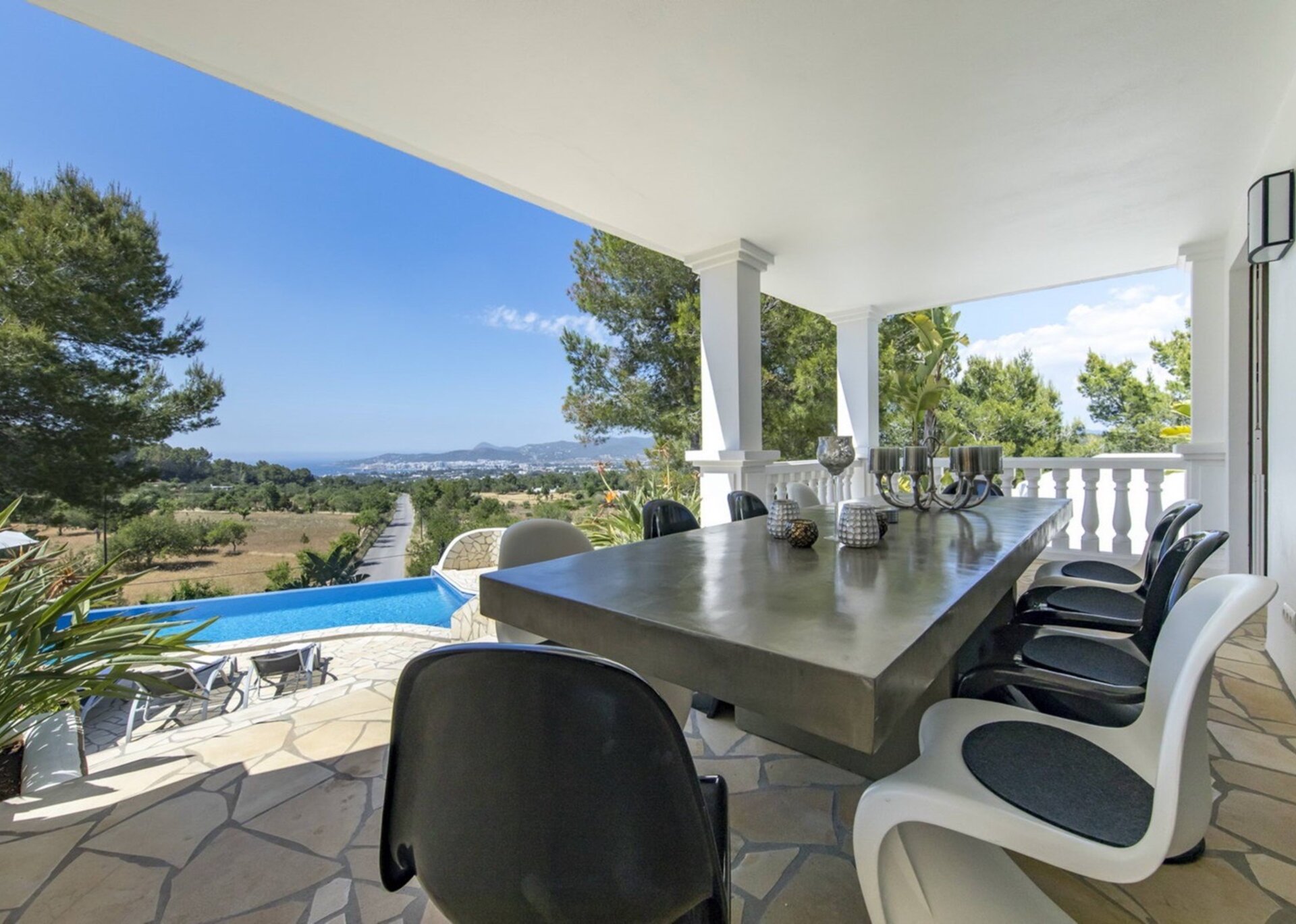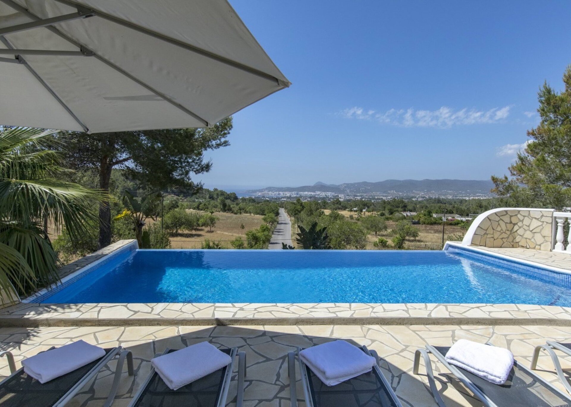 The villa boasts a BBQ area and a pool with a magnificent view of the bay of St. Antonio. Various chill-out areas and retreats are scattered around, providing plenty of places to unwind and relax.