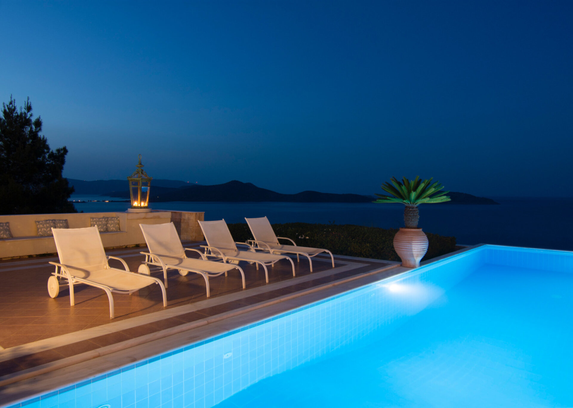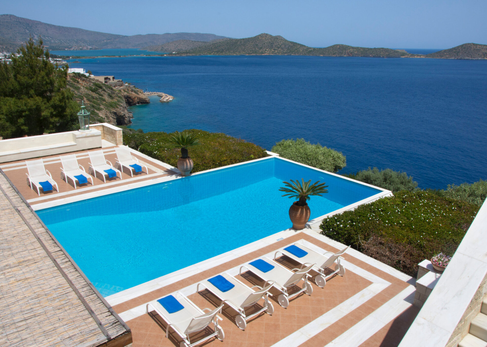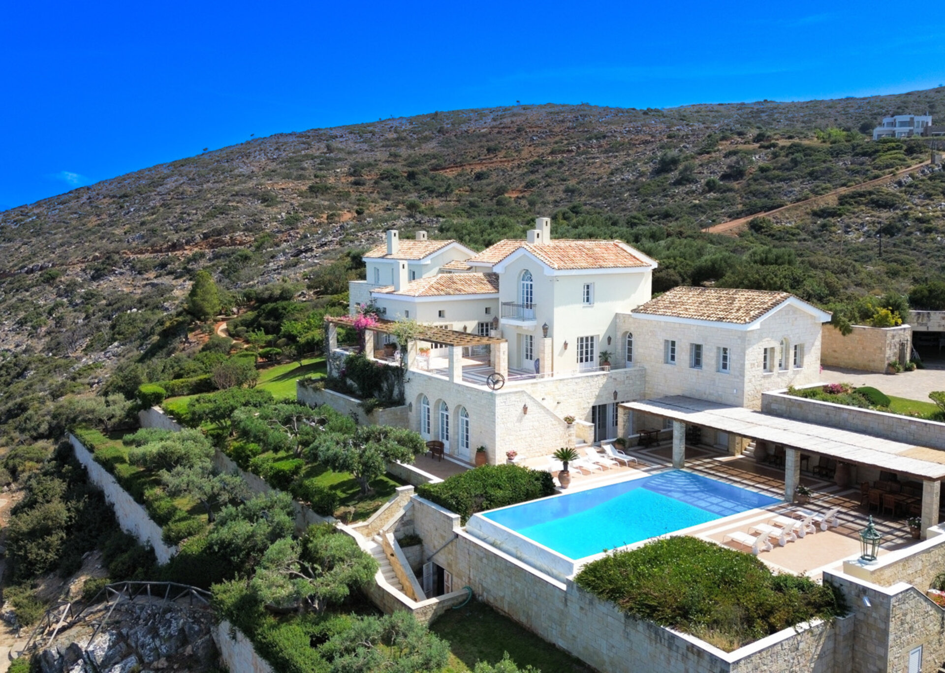 Perched on a hilltop, Villa Emma boasts eight bedrooms, offering stunning views of the Aegean Sea and olive groves. This exquisite property overlooks the Elounda Mountains, providing an idyllic setting for a getaway with loved ones, accommodating up to 16 guests comfortably.