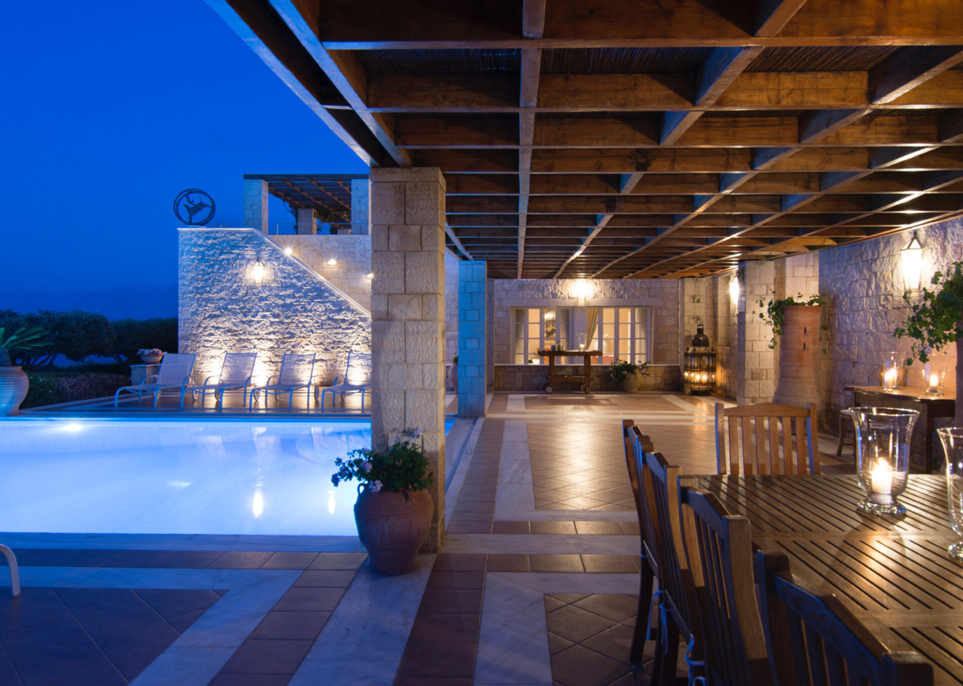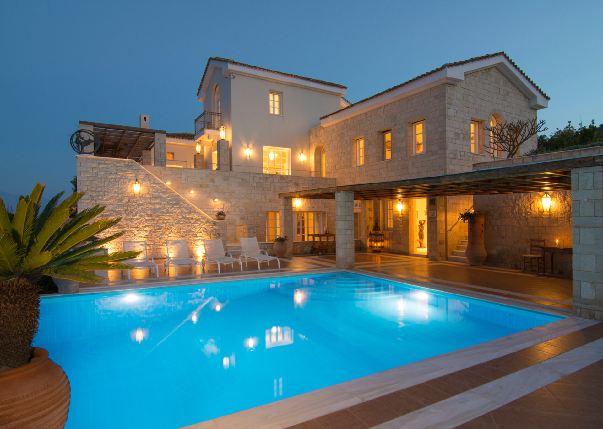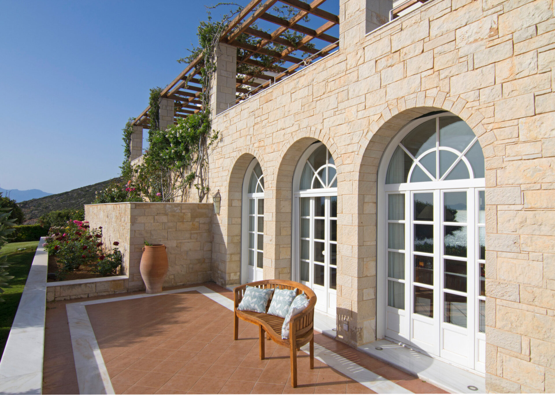 Perched on a hilltop, Villa Emma boasts eight bedrooms, offering stunning views of the Aegean Sea and olive groves. This exquisite property overlooks the Elounda Mountains, providing an idyllic setting for a getaway with loved ones, accommodating up to 16 guests comfortably.