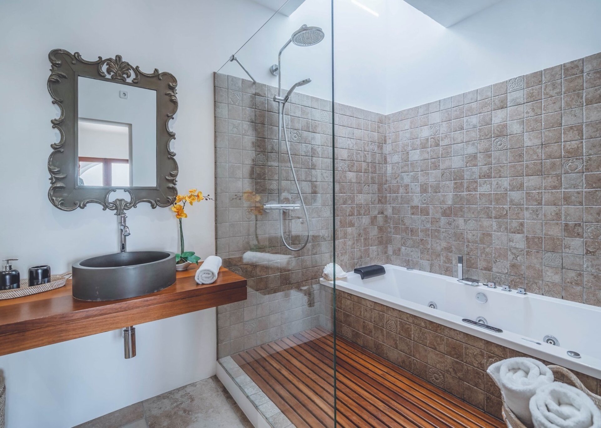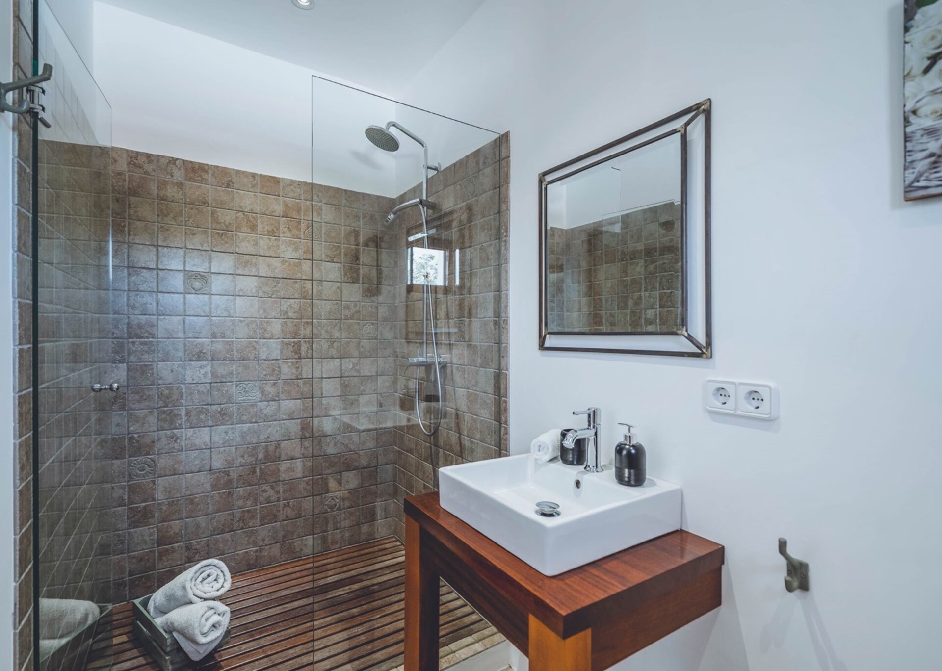 With 5 double bedrooms and 5 bathrooms, the villa boasts a clever layout. The main house includes 4 en-suite bedrooms, each designed with comfort in mind. Additionally, there is a self-contained separate apartment featuring a smaller kitchen, a private living room, and a separate bathroom.