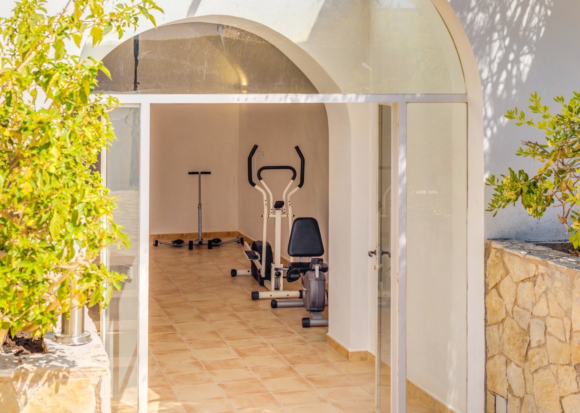 For fitness enthusiasts, Villa "Enigma" houses a private gym, and there is an outdoor garage with space for up to three cars. The villa is ideal for cycling enthusiasts, offering ample storage space for bicycles.