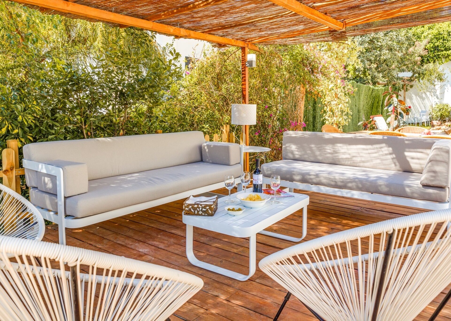 This splendid villa is thoughtfully equipped with modern amenities to ensure a comfortable stay. From air conditioning to Wi-Fi, a washing machine, a dryer, cable TV, a cot, and a high chair, every convenience is provided. The large terrace, complete with a table and chairs for ten, is perfect for al fresco dining. The villa also offers a private outdoor area, adorned with a beautifully landscaped garden, partly covered furnished terraces, a barbecue, and a relaxing swimming pool with a convenient shower. Sun loungers are also available for your leisure.