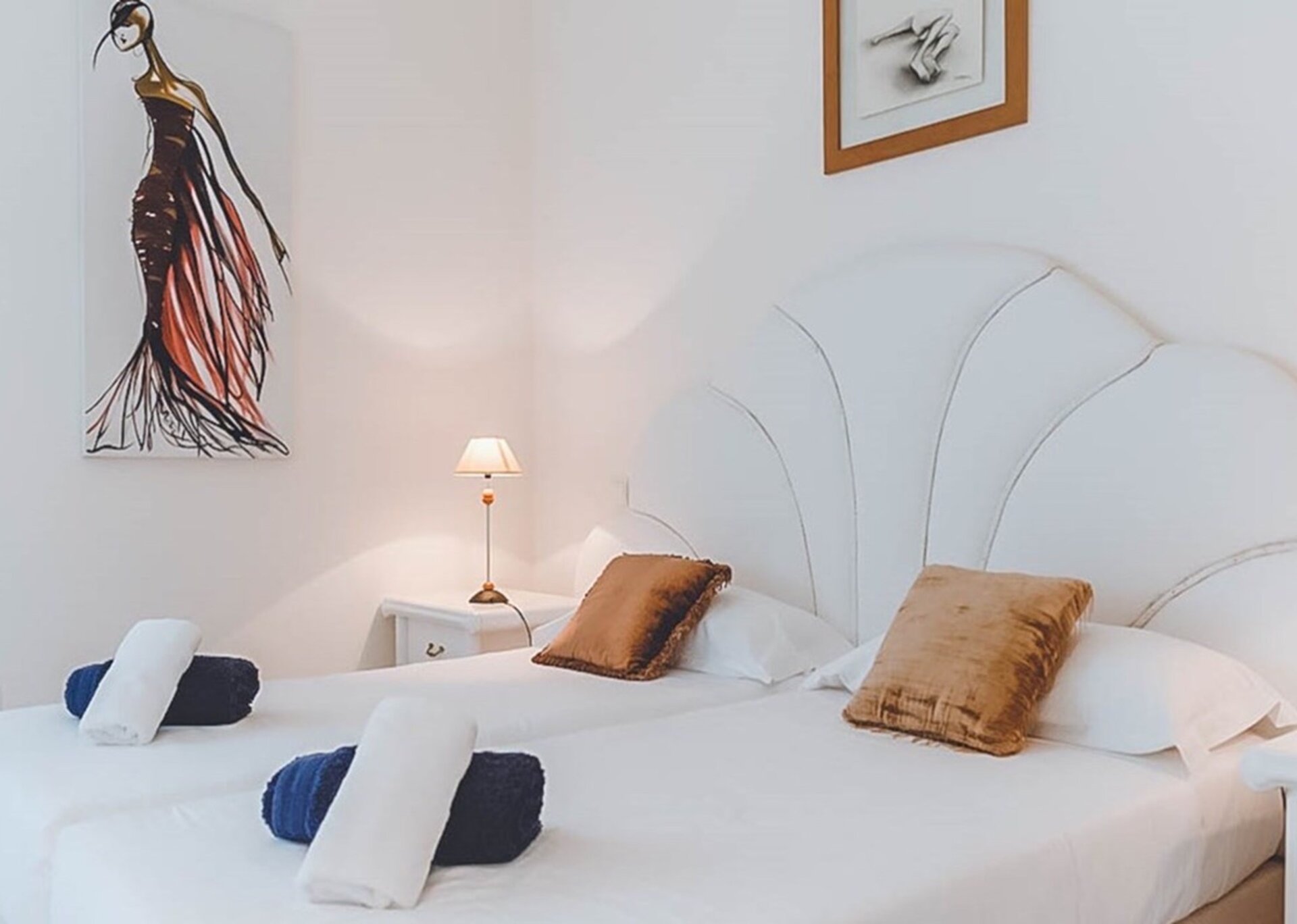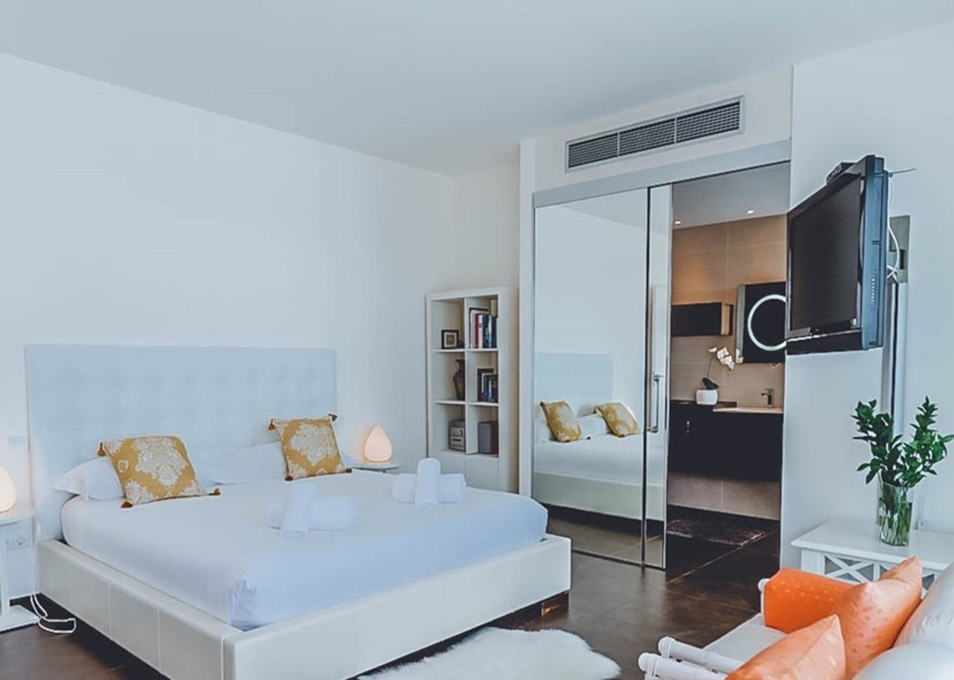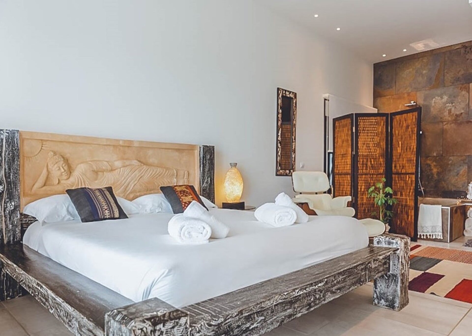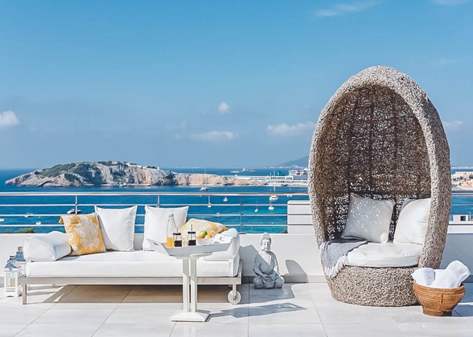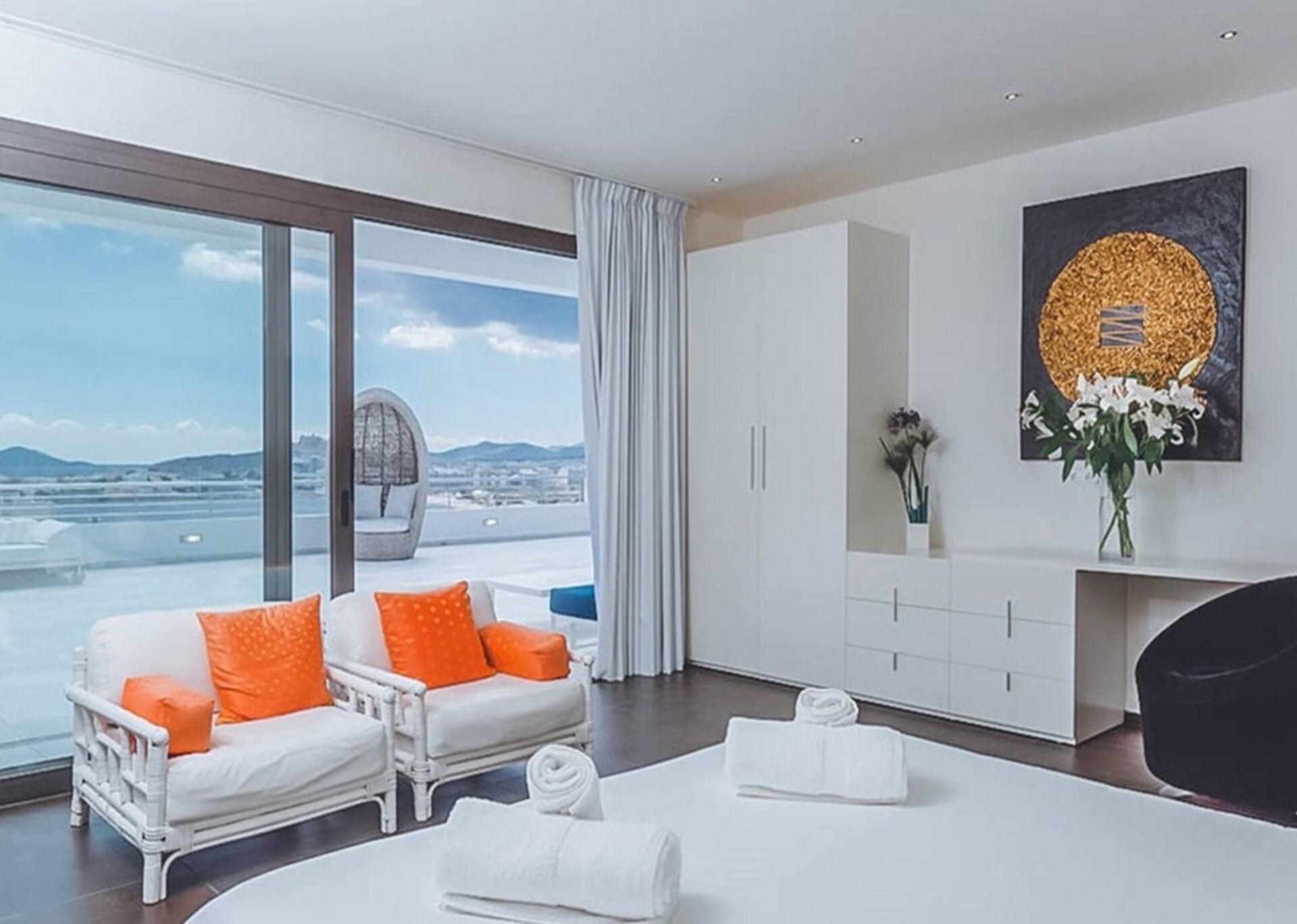 Outside, the villa boasts a spacious terrace area furnished with an outdoor lounge, a summer dining area, a well-equipped gas barbecue, a beautifully crafted wooden pool area, a bespoke bar, and relaxing hammocks. From breakfast to starlit dinners, this enchanting space allows you to indulge in uninterrupted views of the sea and the dazzling lights of Ibiza Town, creating an idyllic atmosphere.