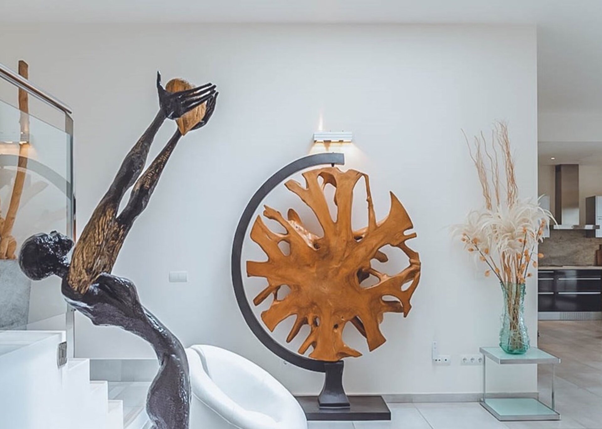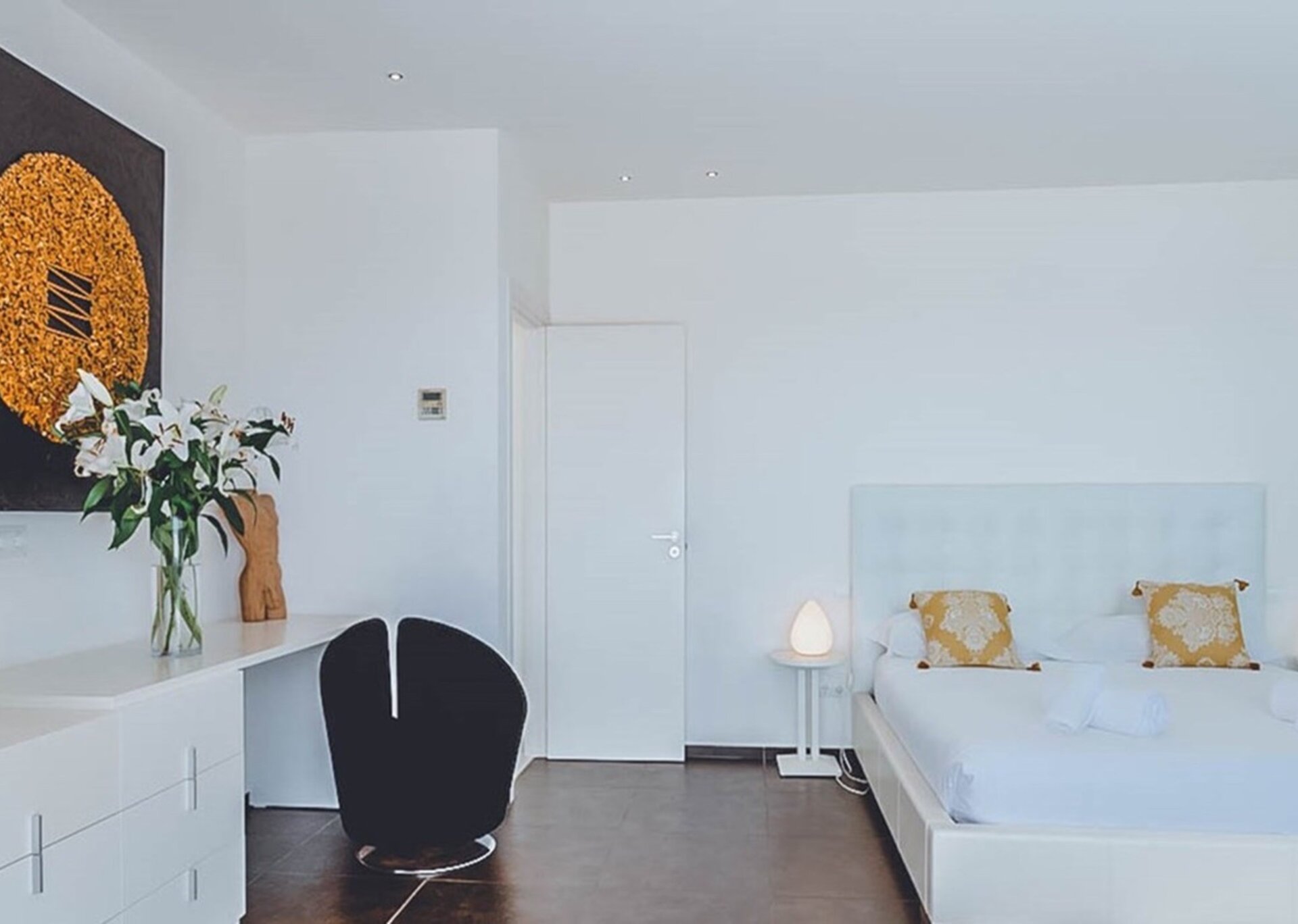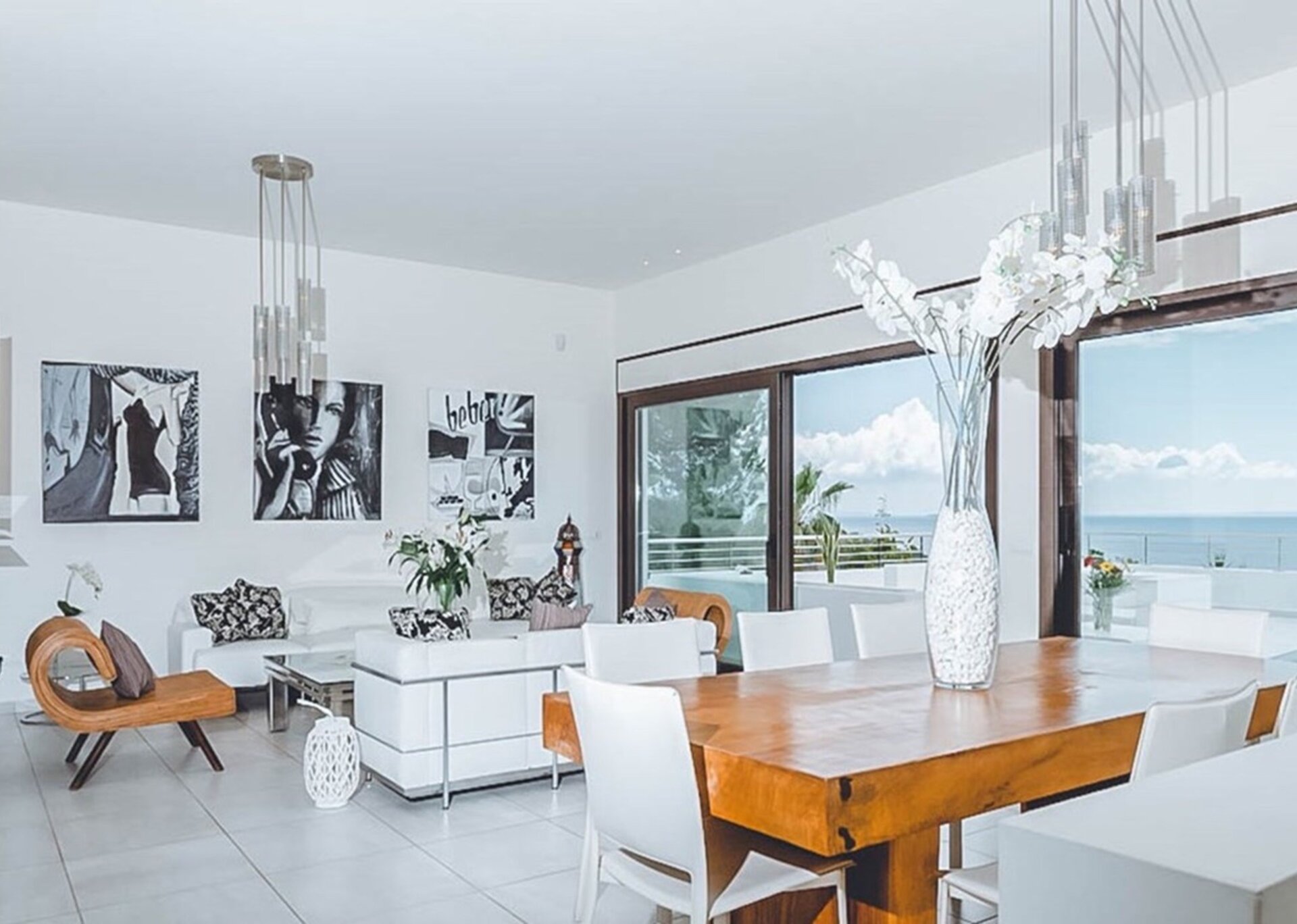 This three-level home showcases five exceptional bedrooms, each with its own en suite bathroom, and two additional guest bathrooms. The interior design is modern and elegant, encompassing a monochrome style accented with vibrant contemporary decor, artworks, and unique sculptures throughout.