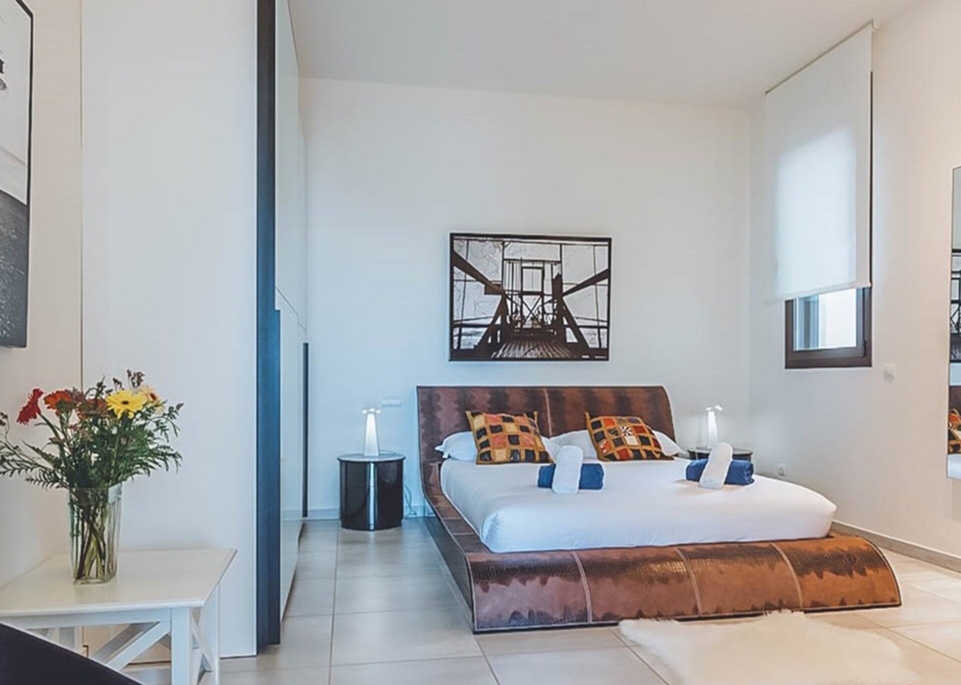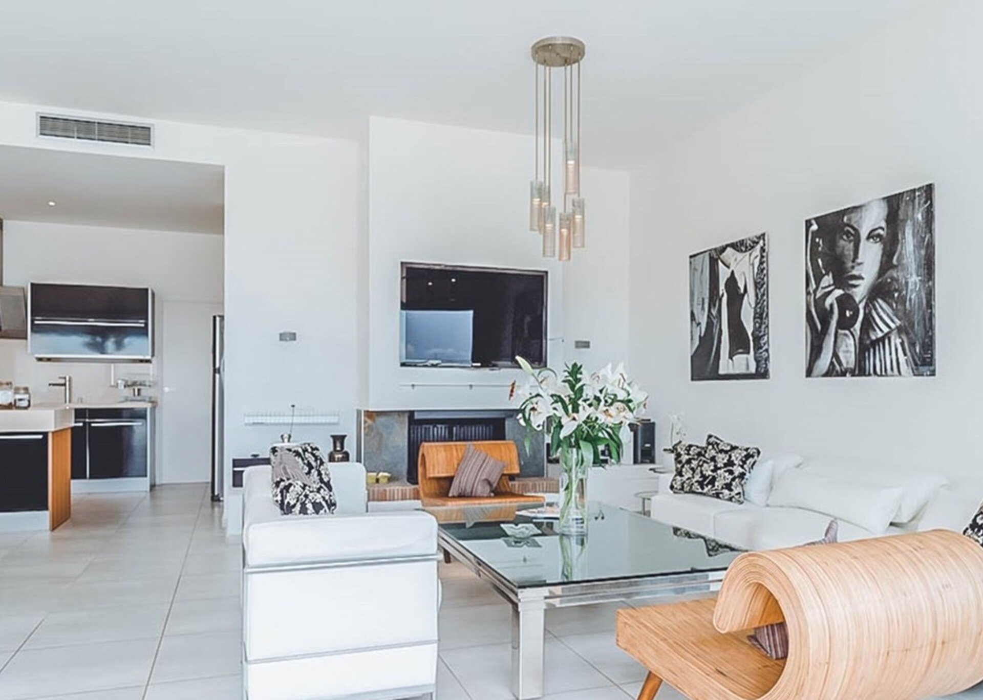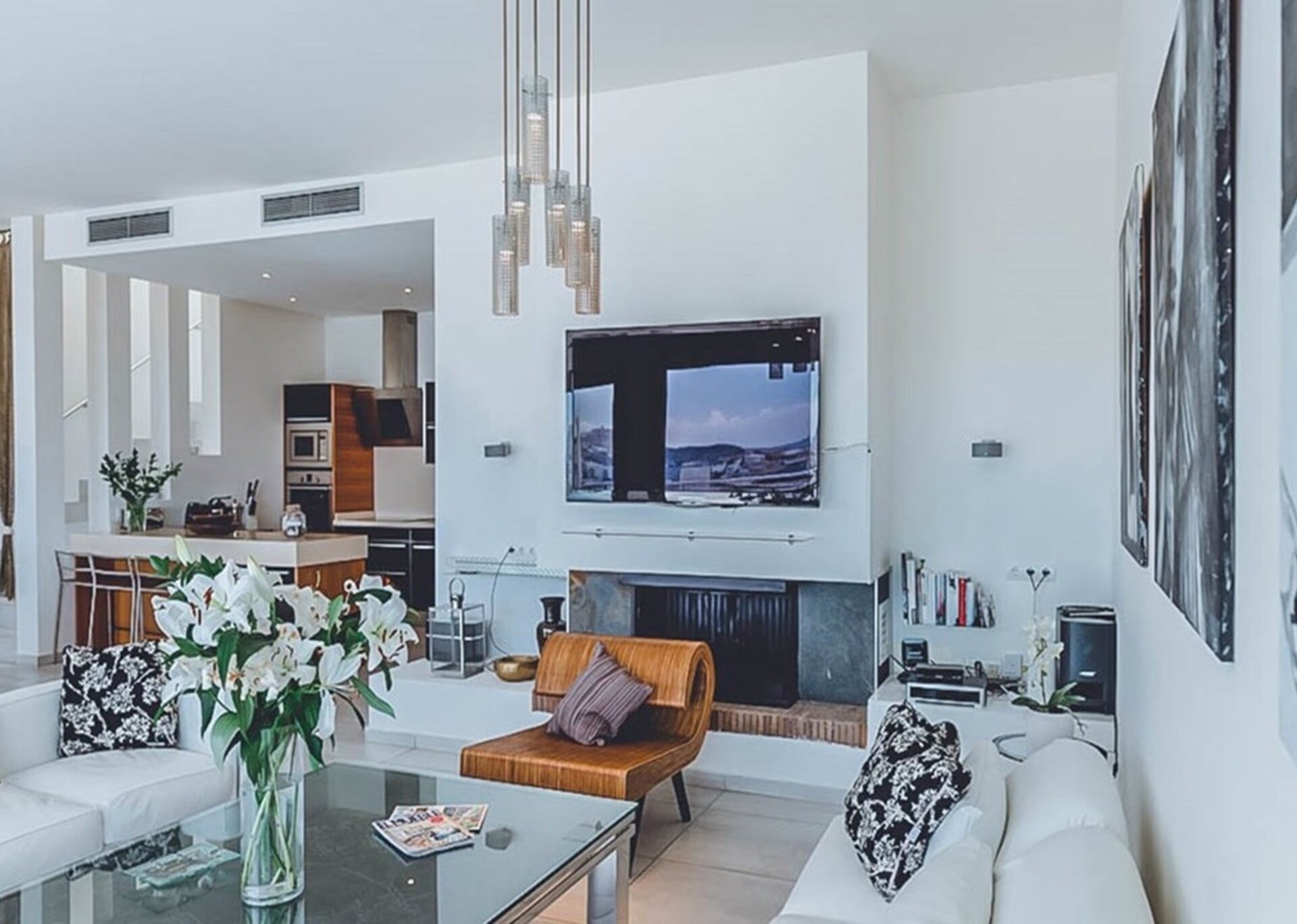 This three-level home showcases five exceptional bedrooms, each with its own en suite bathroom, and two additional guest bathrooms. The interior design is modern and elegant, encompassing a monochrome style accented with vibrant contemporary decor, artworks, and unique sculptures throughout.