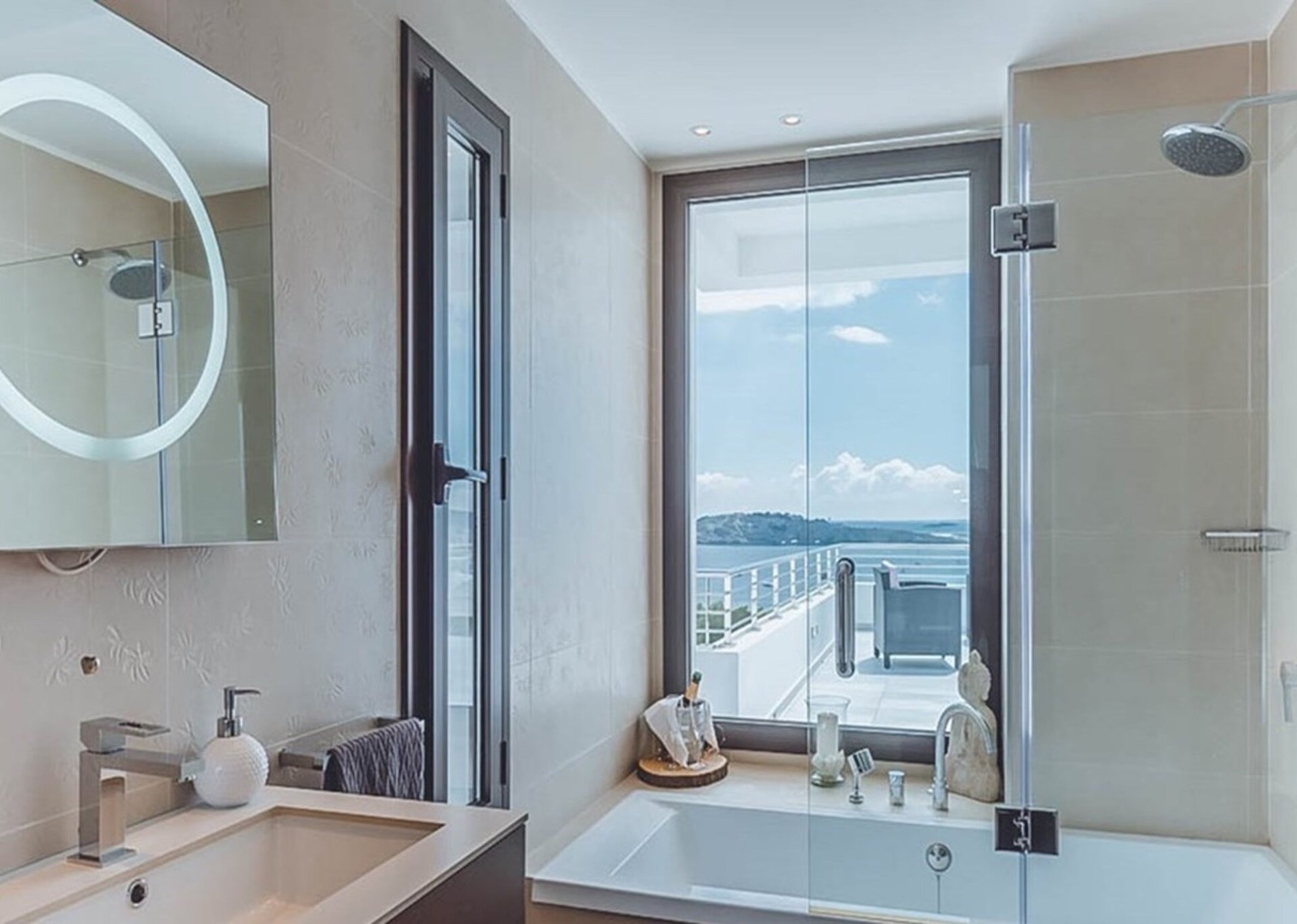 The ground floor features an impressive entrance that leads directly into the lounge, which seamlessly integrates a fully equipped kitchen and bar, opening onto an inviting outdoor terrace space. On the first floor, you'll find another spacious living room that offers direct access to a private terrace. The true gem of this house lies on the second floor, where the Master Suite occupies the entire level and boasts a generous private terrace with an outdoor lounge and breathtaking sea views.
