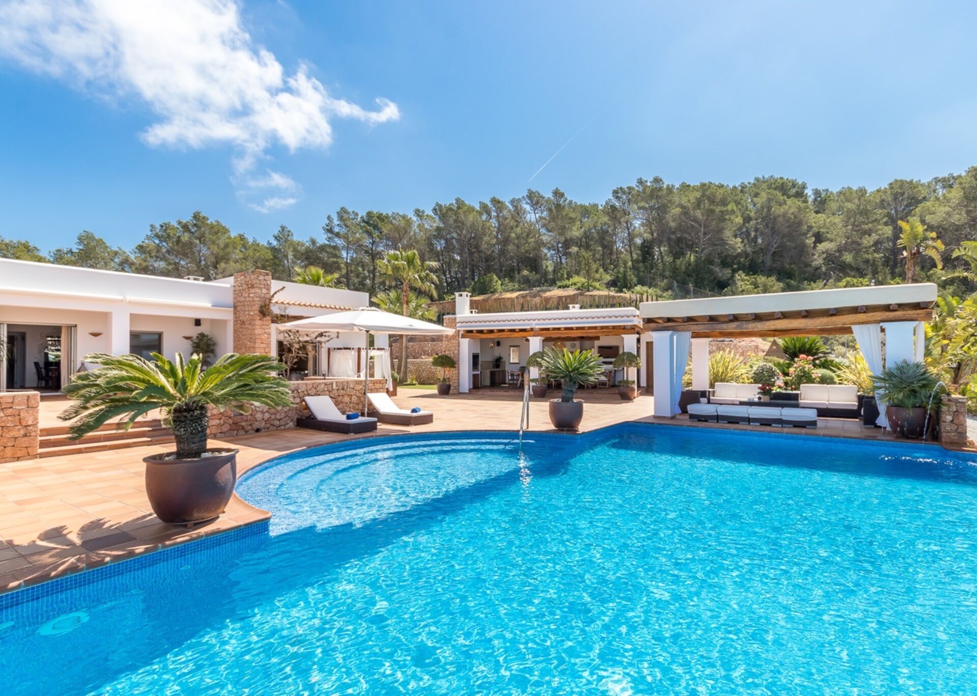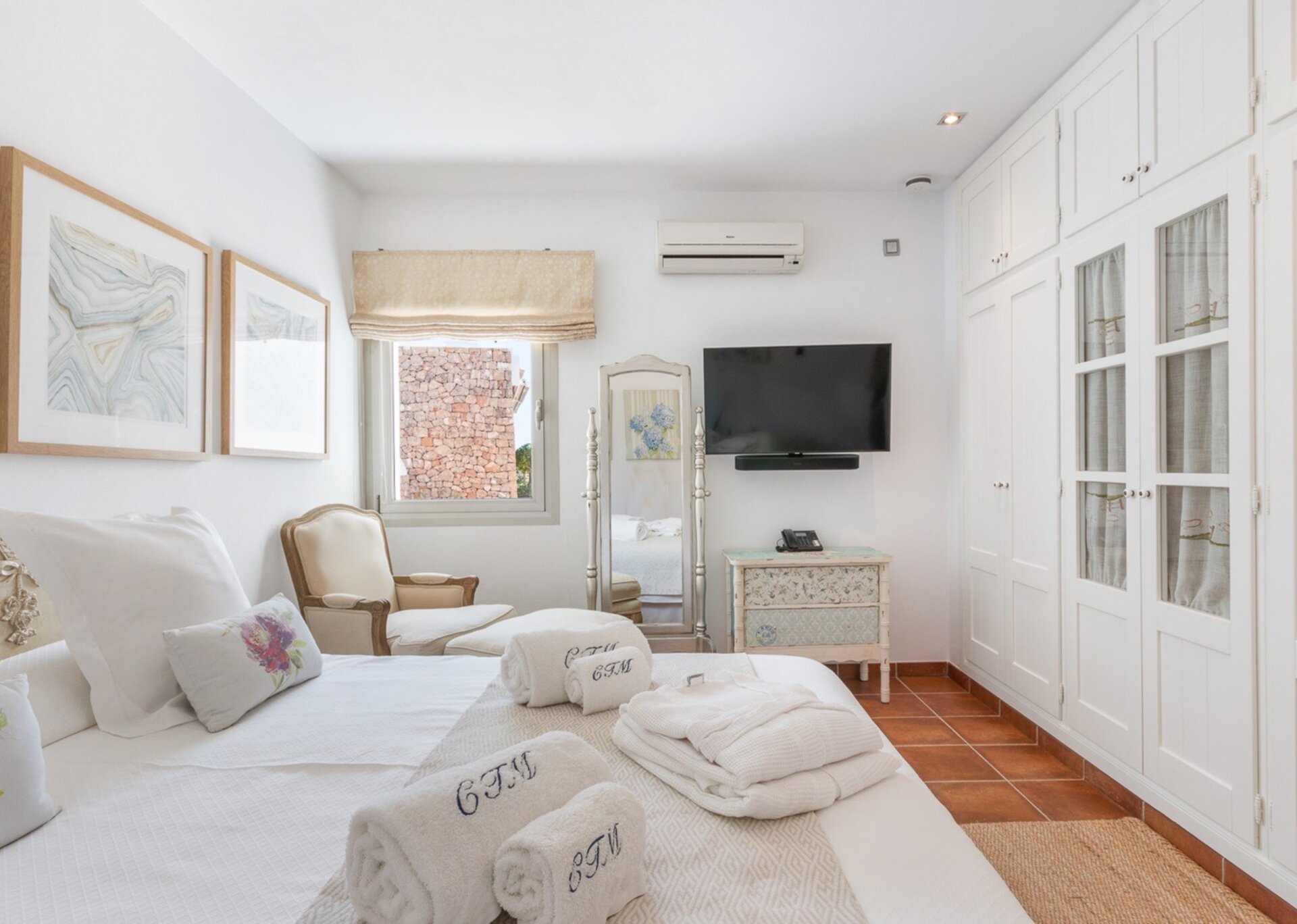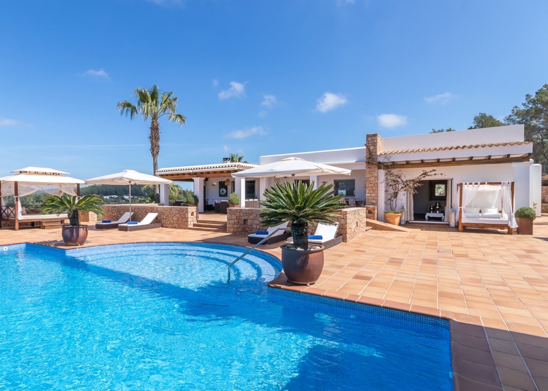 Finca is an exquisite Ibicenco farmhouse located near the bohemian village of Santa Gertrudis, renowned for its vibrant cafe culture. Just a short drive away lies the lively town of Santa Eulalia, brimming with an array of shops, bars, and restaurants. This stunning 6-bedroom villa offers guests breathtaking views of the surrounding valleys, countryside, and the sparkling Mediterranean Sea in the distance, stretching towards Formentera.