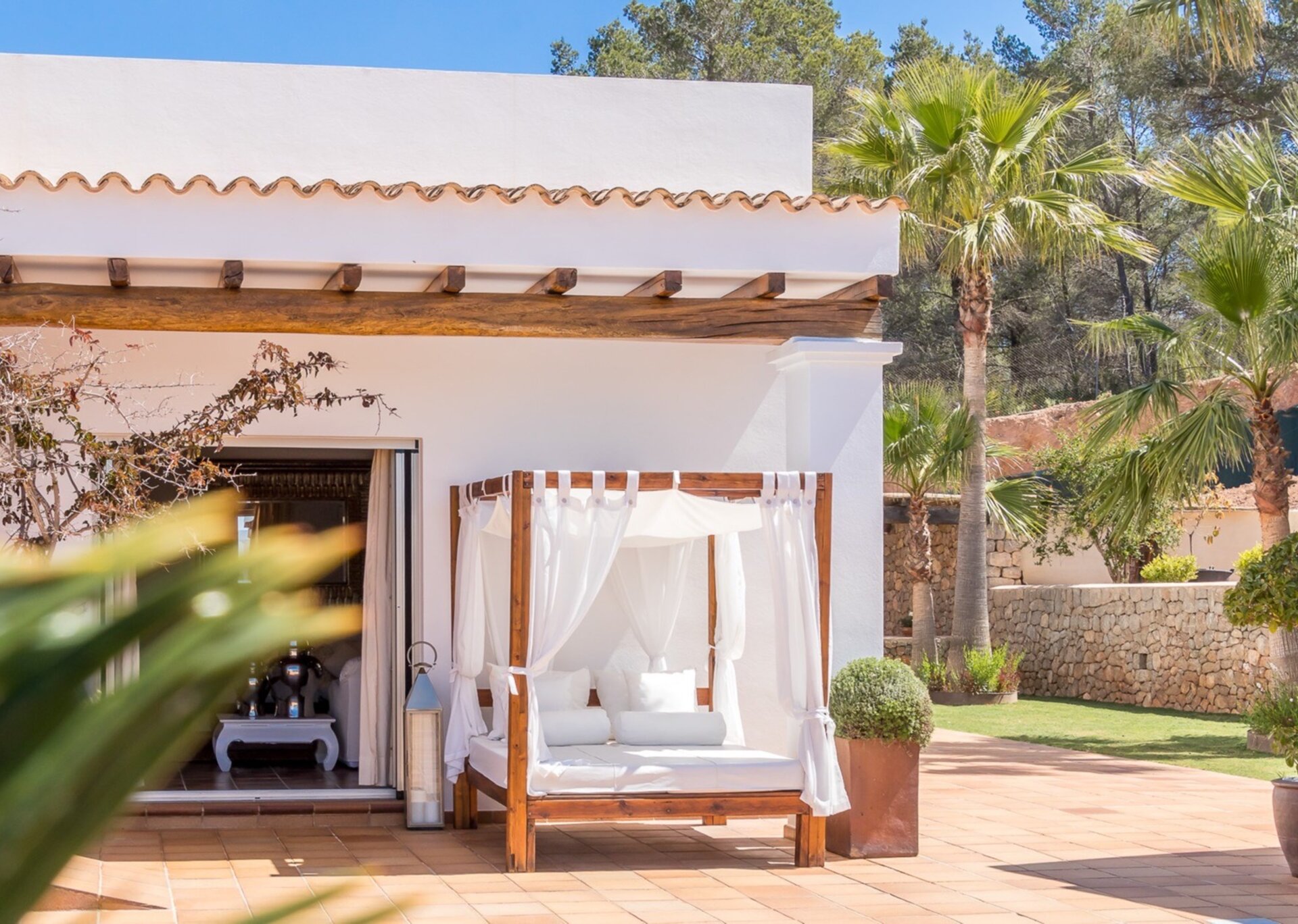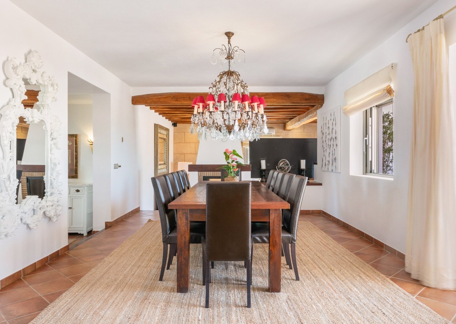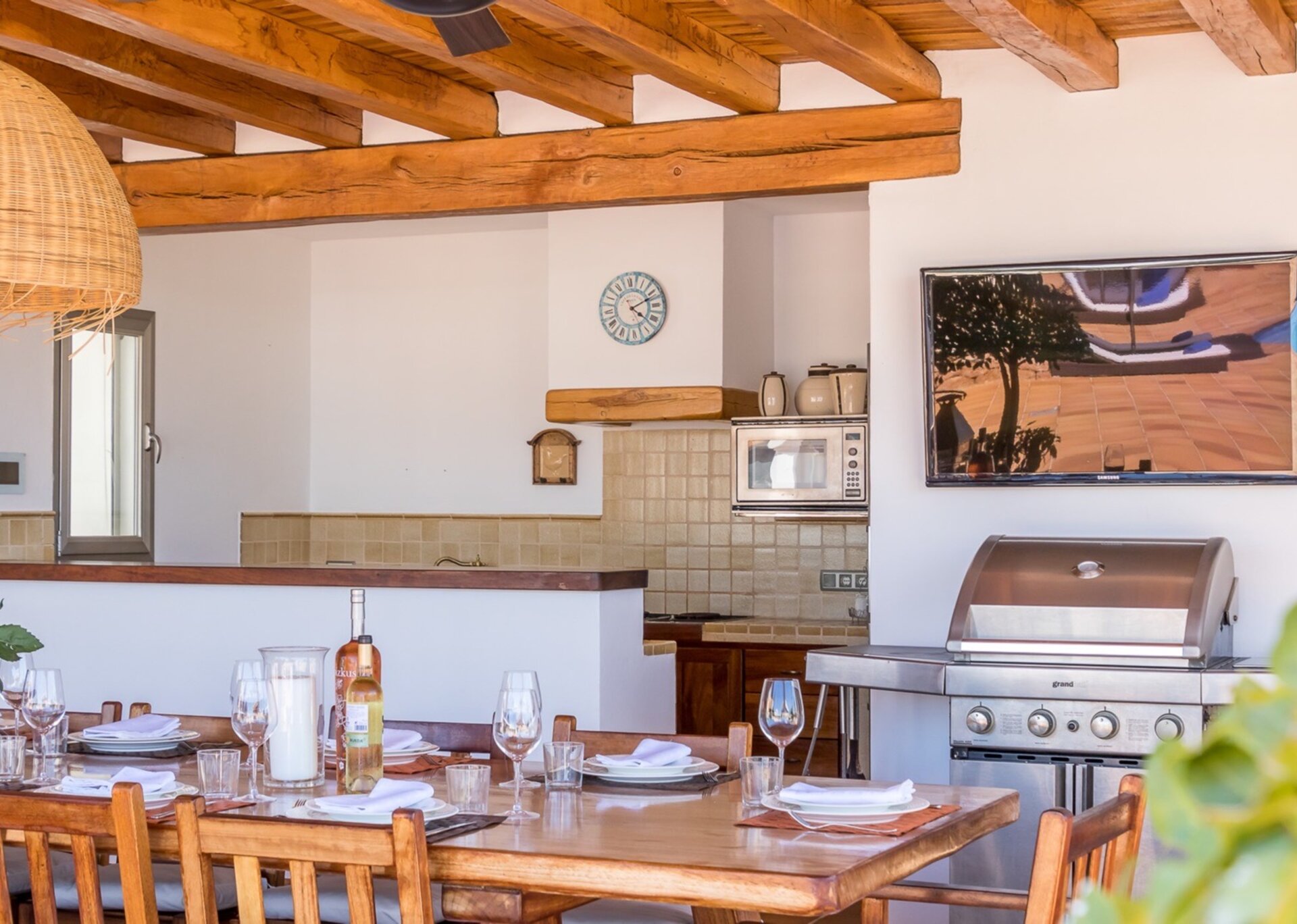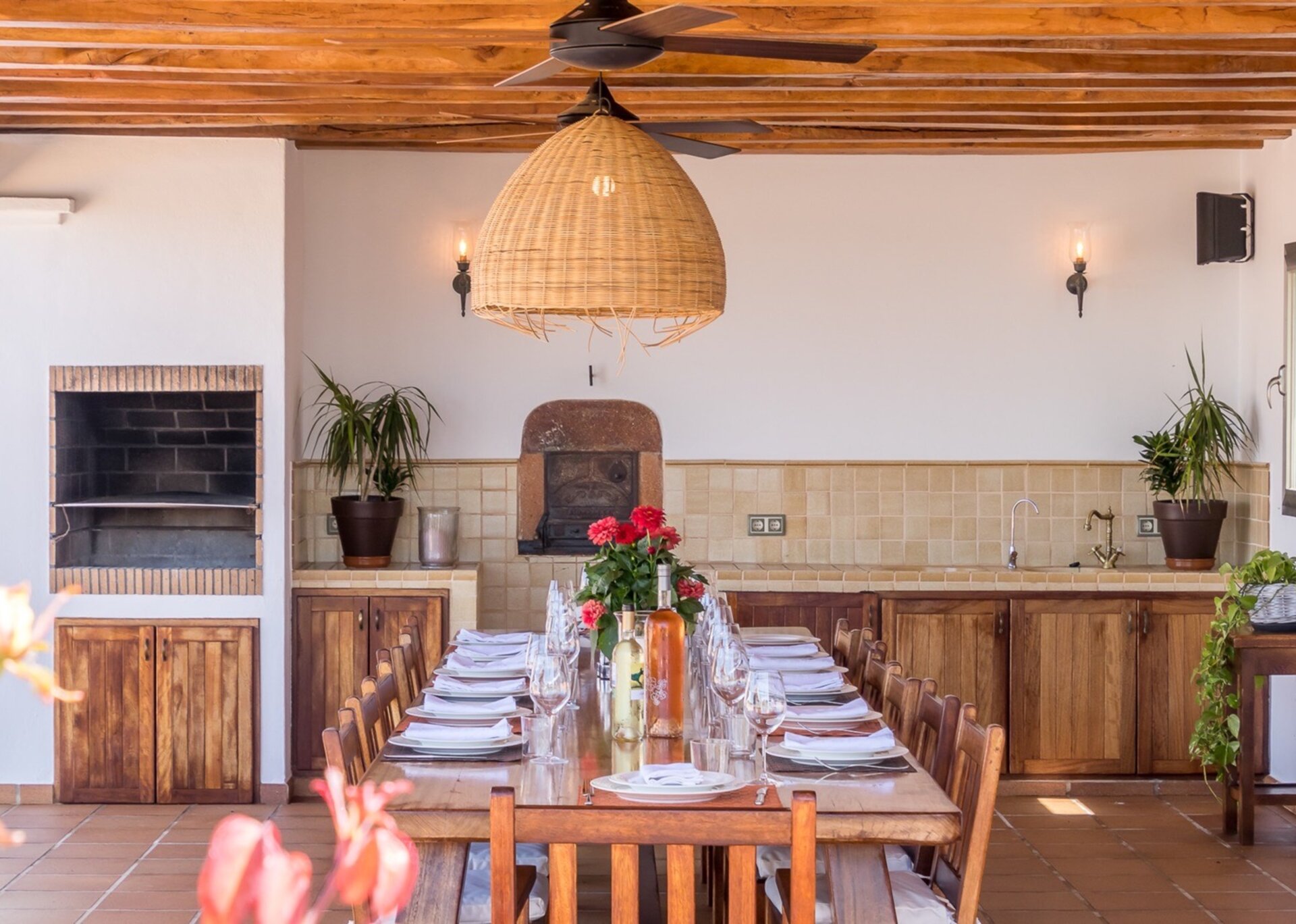 Outside, Finca enchantingly presents an abundance of outdoor terraces. Discover an infinity swimming pool, a heated Jacuzzi, luxurious Balinese beds, and ample sun loungers, enticing you to relax and luxuriate under the sun. Multiple chill-out areas beckon, while two captivating dining areas, complete with a BBQ, wood-burning oven, and a fully equipped outdoor kitchen, invite you to savor al fresco dining in true style from dawn till dusk. To add to the allure, a bespoke bar stands as the perfect spot to enjoy sunset cocktails.