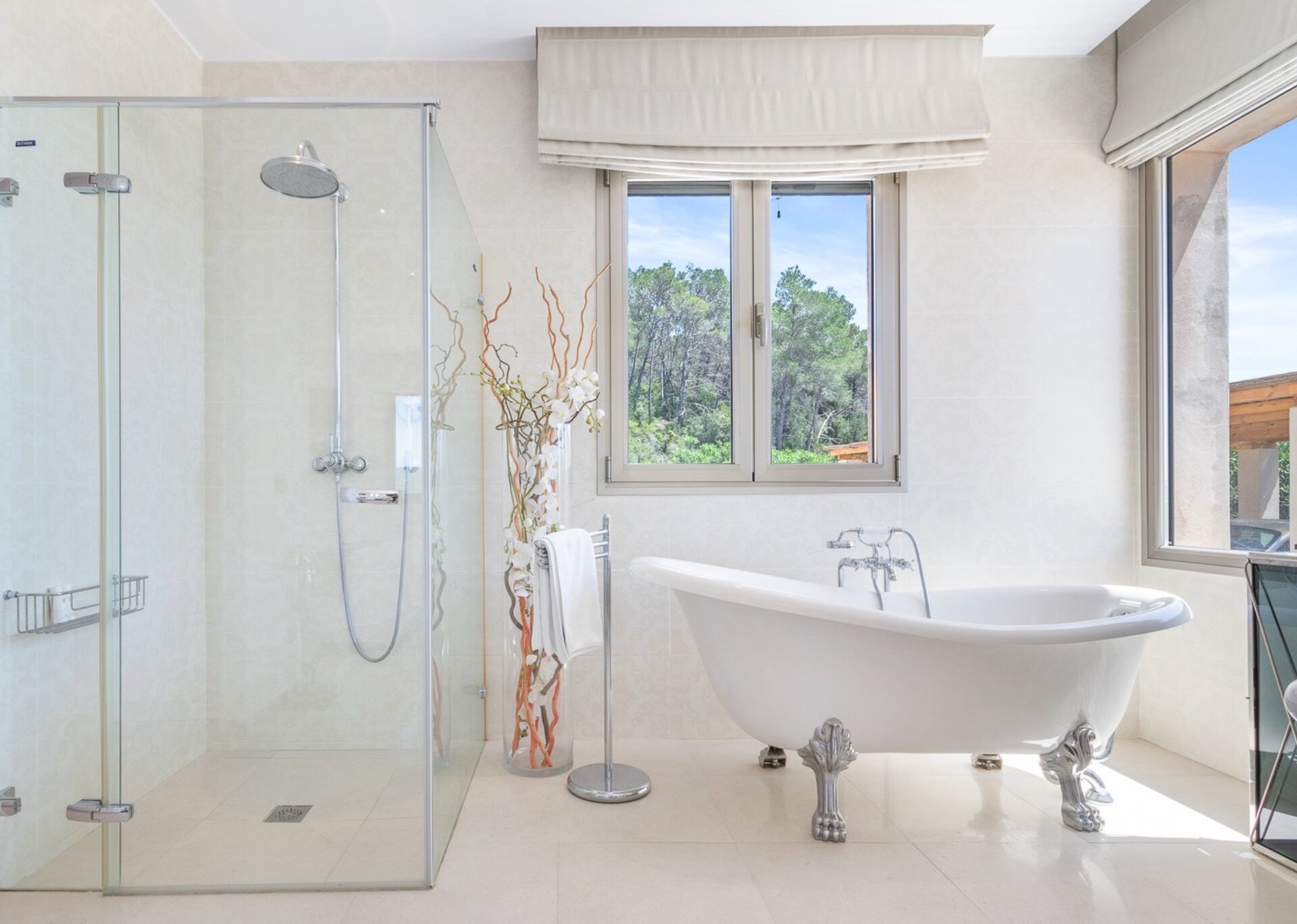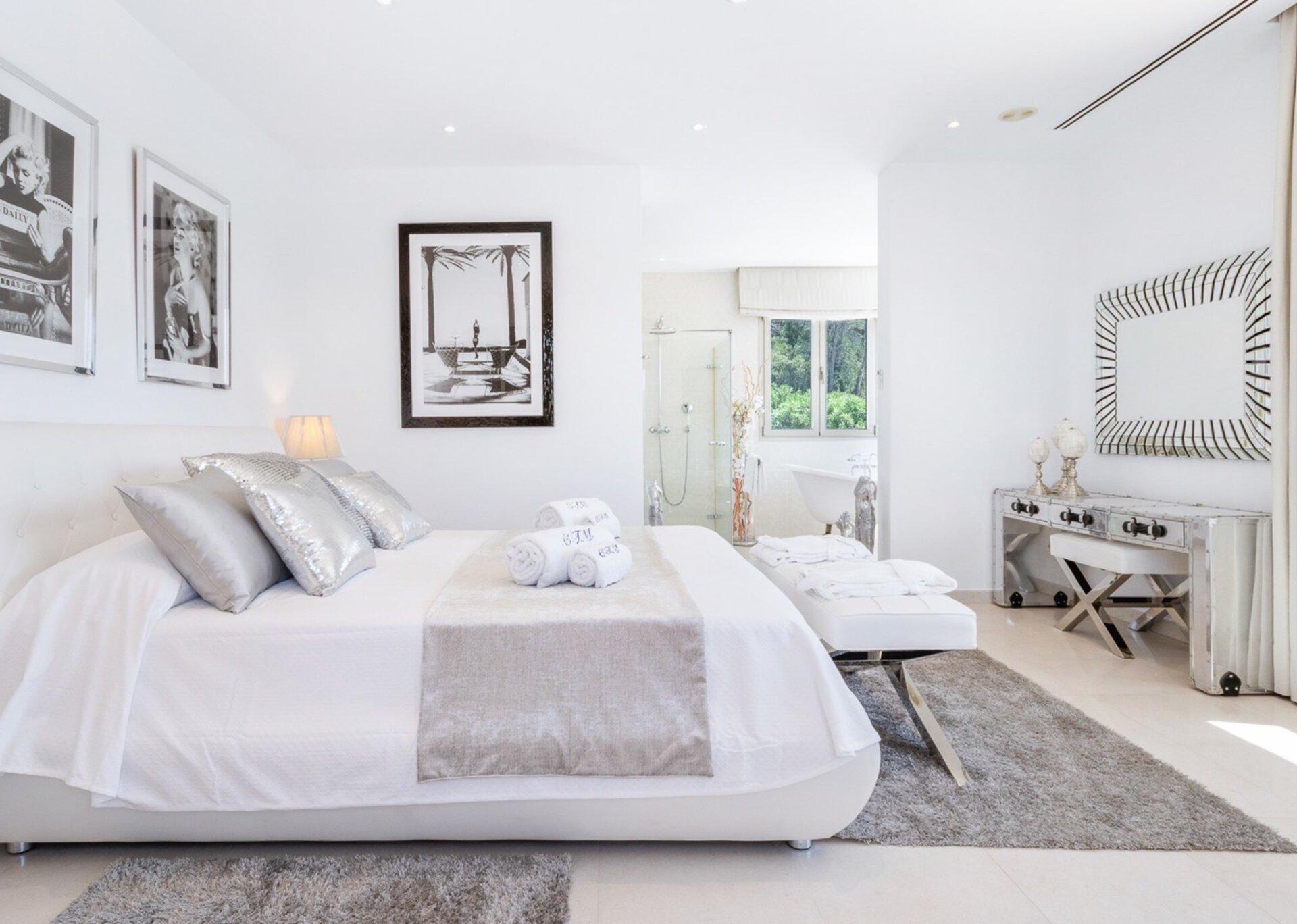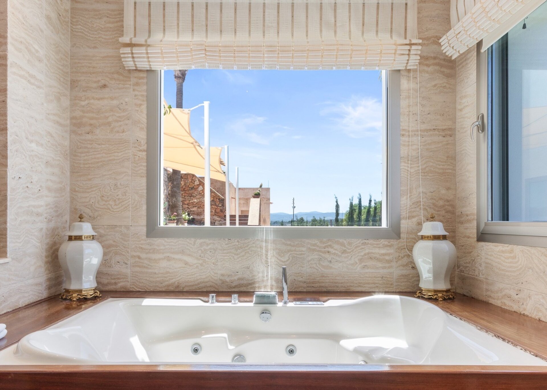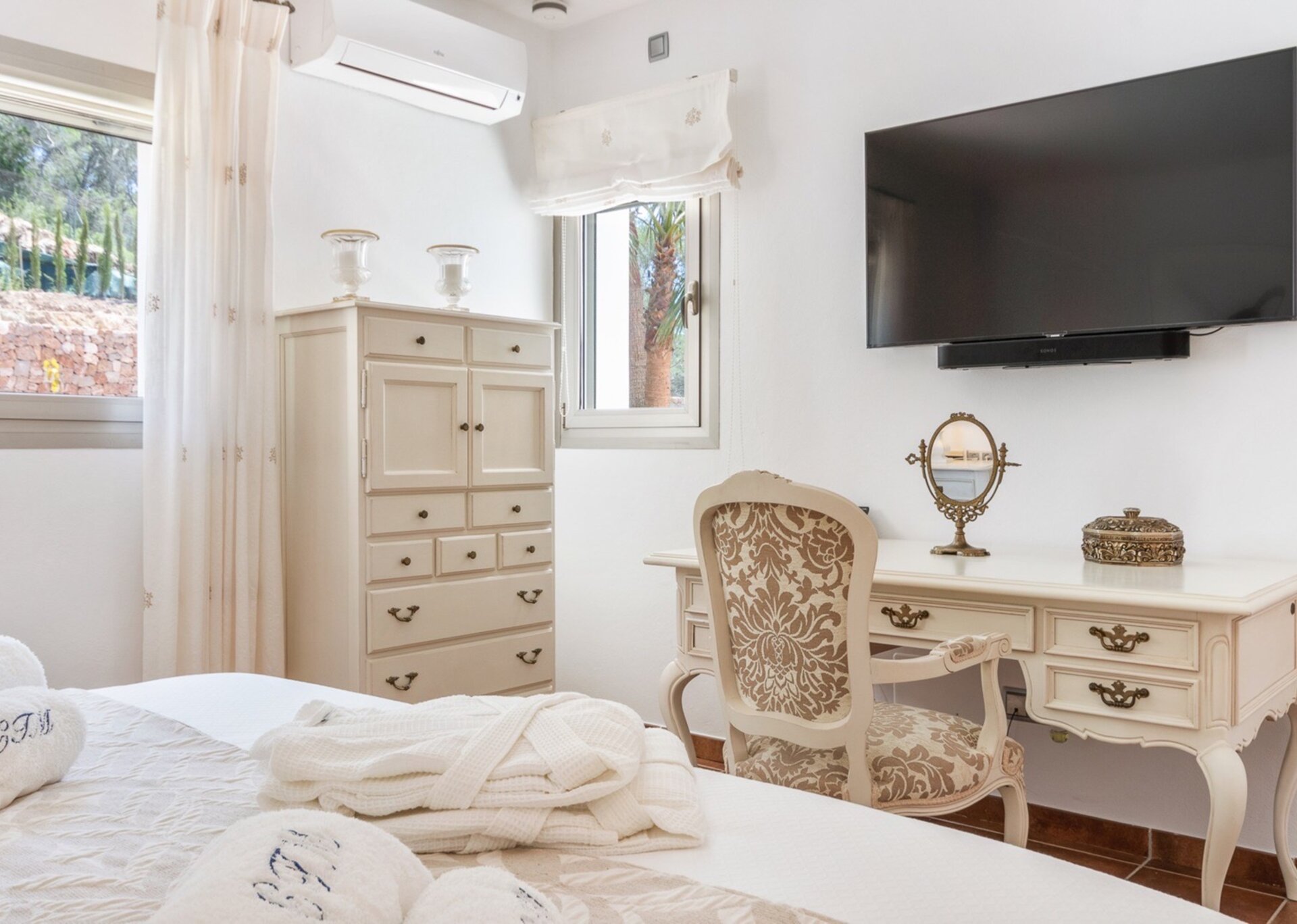 Outside, Finca enchantingly presents an abundance of outdoor terraces. Discover an infinity swimming pool, a heated Jacuzzi, luxurious Balinese beds, and ample sun loungers, enticing you to relax and luxuriate under the sun. Multiple chill-out areas beckon, while two captivating dining areas, complete with a BBQ, wood-burning oven, and a fully equipped outdoor kitchen, invite you to savor al fresco dining in true style from dawn till dusk. To add to the allure, a bespoke bar stands as the perfect spot to enjoy sunset cocktails.