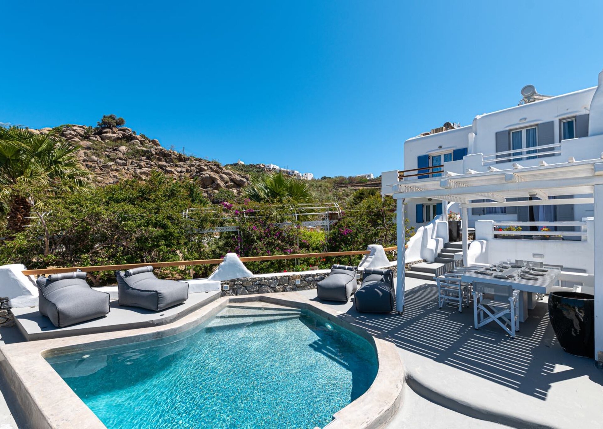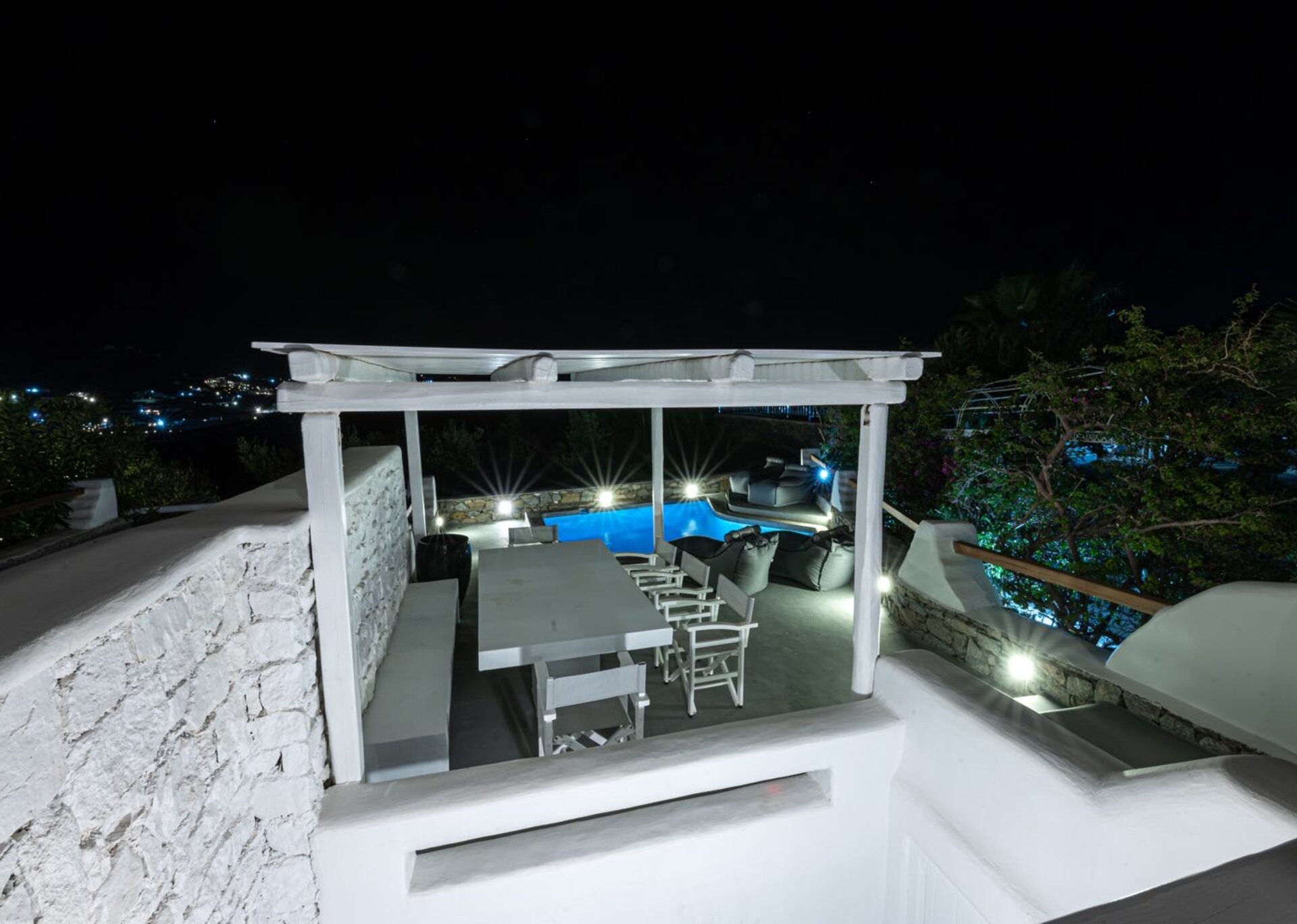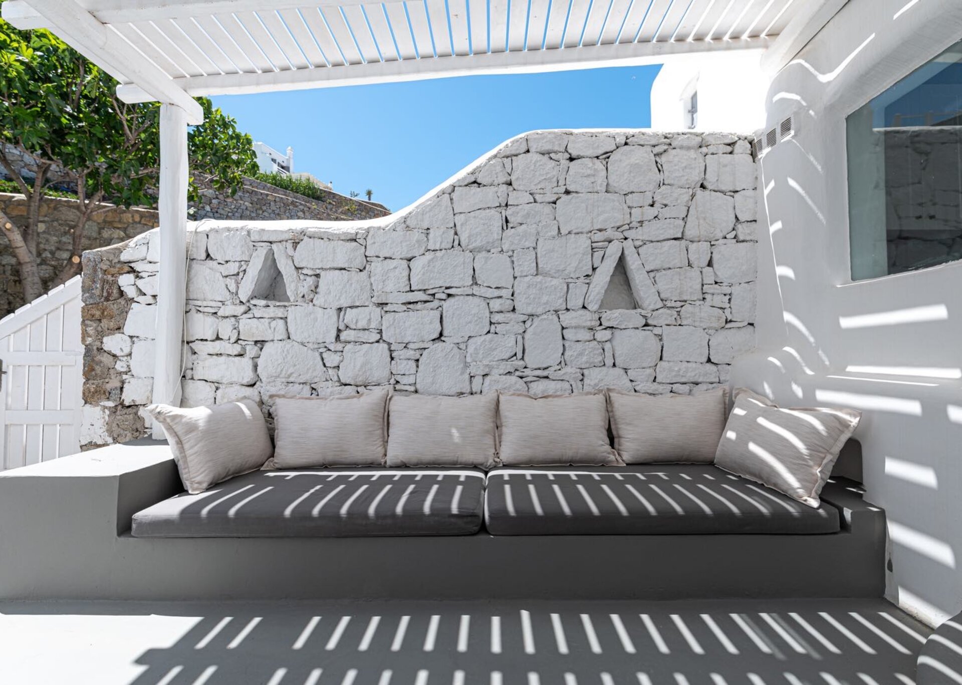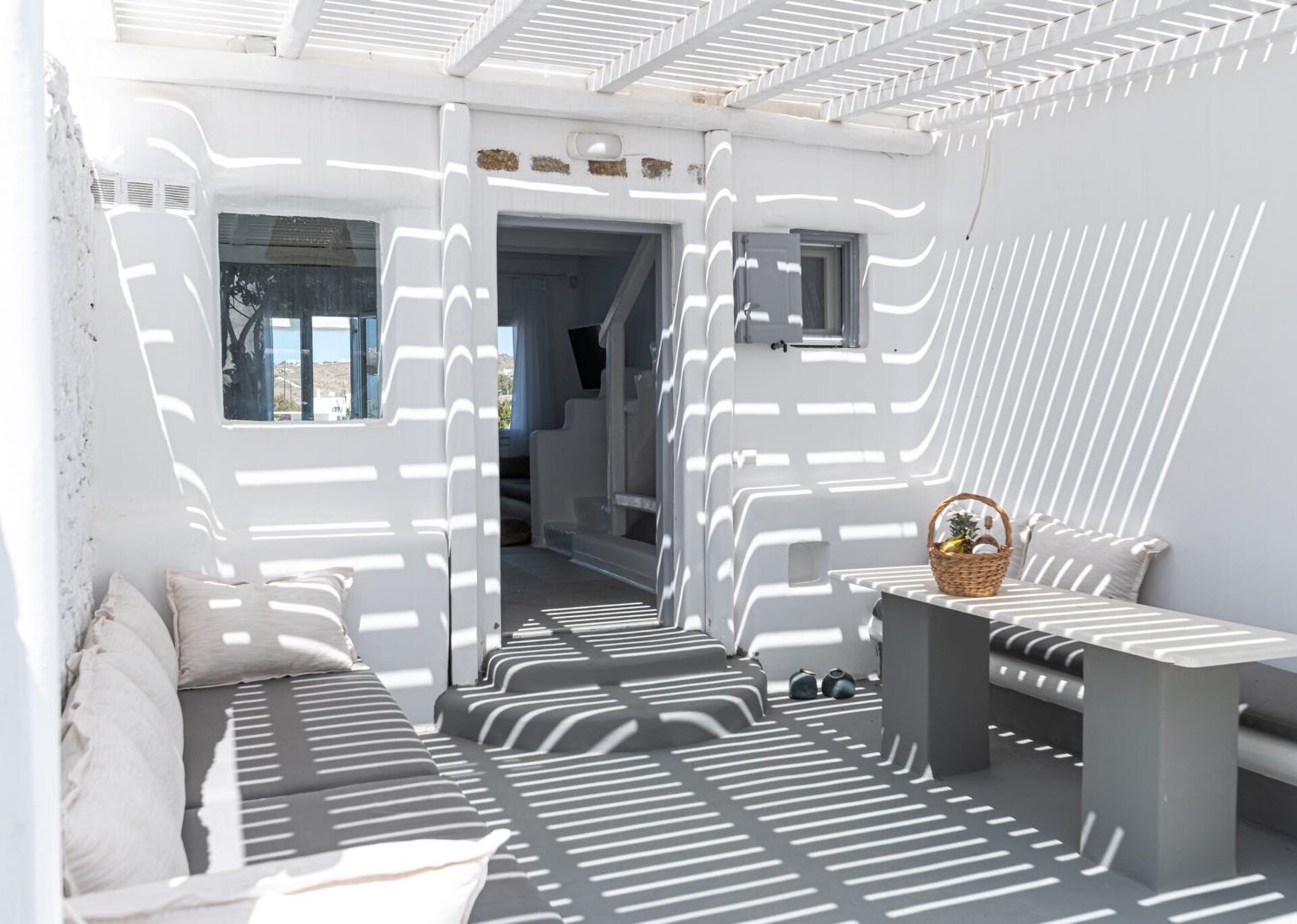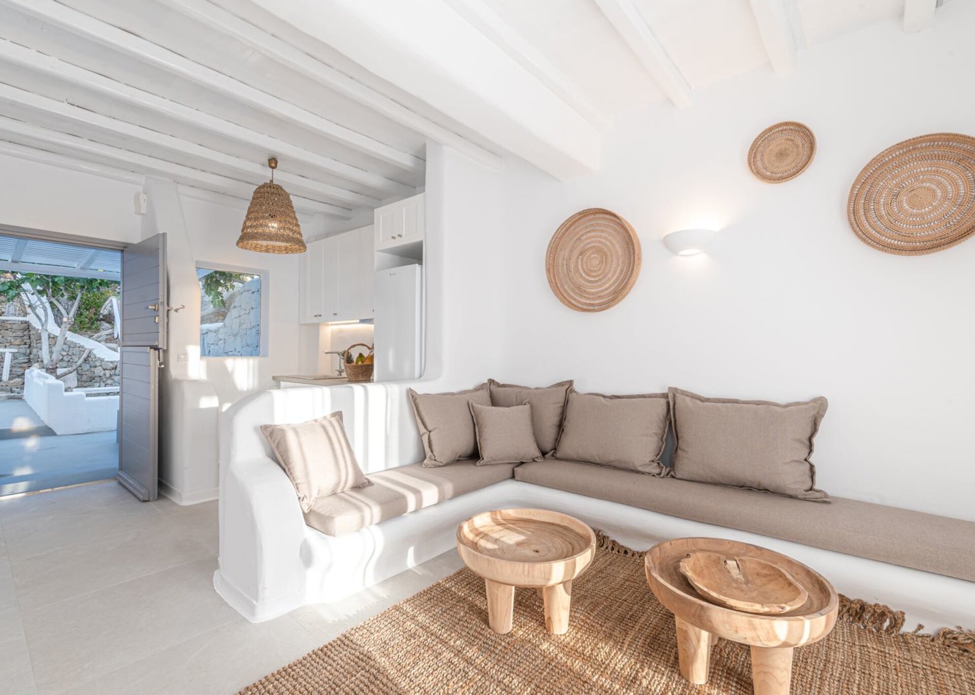 The main features include white plaster, local stone, natural rocks, built-in couches, and wooden pergolas intertwined with Cycladic arches. The villa is surrounded by specially designed areas paved with lush gardens: olive trees, bushes, shrubs, ornamental plants, and cacti among the rocks form beautiful landscapes, creating a particularly relaxing mood.