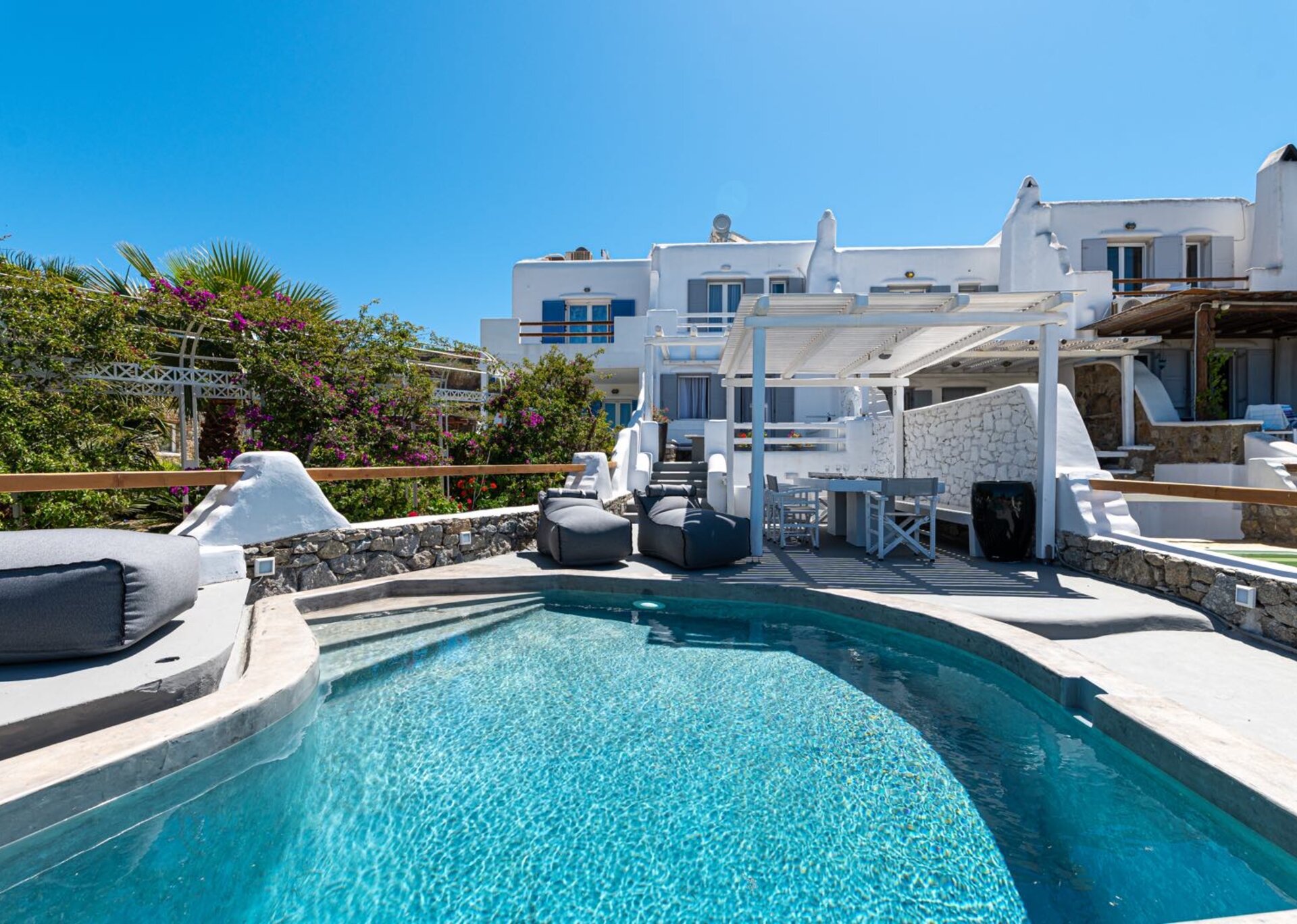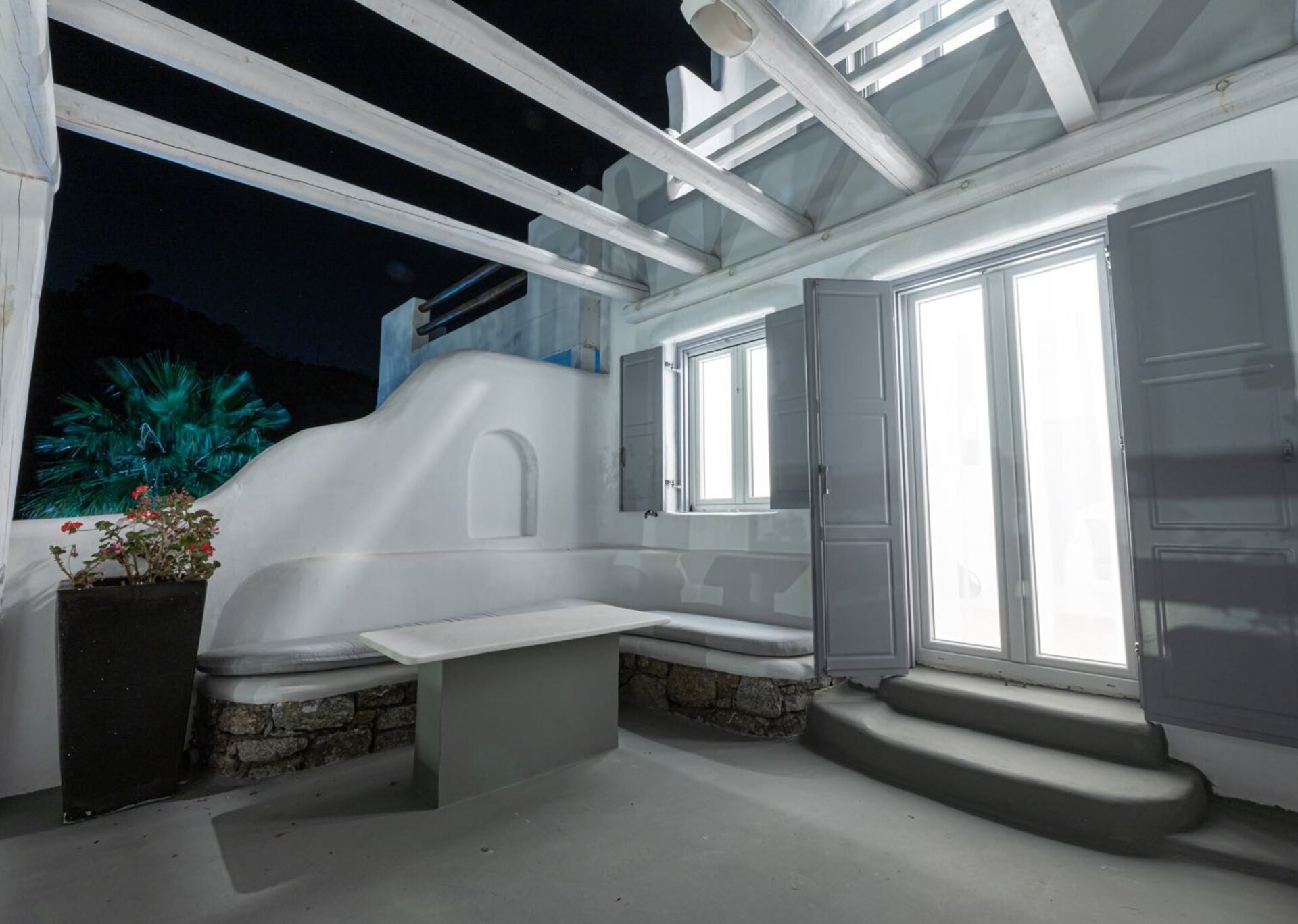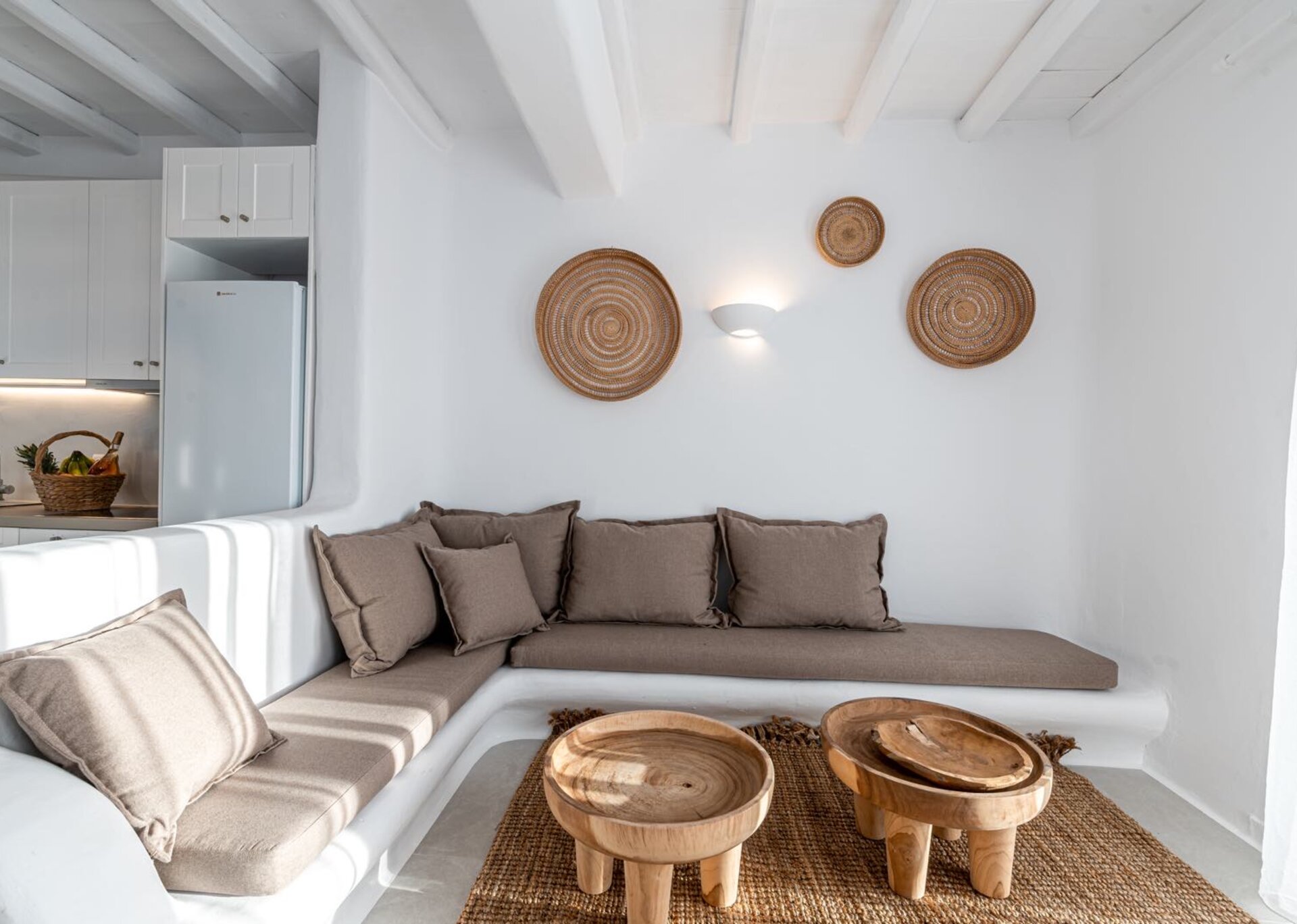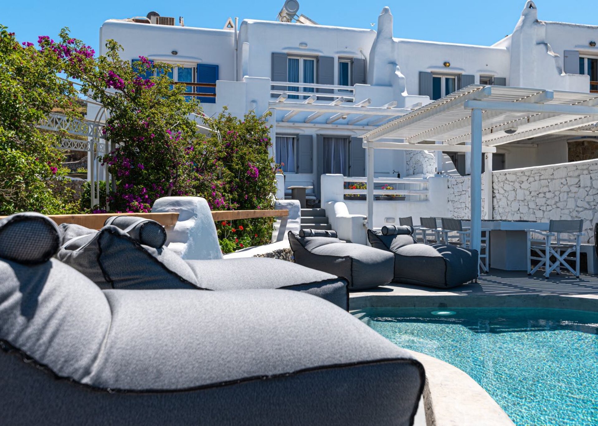 The main features include white plaster, local stone, natural rocks, built-in couches, and wooden pergolas intertwined with Cycladic arches. The villa is surrounded by specially designed areas paved with lush gardens: olive trees, bushes, shrubs, ornamental plants, and cacti among the rocks form beautiful landscapes, creating a particularly relaxing mood.