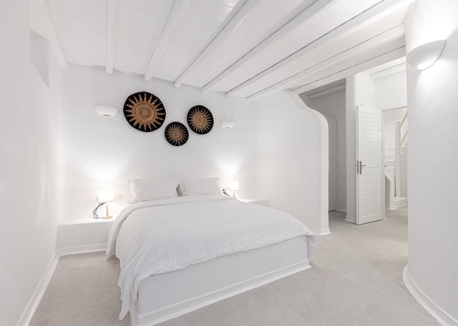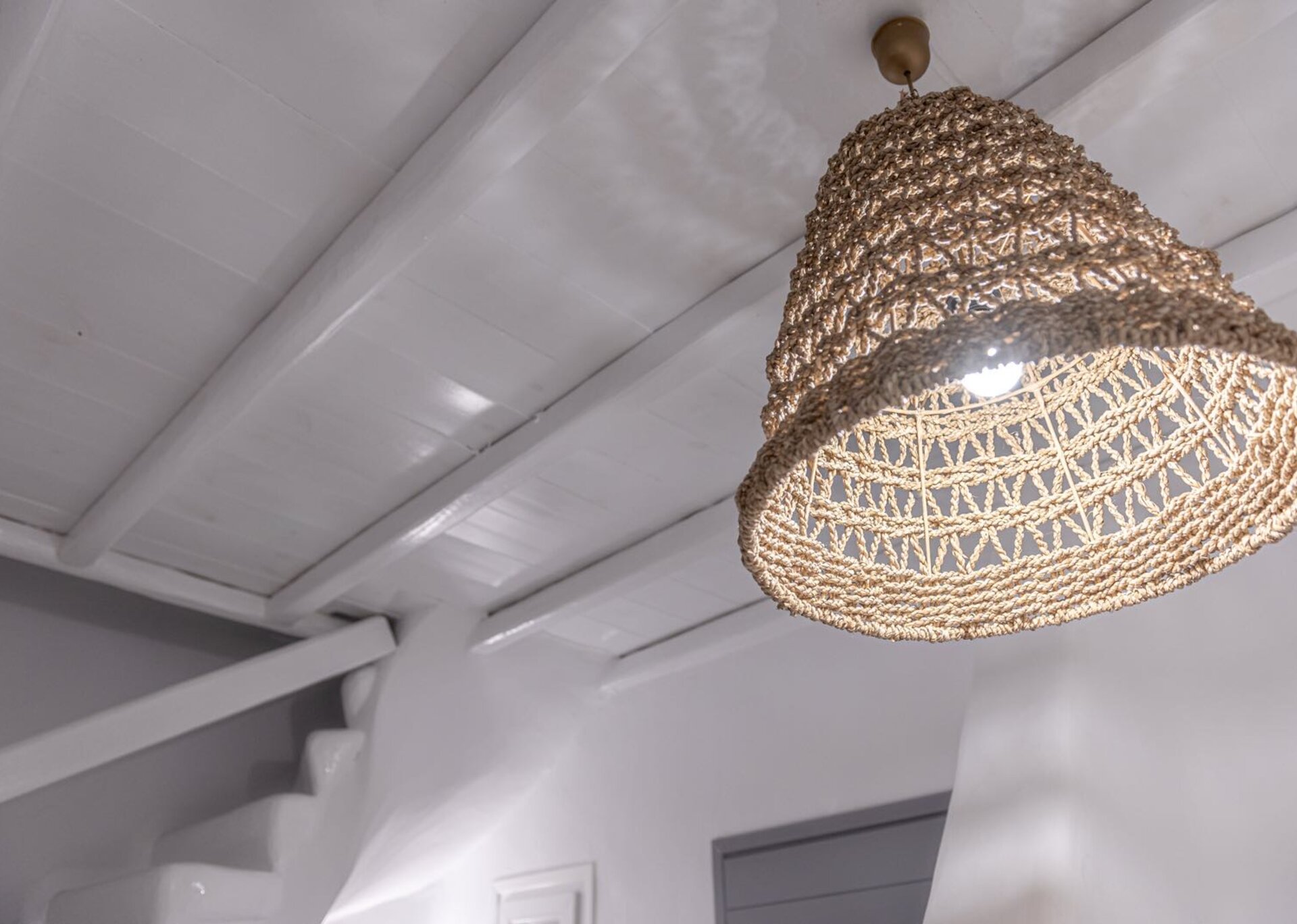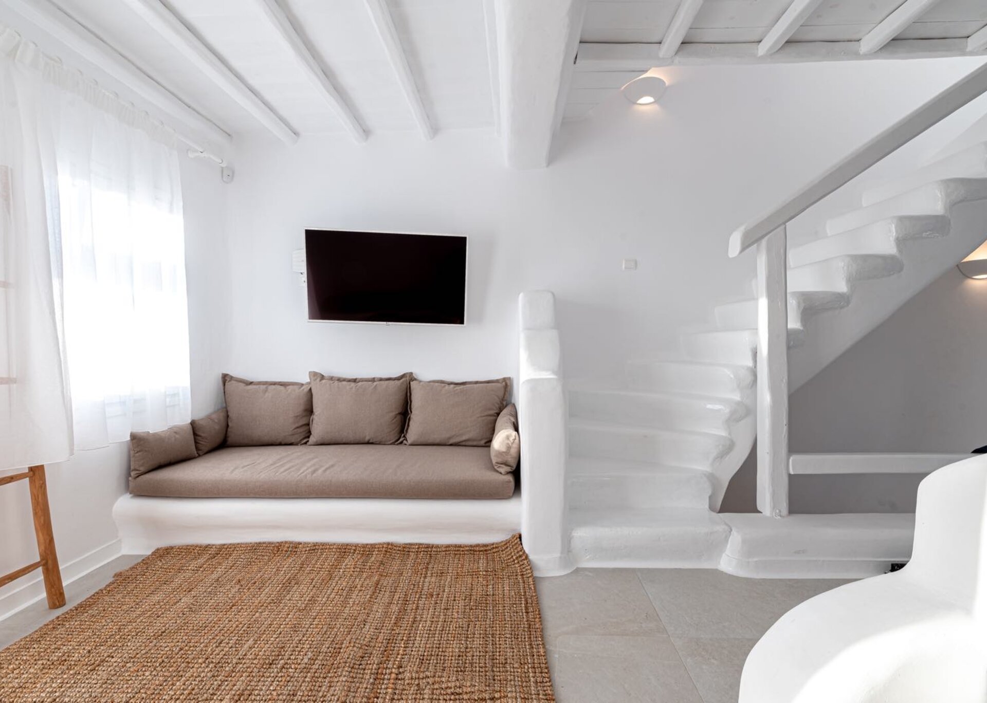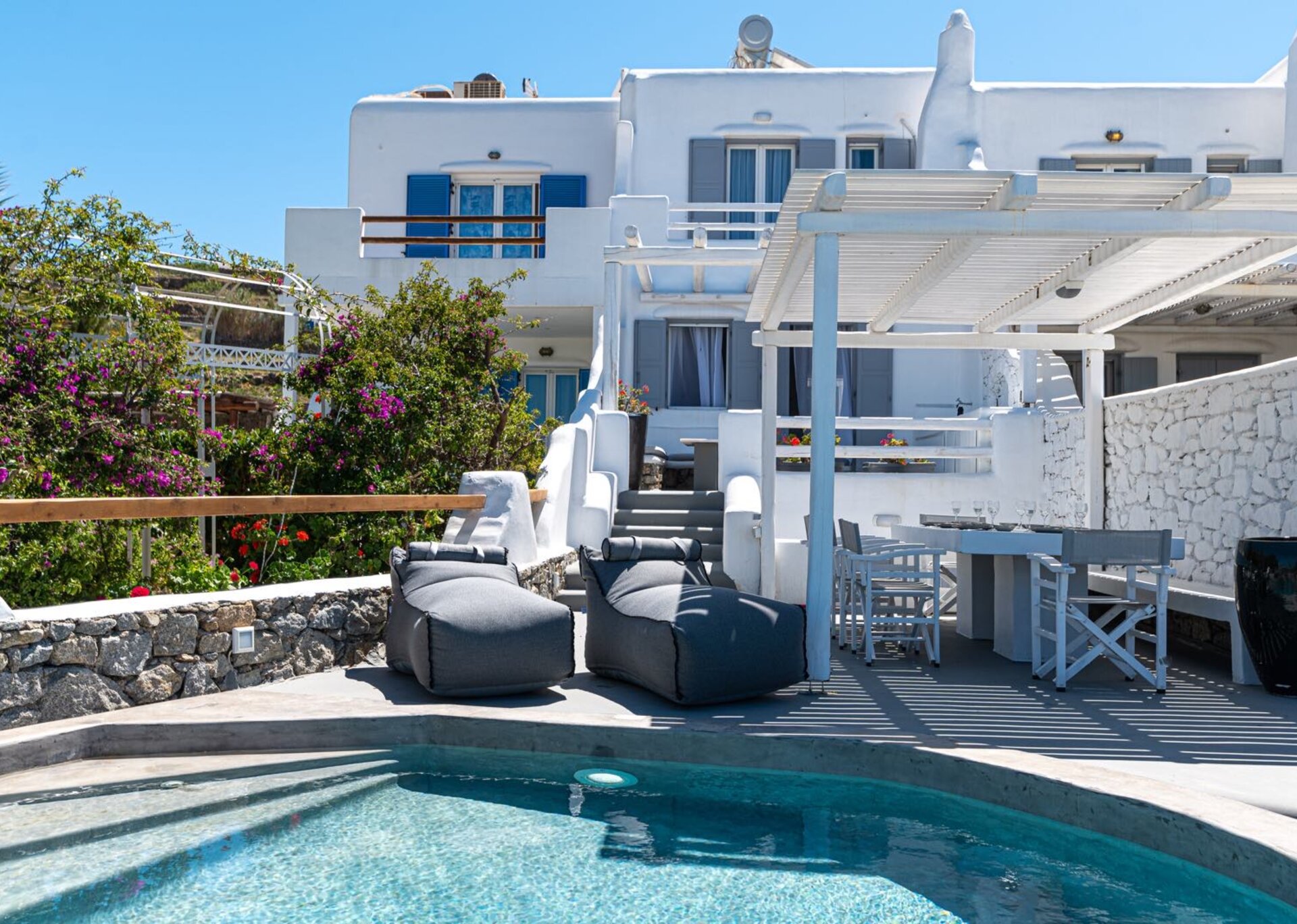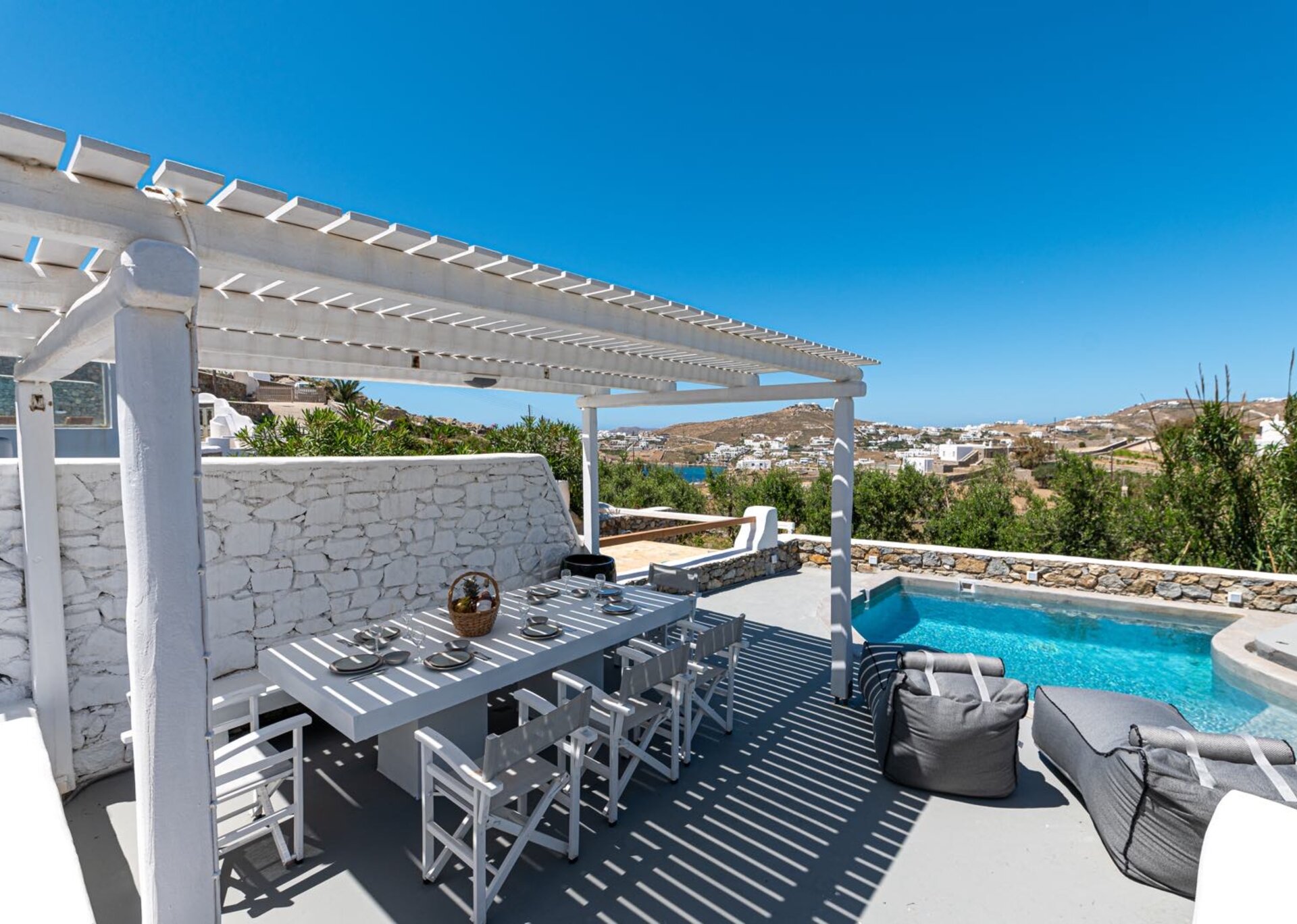 The main features include white plaster, local stone, natural rocks, built-in couches, and wooden pergolas intertwined with Cycladic arches. The villa is surrounded by specially designed areas paved with lush gardens: olive trees, bushes, shrubs, ornamental plants, and cacti among the rocks form beautiful landscapes, creating a particularly relaxing mood.