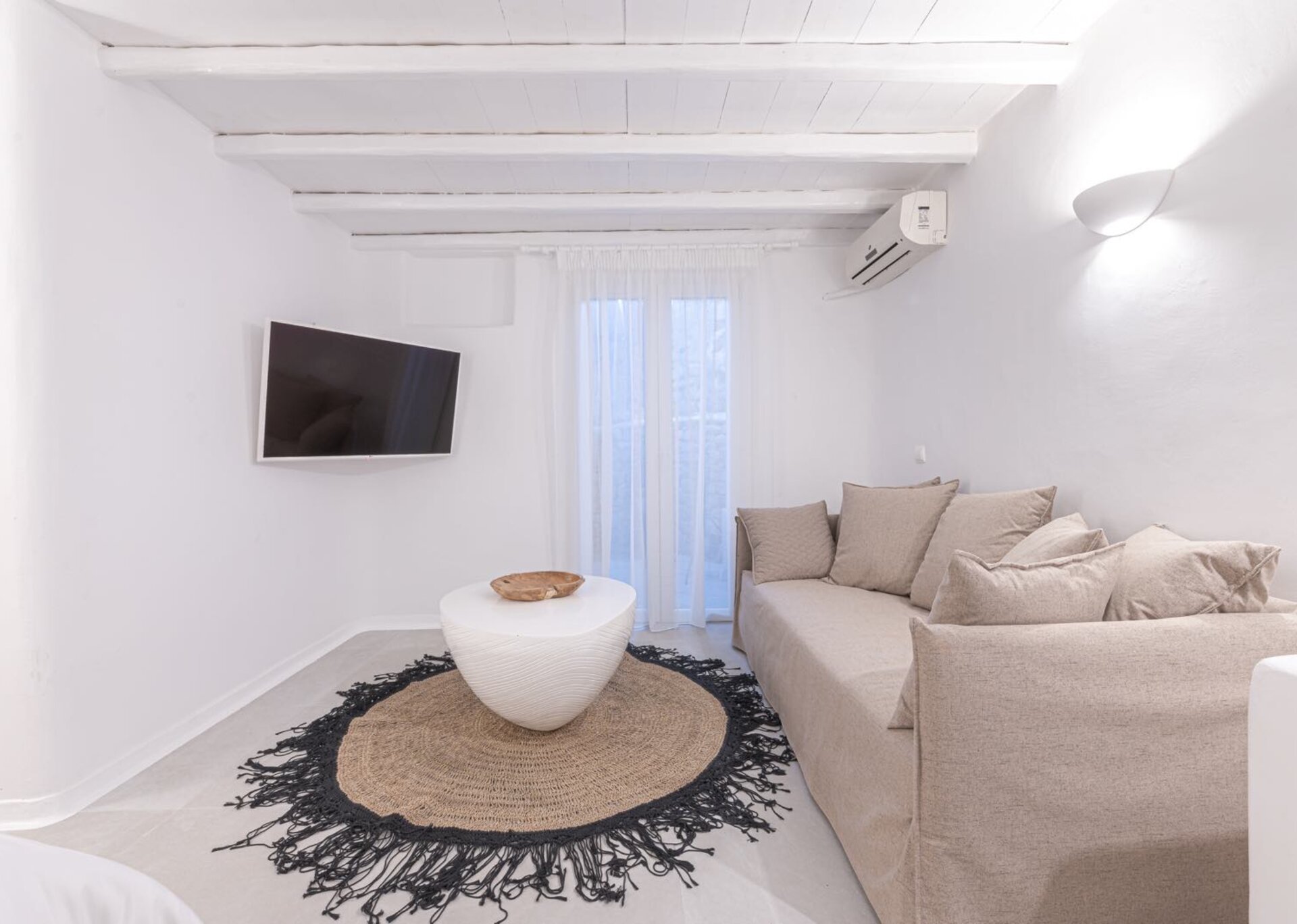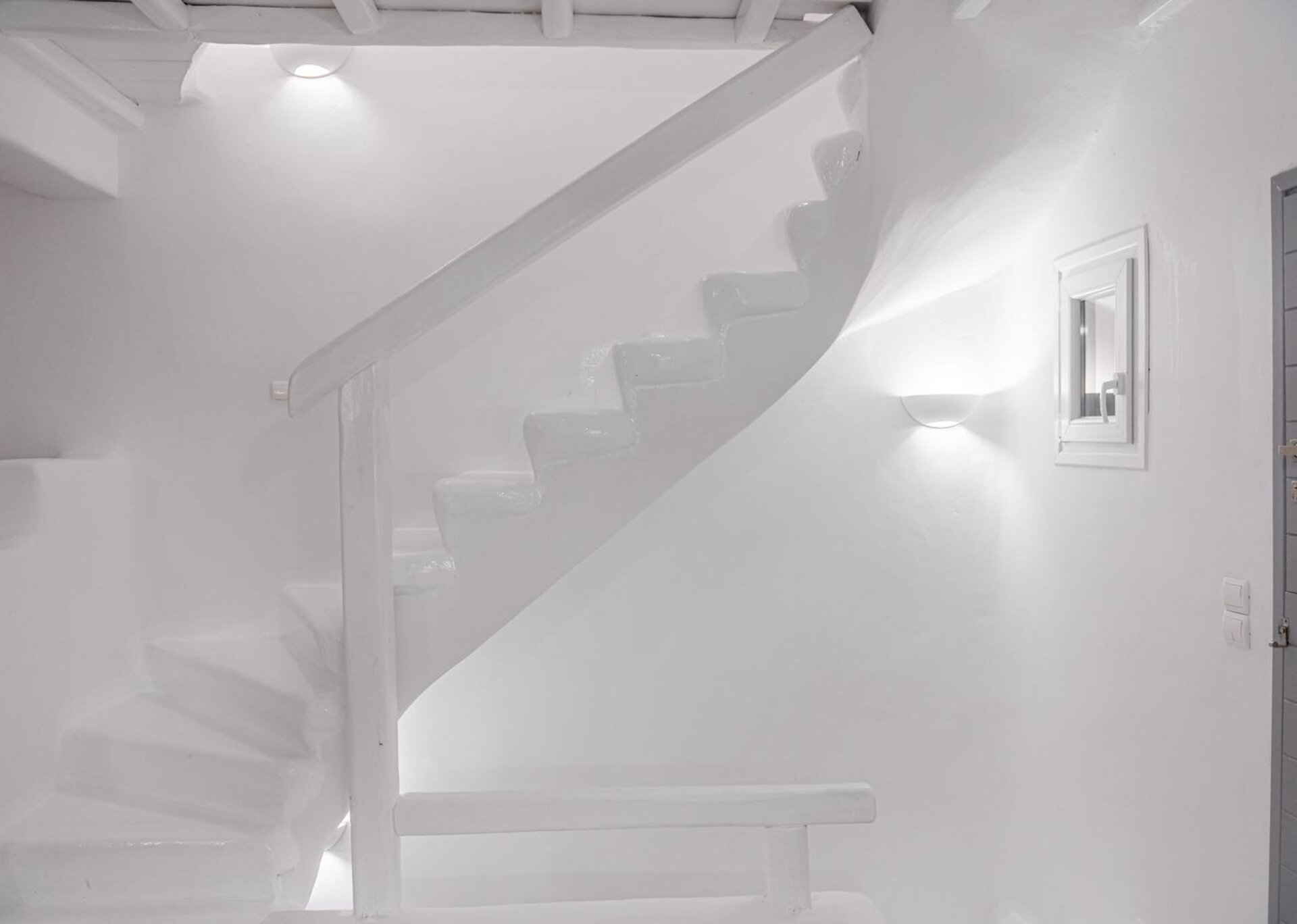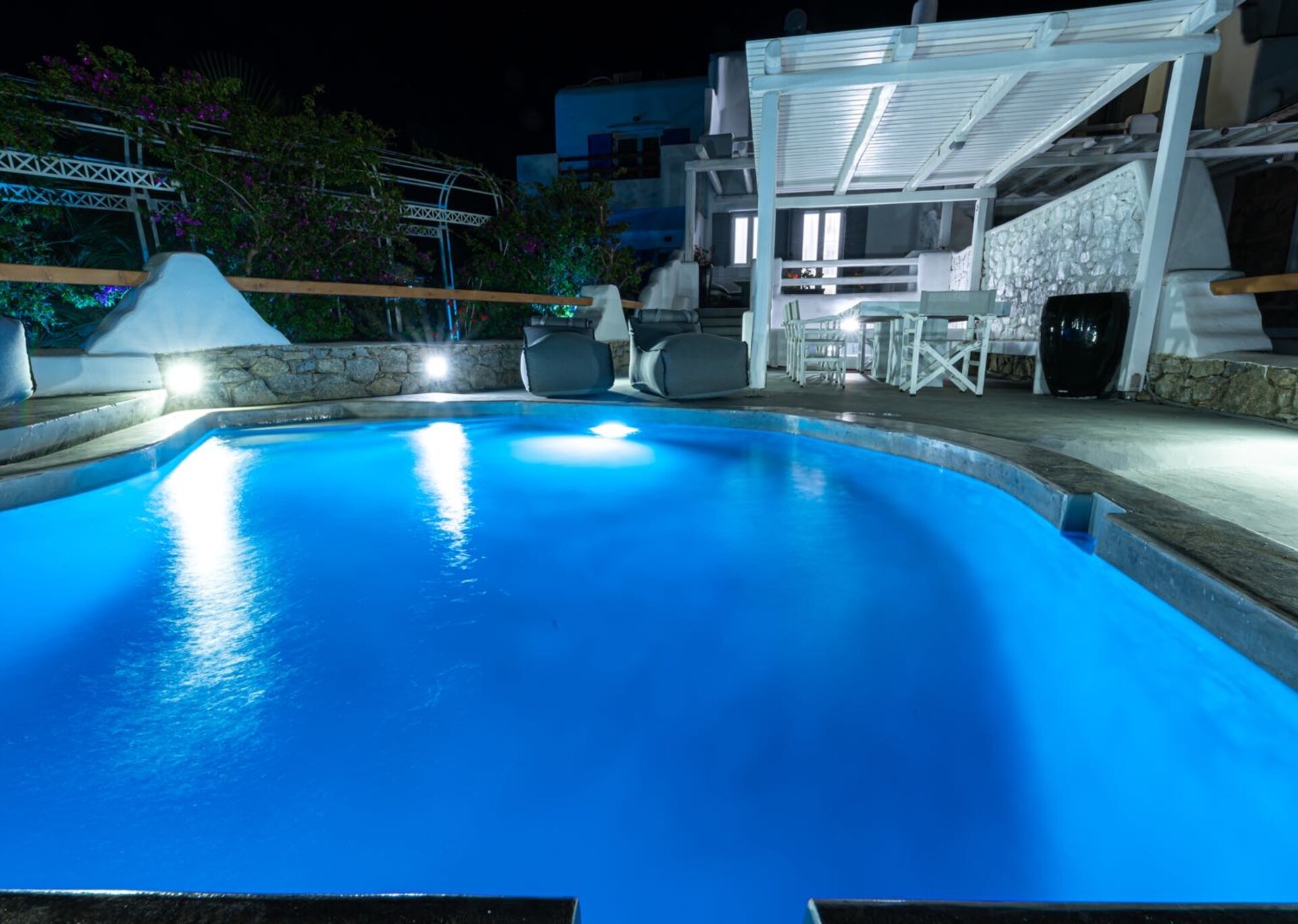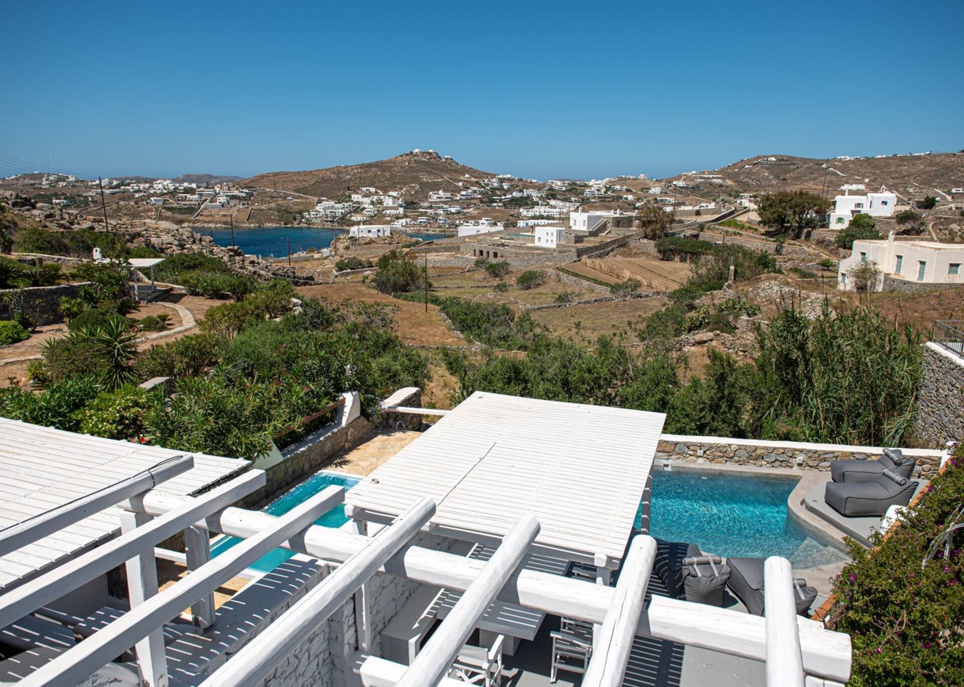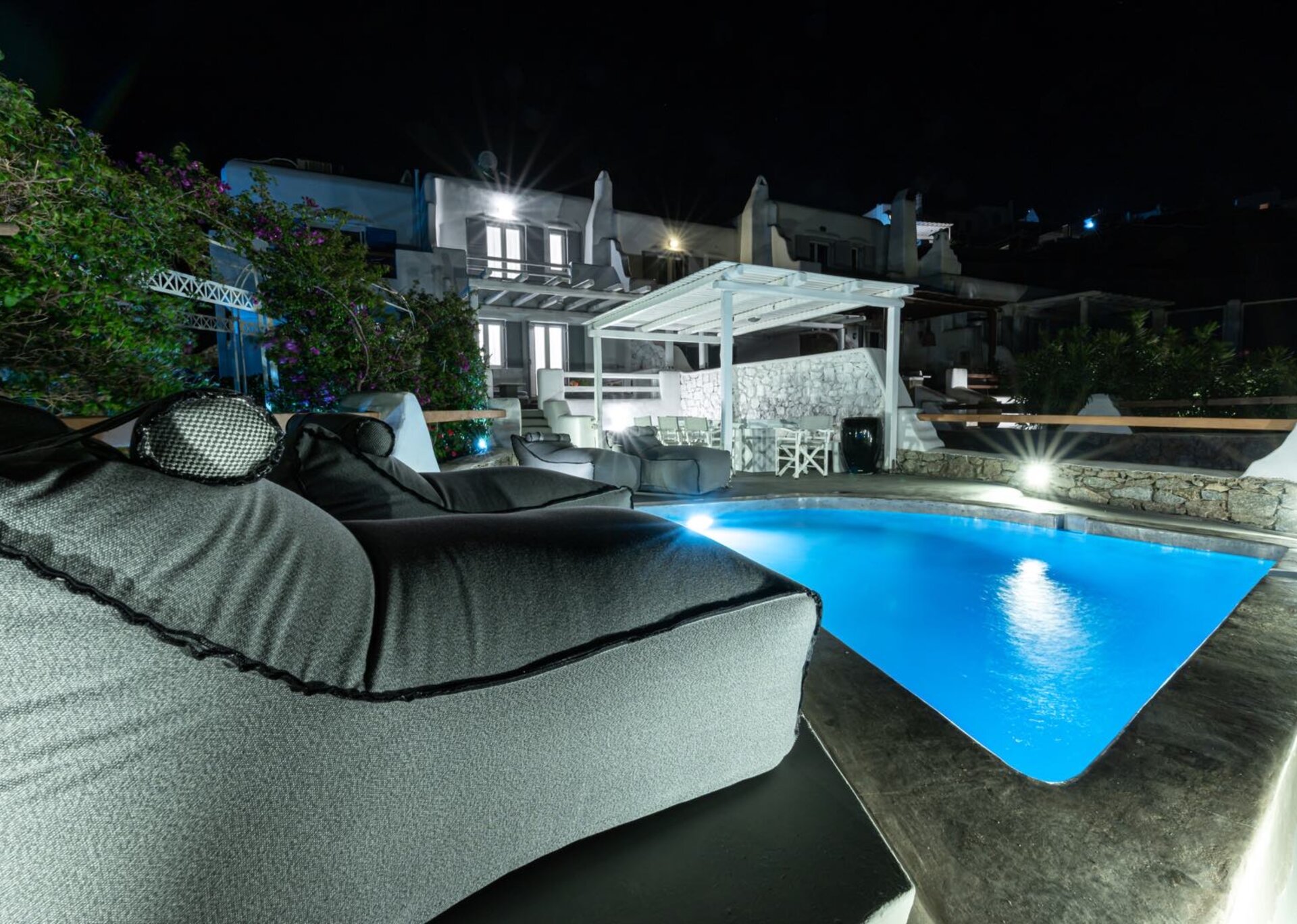 The main features include white plaster, local stone, natural rocks, built-in couches, and wooden pergolas intertwined with Cycladic arches. The villa is surrounded by specially designed areas paved with lush gardens: olive trees, bushes, shrubs, ornamental plants, and cacti among the rocks form beautiful landscapes, creating a particularly relaxing mood.