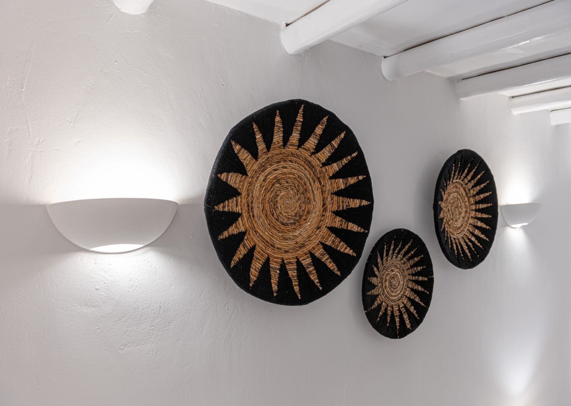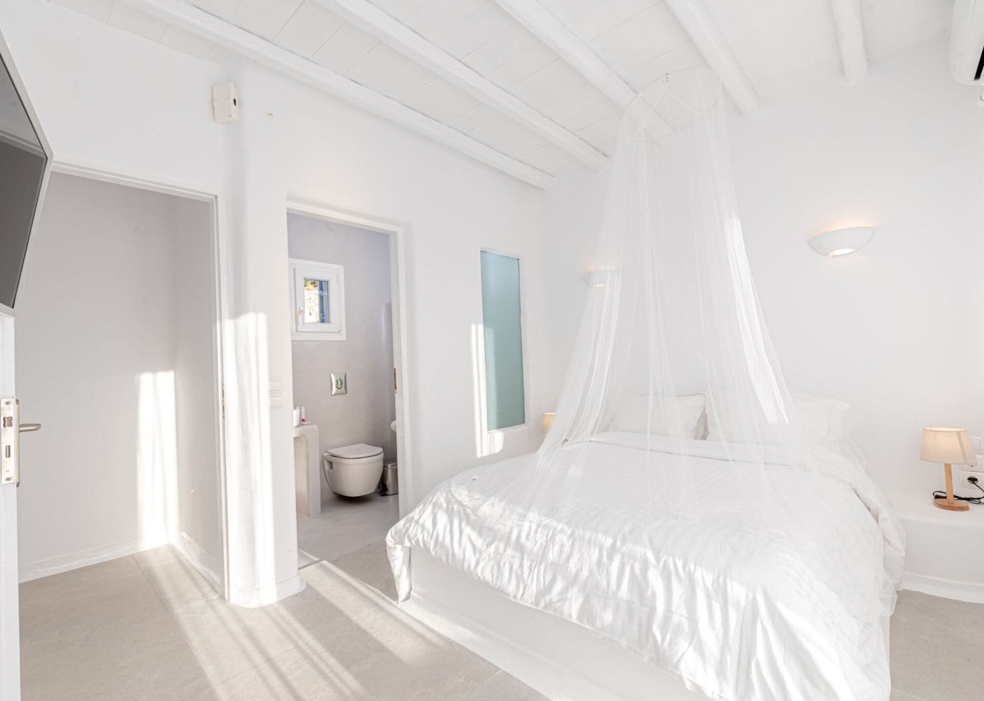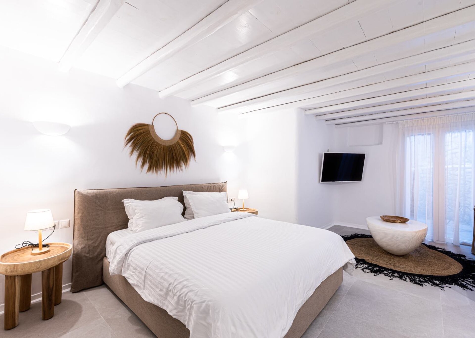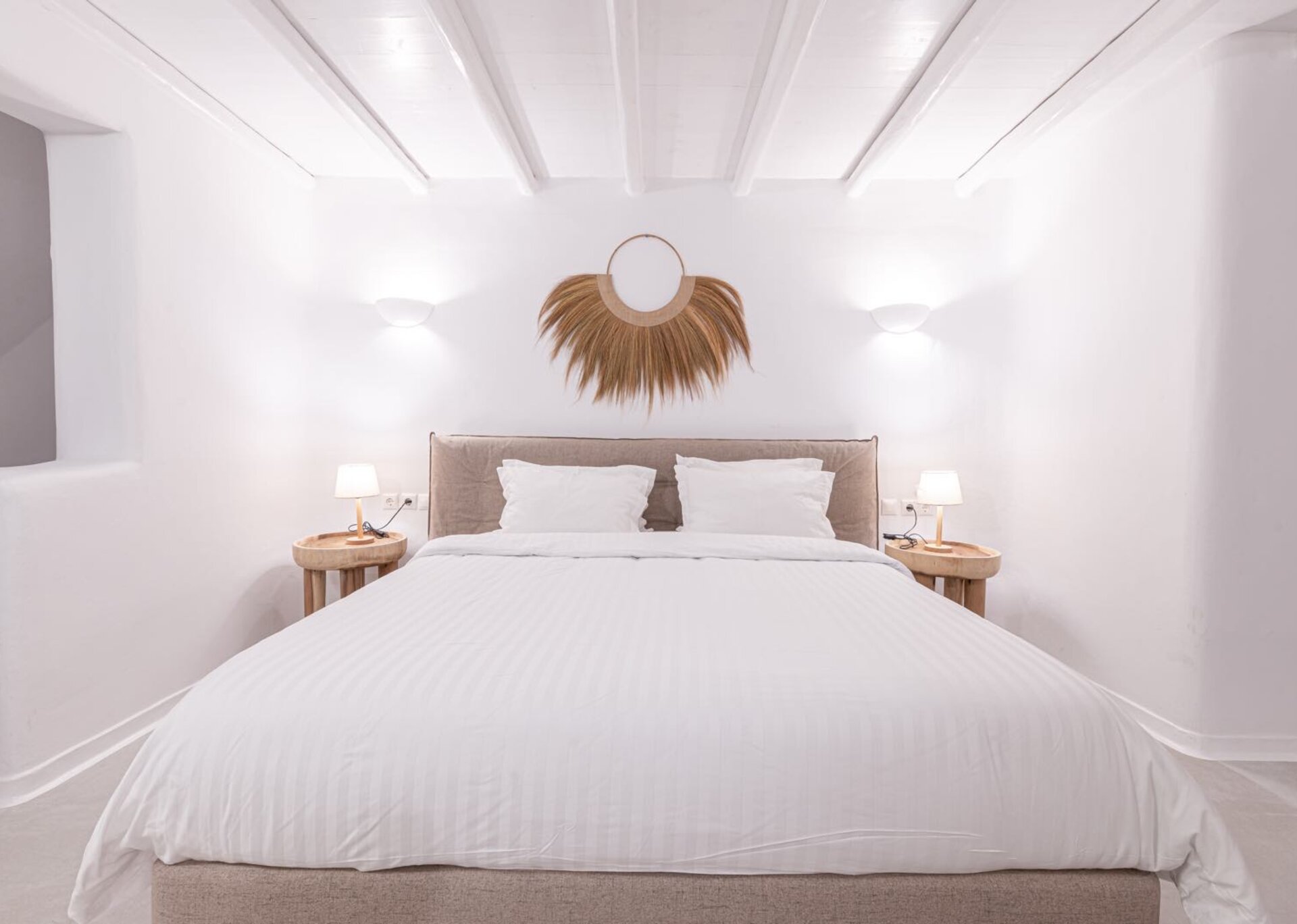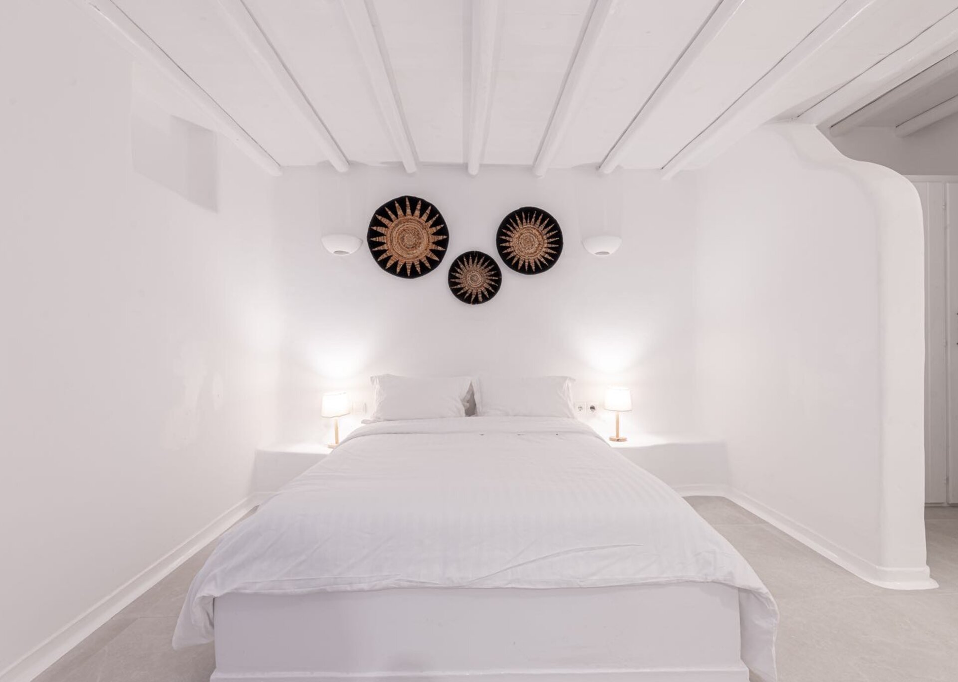 The main features include white plaster, local stone, natural rocks, built-in couches, and wooden pergolas intertwined with Cycladic arches. The villa is surrounded by specially designed areas paved with lush gardens: olive trees, bushes, shrubs, ornamental plants, and cacti among the rocks form beautiful landscapes, creating a particularly relaxing mood.