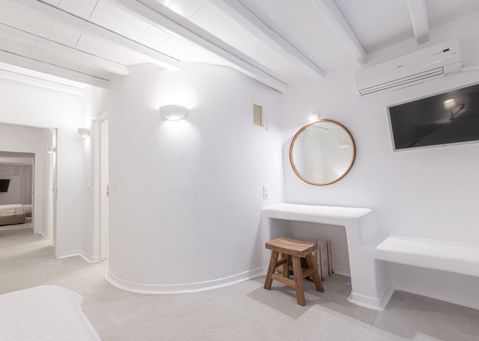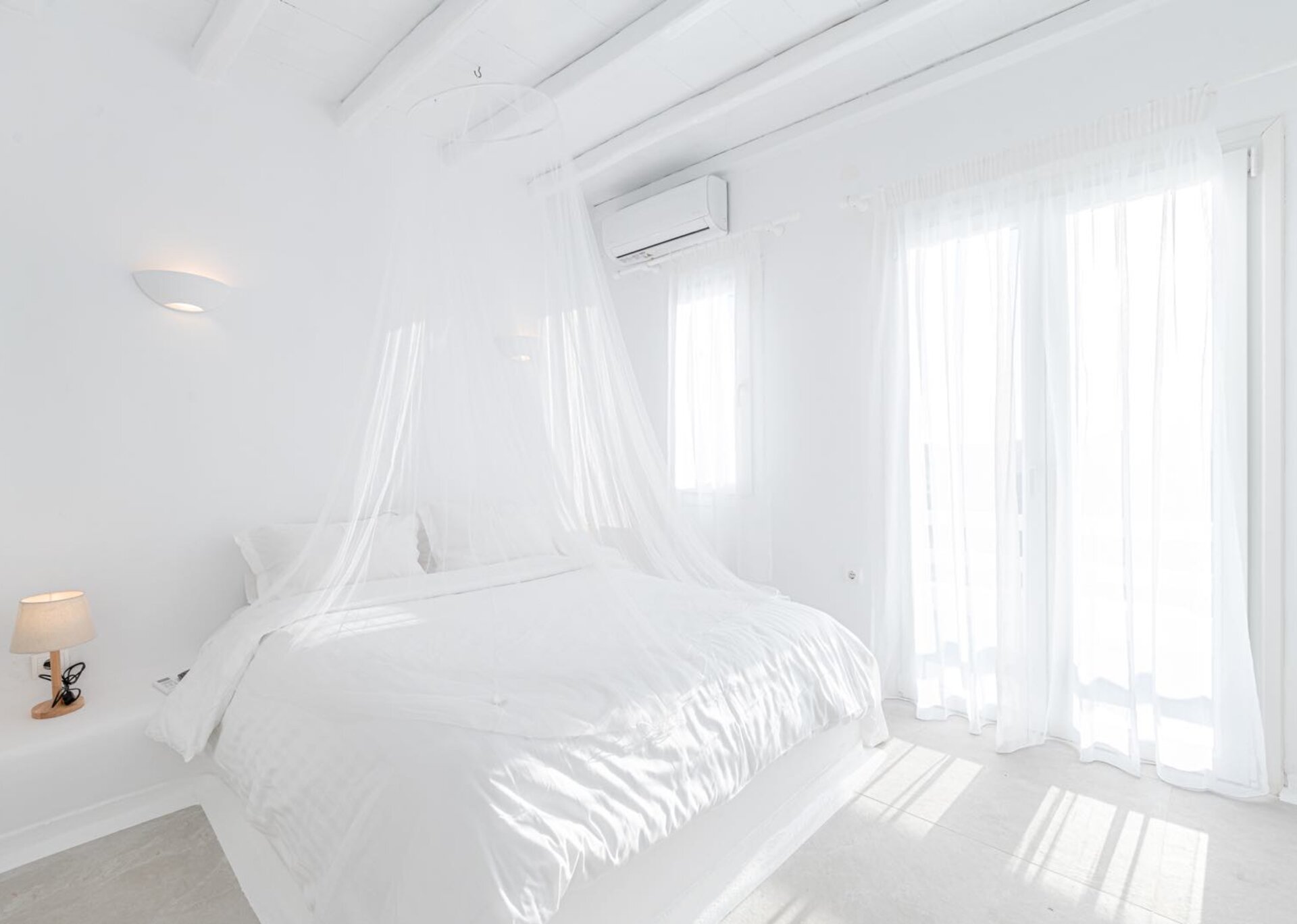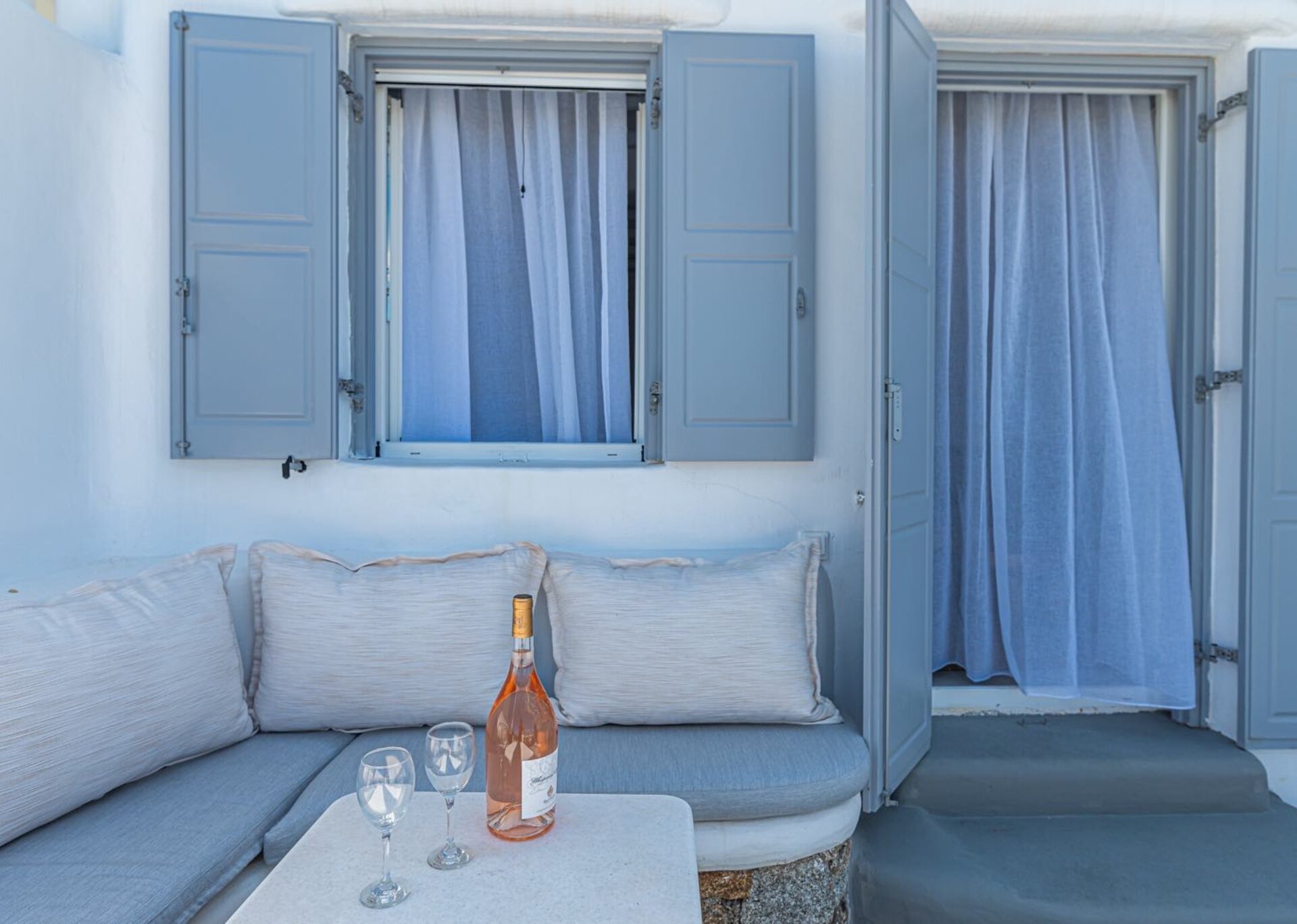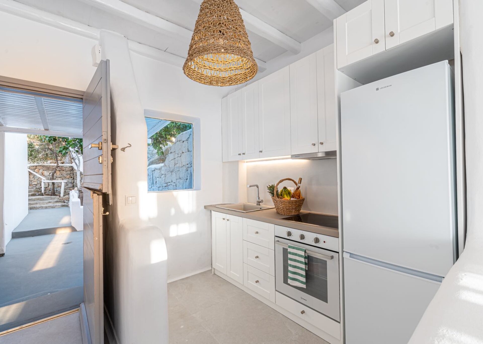 The main features include white plaster, local stone, natural rocks, built-in couches, and wooden pergolas intertwined with Cycladic arches. The villa is surrounded by specially designed areas paved with lush gardens: olive trees, bushes, shrubs, ornamental plants, and cacti among the rocks form beautiful landscapes, creating a particularly relaxing mood.
