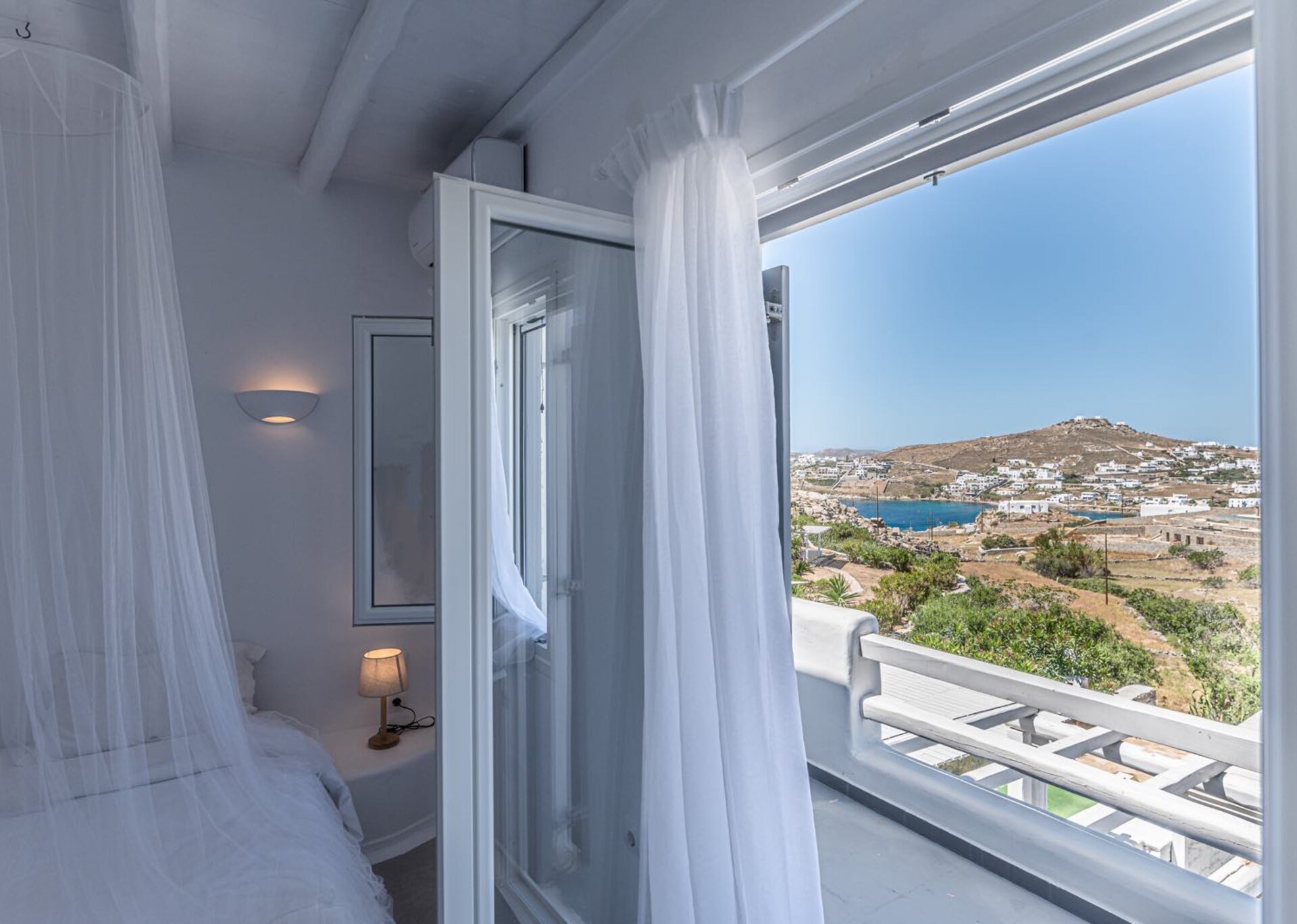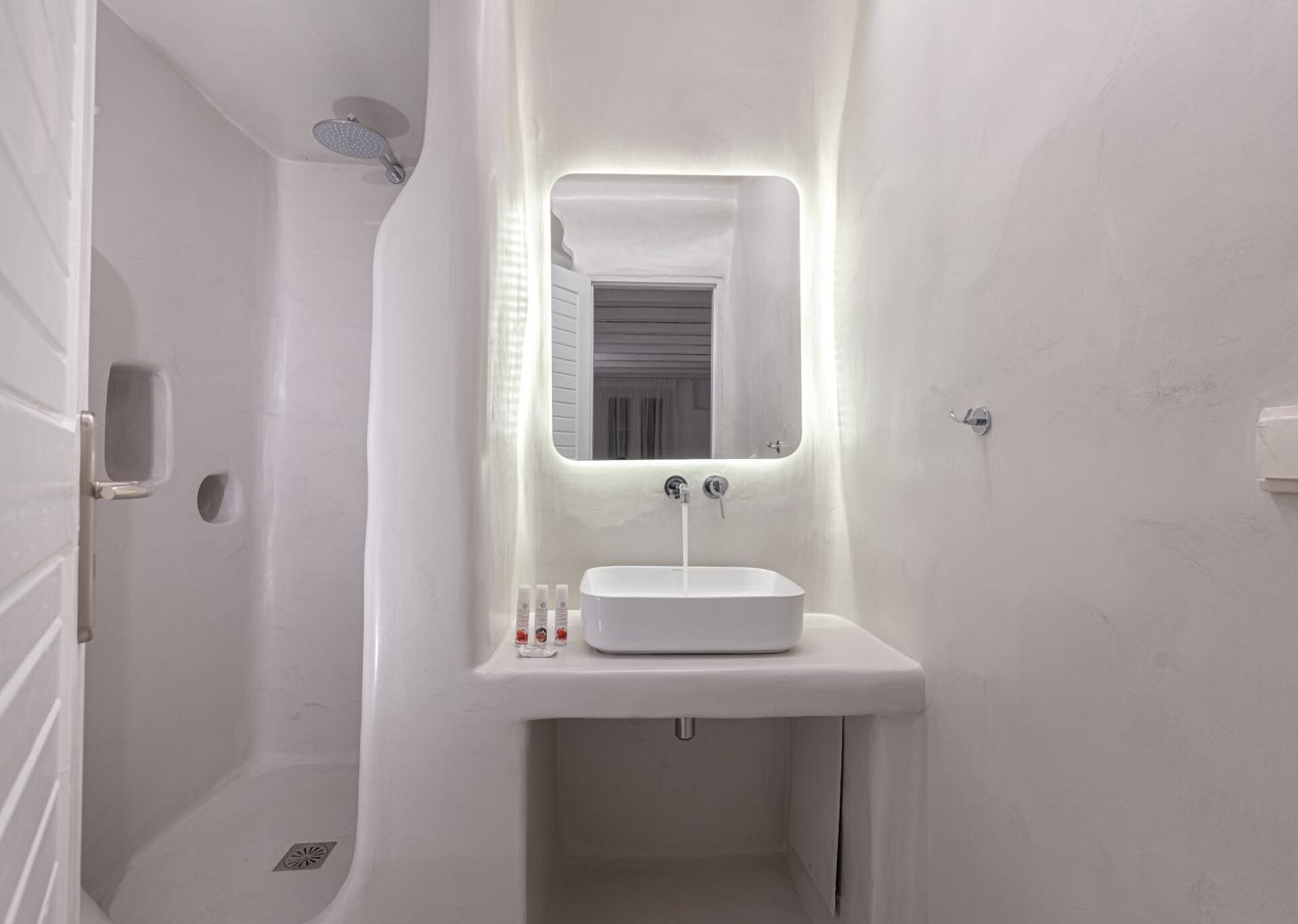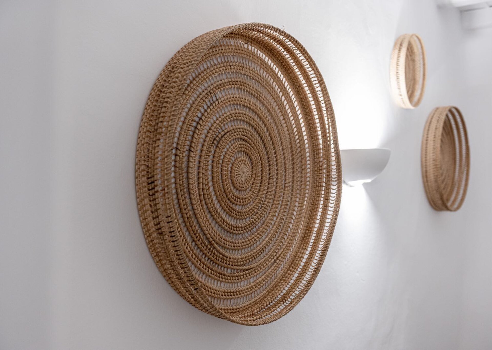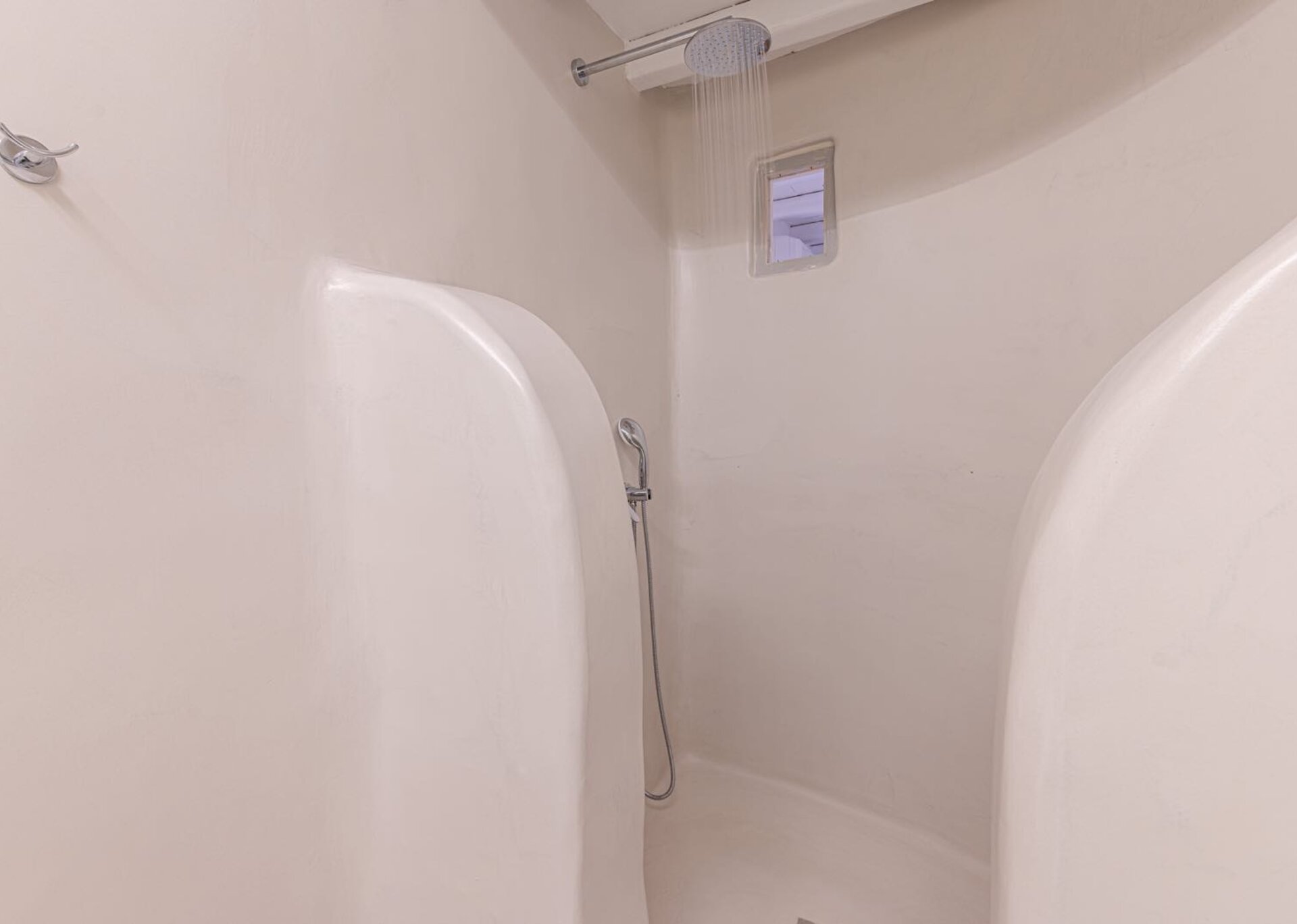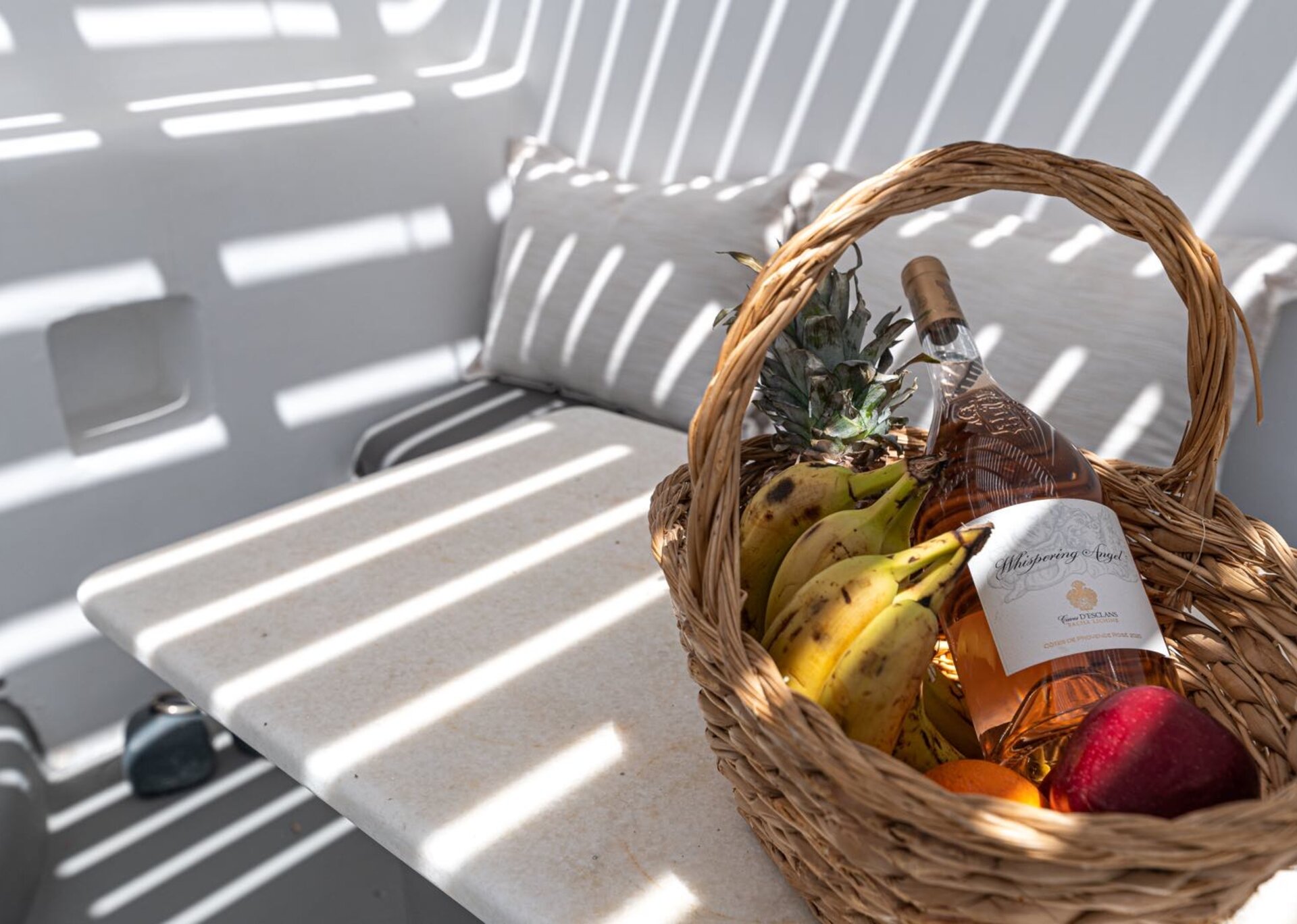 The main features include white plaster, local stone, natural rocks, built-in couches, and wooden pergolas intertwined with Cycladic arches. The villa is surrounded by specially designed areas paved with lush gardens: olive trees, bushes, shrubs, ornamental plants, and cacti among the rocks form beautiful landscapes, creating a particularly relaxing mood.
