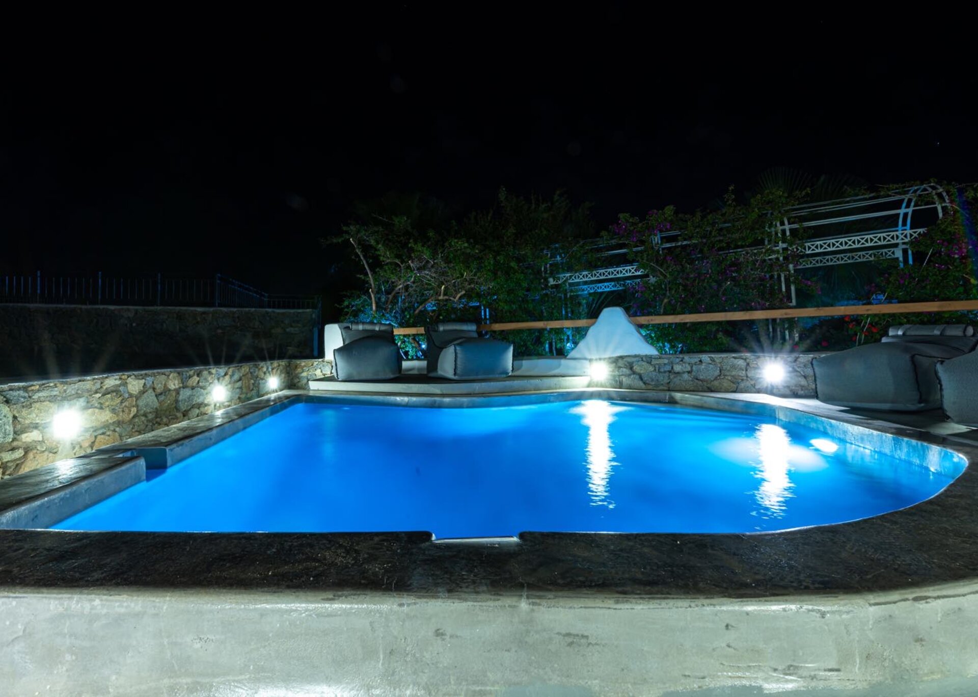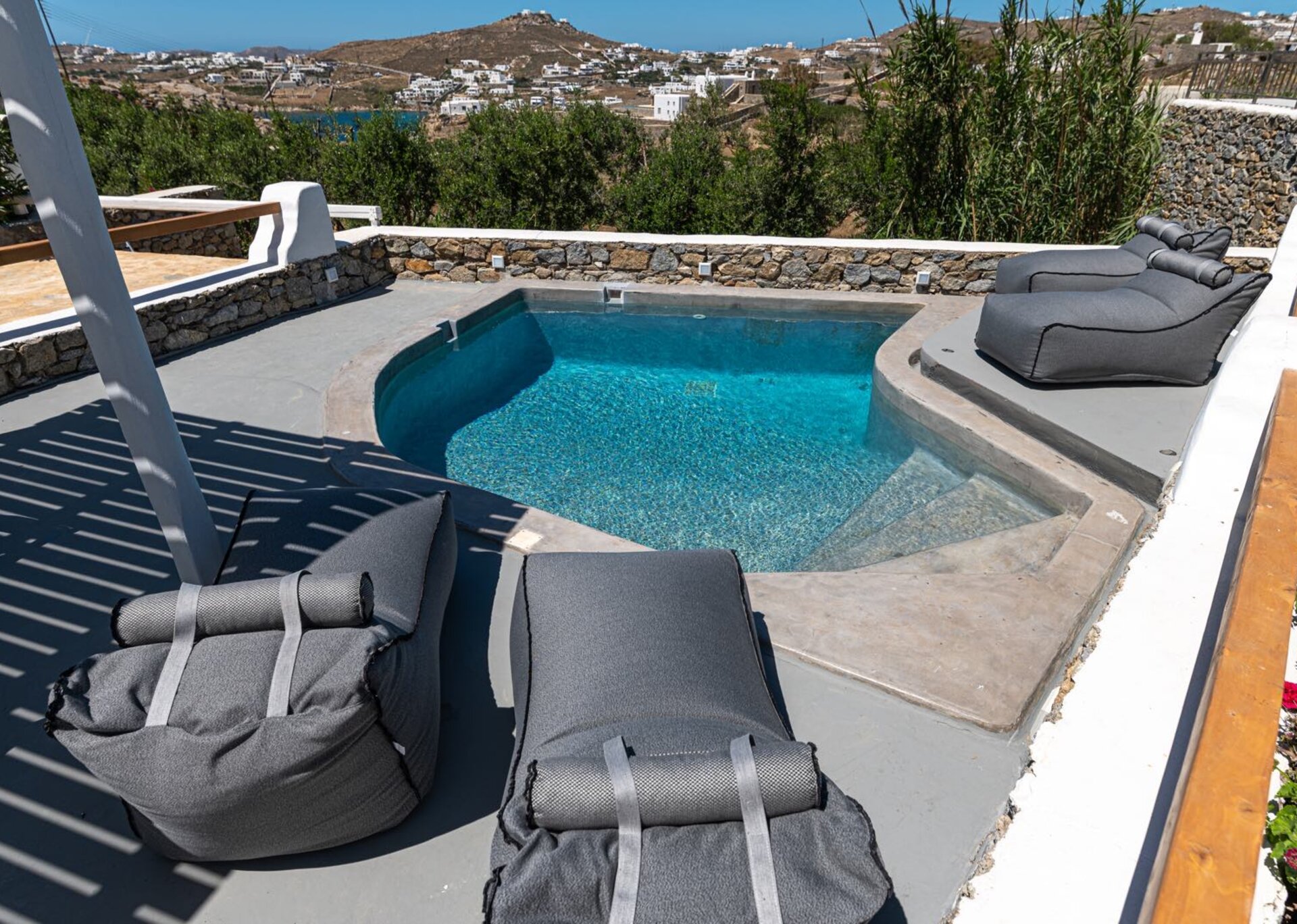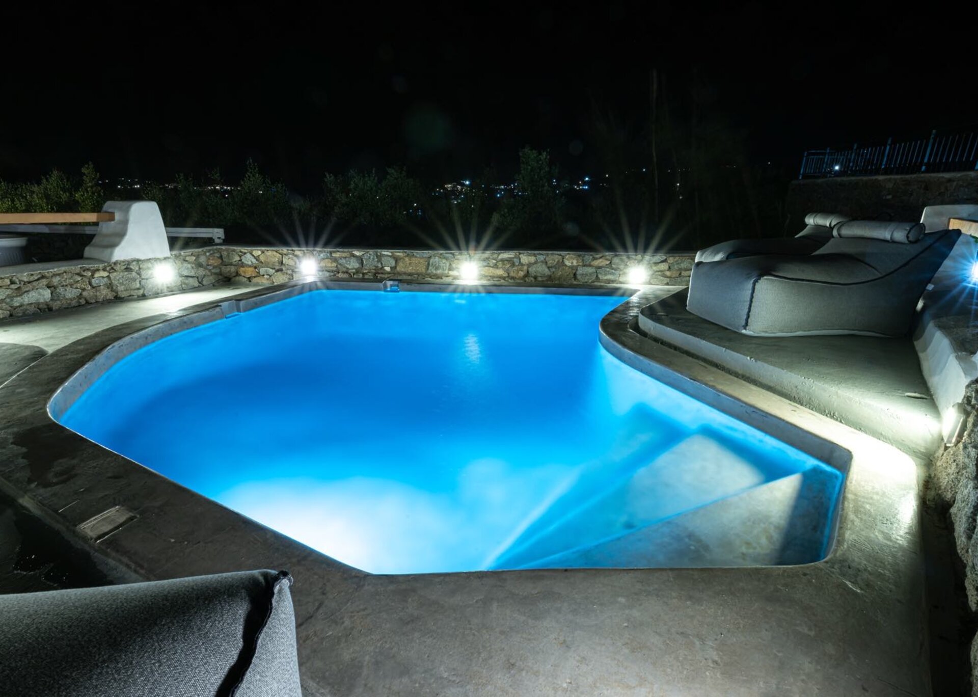 The property features a small Plunge swimming pool of 12sq m2. The wonderfully structured outdoor area of the property, surrounded by rocky hills and Mediterranean herbs, can provide relaxation and recreation for the guests, providing multilevel lounging and dining area. Sitting areas in the front of the villa, to all which guests have access to, are designed, so that guests can break off into small groups and enjoy their own private space with a feeling of exterior independence enjoying panoramic sea and sunset views.