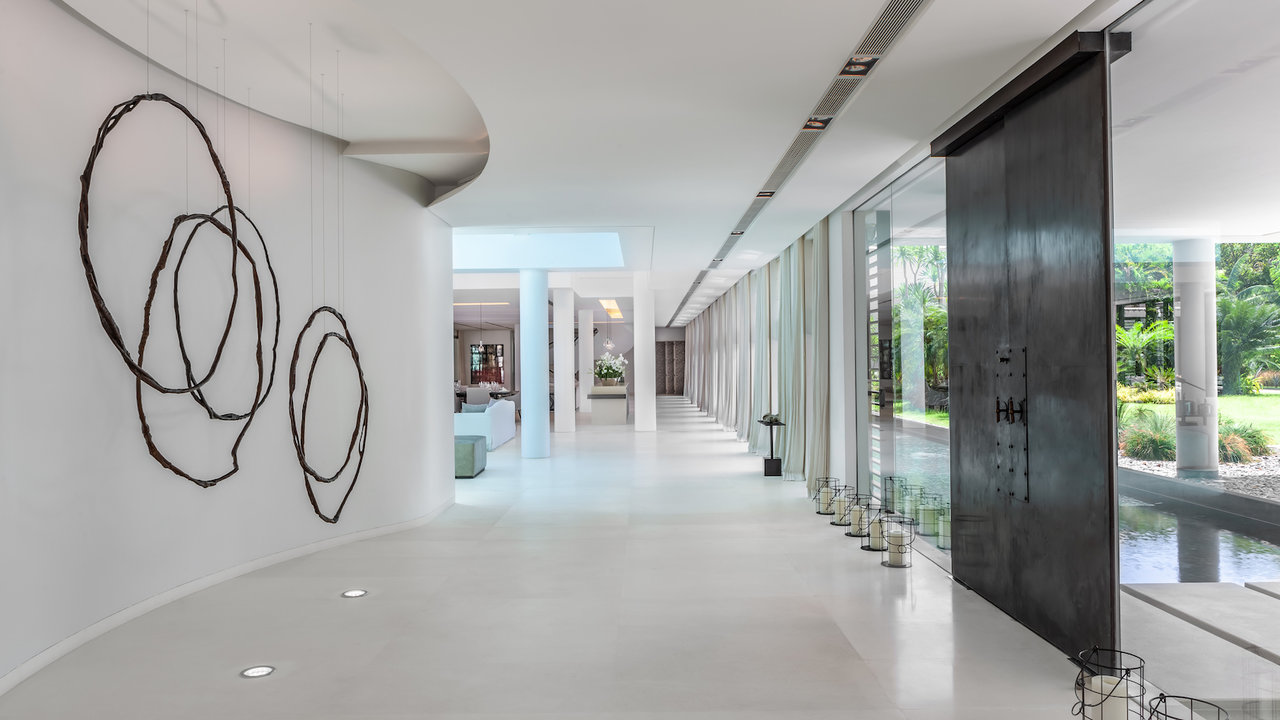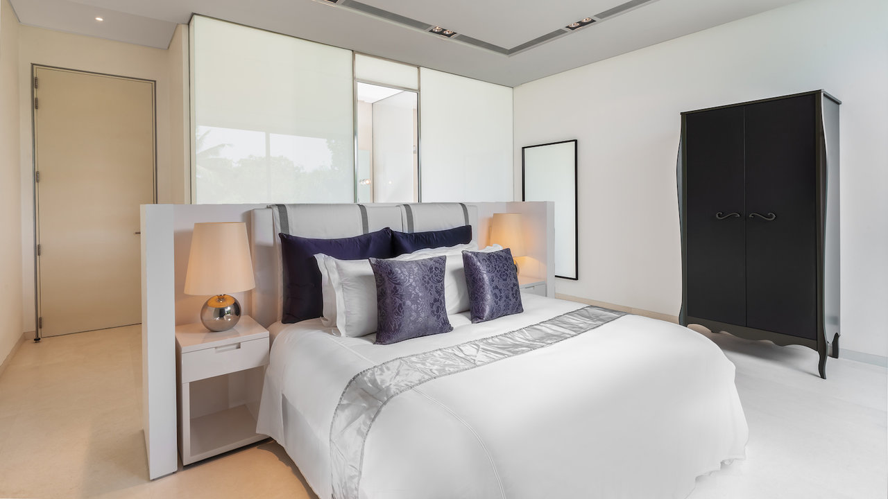 Villa Gatti cleverly fuses contemporary architecture with iconic Thai features. Two majestic roof spires rise from the building’s either side, while glass bay windows surround its perimeters. It’s interior exudes a modern minimalist feel, complemented by detailed Asian art.