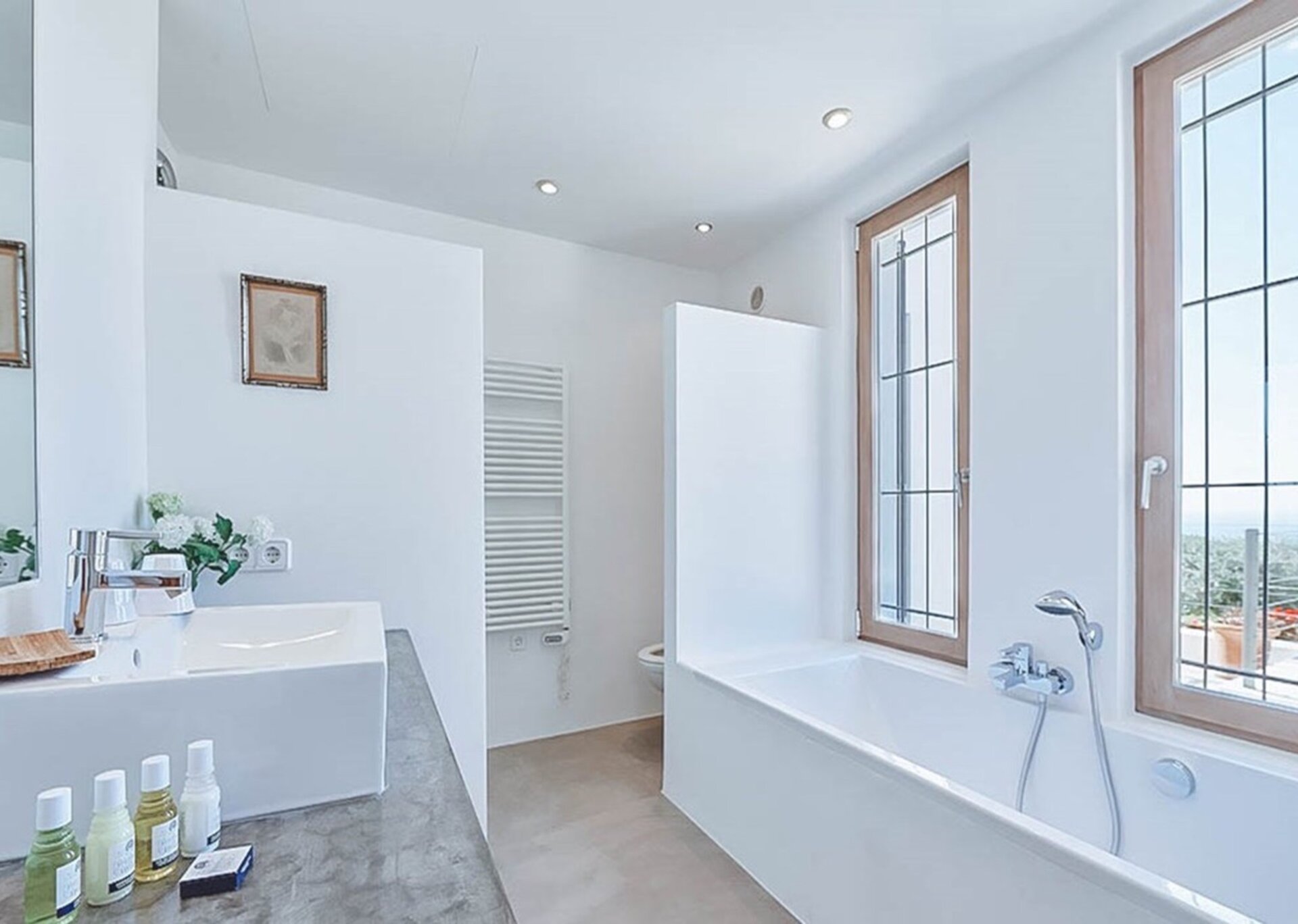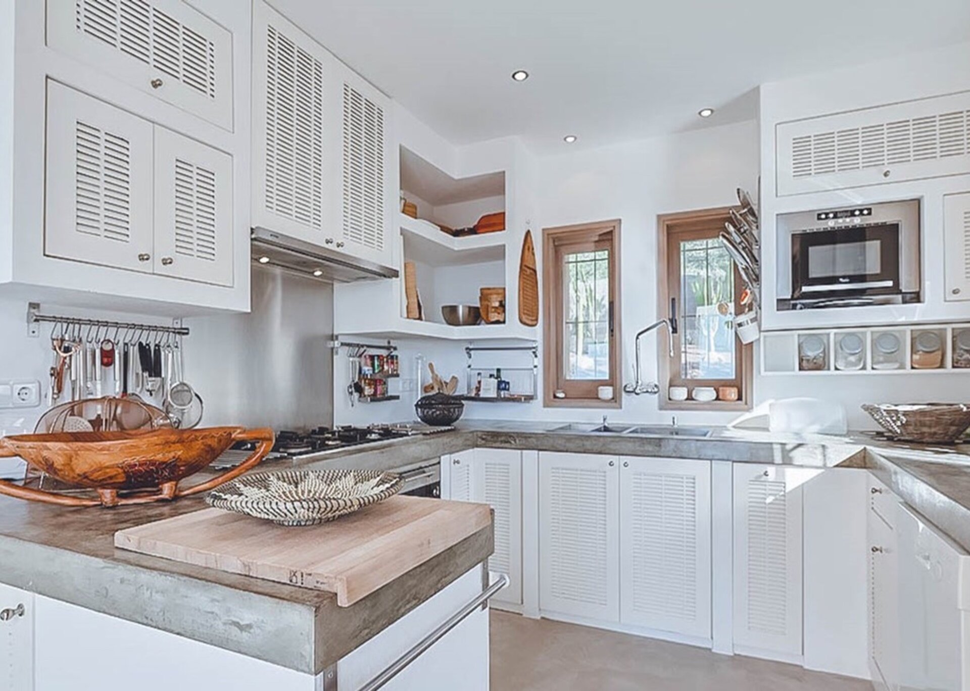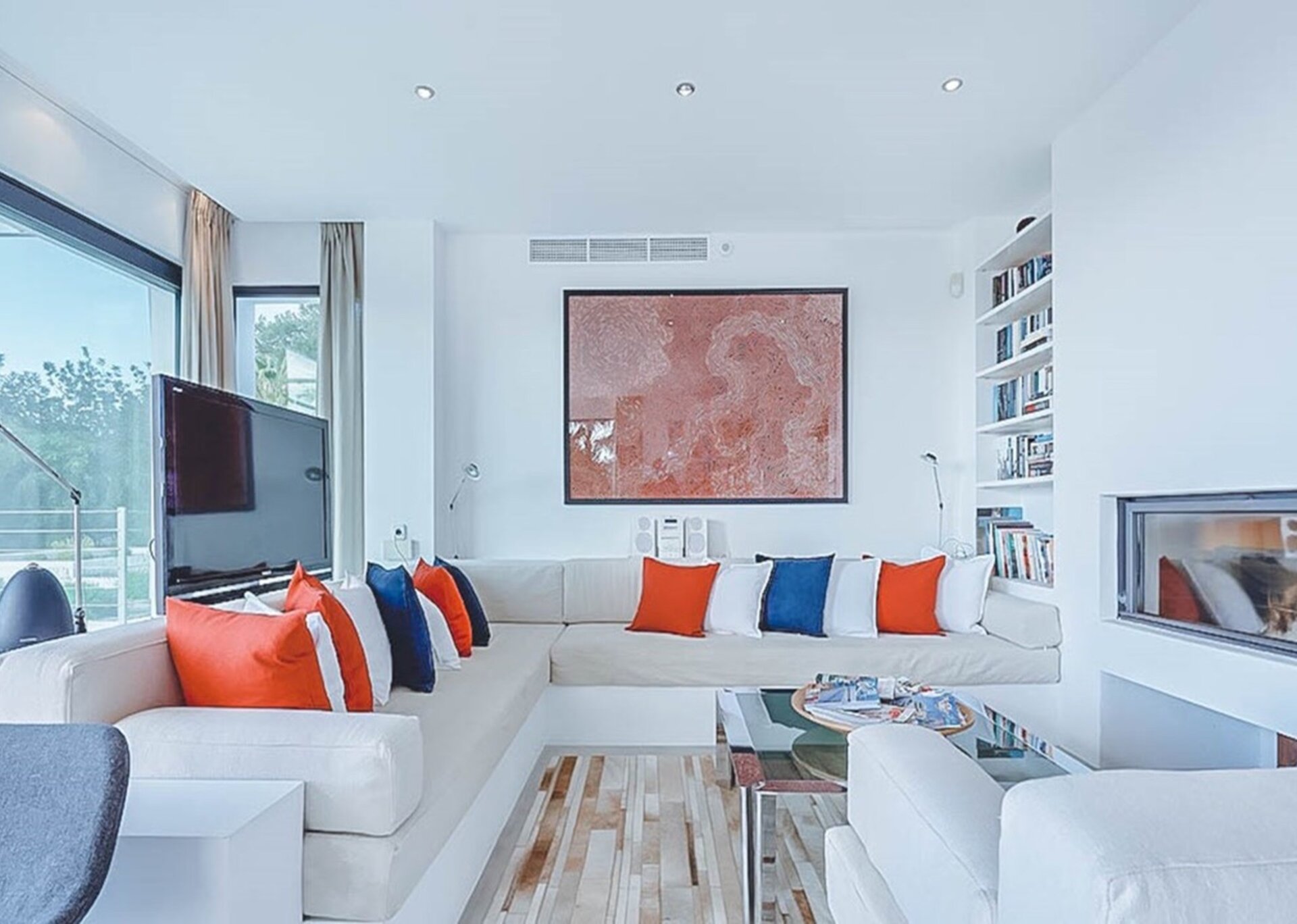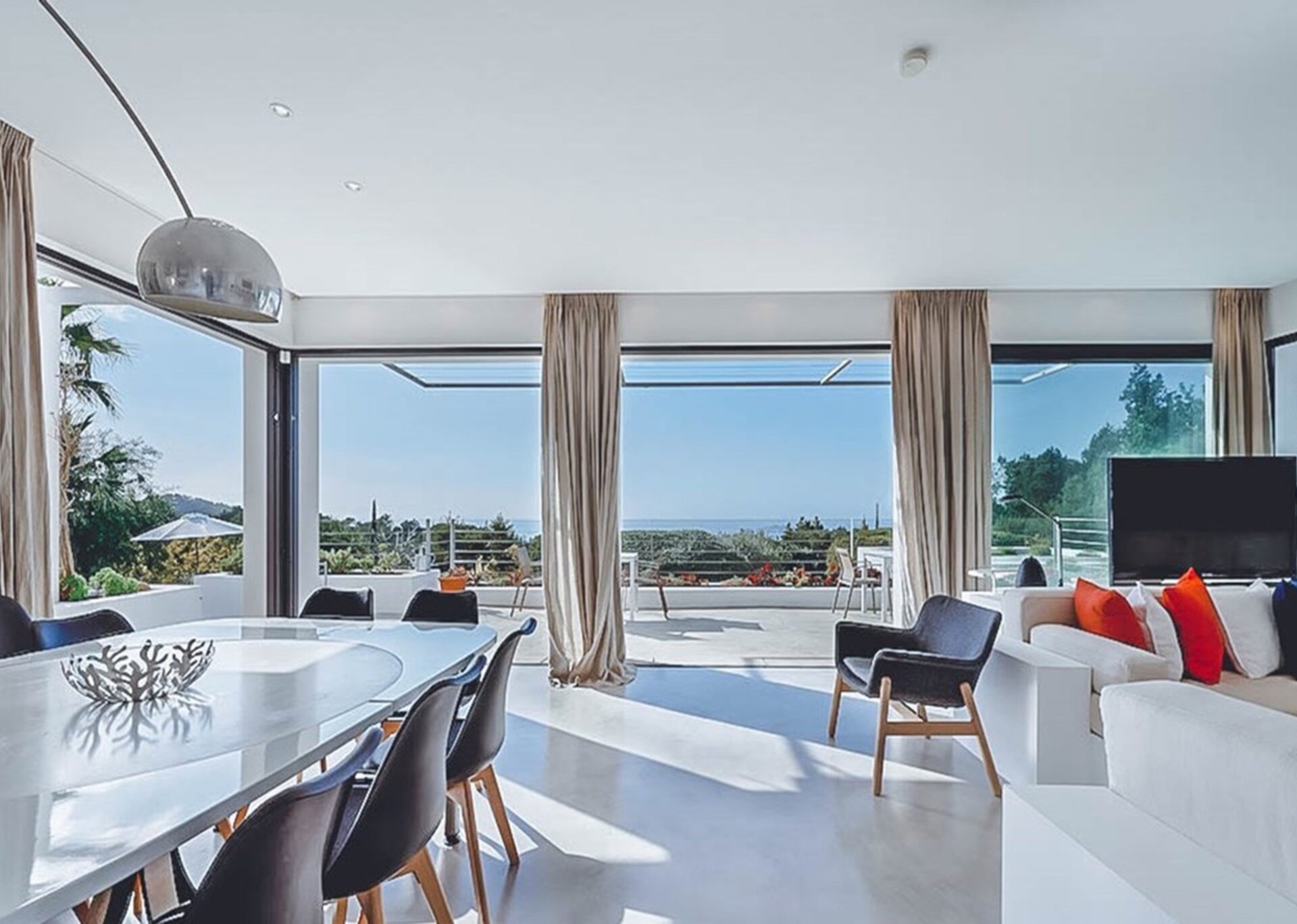 The interiors are filled with natural light and exude modern luxury, featuring high-tech amenities and a calming contemporary style. Each room is thoughtfully designed, with a bright and airy ambiance and beautifully appointed furnishings in neutral tones, complemented by tasteful modern accents. The villa boasts a delightful breakfast room and a sleek, modern kitchen.