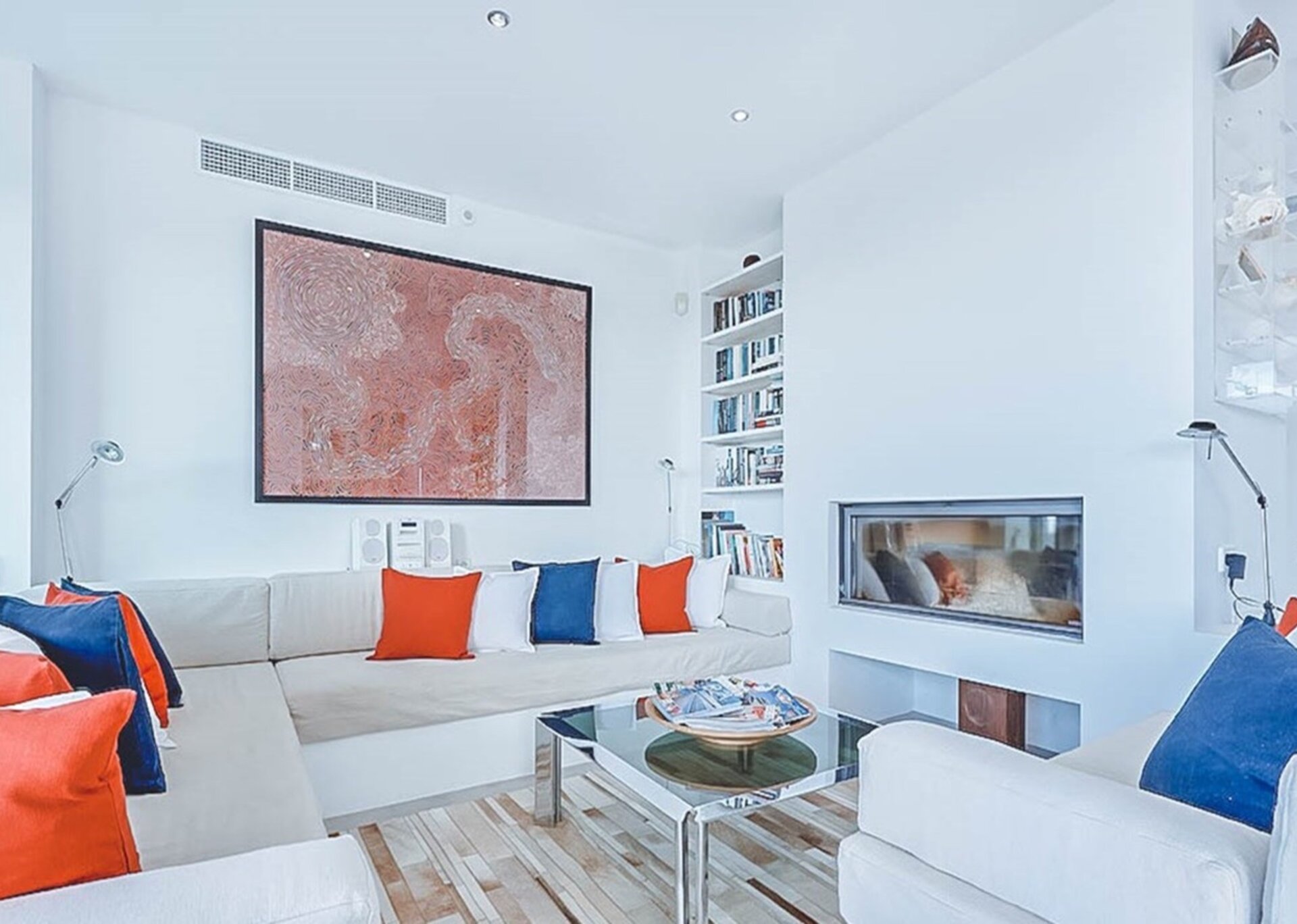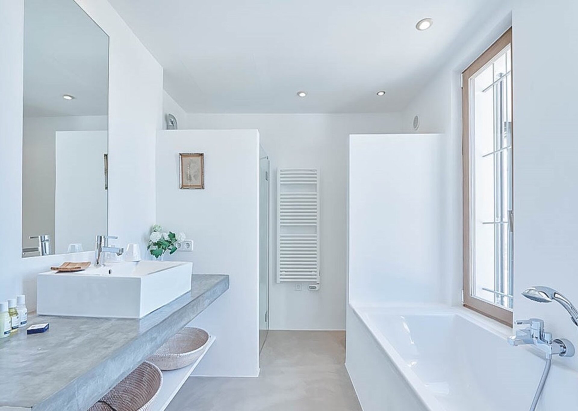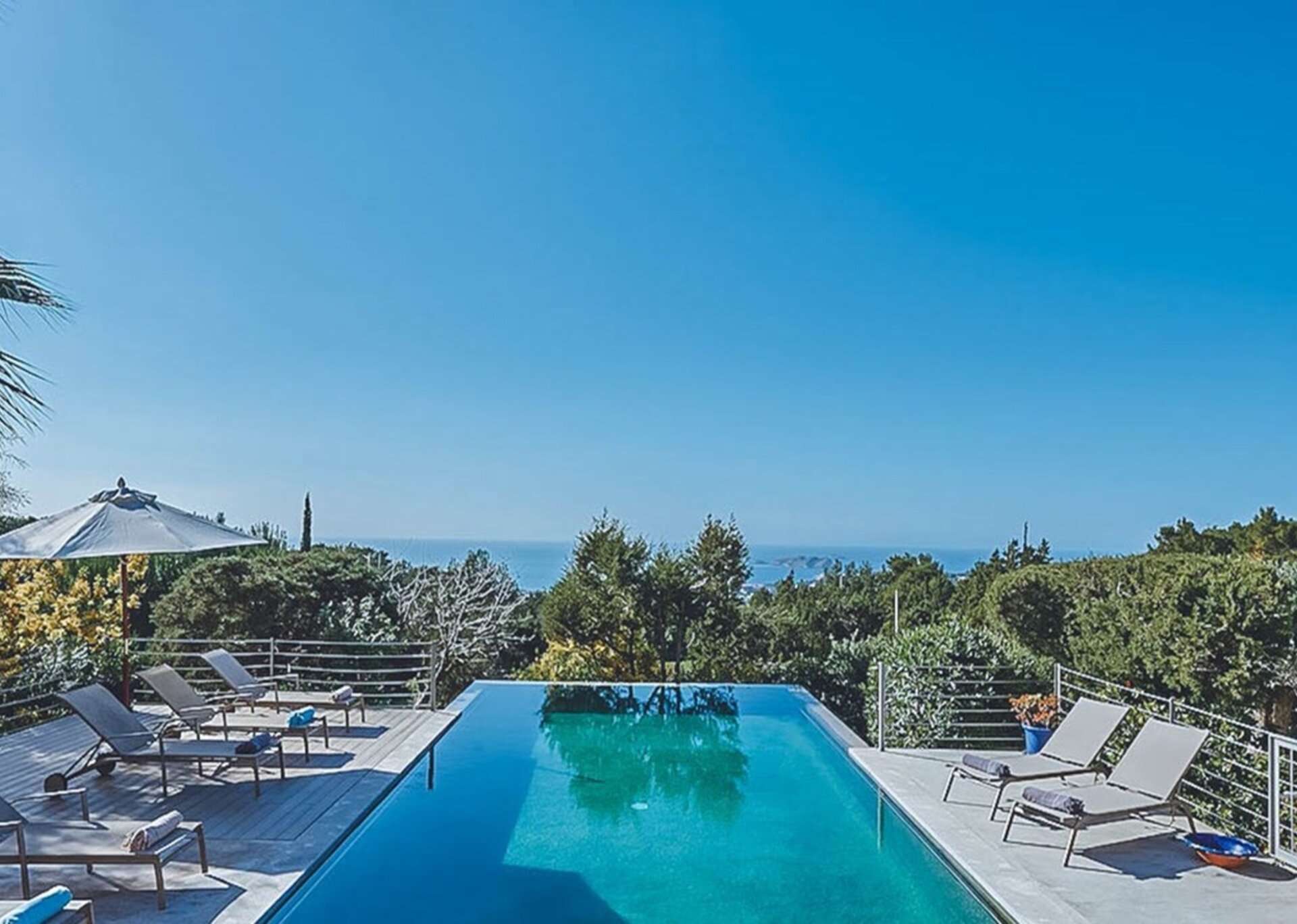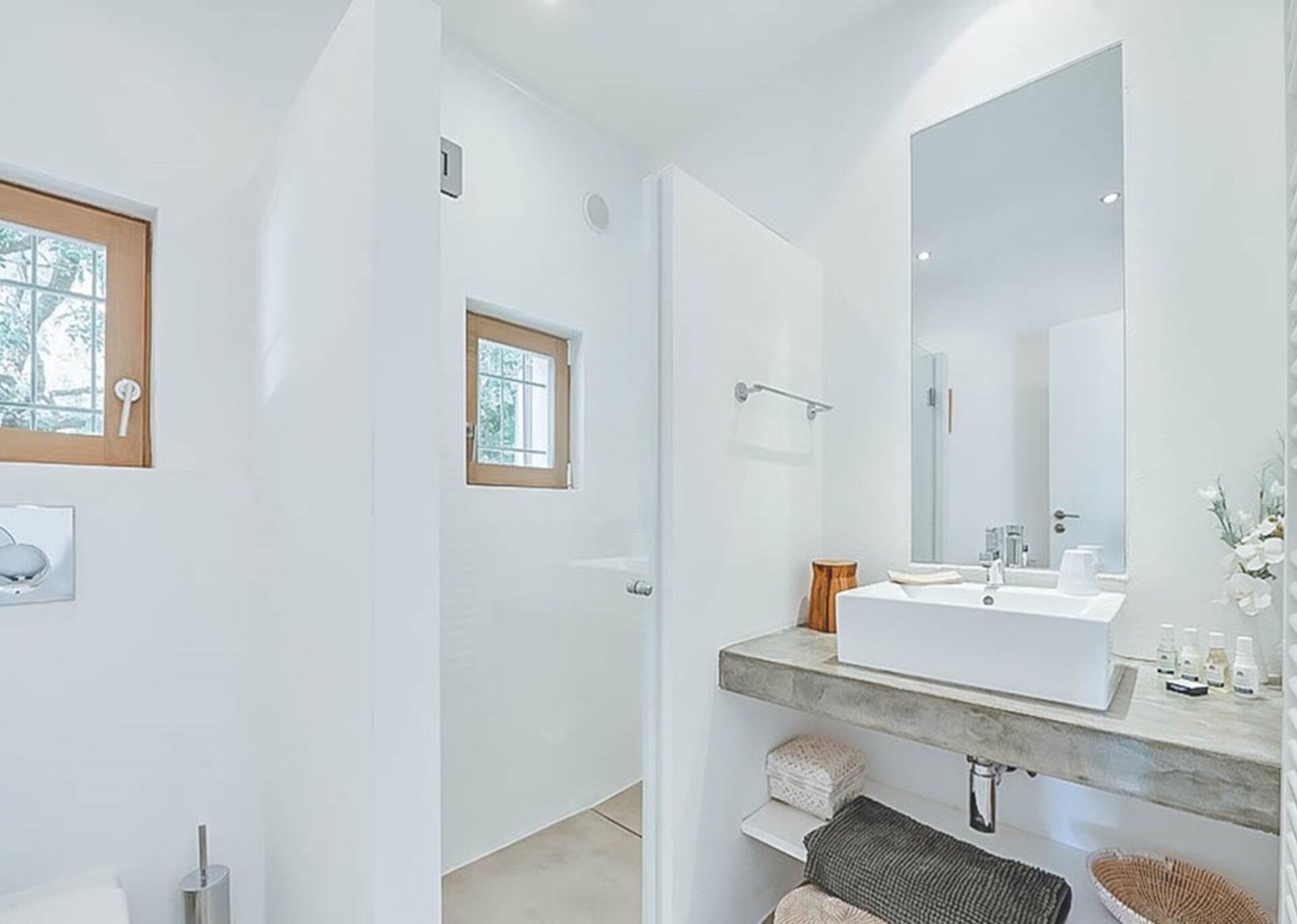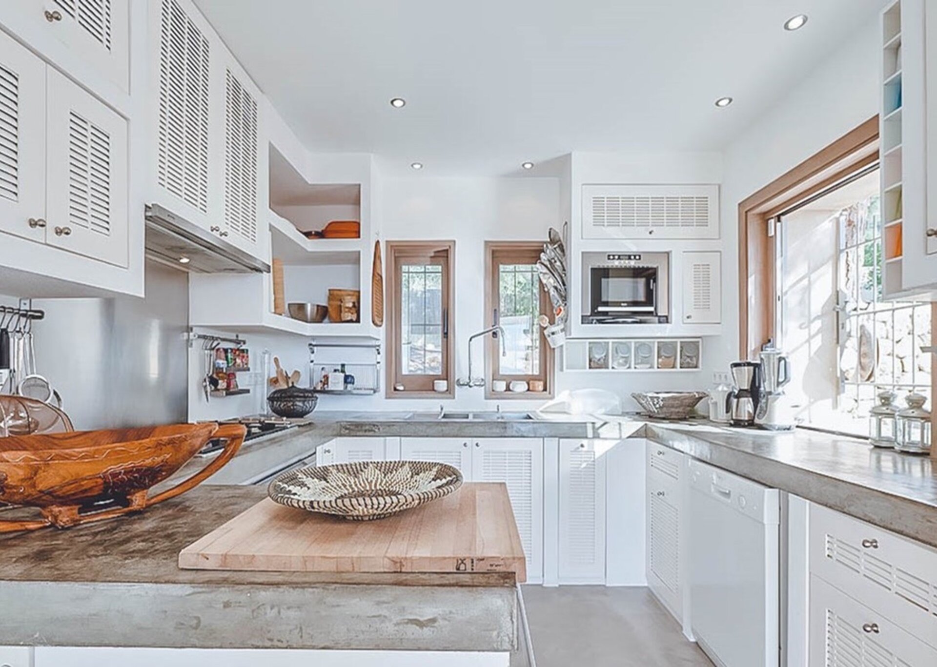 The interiors are filled with natural light and exude modern luxury, featuring high-tech amenities and a calming contemporary style. Each room is thoughtfully designed, with a bright and airy ambiance and beautifully appointed furnishings in neutral tones, complemented by tasteful modern accents. The villa boasts a delightful breakfast room and a sleek, modern kitchen.