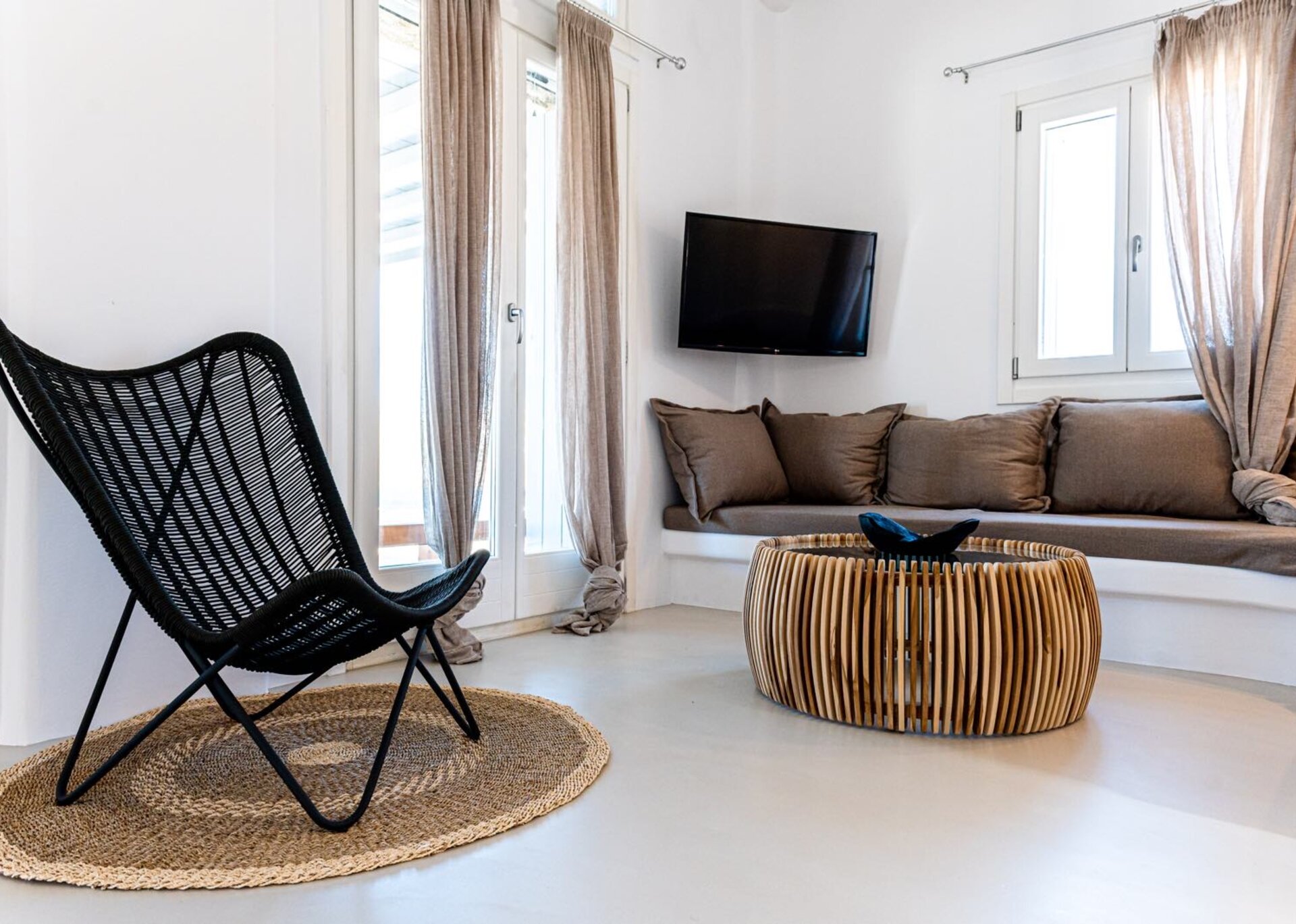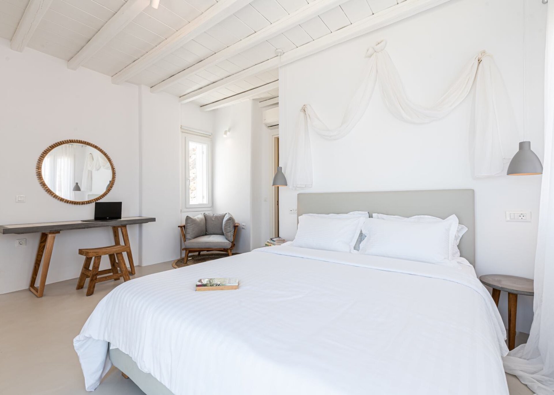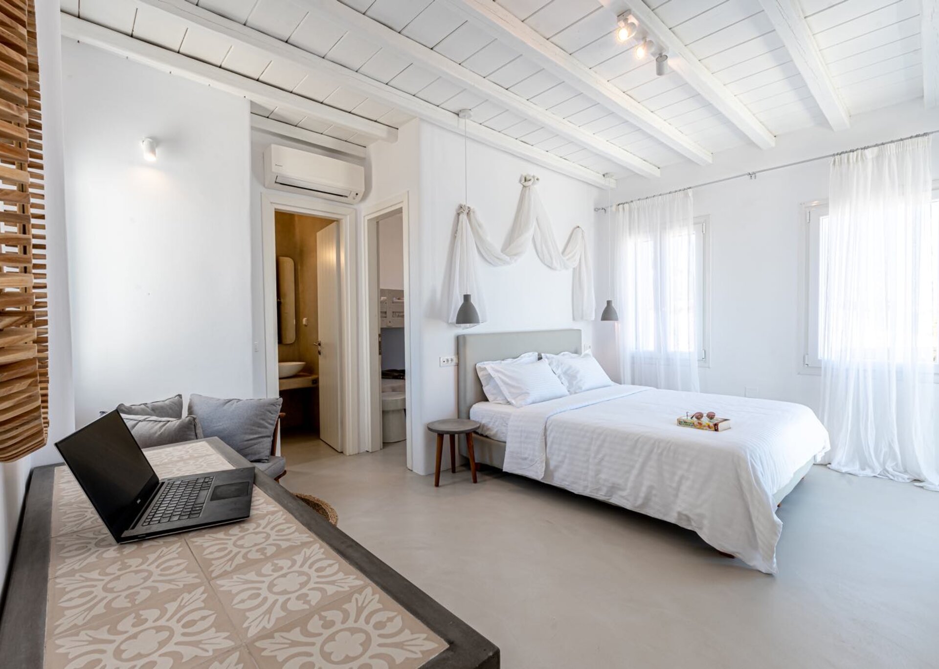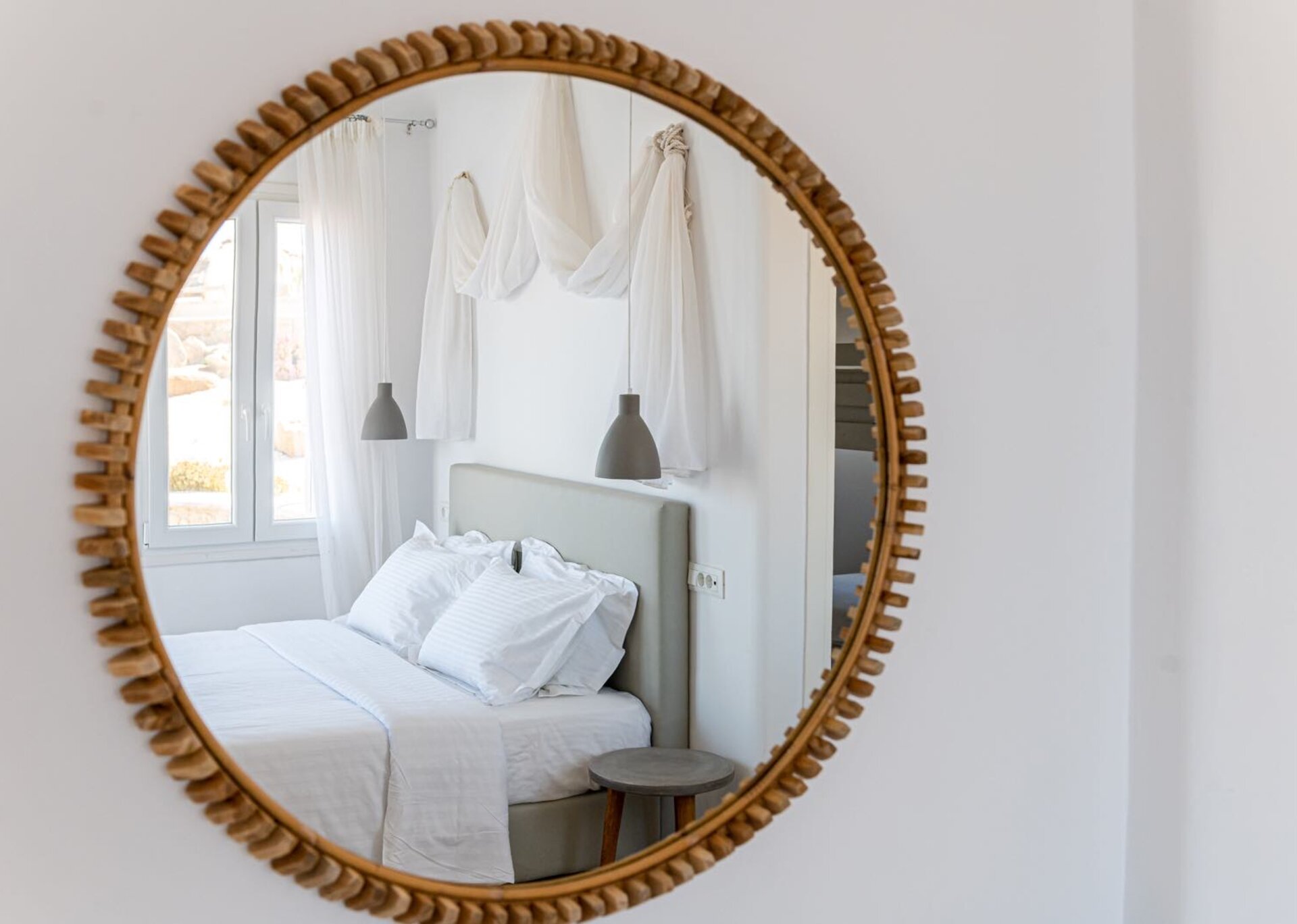 Villa Gemma is an experience in aesthetics:The impressive, newly built villa is situated on a hillside overlooking the sea and picturesque “Little Venice” part of the Town of Mykonos. Built In 2017,the 170 square meters, two-level property, all in white, is perched on a hillside with breath-taking, panoramic views over the Aegean Sea boasting a large open plan living area indoors and outdoors and offering privacy and seclusion in a very idyllic spot. In combination with the 5* Hotel Standards Amenities promises incomparable hospitality.