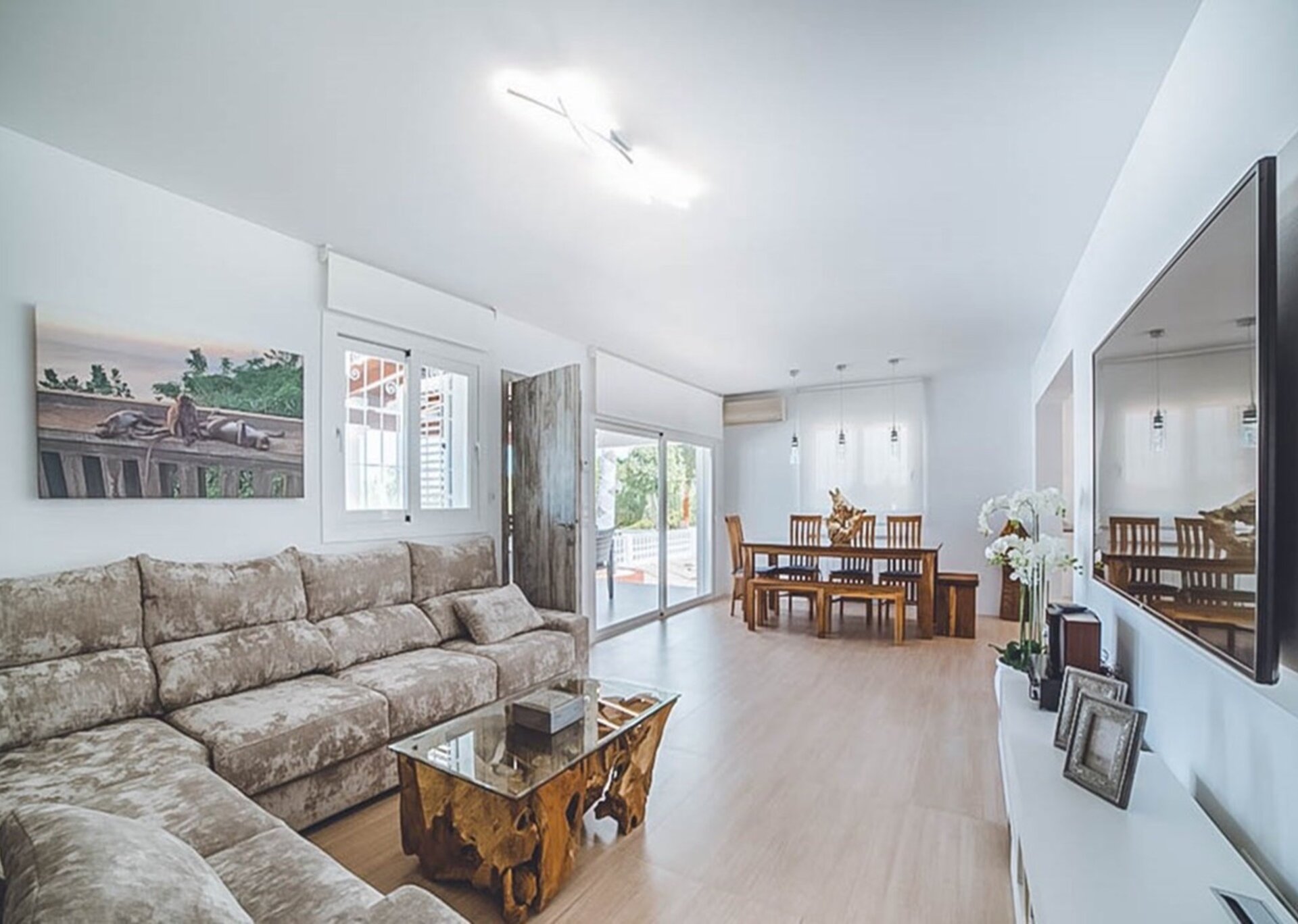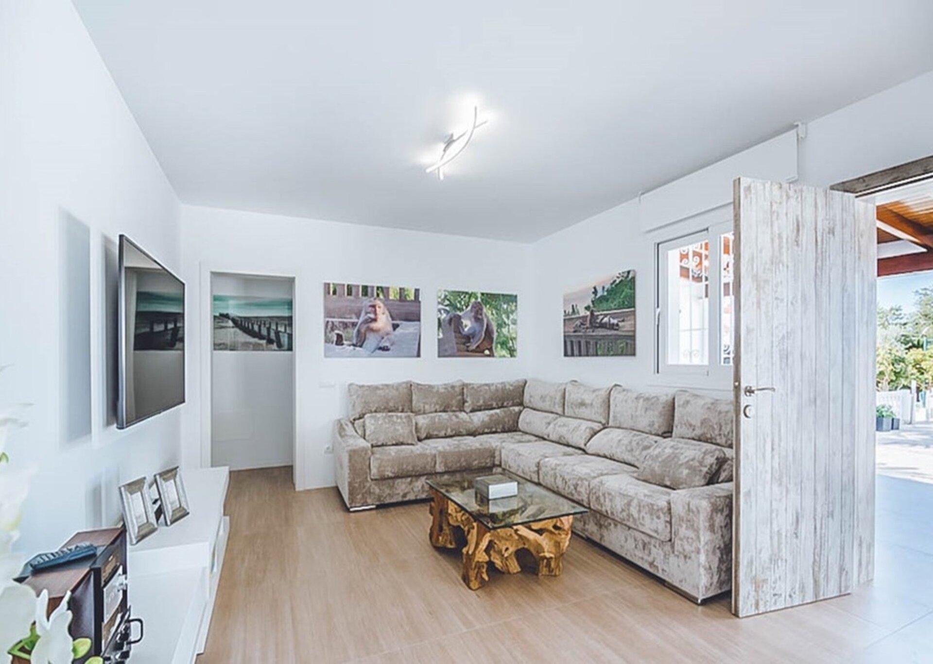 The main house boasts a spacious open-plan lounge and dining area, seamlessly connected to a fully equipped kitchen and a dining space for up to 8 people. The decor tastefully combines modern elements with traditional touches, paying homage to the rich Ibicencan culture. The living areas are bright and inviting, adorned with plush, comfortable sofas perfect for relaxation and contemplation.