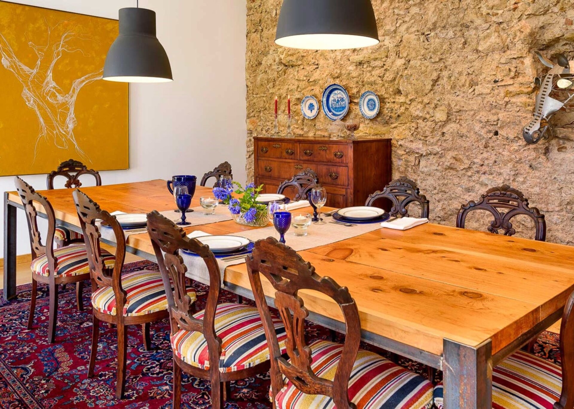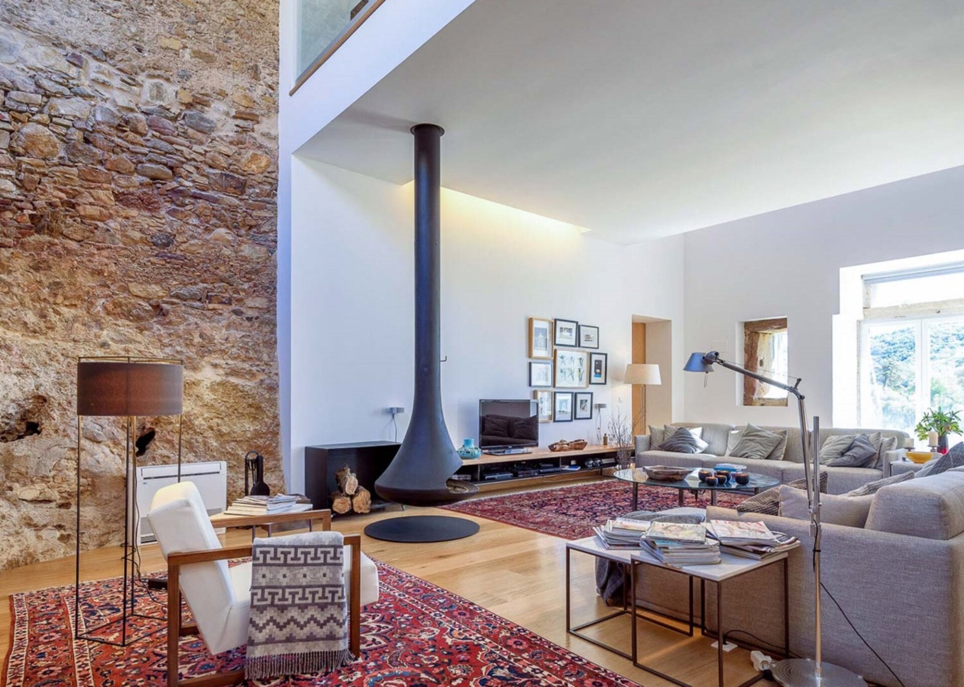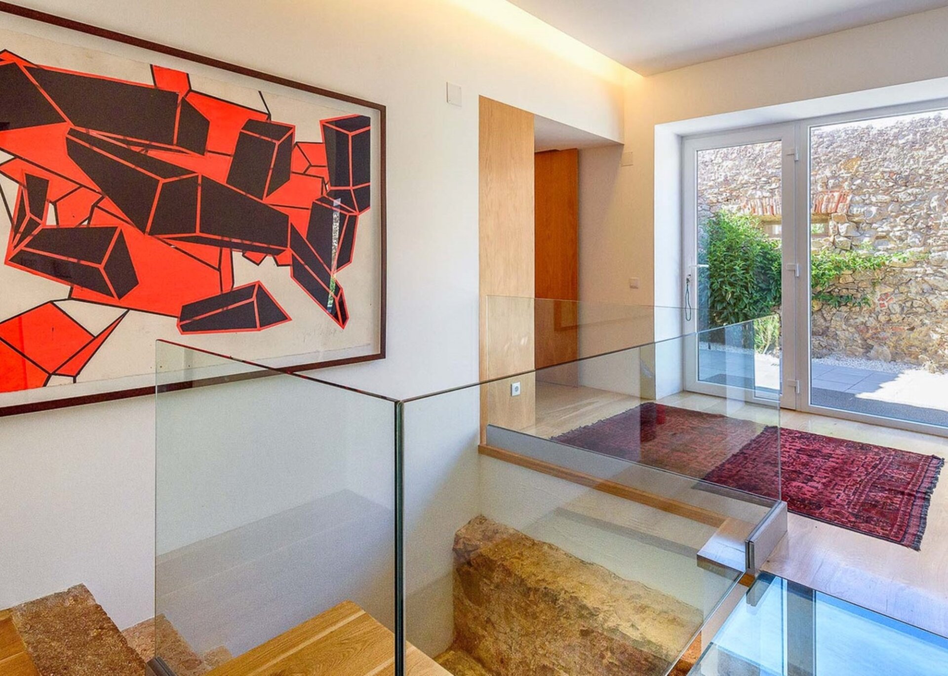 At this Peniche farmhouse, history has been well integrated with 21st-century comforts. The main house is a remodeled farm building where straight-line contemporary architecture blends seamlessly with centuries-old stone walls and floors. Add an interesting, vibrant contemporary art collection, oversized antique oriental rugs, a beautiful collection of antique furniture and comfy sofas and you have the perfect recipe for a harmonious multi-generation home.